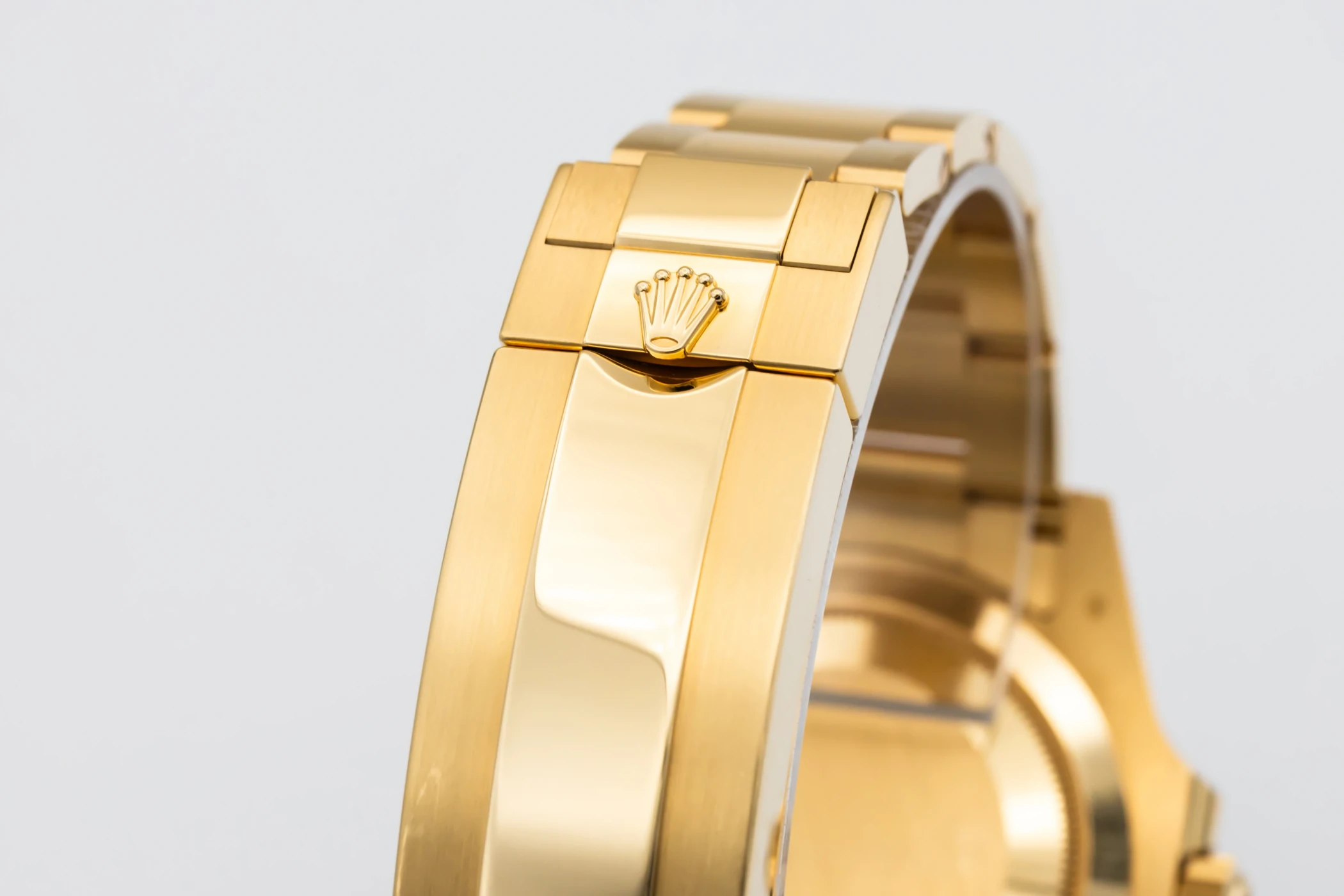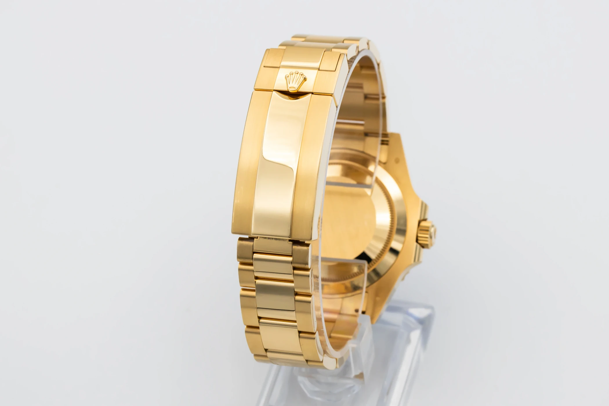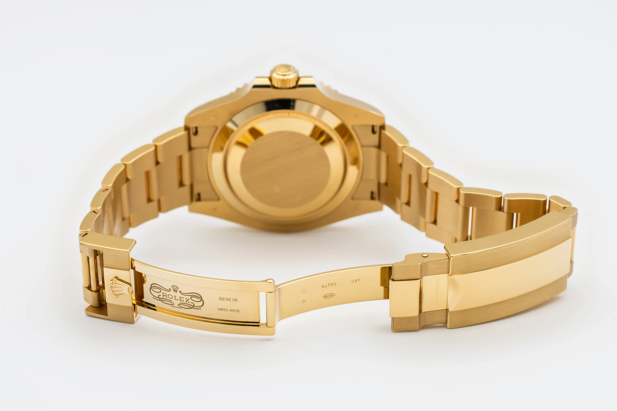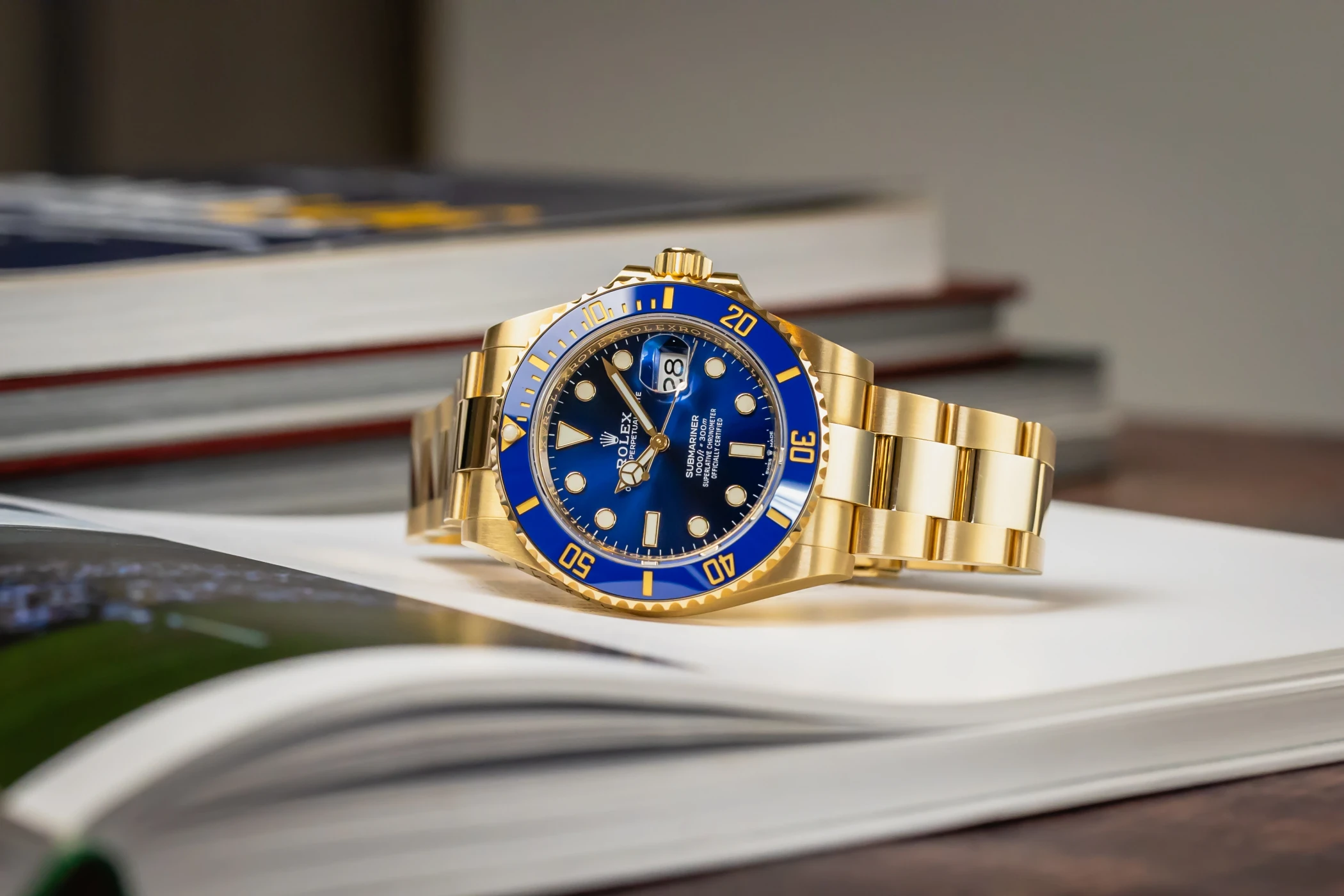 This 2022 Rolex Submariner 40mm features a blue dial with large luminescent hour markers and a solid-link oyster bracelet in 18ct yellow gold. It features a blue cerachrom unidirectional rotatable bezel.