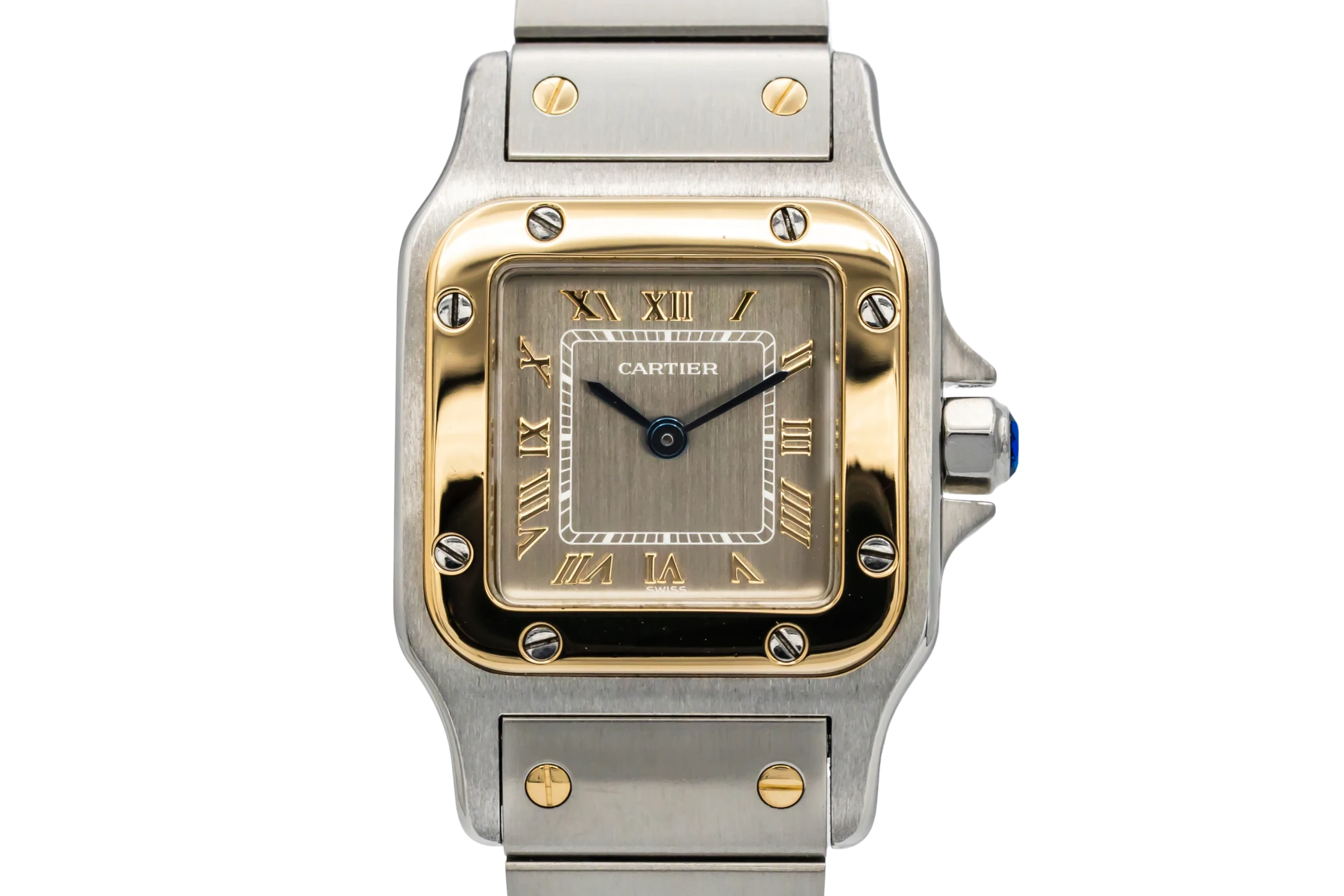 This circa 2000s Cartier Galbee 24mm features a silver dial with roman numerals and a stainless steel and 18ct yellow gold bracelet. It also features a 18ct yellow gold smooth bezel.