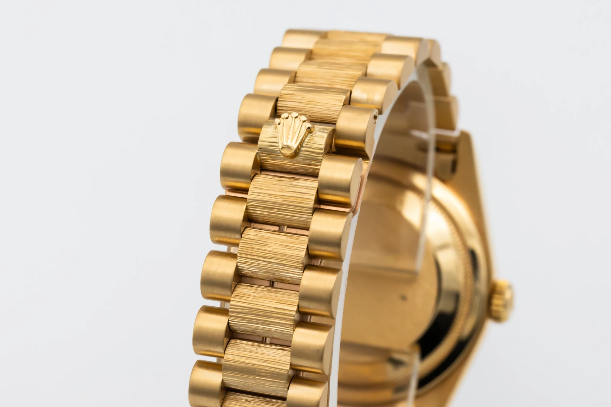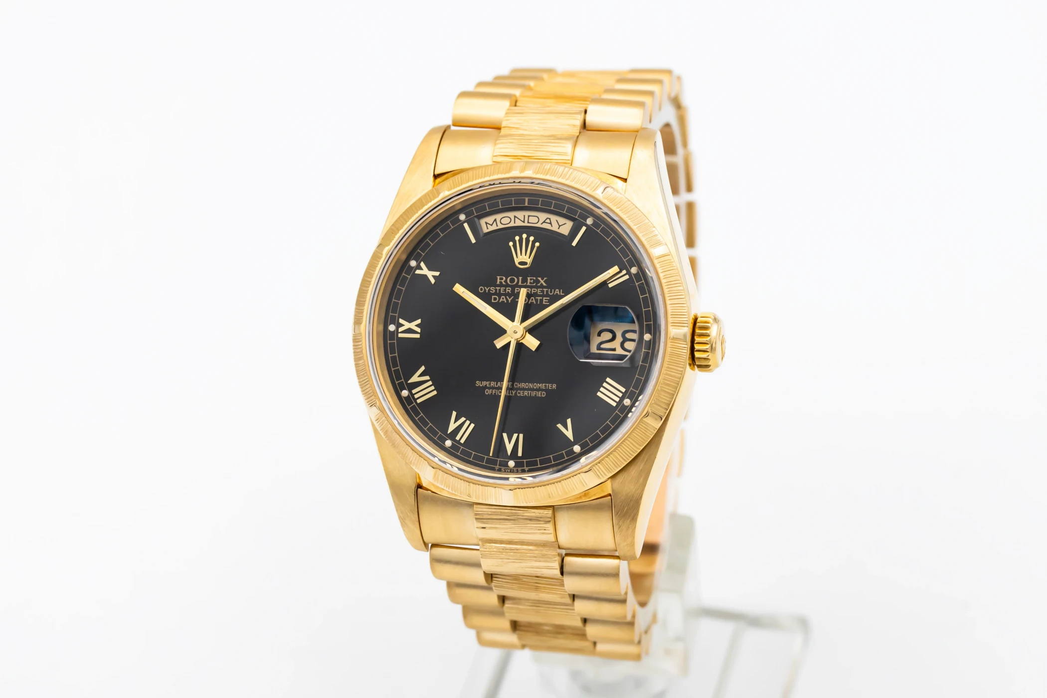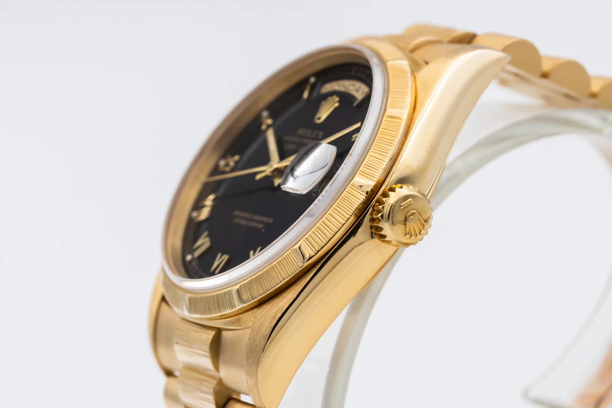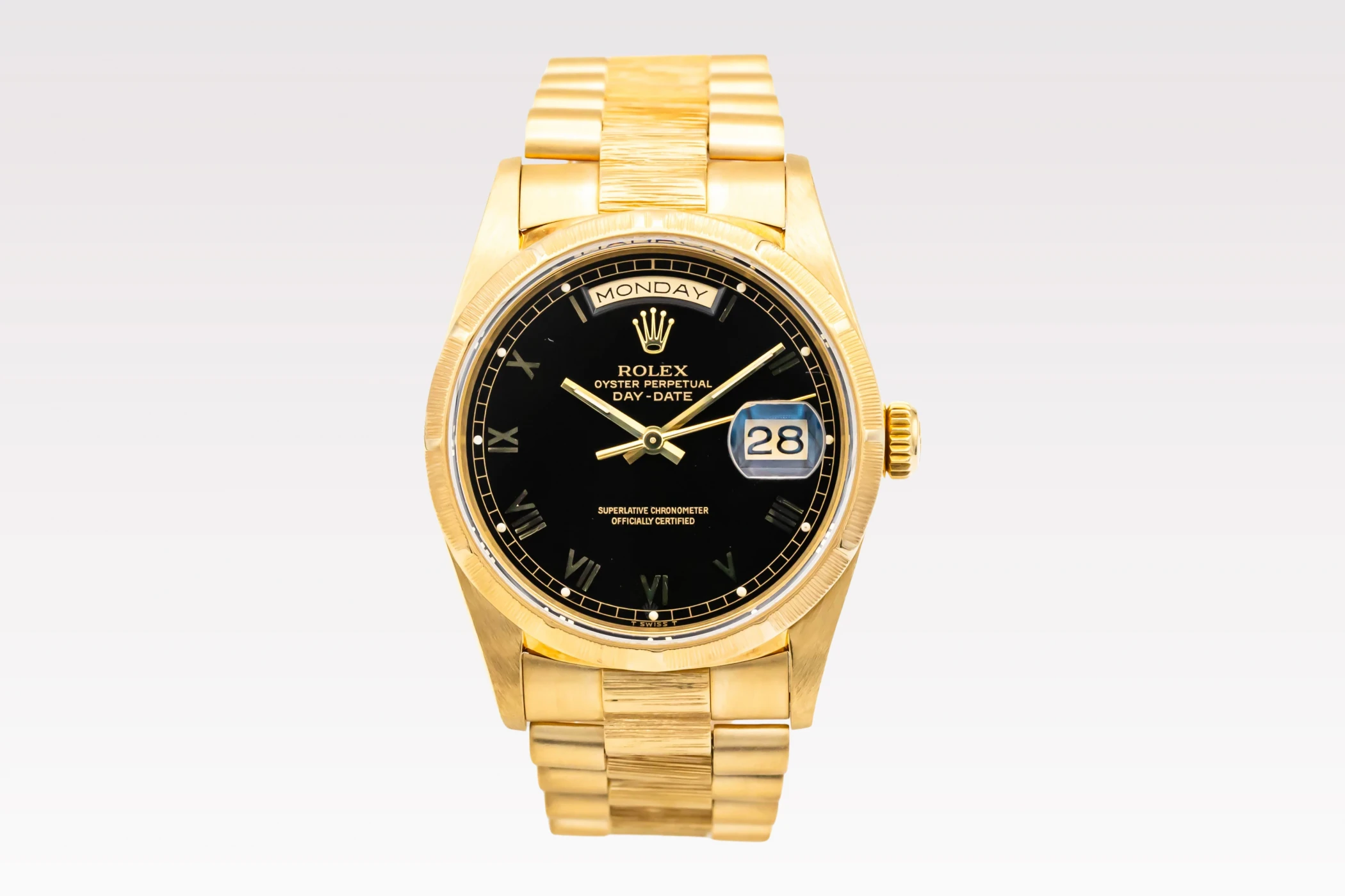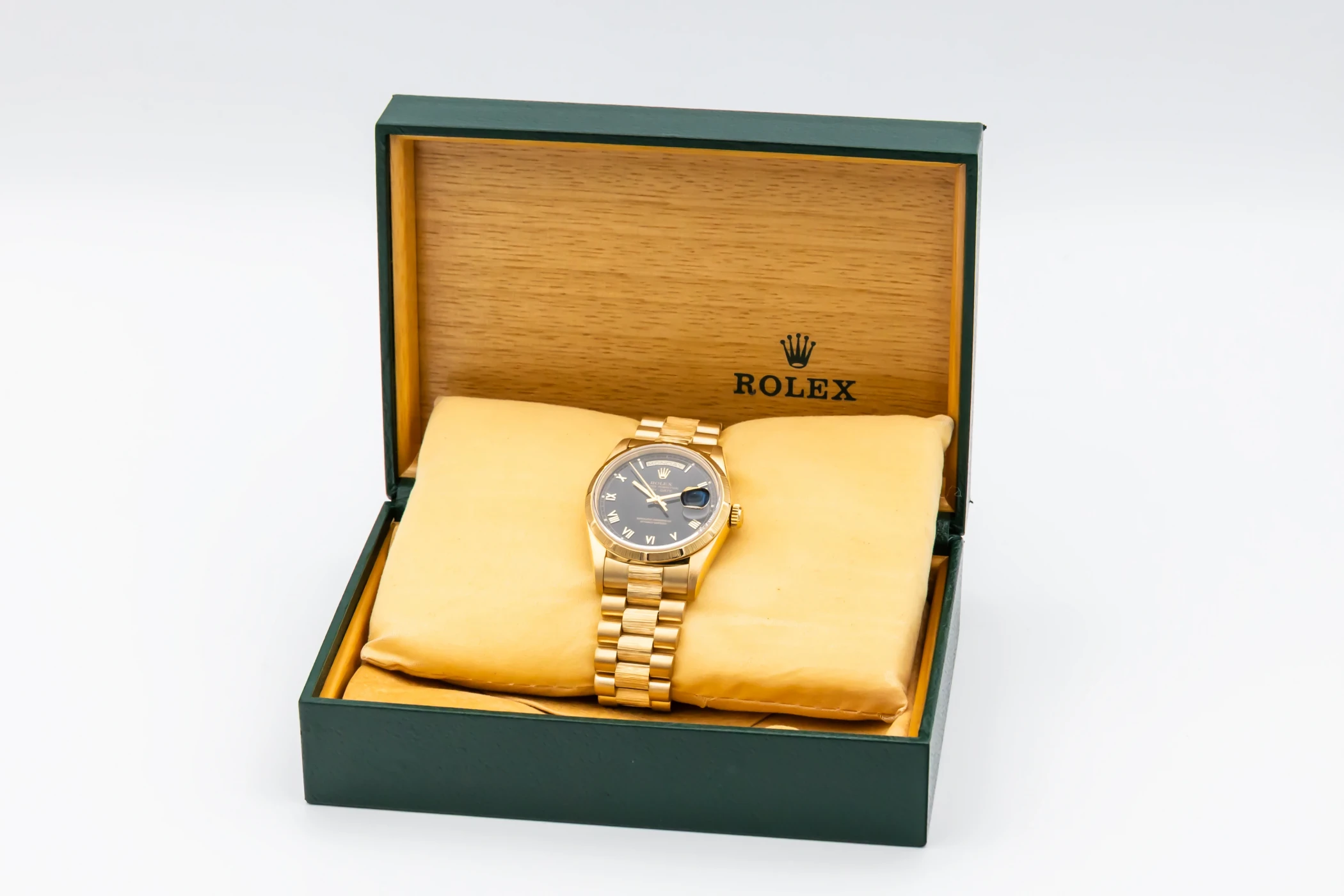 This 1991 Rolex Day-Date 36mm features a black roman numeral dial, The dial is the distinctive face of a Rolex watch, the feature most responsible for its identity and readability. Also featuring a 18ct yellow gold president bracelet and a fluted bezel.