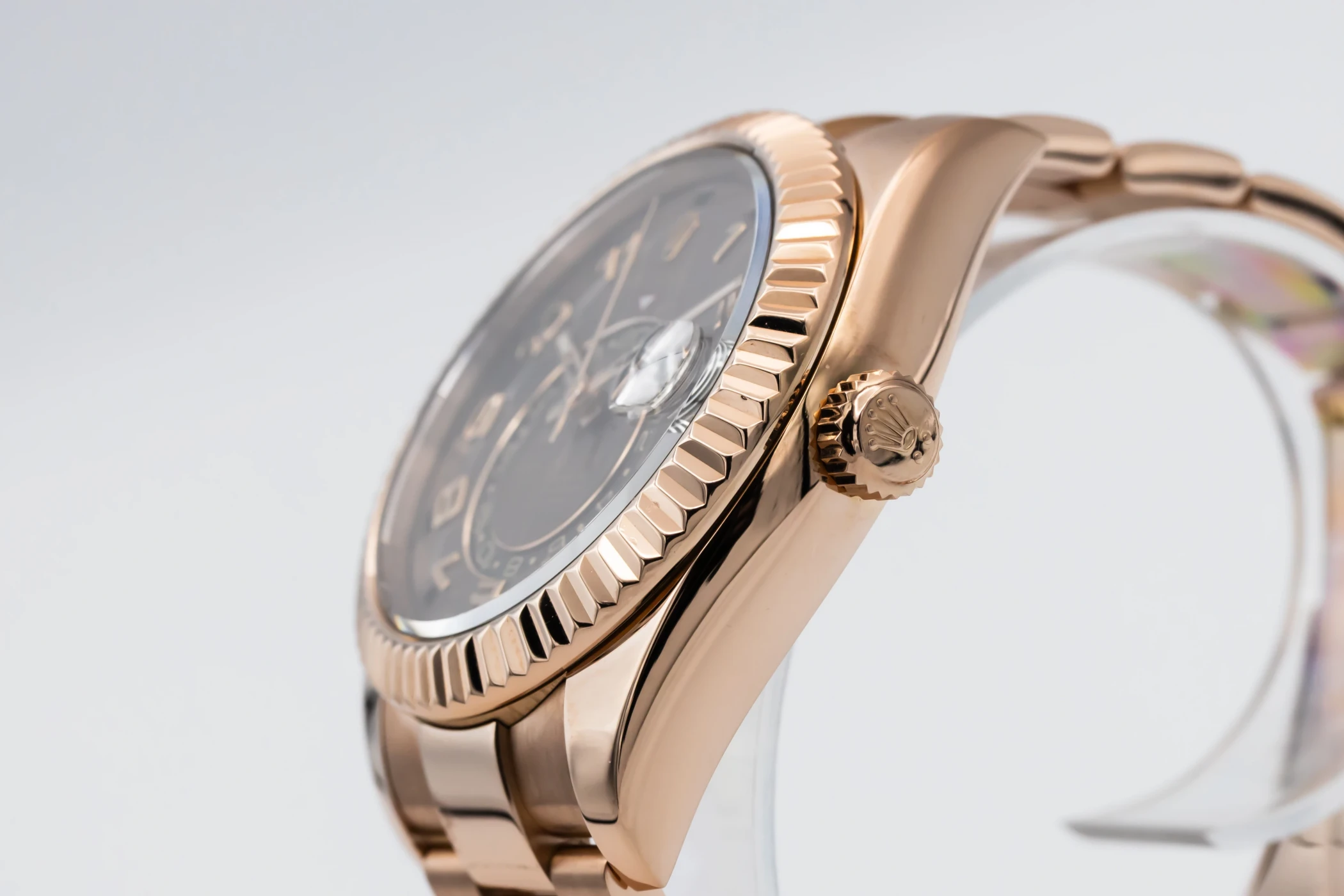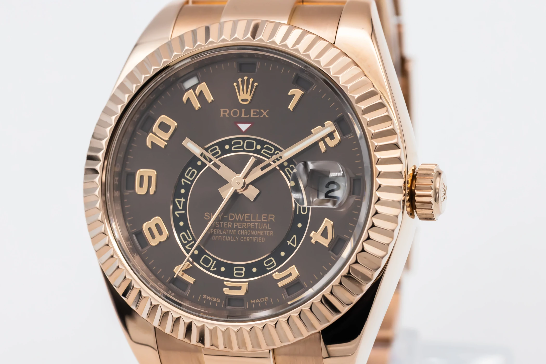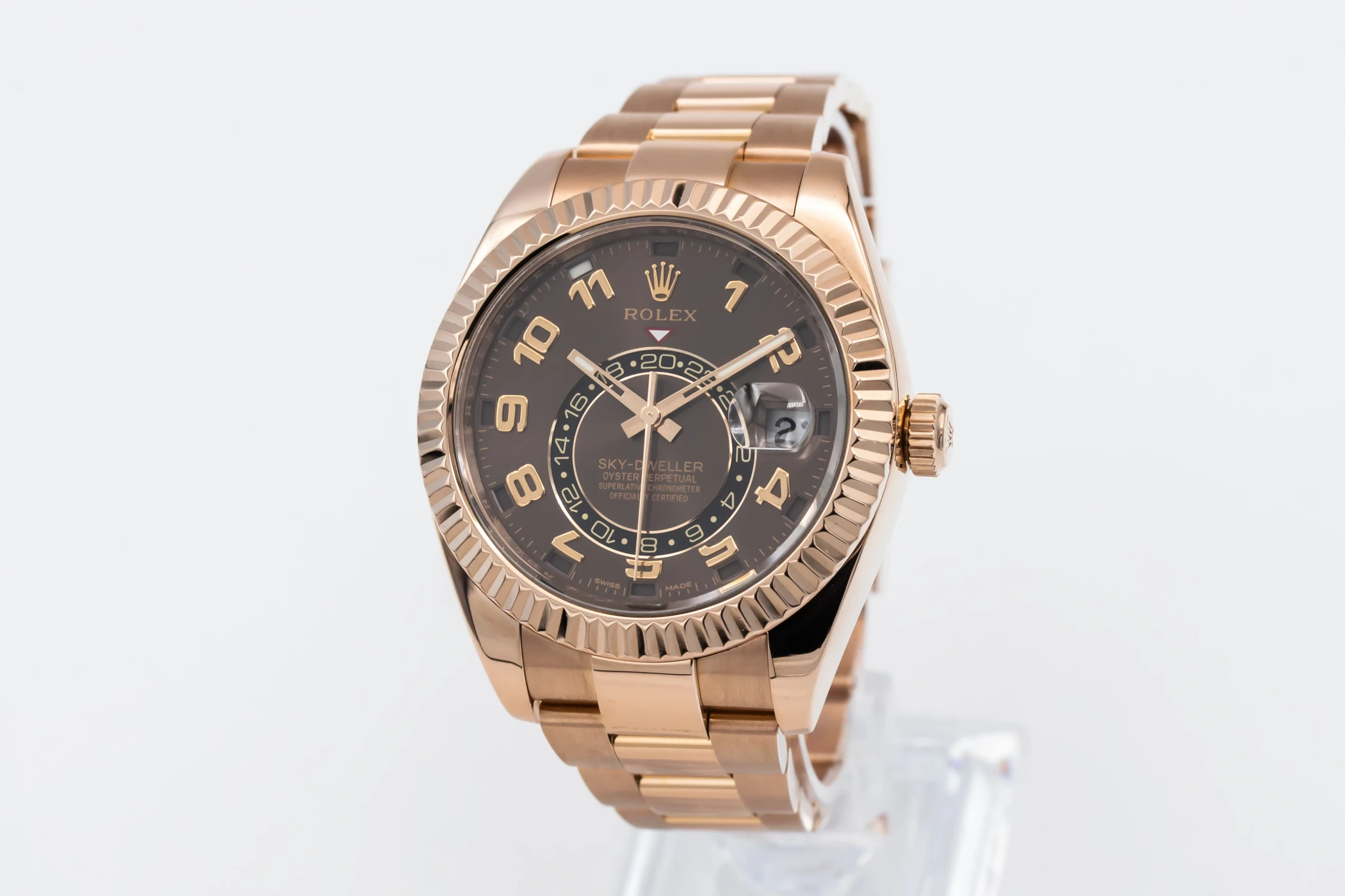 finance this from £415.49 p/m call the shop Read about our Limited Lifetime WarrantyThis 2016 Rolex Sky-Dweller 42mm features a rich chocolate brown dial adorned with arabic numerals which is complemented by the fluted Everose gold bezel. Fitted with the solid Everose gold Oyster bracelet featuring a folding Oysterclasp and Easylink extension system, this Sky-Dweller offers both presence and supreme comfort.