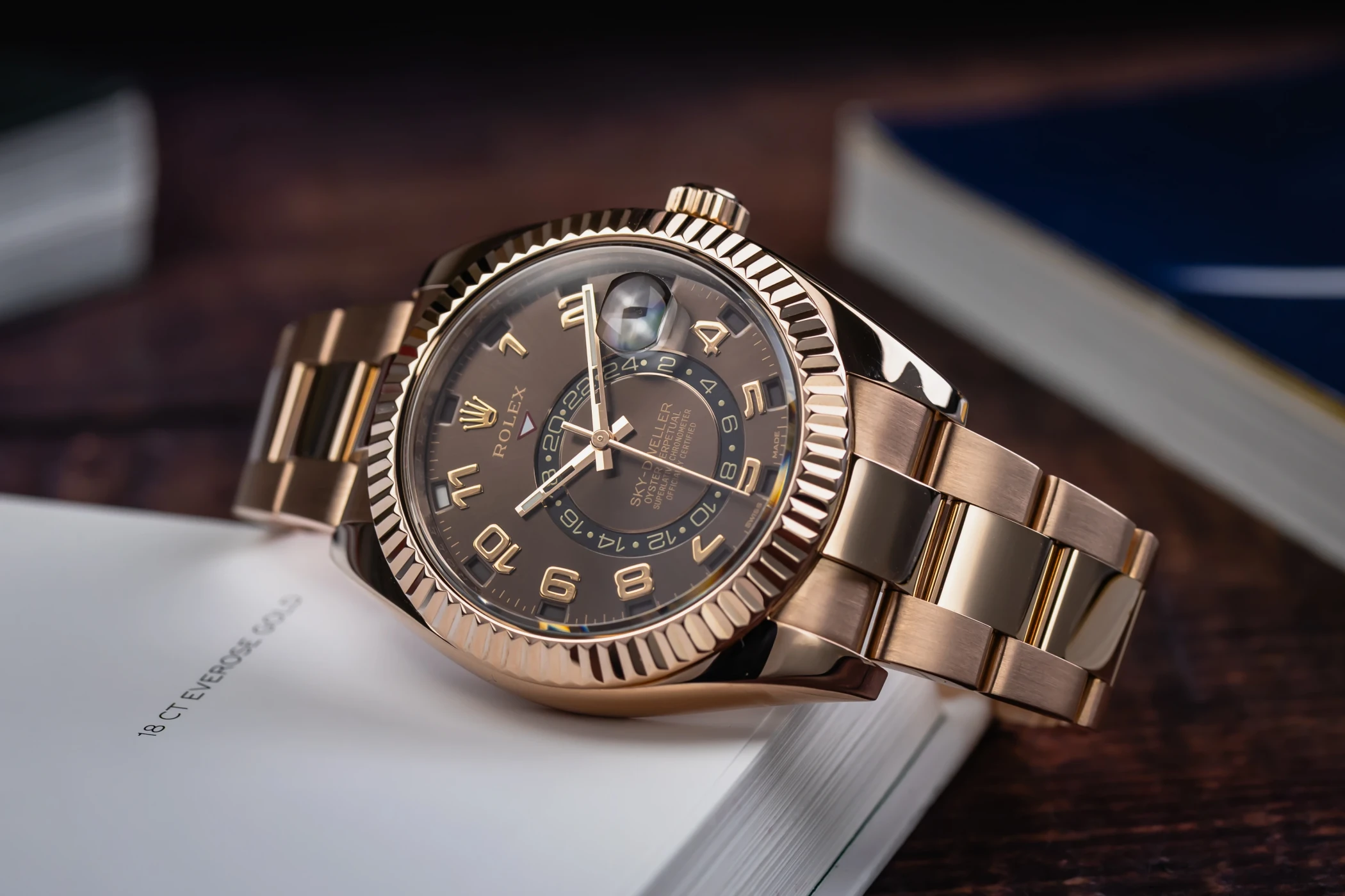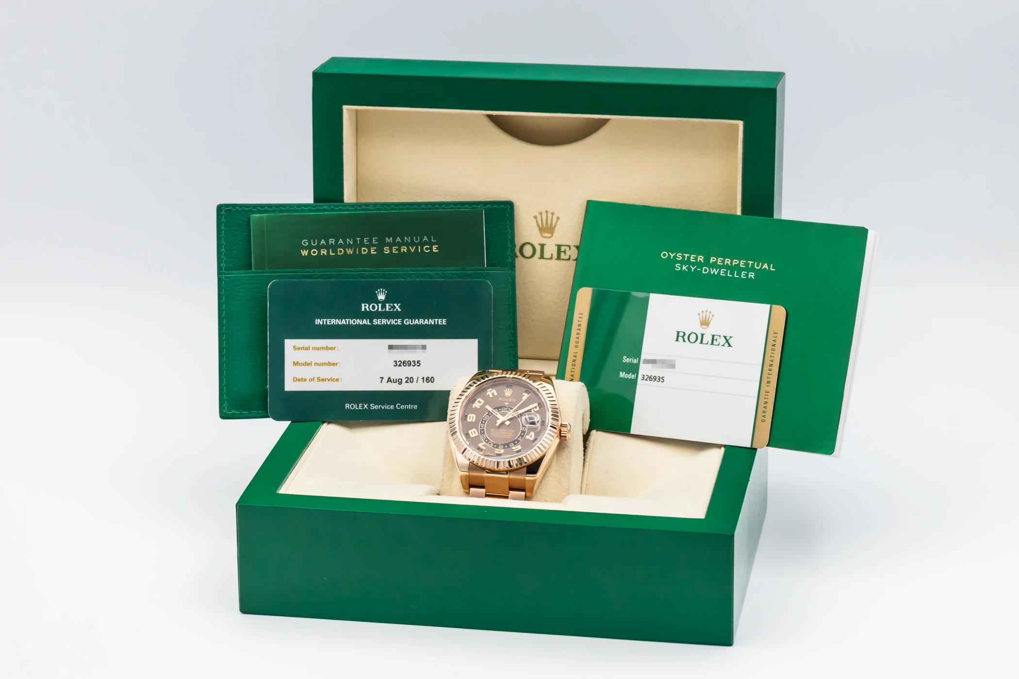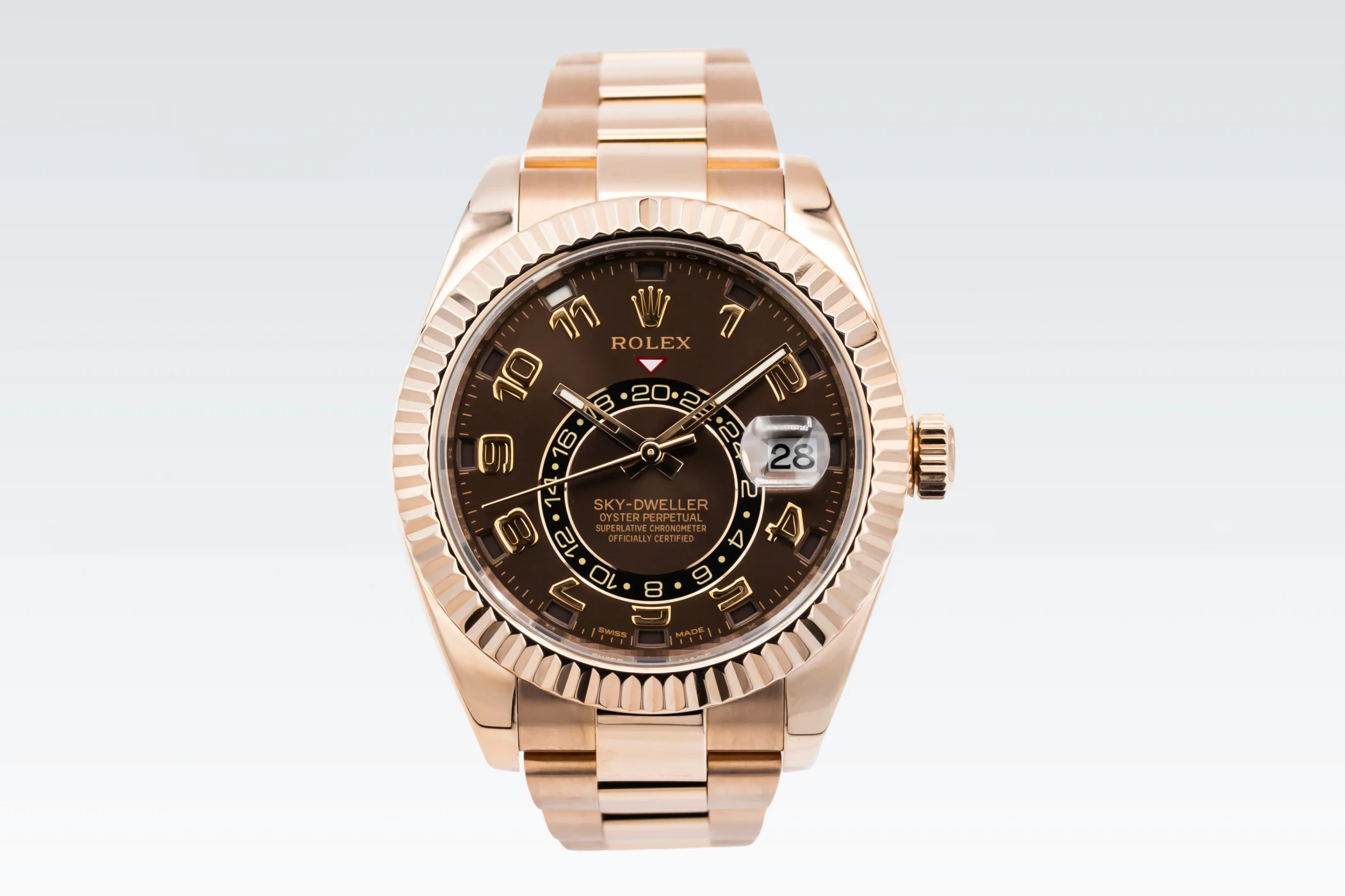 finance this from £415.49 p/m call the shop Read about our Limited Lifetime WarrantyThis 2016 Rolex Sky-Dweller 42mm features a rich chocolate brown dial adorned with arabic numerals which is complemented by the fluted Everose gold bezel. Fitted with the solid Everose gold Oyster bracelet featuring a folding Oysterclasp and Easylink extension system, this Sky-Dweller offers both presence and supreme comfort.