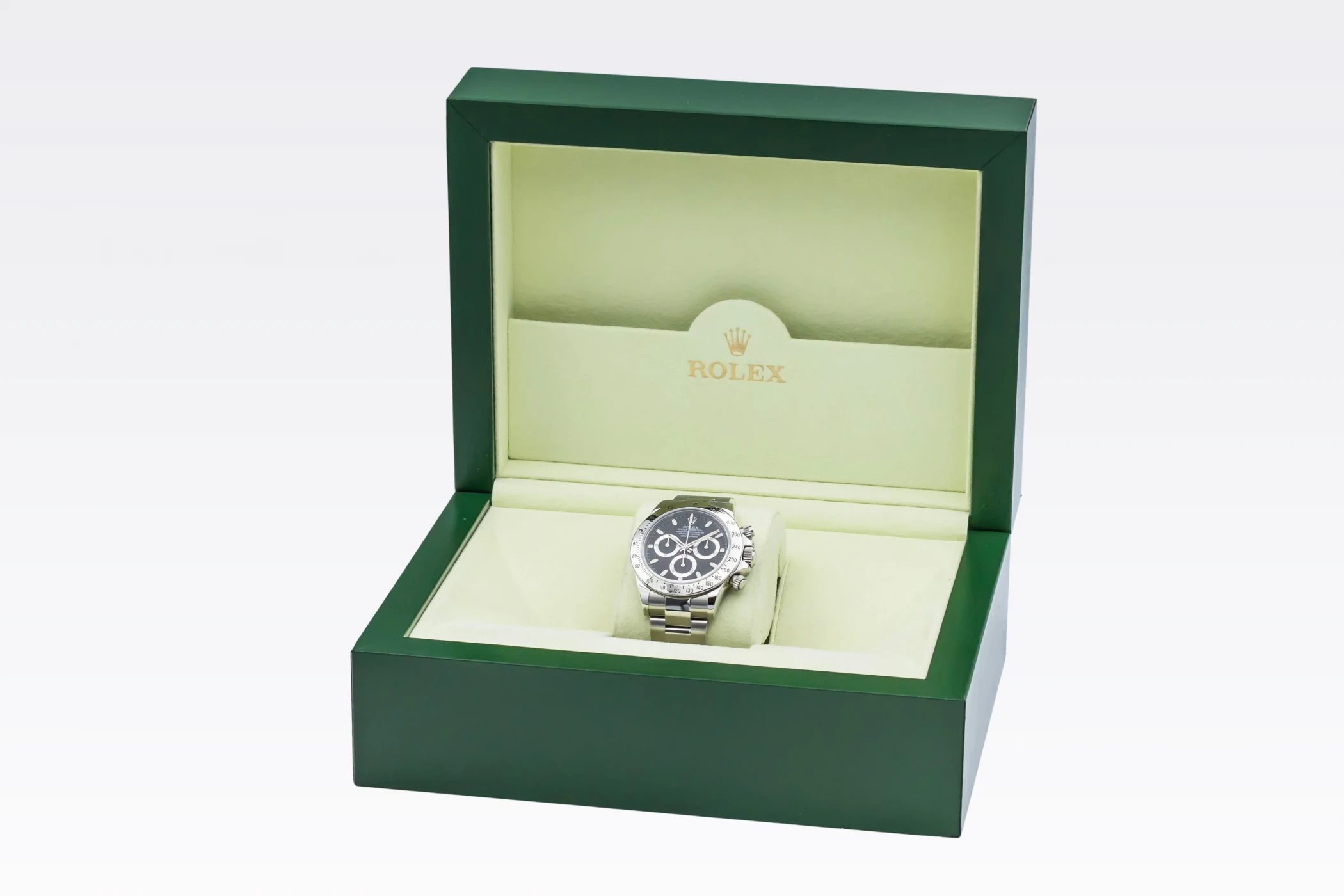 This 2014 Rolex Cosmograph Daytona 40mm is a timepiece that embodies the iconic design of the Daytona line. The fixed steel bezel features an engraved tachymetric scale, while the black dial is accented by three chronograph sub-dials and applied hour markers. A robust Oyster bracelet completes the sporty yet luxurious aesthetic, combining functionality with Rolex’s signature finishing.