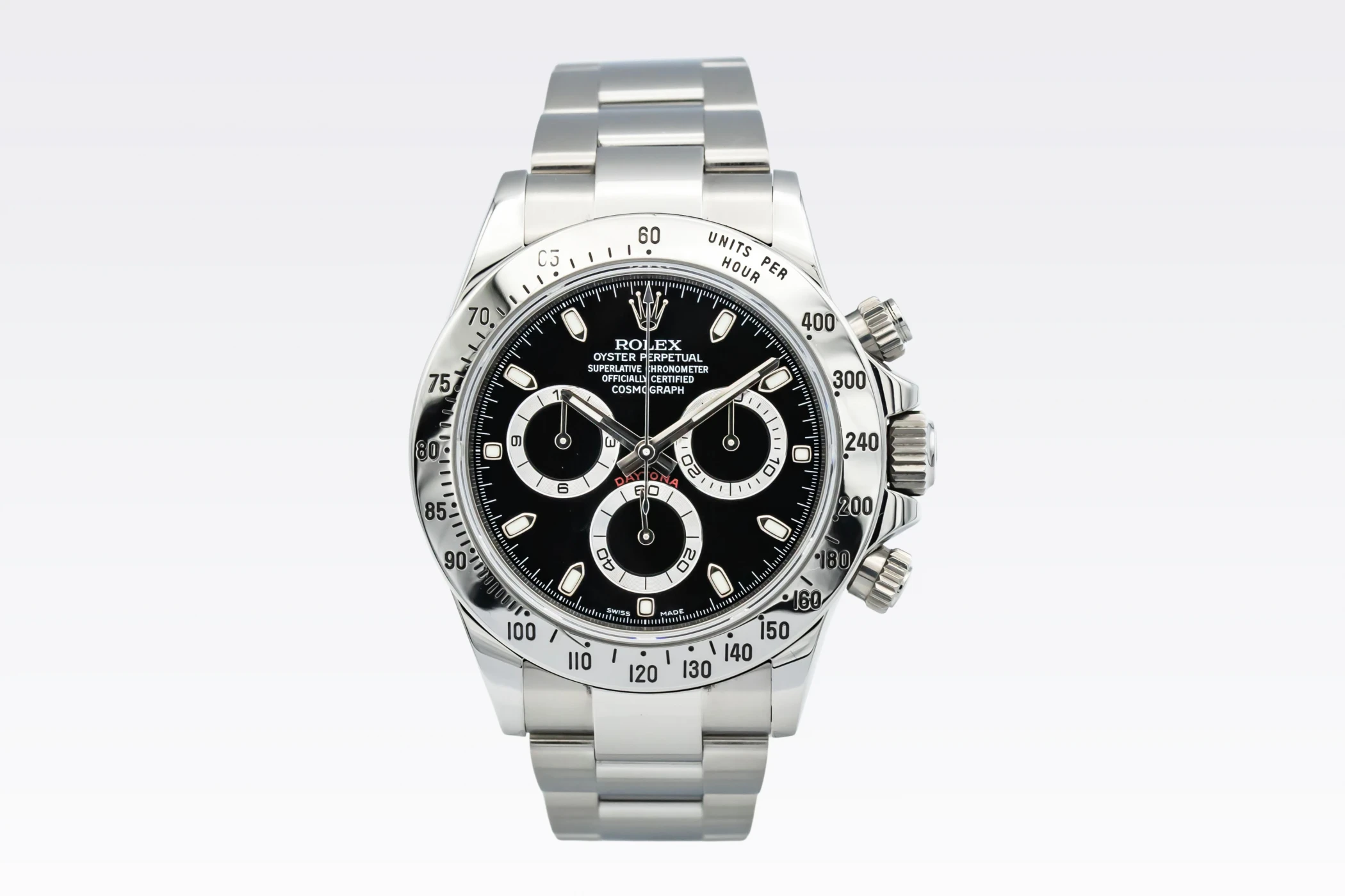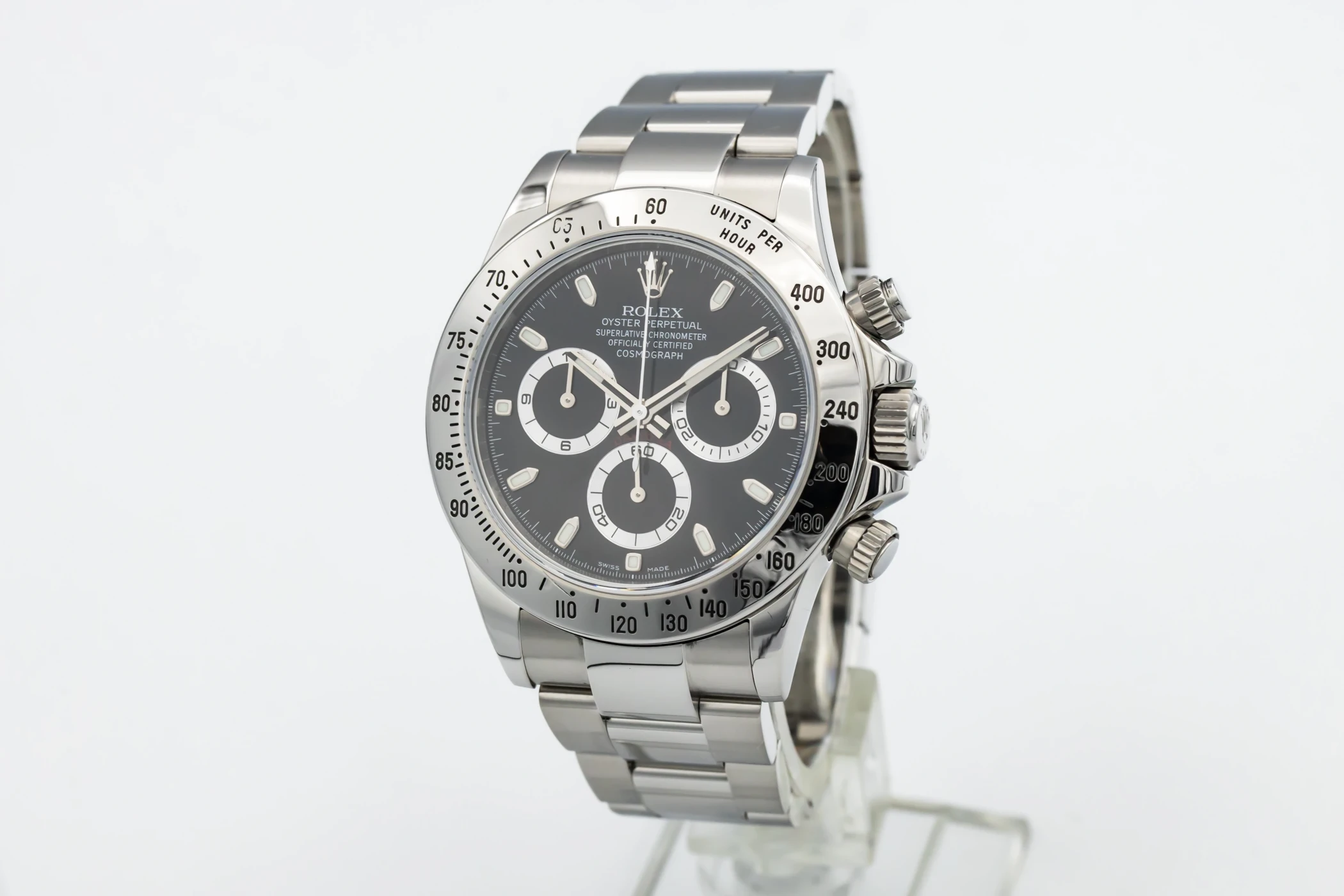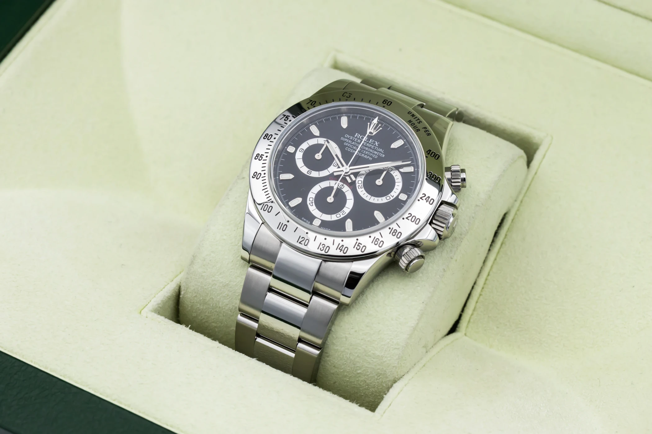 Introduced around 2000, the Reference 116520 was the first in the Daytona series to house Rolex’s in-house automatic chronograph movement, Calibre 4130. By 2014 it had become highly sought after, marking the end of the steel-bezel era before later models shifted to Cerachrom ceramic bezels.