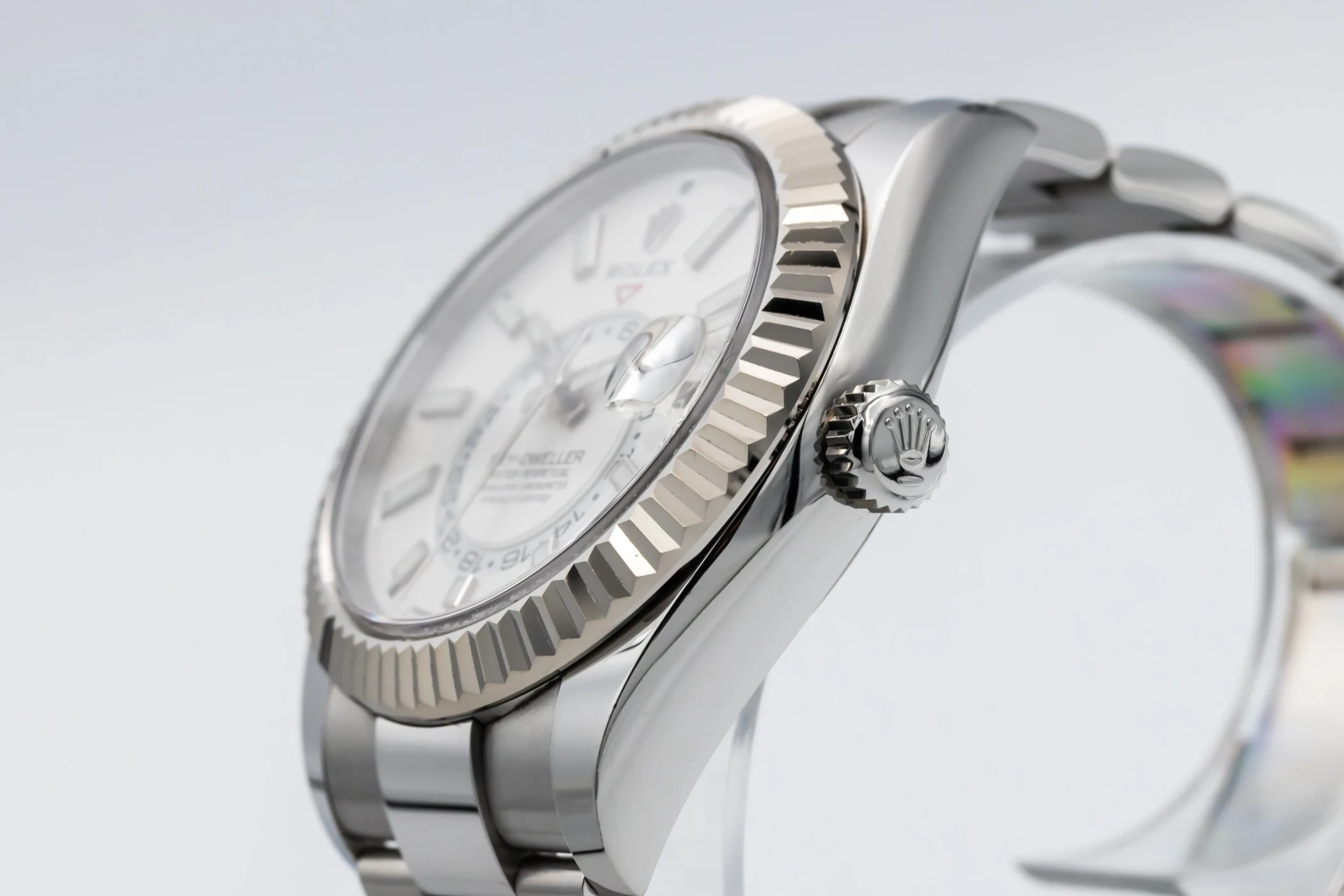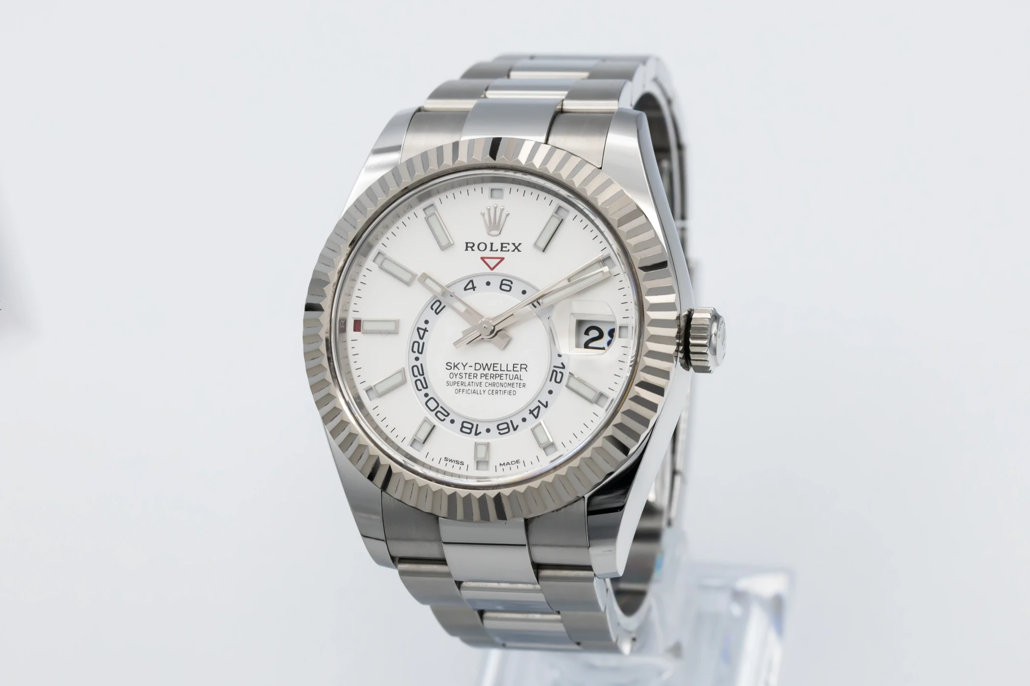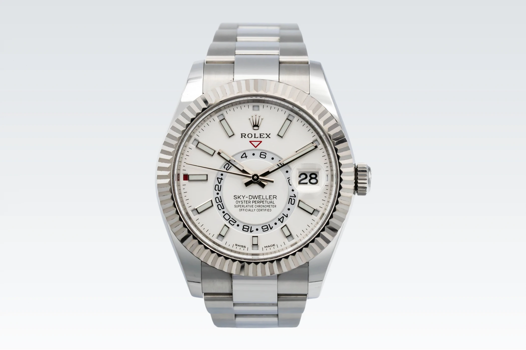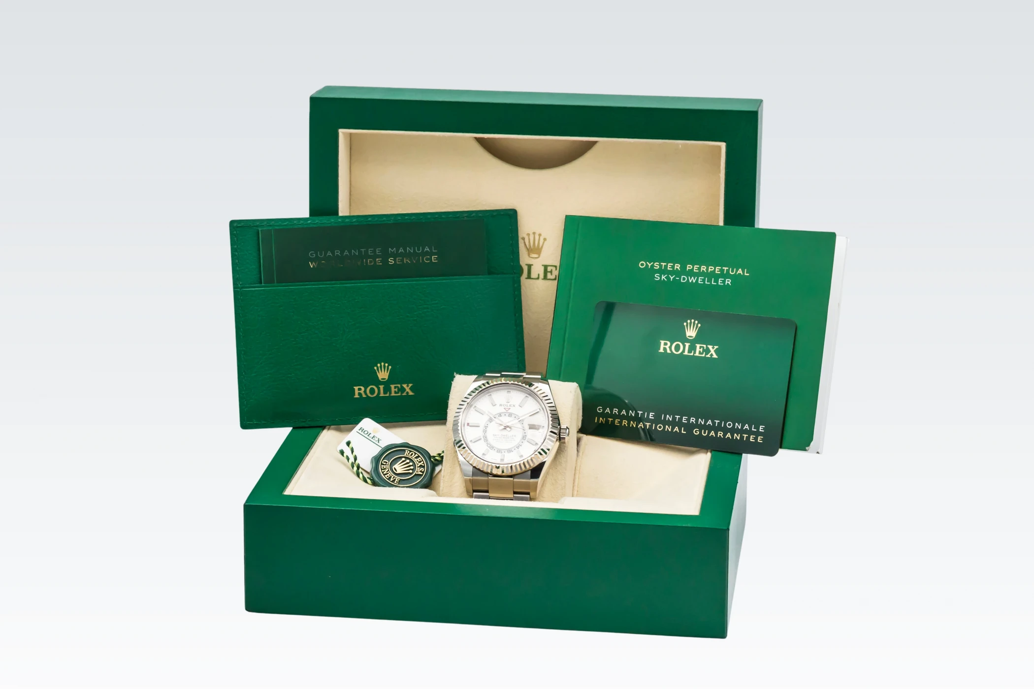 This 2020 Rolex Sky-Dweller 42mm features a white dial with baton markers which is complemented by the fluted 18ct white gold bezel. Fitted with the solid stainless steel Oyster bracelet featuring a folding Oysterclasp and Easylink extension system, this Sky-Dweller offers both presence and supreme comfort.