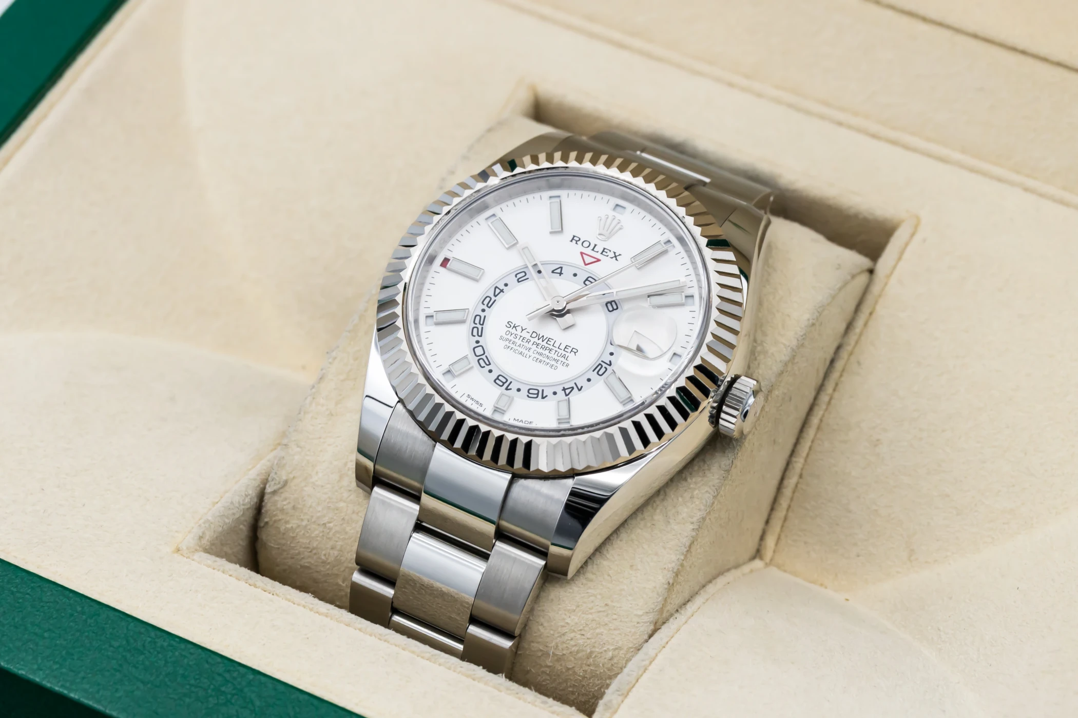 Introduced in 2012, the Sky-Dweller stands as one of Rolex’s most complex and prestigious creations, designed for global travellers who demand both style and performance. The model’s revolutionary Calibre 9001 movement, entirely developed and manufactured by Rolex, allows intuitive adjustment of time, date, and month via the rotating bezel and crown system.