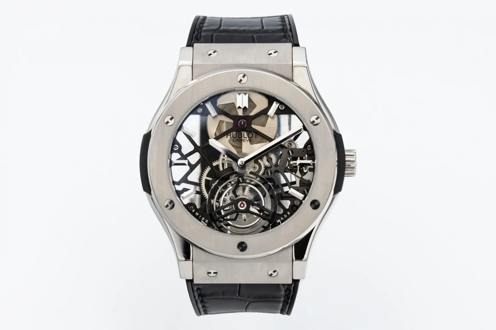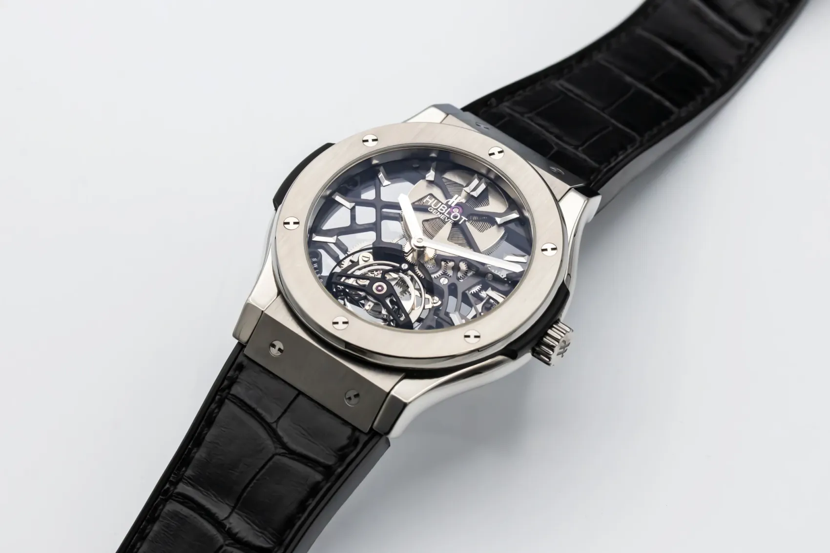 The circa 2015 Hublot Classic Fusion Tourbillon features a striking 45mm case crafted from polished and satin-finished titanium. The bezel, secured with Hublot’s signature six H-shaped titanium screws, frames a skeletonised sapphire dial that reveals the moving tourbillon and intricate inner workings of the in-house movement. The black alligator strap mounted on rubber adds contrasting texture and comfort.