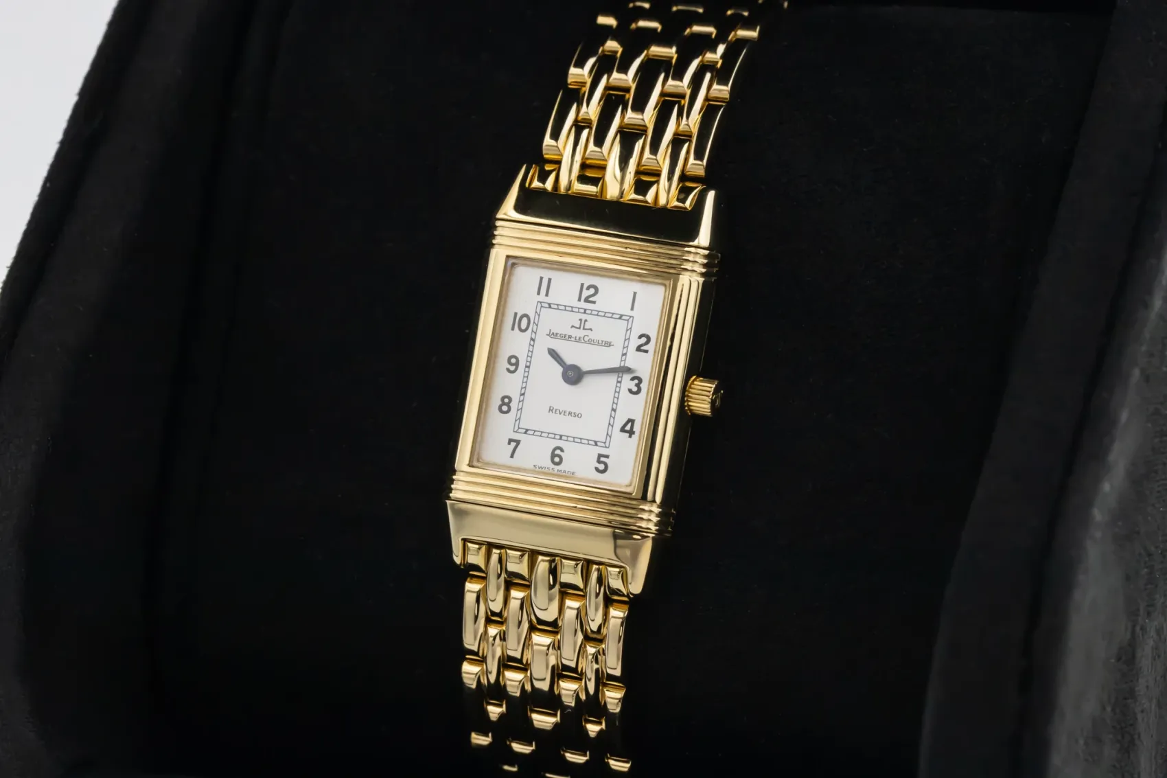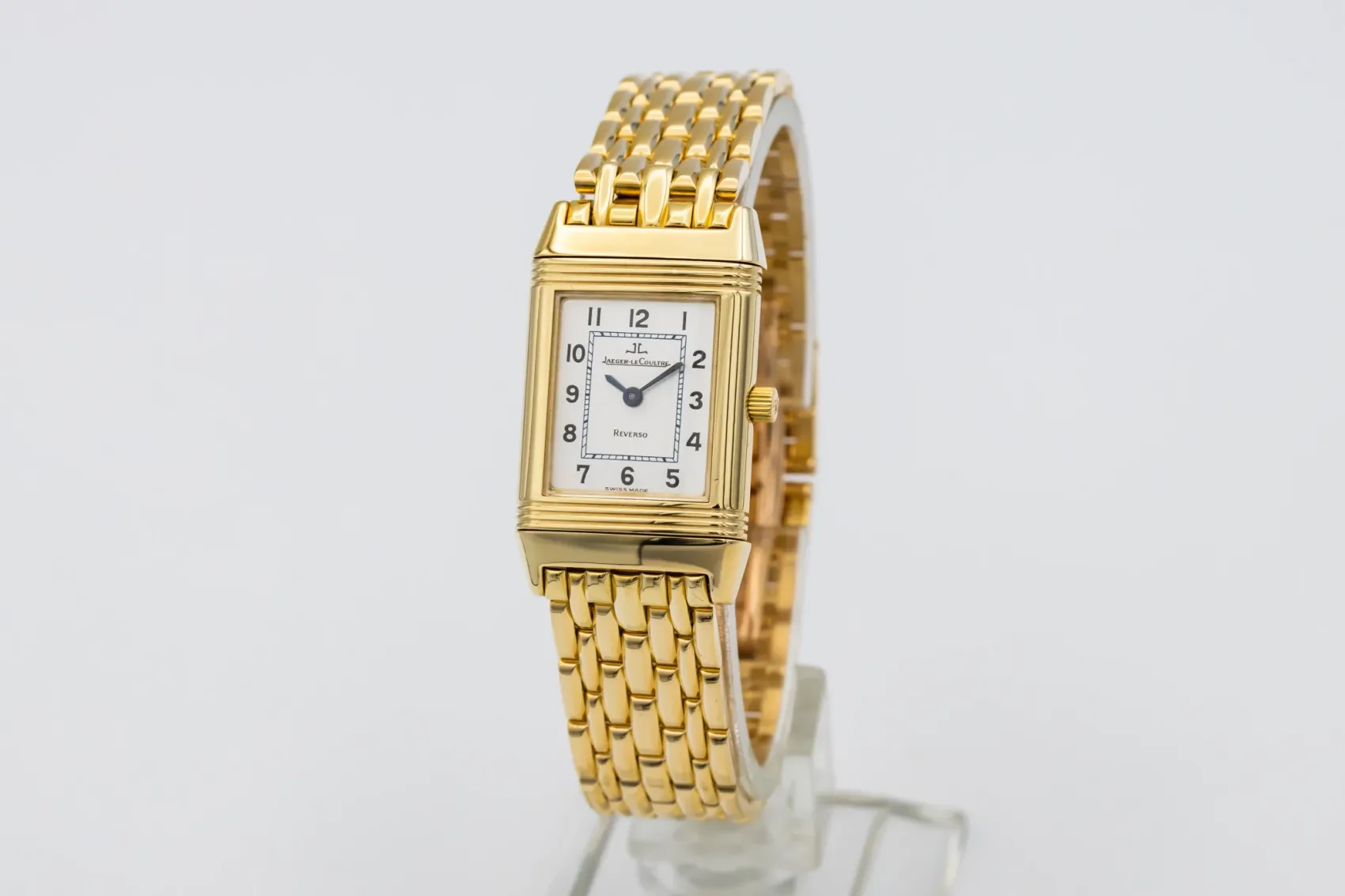 finance this from £241.19 p/m call the shop Read about our Limited Lifetime WarrantyThe 1997 Jaeger-LeCoultre Reverso 20x33mm in 18ct yellow gold is an enduring symbol of Art Deco elegance and refined craftsmanship. Its rectangular 18ct yellow gold case, measuring 20mm by 33mm, features a silvered guilloché dial with Arabic numerals. Presented on a 18ct yellow gold strap with a gold Jaeger-LeCoultre buckle.