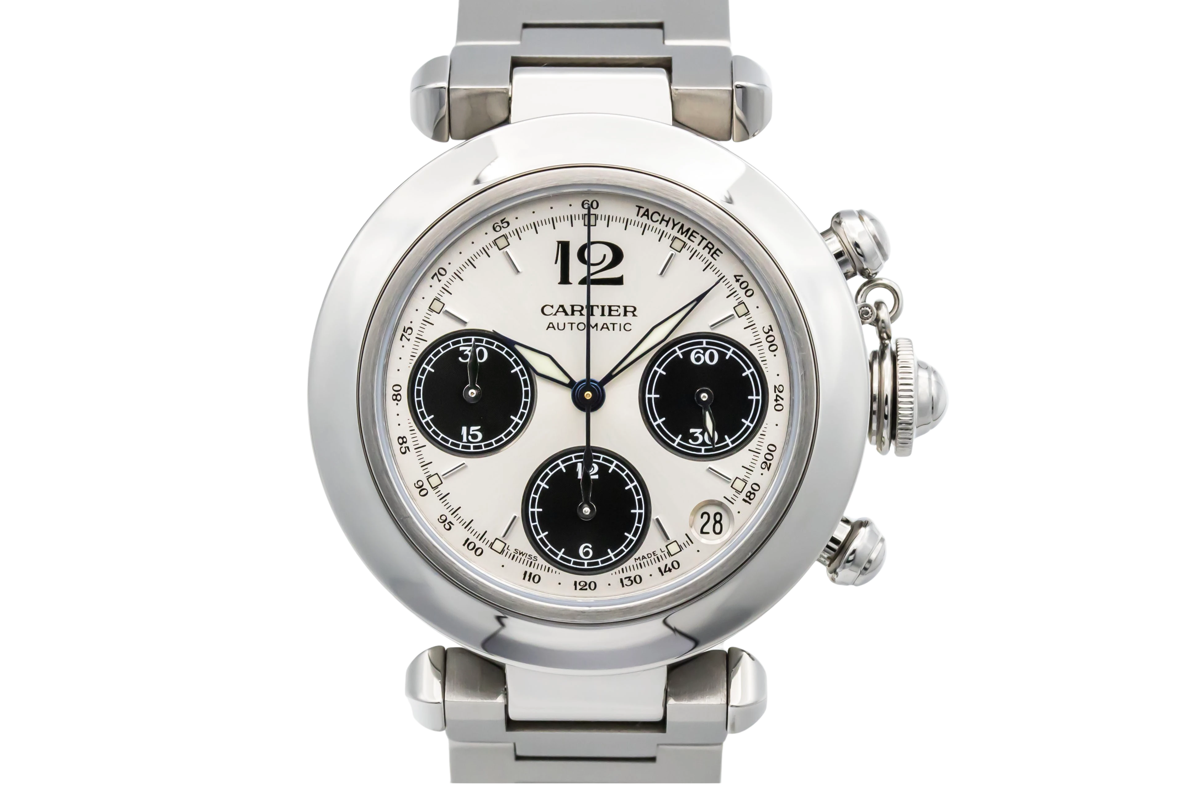 This circa 2000s Cartier Pasha Chronograph 34mm presents a silver dial features classic baton markers and three recessed chronograph registers for balanced symmetry. A smooth polished bezel frames the dial, offering a clean contrast to the sporty chronograph layout. The watch is fitted with a matching stainless steel bracelet.