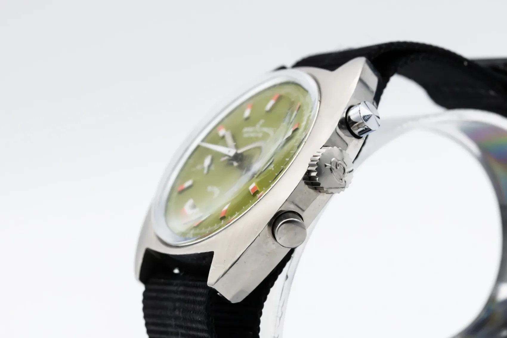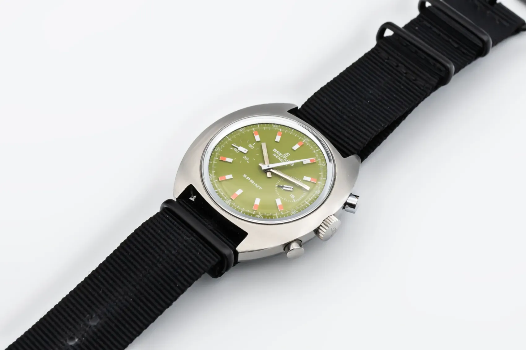 finance this from £46.84 p/m call the shop Read about our Limited Lifetime WarrantyThis rare vintage Breitling Sprint 40mm features a bold green stainless steel tonneau-inspired case that typifies the early 1970s chronograph style. The green dial includes contrasting sub-dials, vivid accent orange chronograph hands and baton markers. Fitted with a black fabric strap which is adding to its sporty and retro aesthetic.