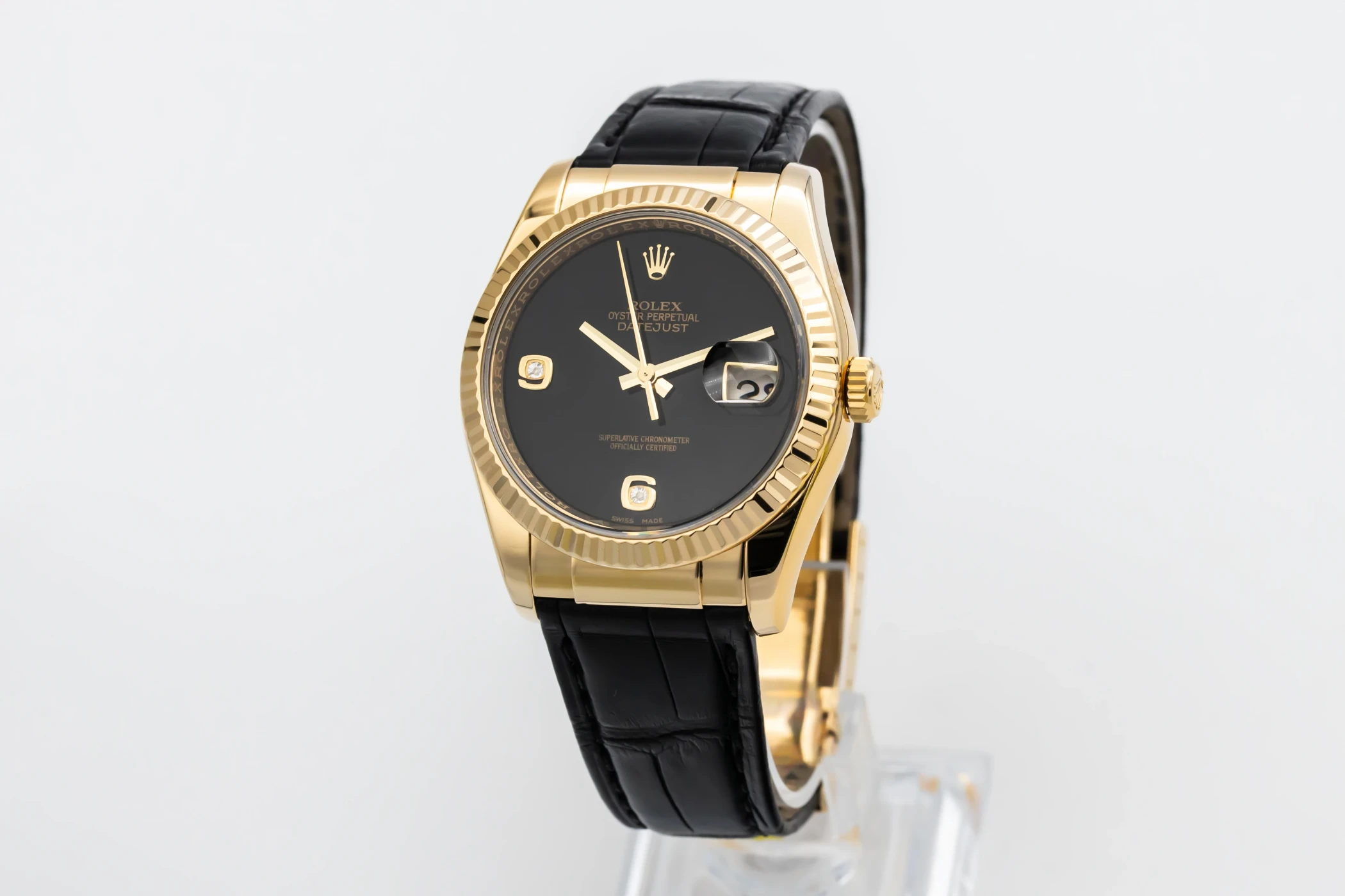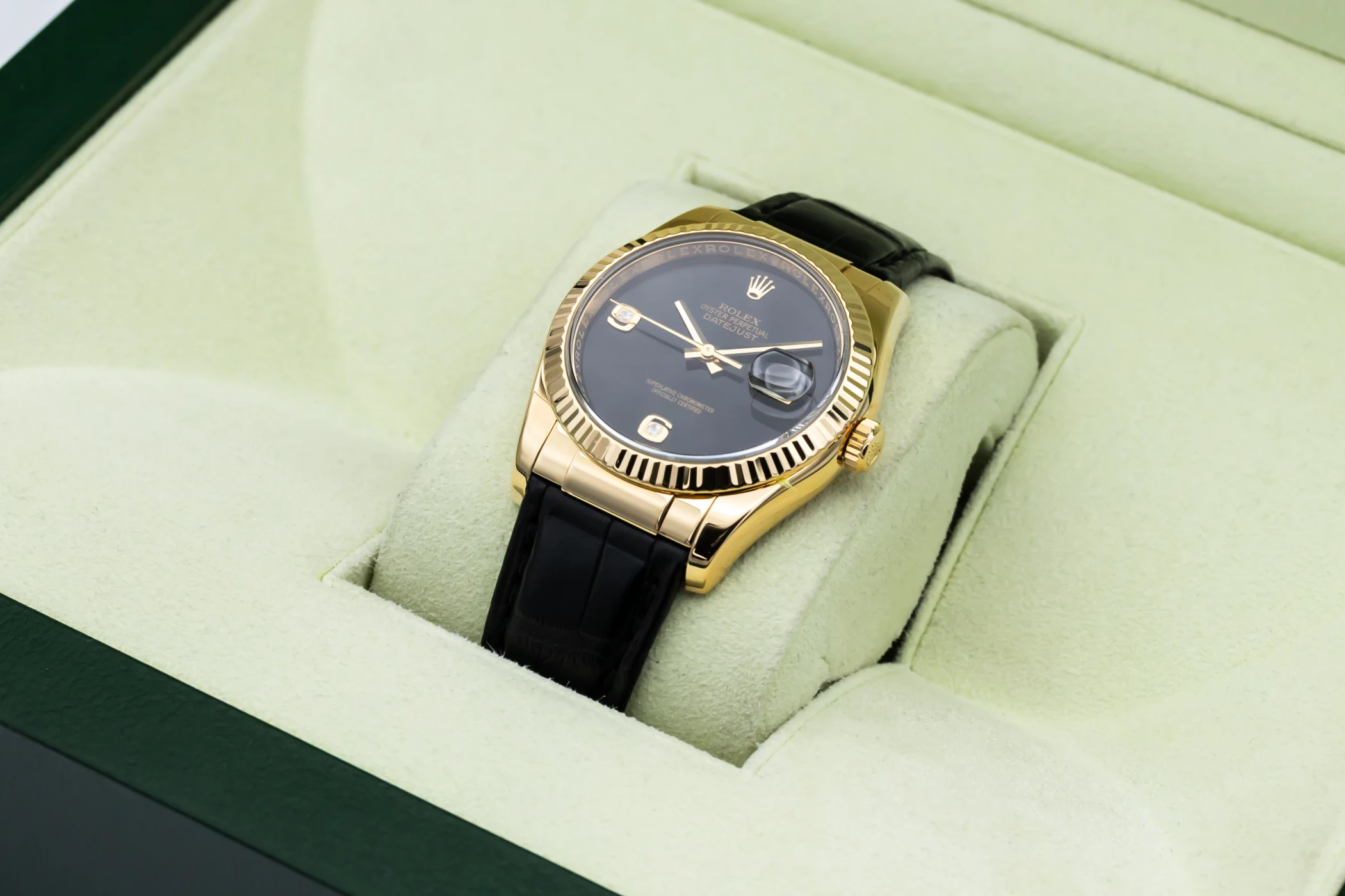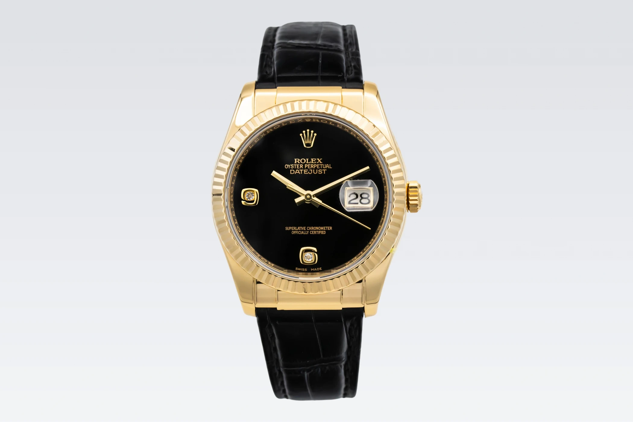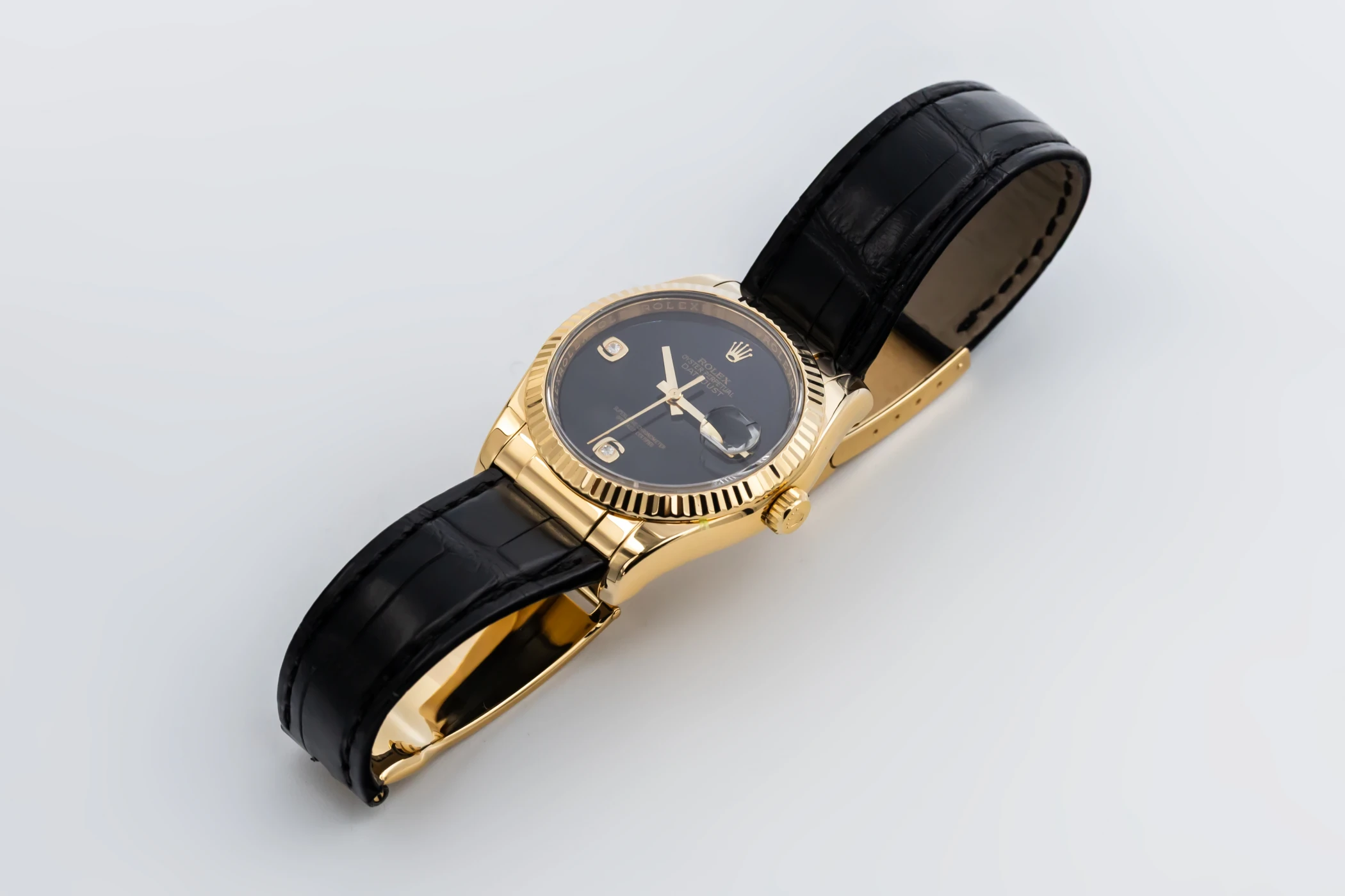 This 2008 Rolex DateJust 36mm features a deep black onyx dial, cut from a single piece of natural stone—displays a sleek, minimalist aesthetic, free from hour markers for a seamless, uninterrupted surface. Paired with a luxurious black Rolex leather strap and matching 18ct yellow gold folding clasp, this piece embodies the pinnacle of timeless design and artisanal craftsmanship.