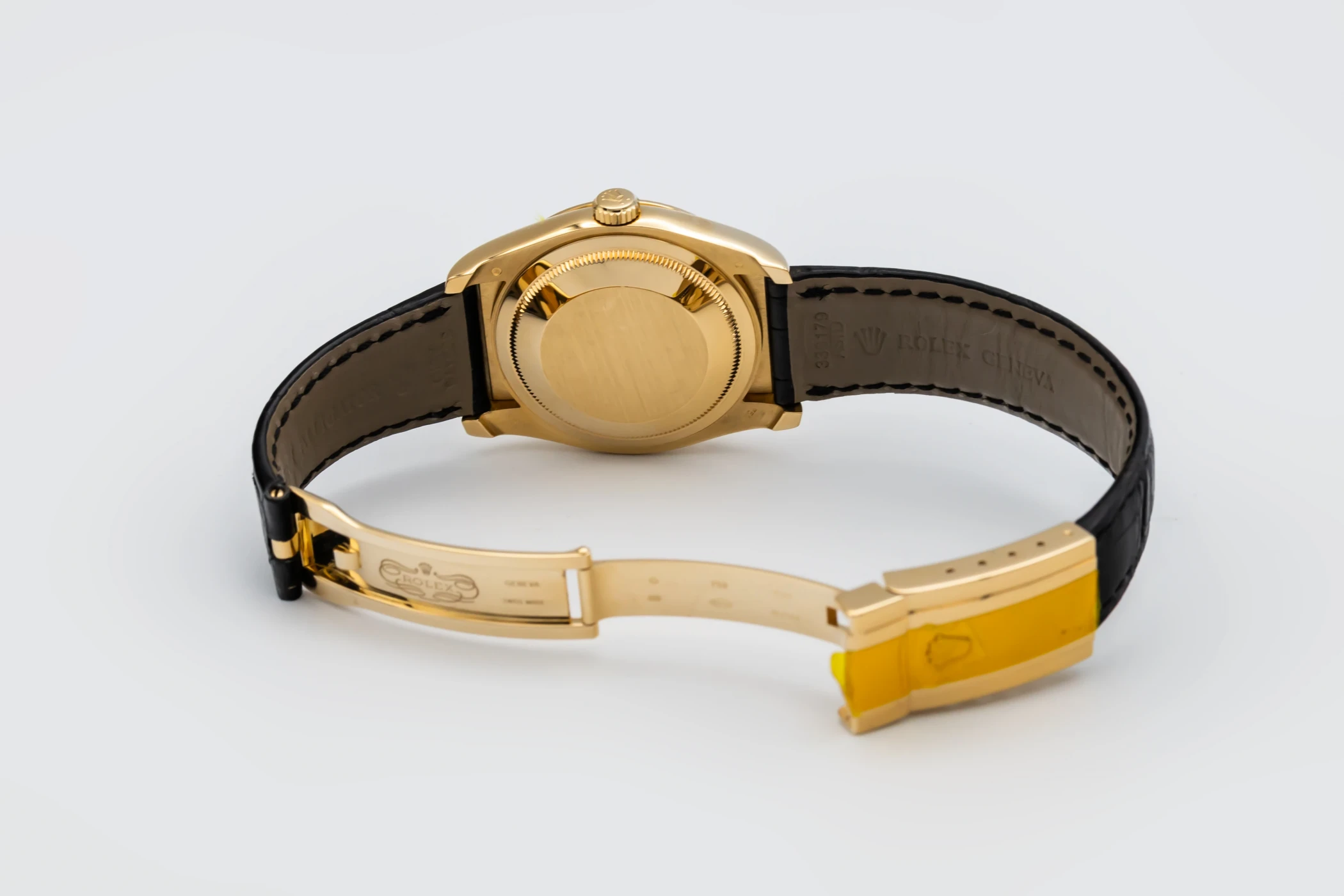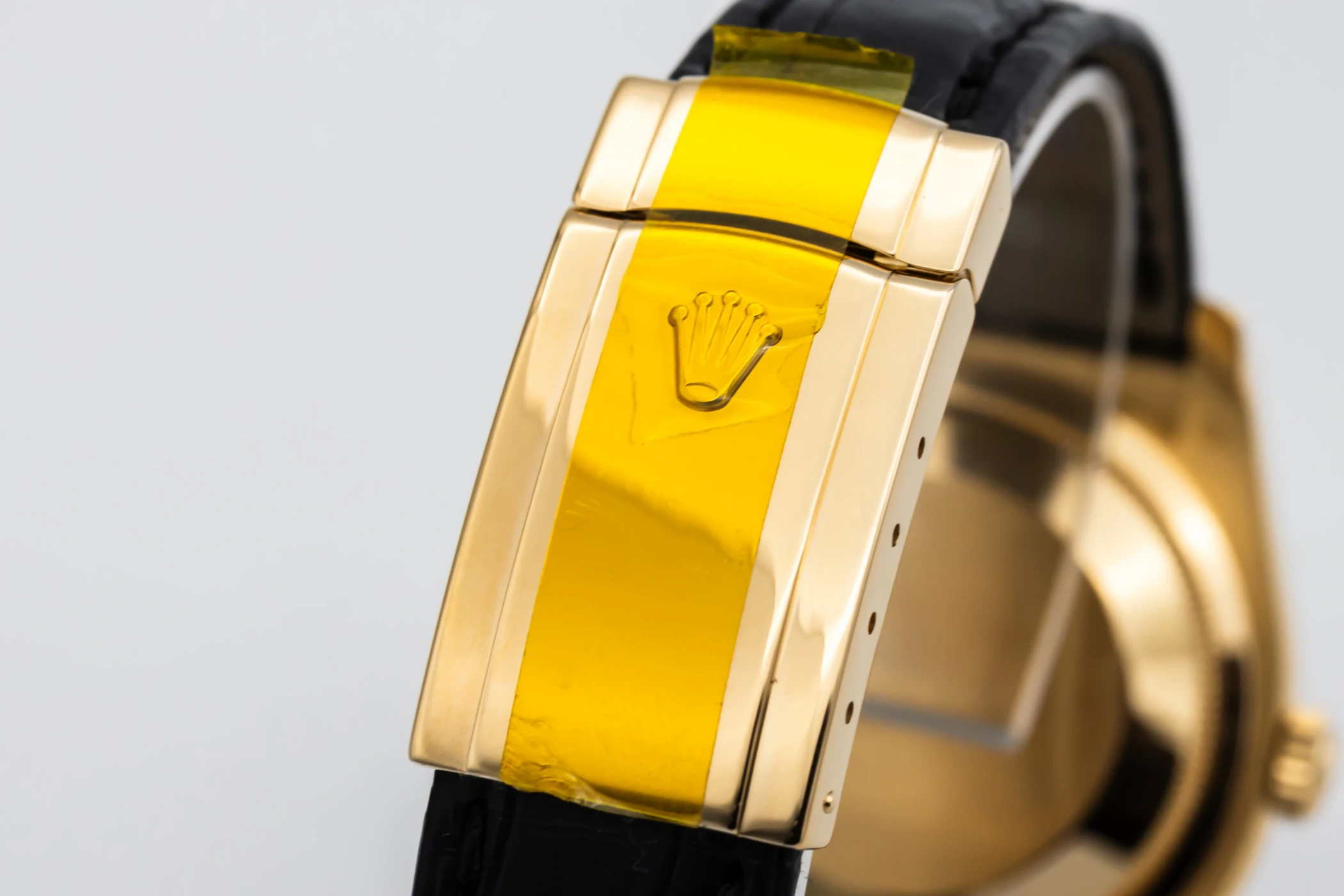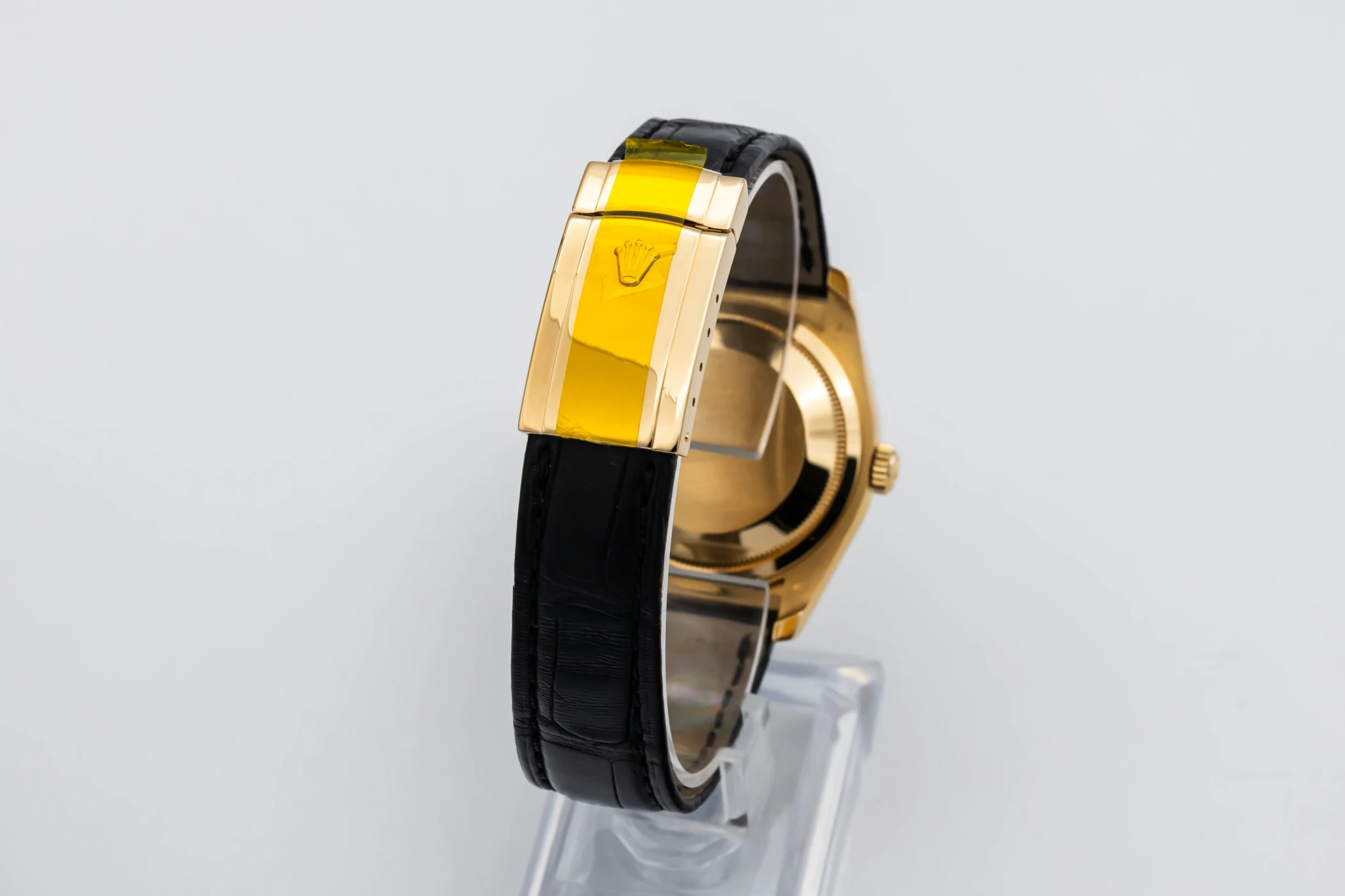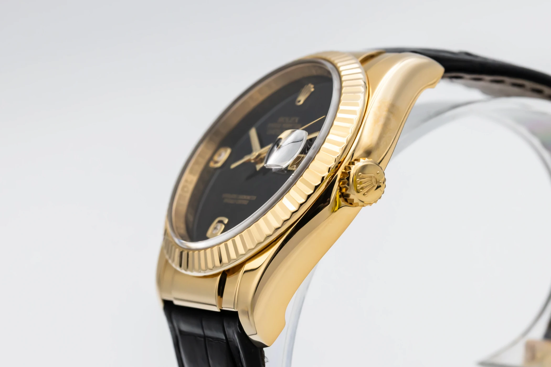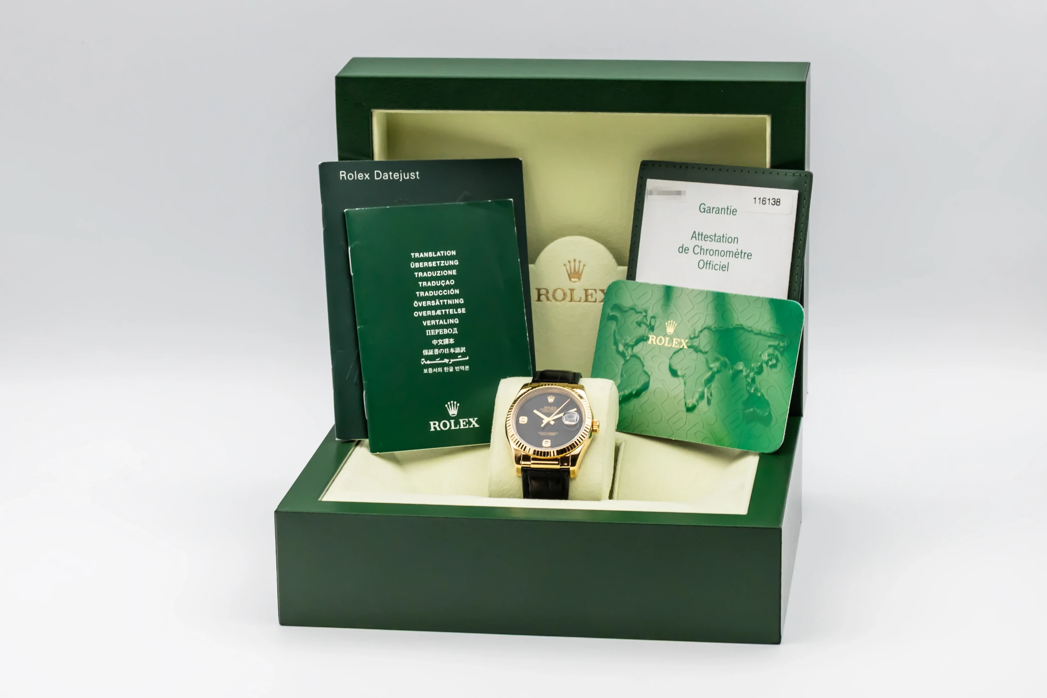 This 2008 Rolex DateJust 36mm features a deep black onyx dial, cut from a single piece of natural stone—displays a sleek, minimalist aesthetic, free from hour markers for a seamless, uninterrupted surface. Paired with a luxurious black Rolex leather strap and matching 18ct yellow gold folding clasp, this piece embodies the pinnacle of timeless design and artisanal craftsmanship.