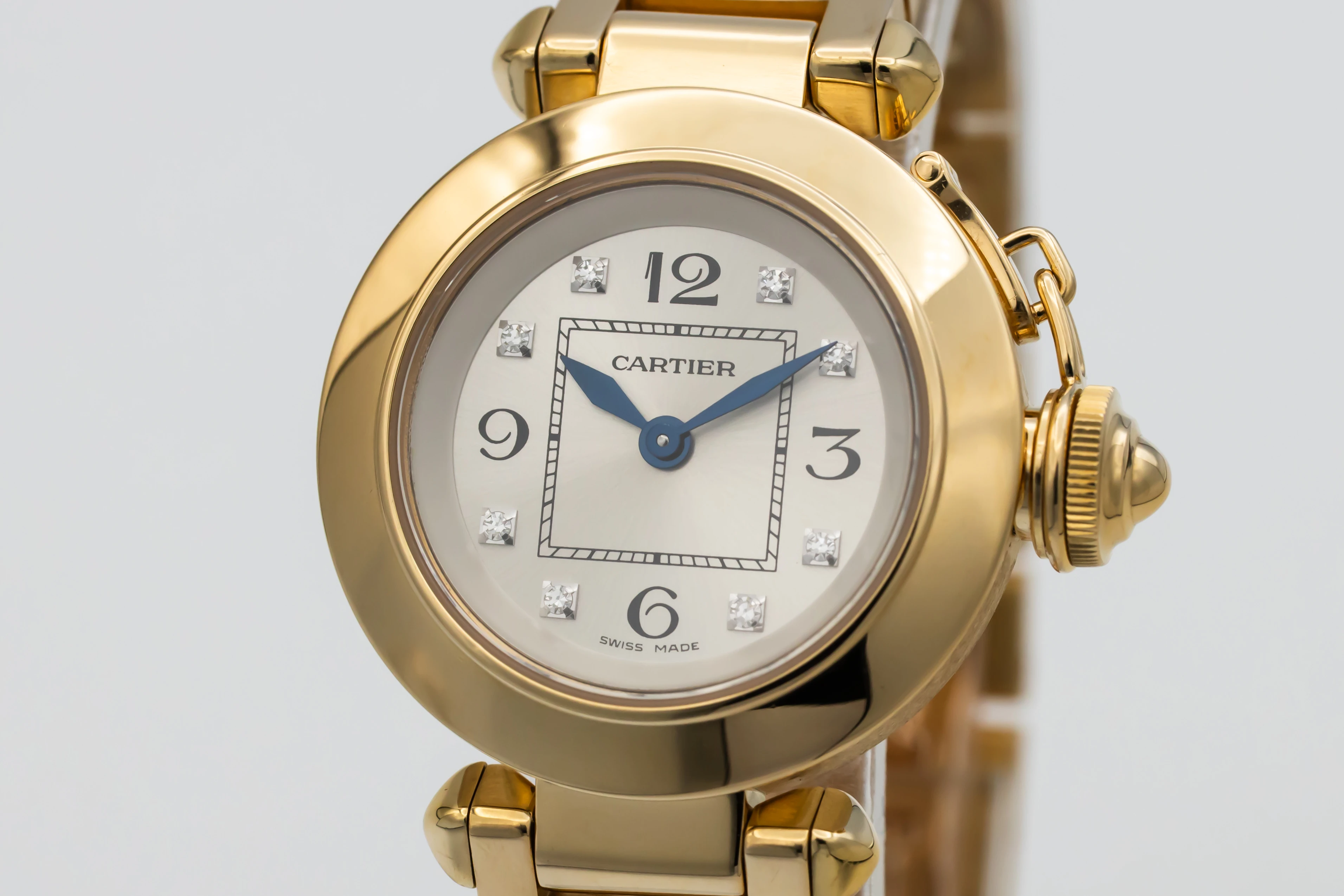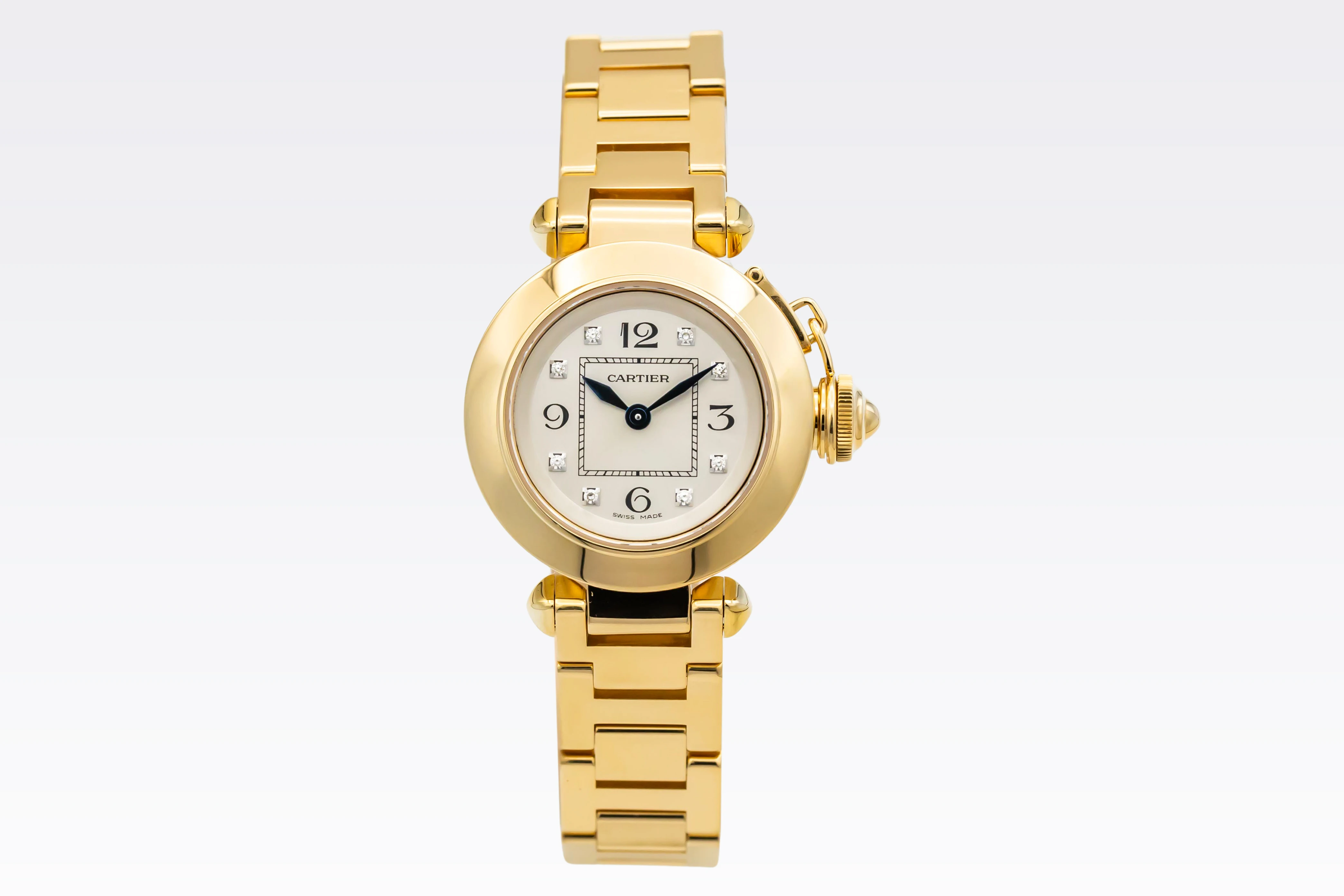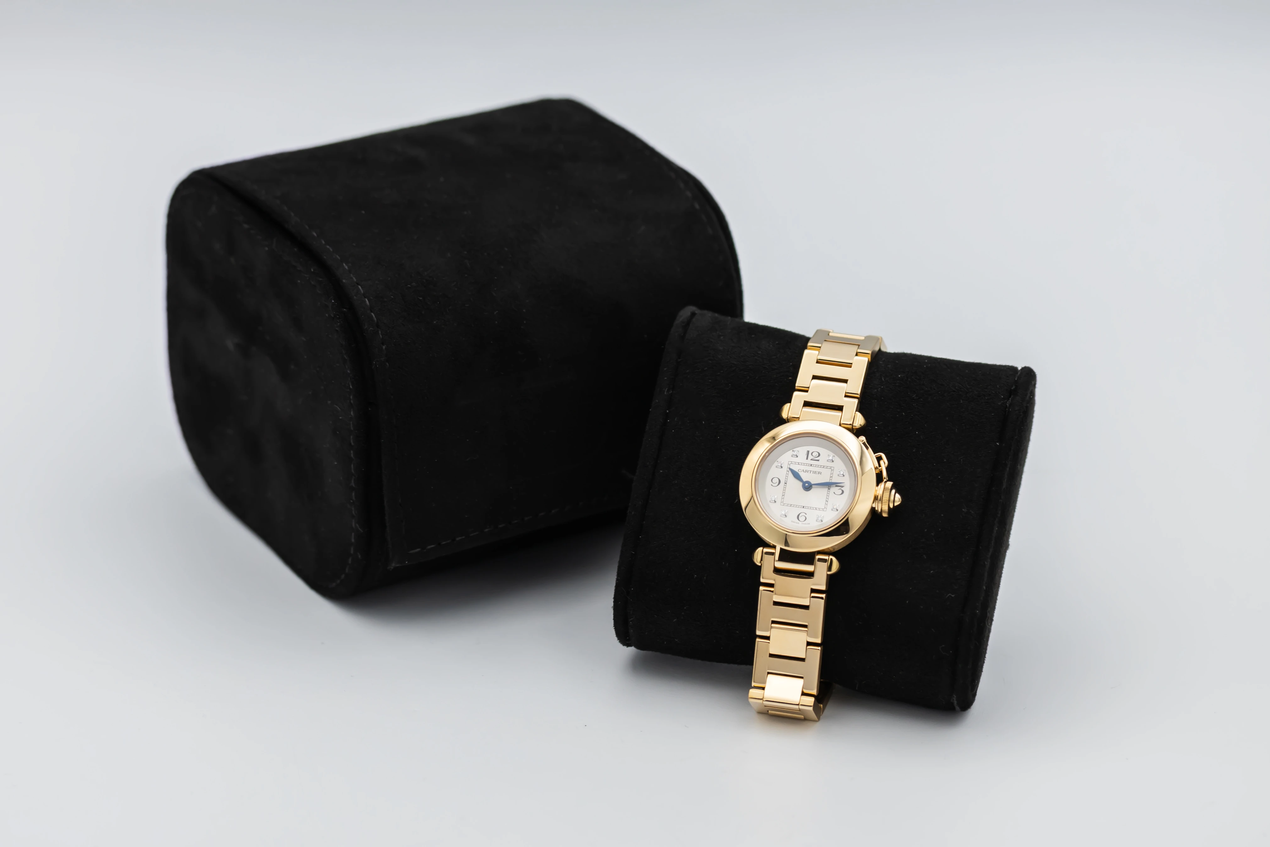 First introduced in 1985, the Cartier Pasha line was inspired by a 1930s waterproof watch designed for the Pasha of Marrakech, becoming one of Cartier’s most recognisable round-case collections. The Miss Pasha variation was later launched as a more compact, feminine version.