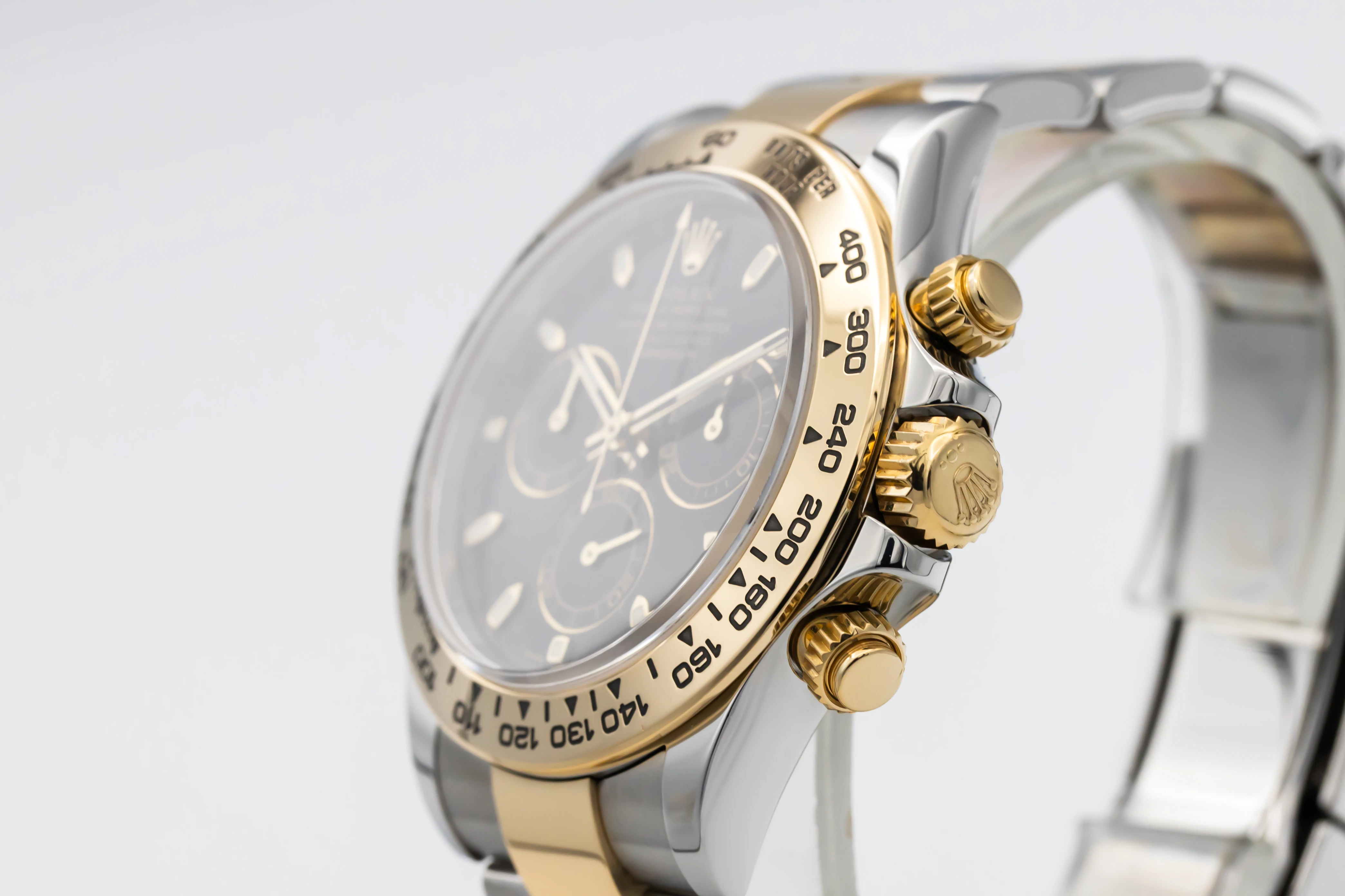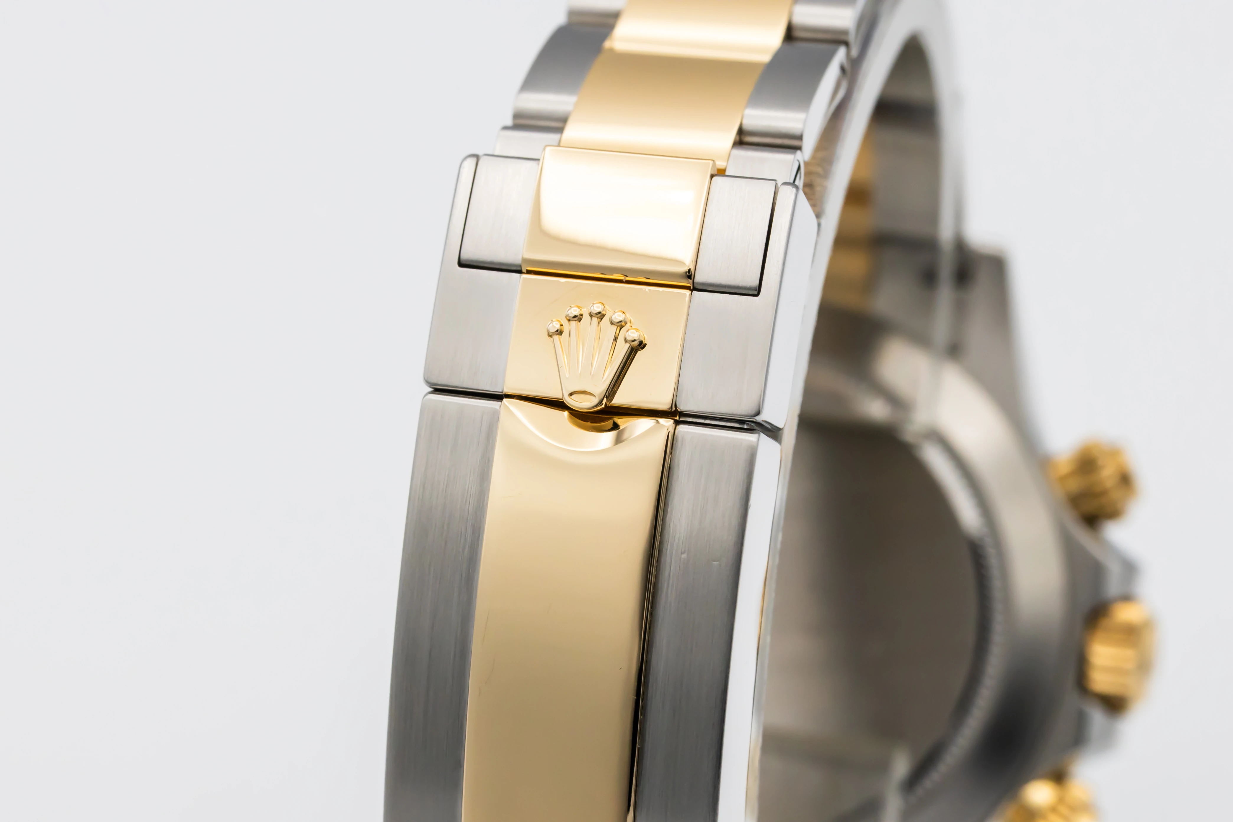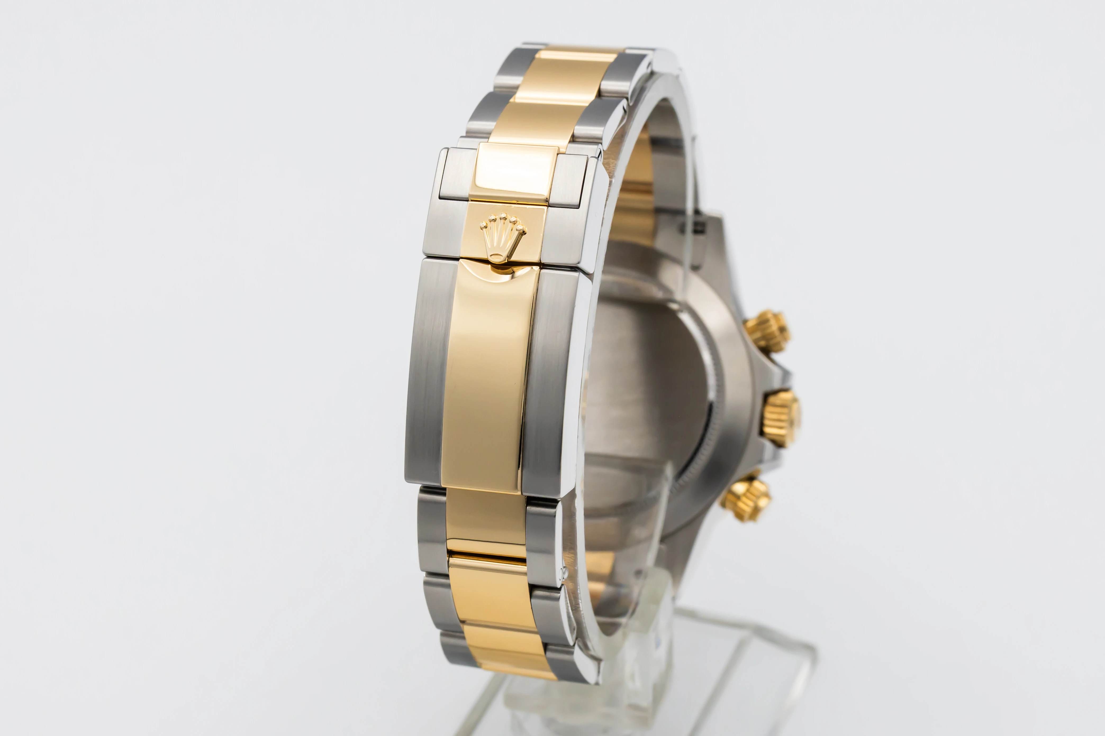 This 2021 Rolex Cosmograph Daytona features a black dial—paired with contrasting sub-dials—displays luminous hour markers and hands for excellent readability, all protected by a scratch-resistant sapphire crystal. The polished gold bezel features an engraved tachymetric scale, giving the watch its unmistakable racing identity. The steel and yellow gold Oyster bracelet enhances the watch’s sporty elegance, combining robustness with refined comfort.