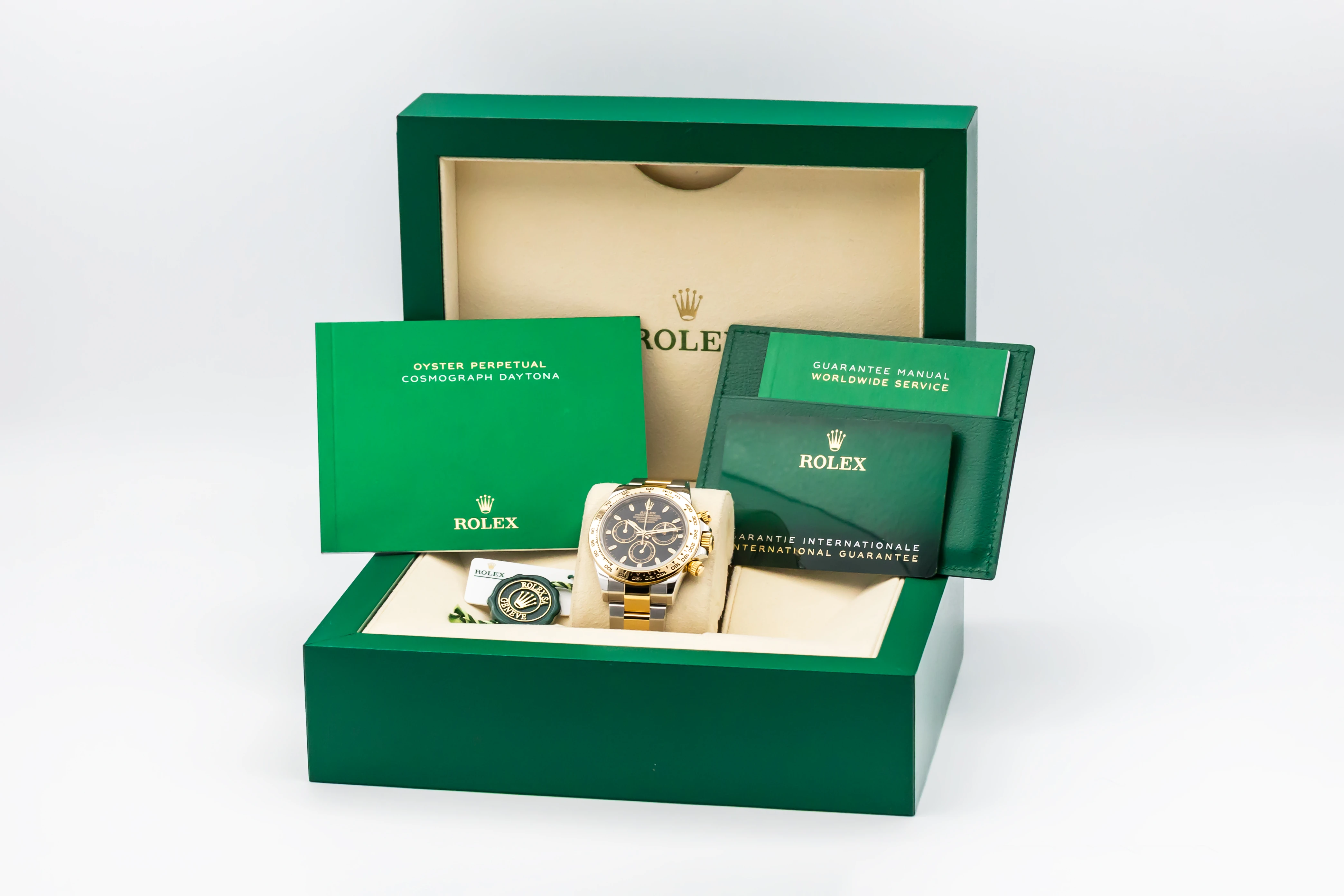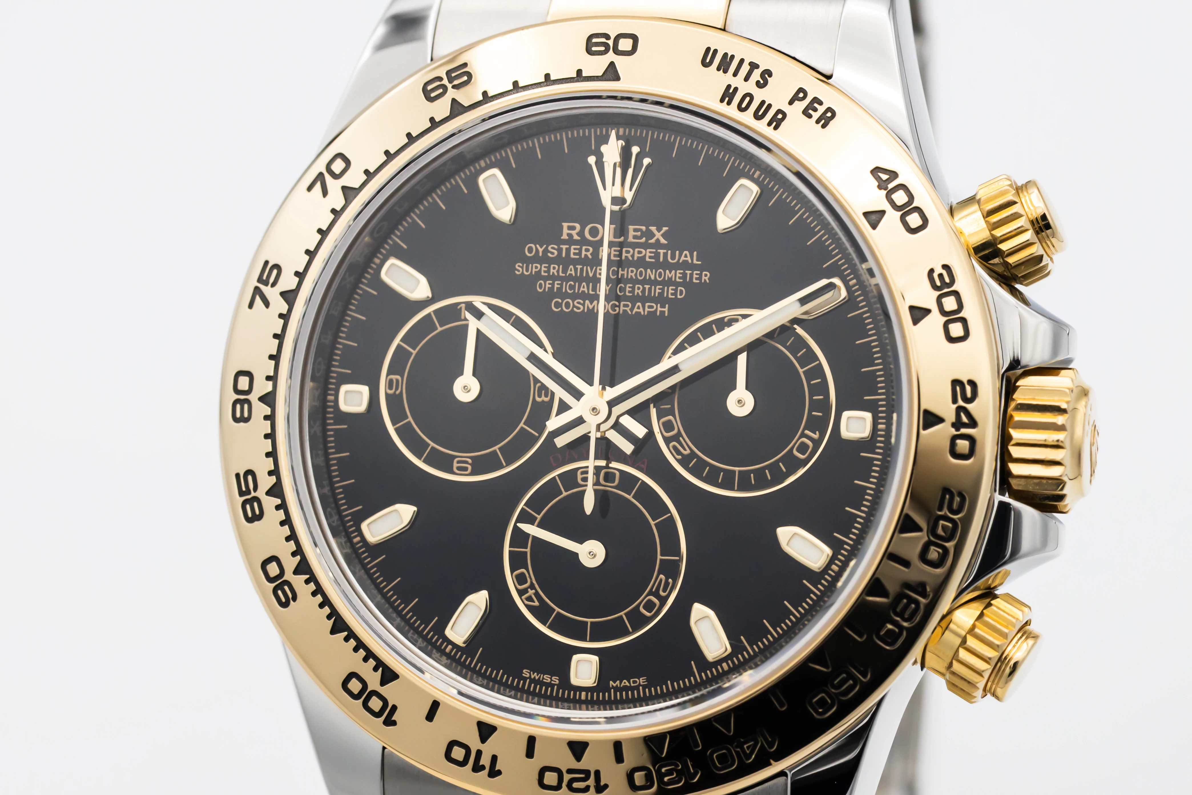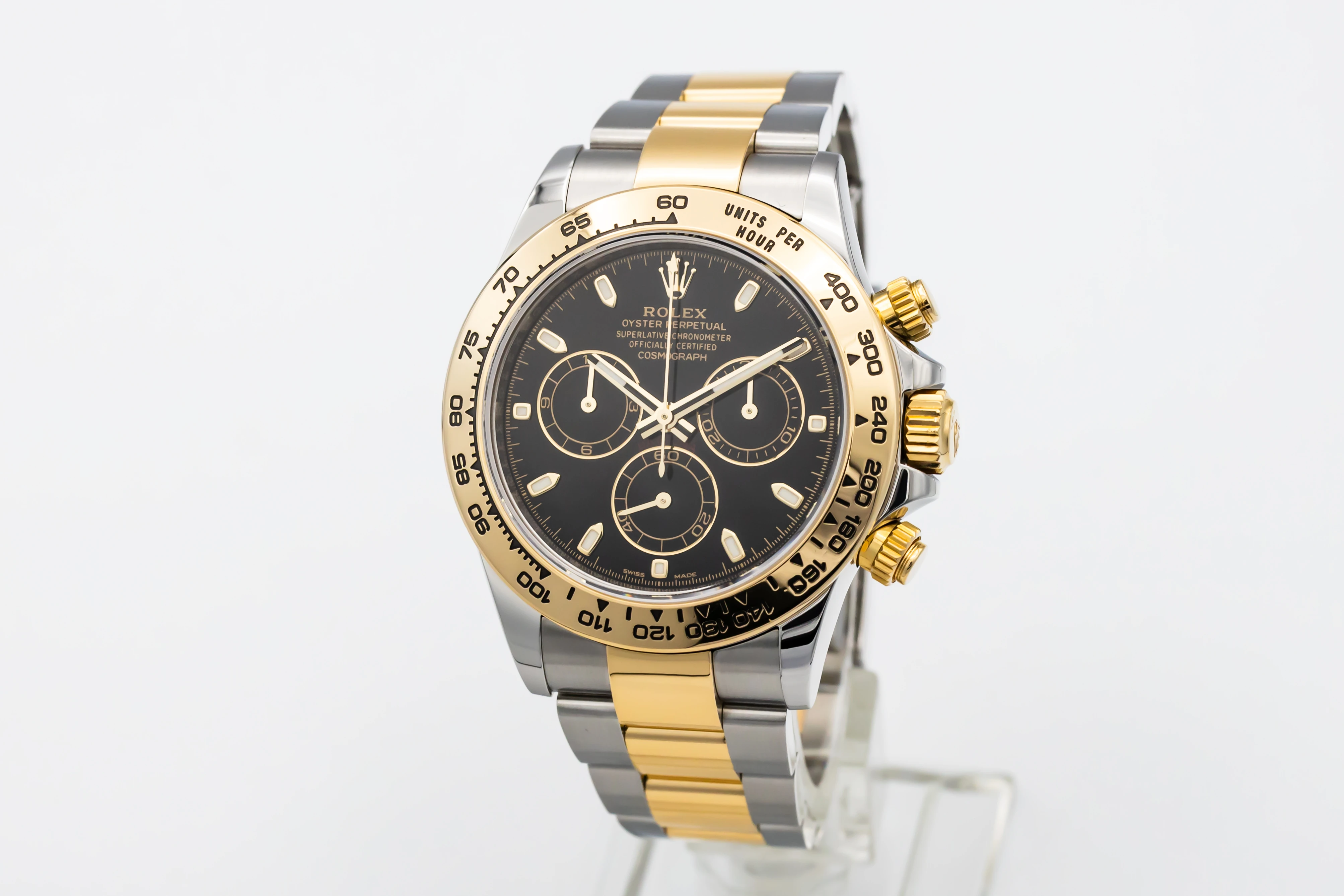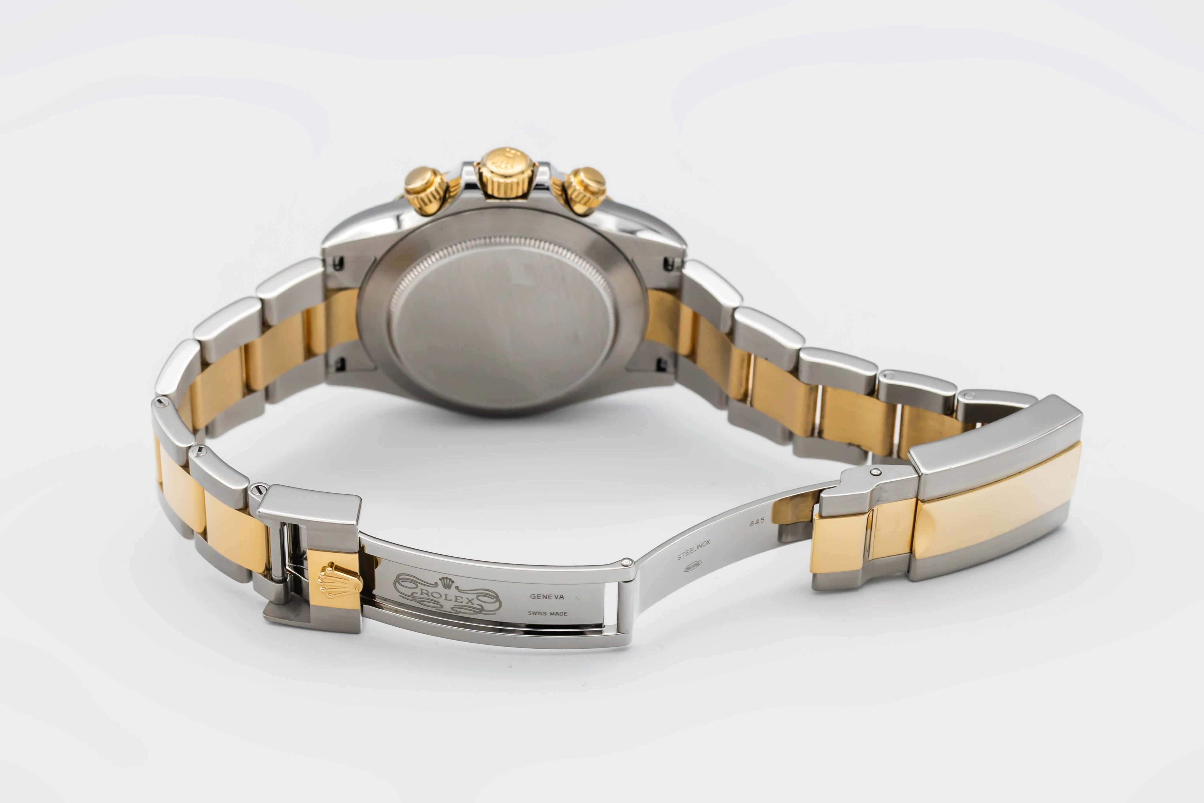 This 2021 Rolex Cosmograph Daytona features a black dial—paired with contrasting sub-dials—displays luminous hour markers and hands for excellent readability, all protected by a scratch-resistant sapphire crystal. The polished gold bezel features an engraved tachymetric scale, giving the watch its unmistakable racing identity. The steel and yellow gold Oyster bracelet enhances the watch’s sporty elegance, combining robustness with refined comfort.