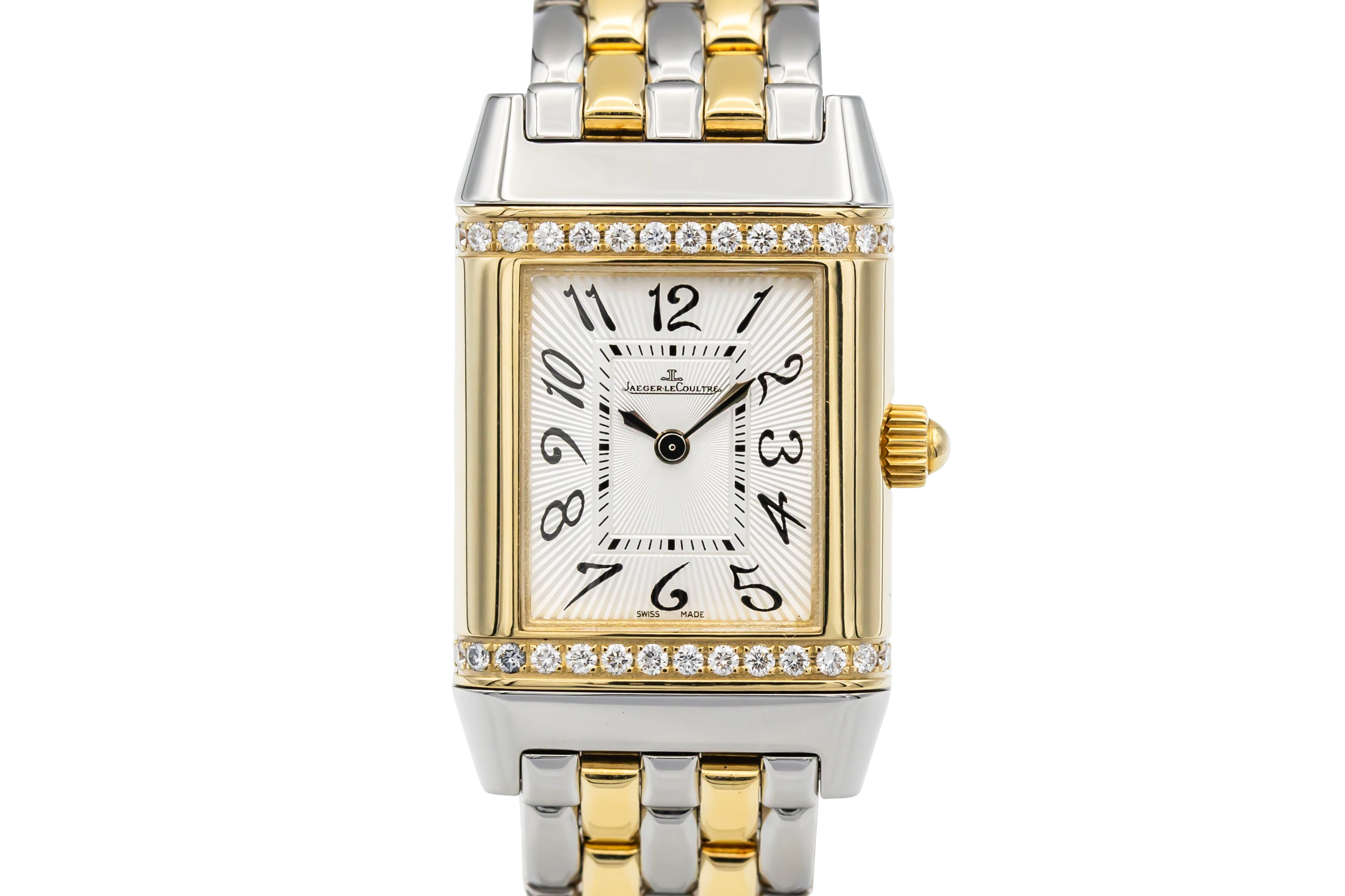 This 2009 Jaeger-LeCoultre Reverso features a refined two-tone construction, combining polished stainless steel with 18ct yellow-gold. The rectangular reversible case measures elegantly on the wrist, paired with classic Reverso styling such as the gadrooned detailing and clean dial layout.
