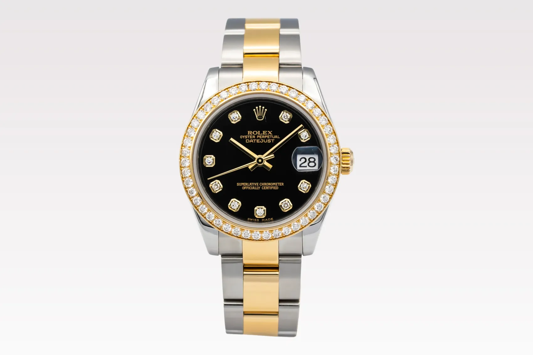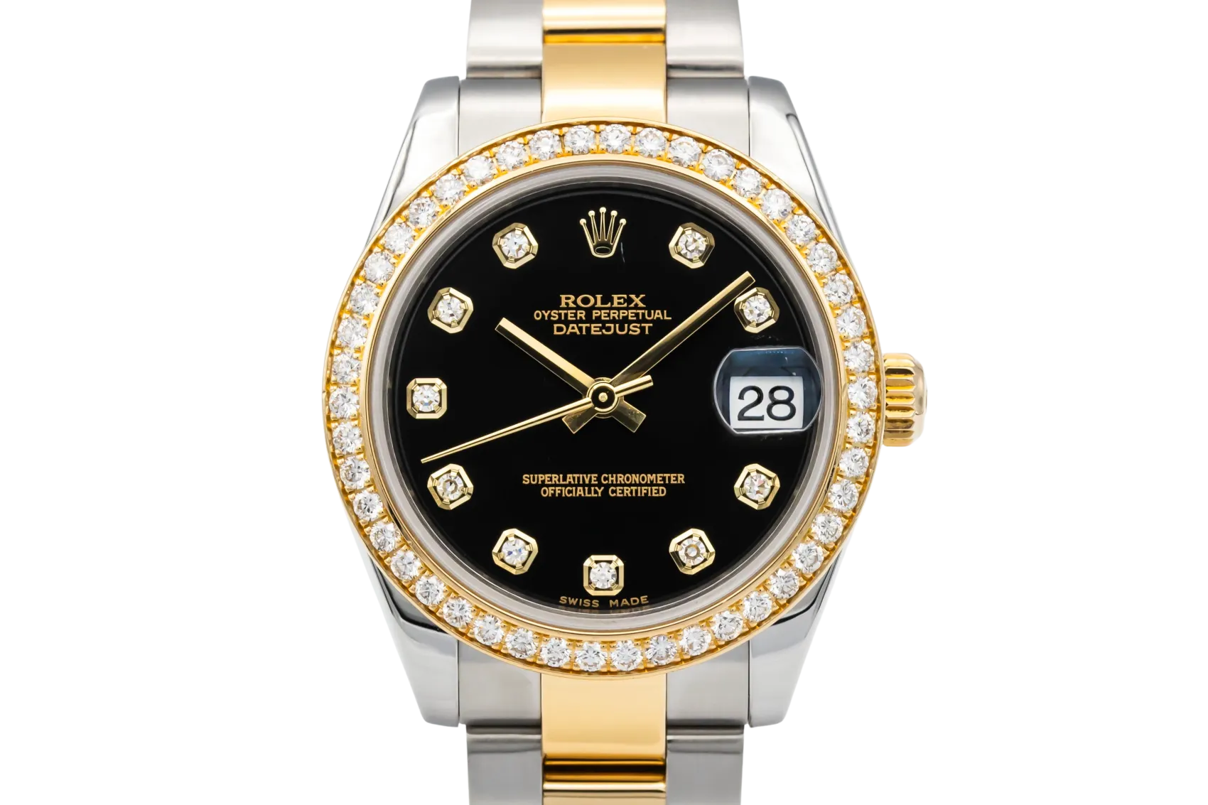 finance this from £281.41 p/m call the shop Read about our Limited Lifetime WarrantyThis 2017 Rolex DateJust 31mm presents a refined blend of stainless steel and 18ct yellow gold, paired with the classic Oyster bracelet for durability and elegance. It features a striking black diamond dial, set with factory brilliant-cut diamond hour markers. Completing the look is the factory yellow-gold diamond bezel, adding exceptional sparkle and elevating the watch’s overall presence.