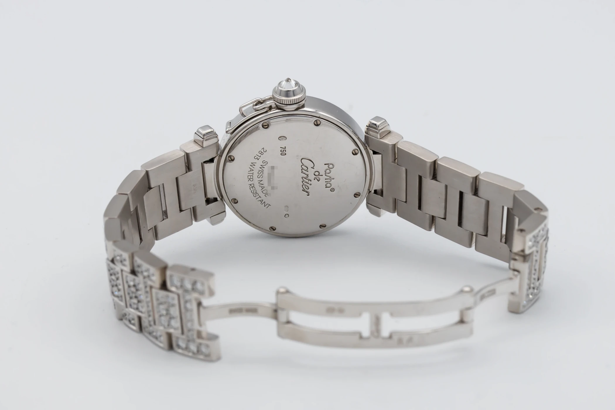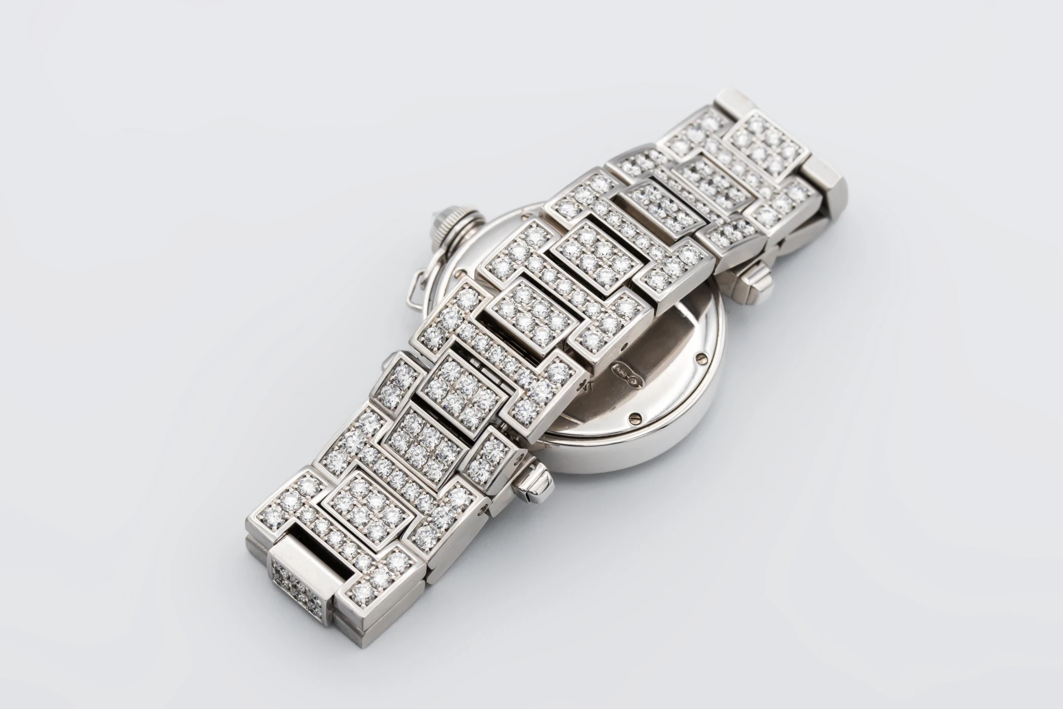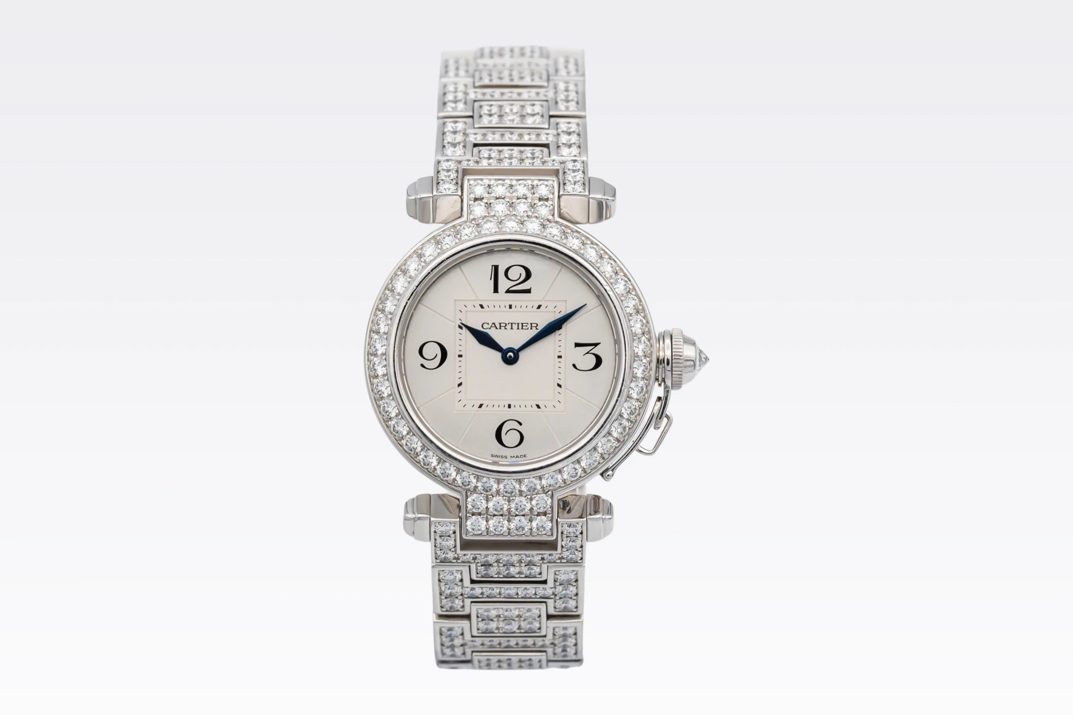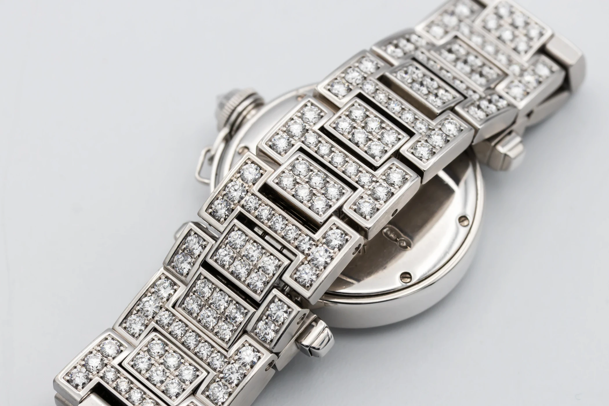 This circa 2000s Cartier Pasha 32mm features a silver opaline dial with bold black Arabic numerals at the cardinal points, elegant sword-shaped blued-steel hands, and a refined minute track along the perimeter. Complemented by a luxurious white gold bracelet and diamond encrusted bezel, This Pasha radiates sophistication and femininity, balancing a bold architectural design with delicate Parisian charm.