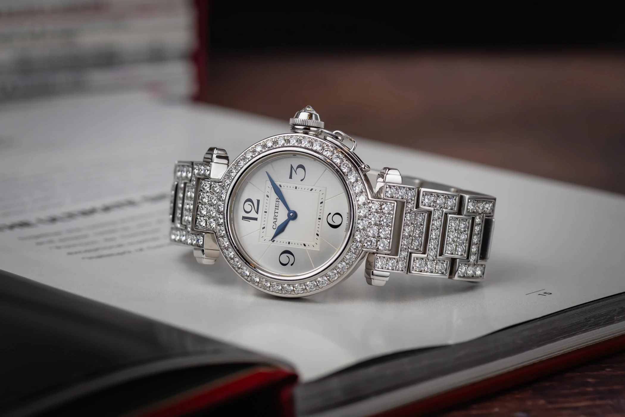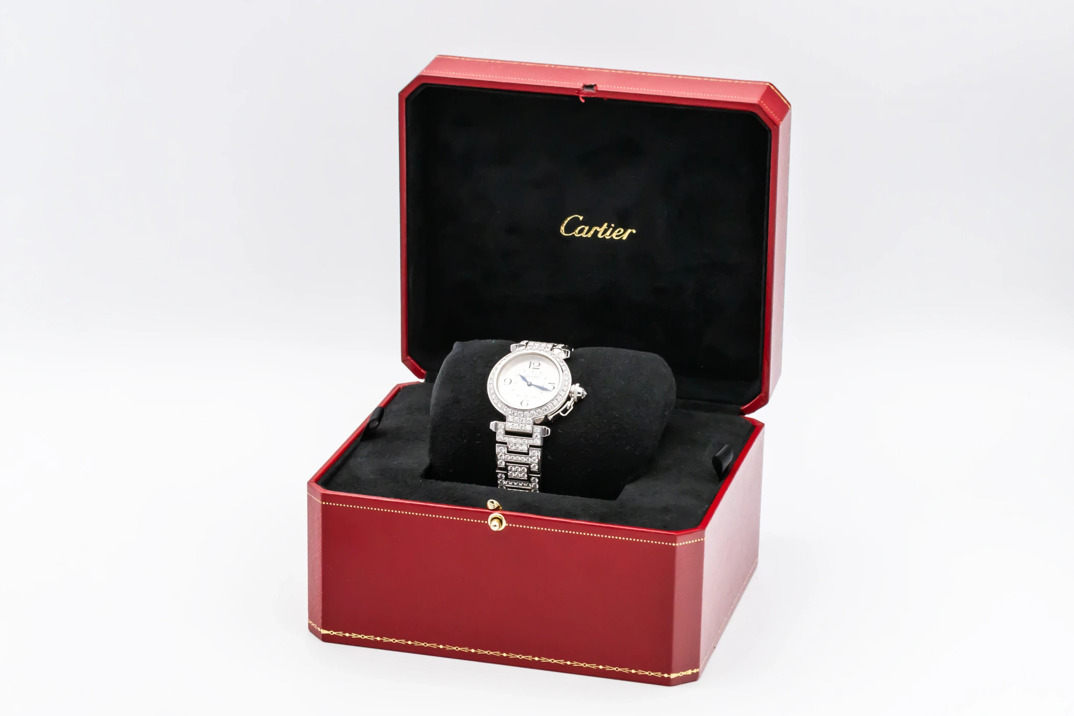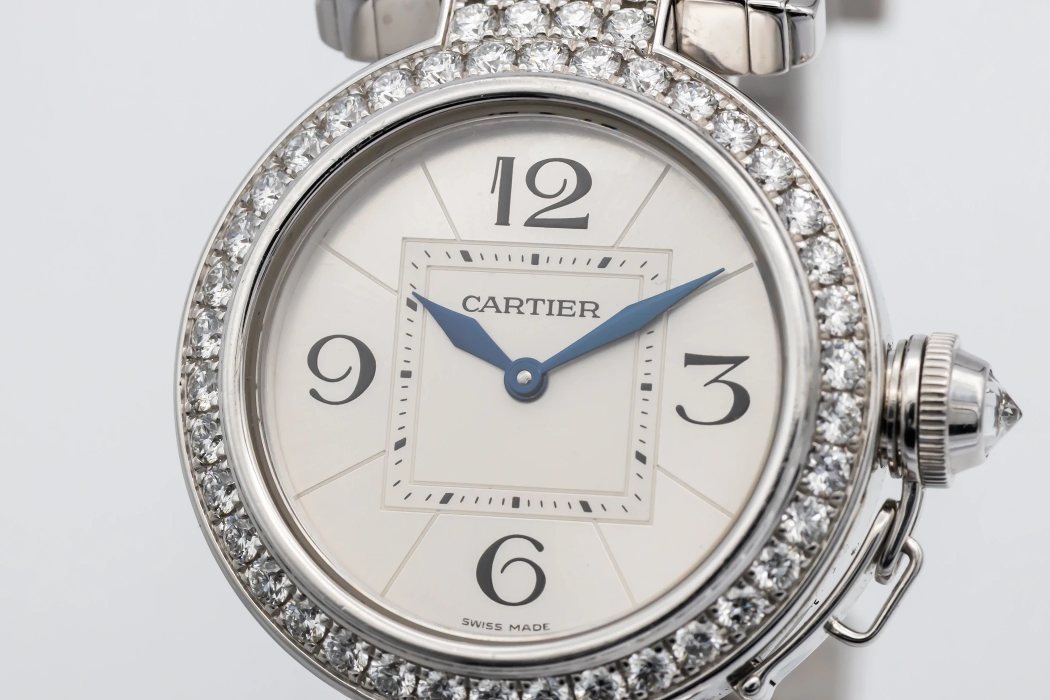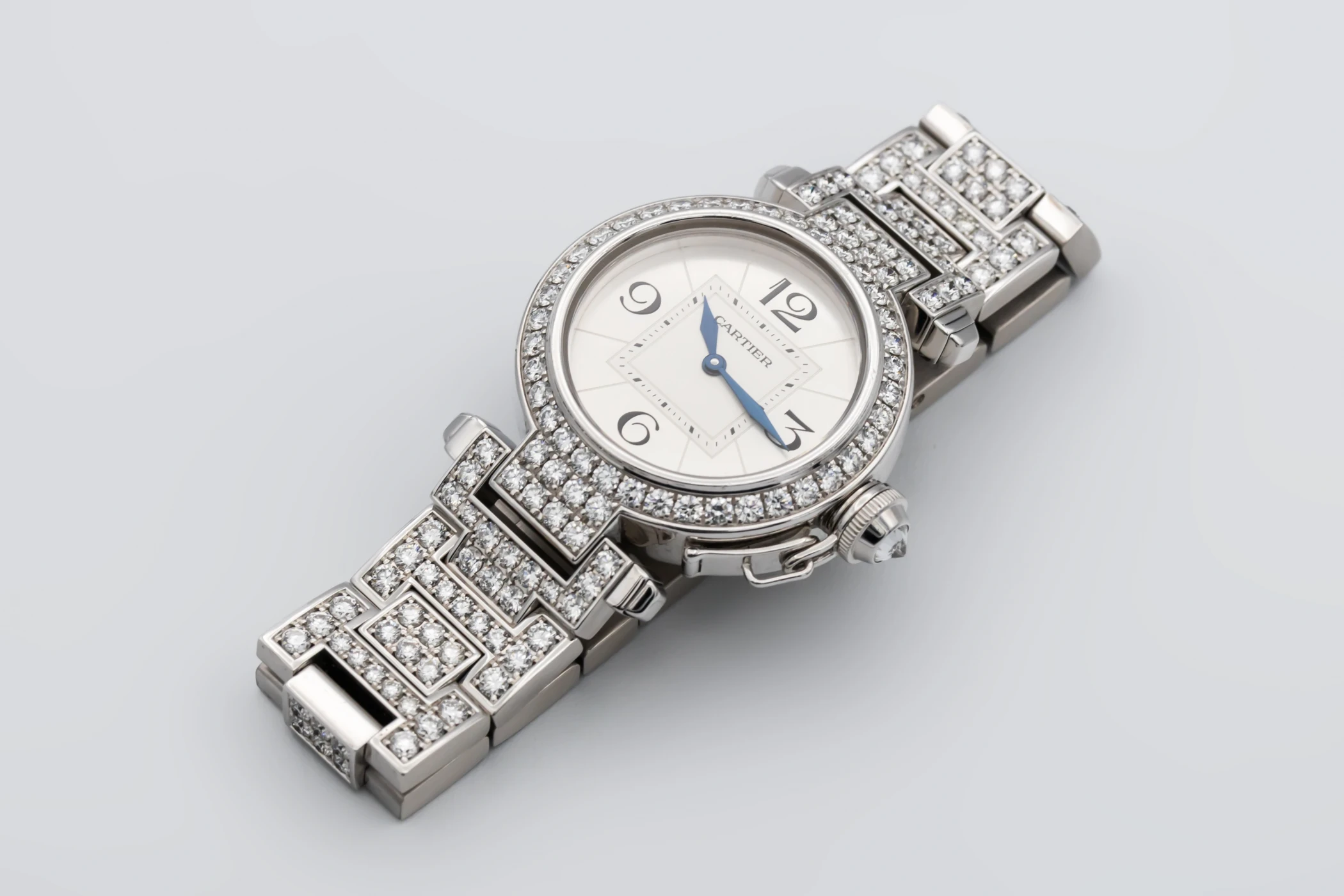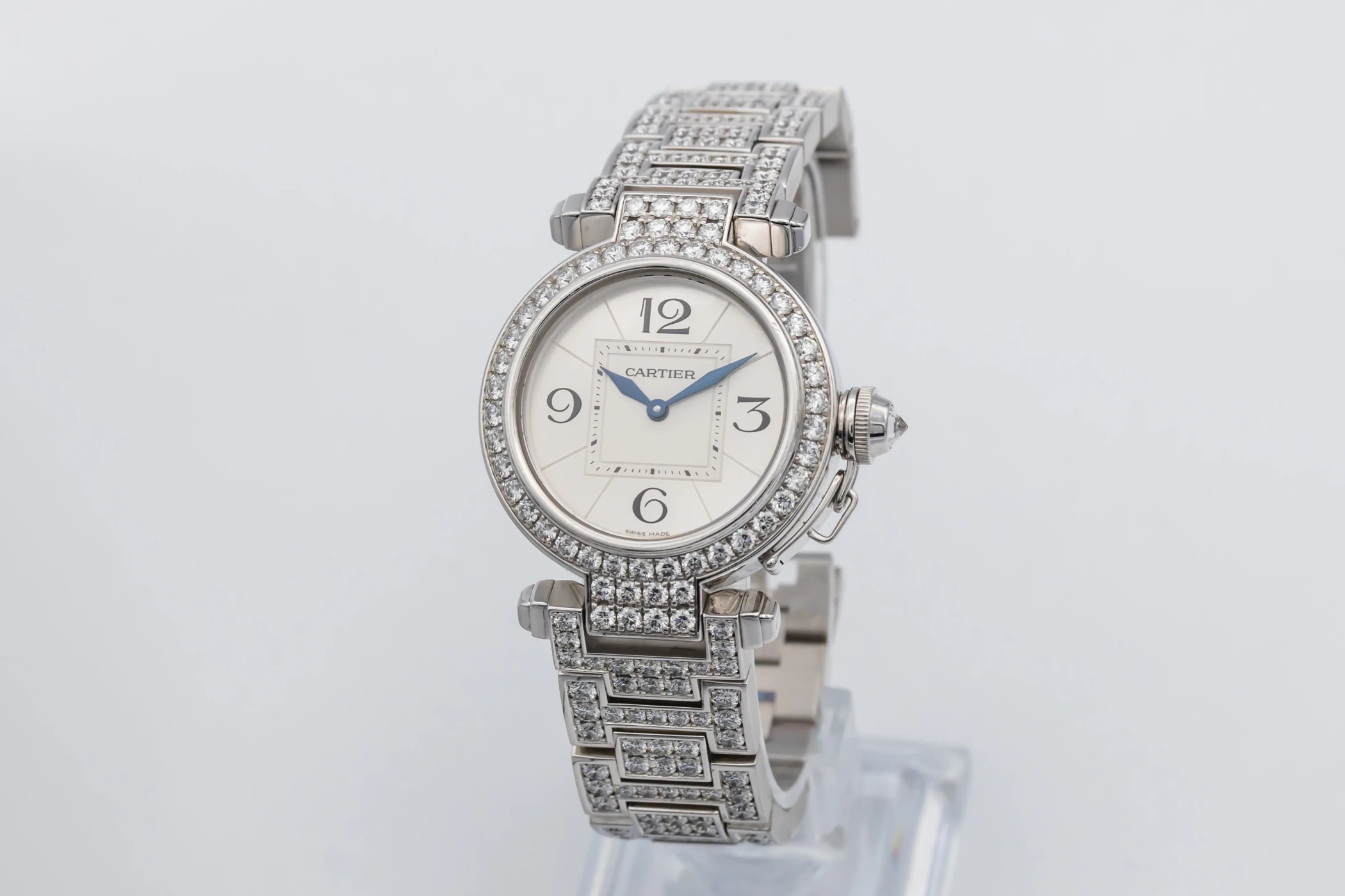 This circa 2000s Cartier Pasha 32mm features a silver opaline dial with bold black Arabic numerals at the cardinal points, elegant sword-shaped blued-steel hands, and a refined minute track along the perimeter. Complemented by a luxurious white gold bracelet and diamond encrusted bezel, This Pasha radiates sophistication and femininity, balancing a bold architectural design with delicate Parisian charm.