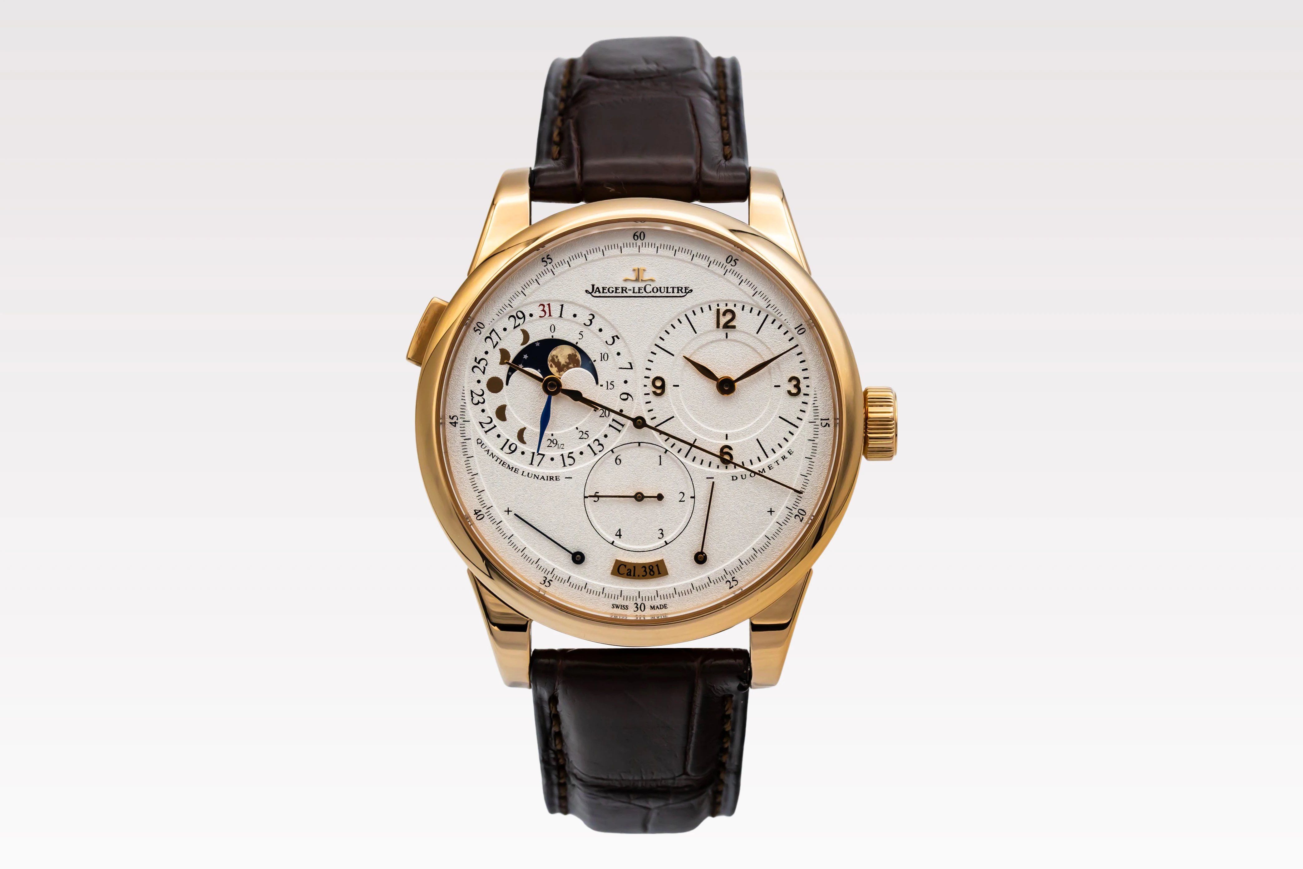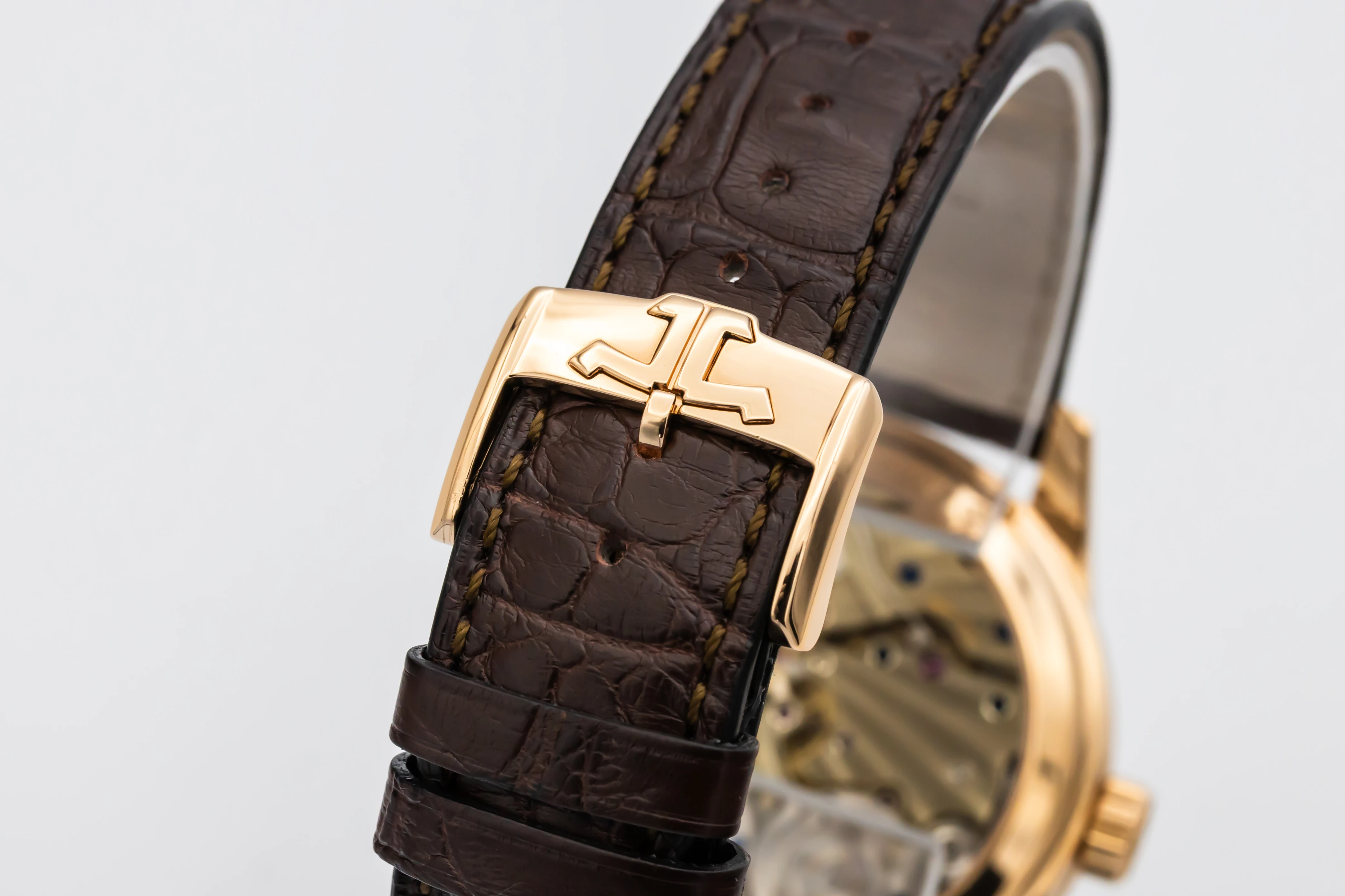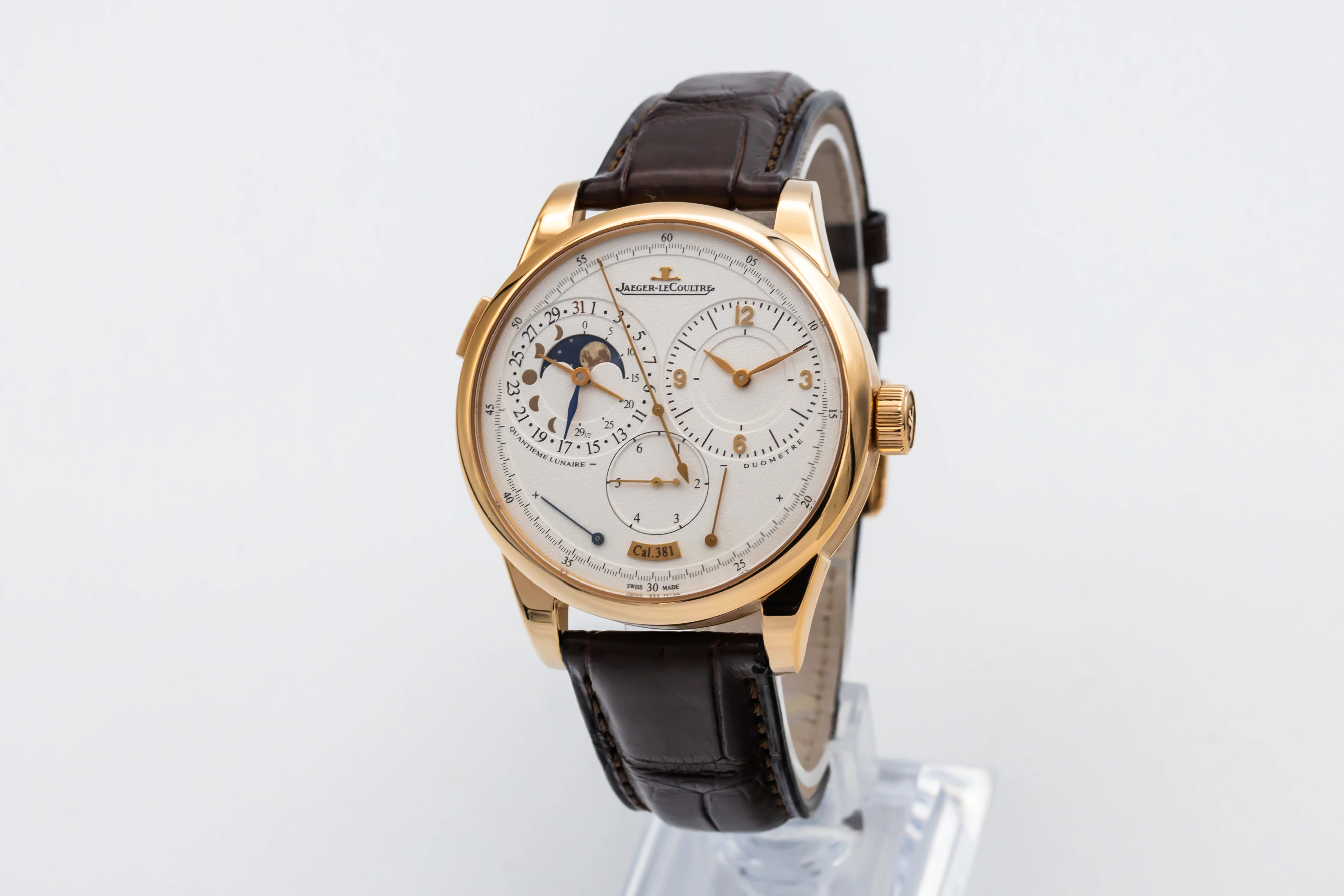 This circa 2015 Jaeger-LeCoultre Duomètre presents a harmonious blend of technical innovation and elegant design within a refined 40.5mm 18ct rose gold case. Its warm, polished finish beautifully frames the striking cream dial. Paired with a rich brown alligator leather strap and rose gold pin buckle.