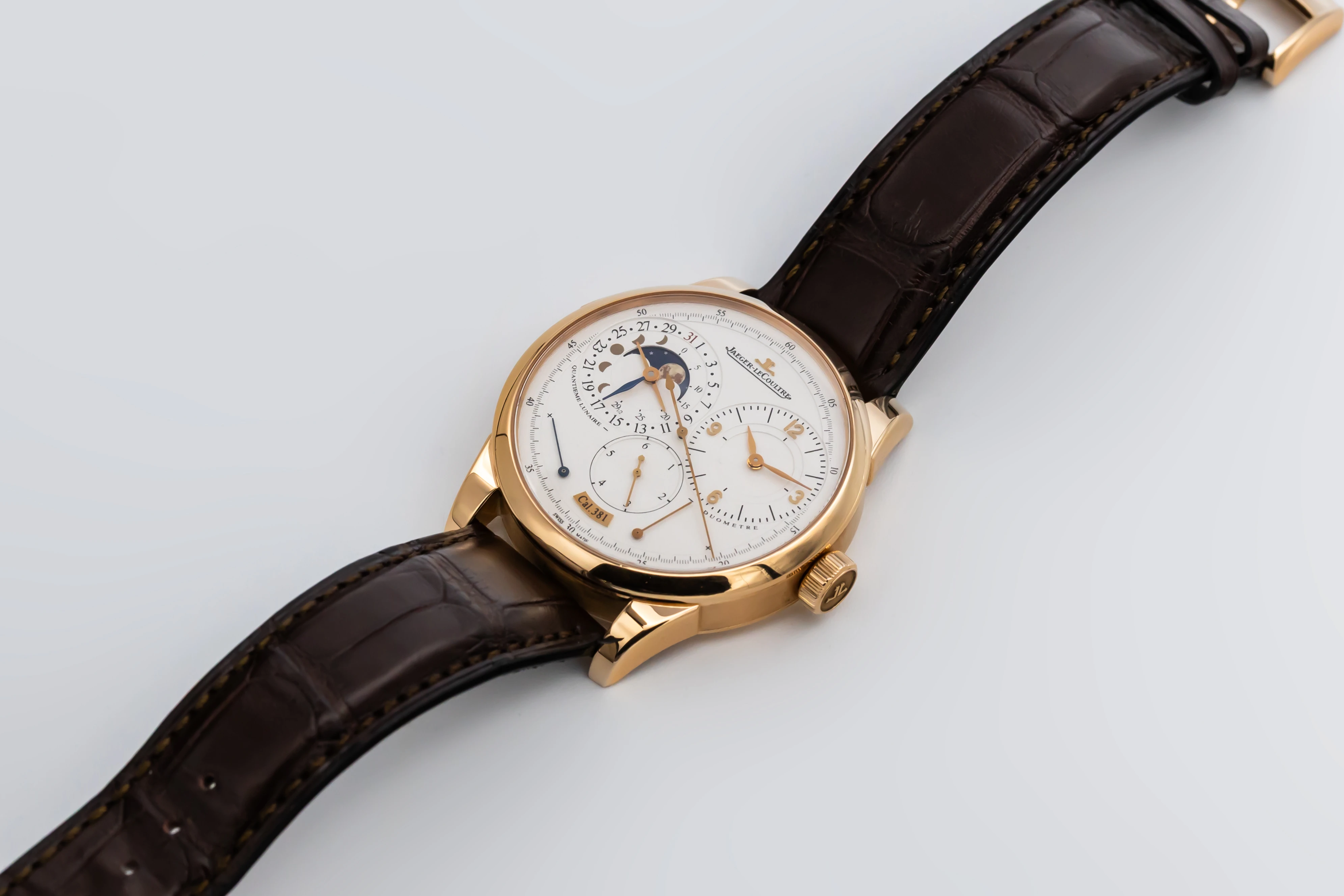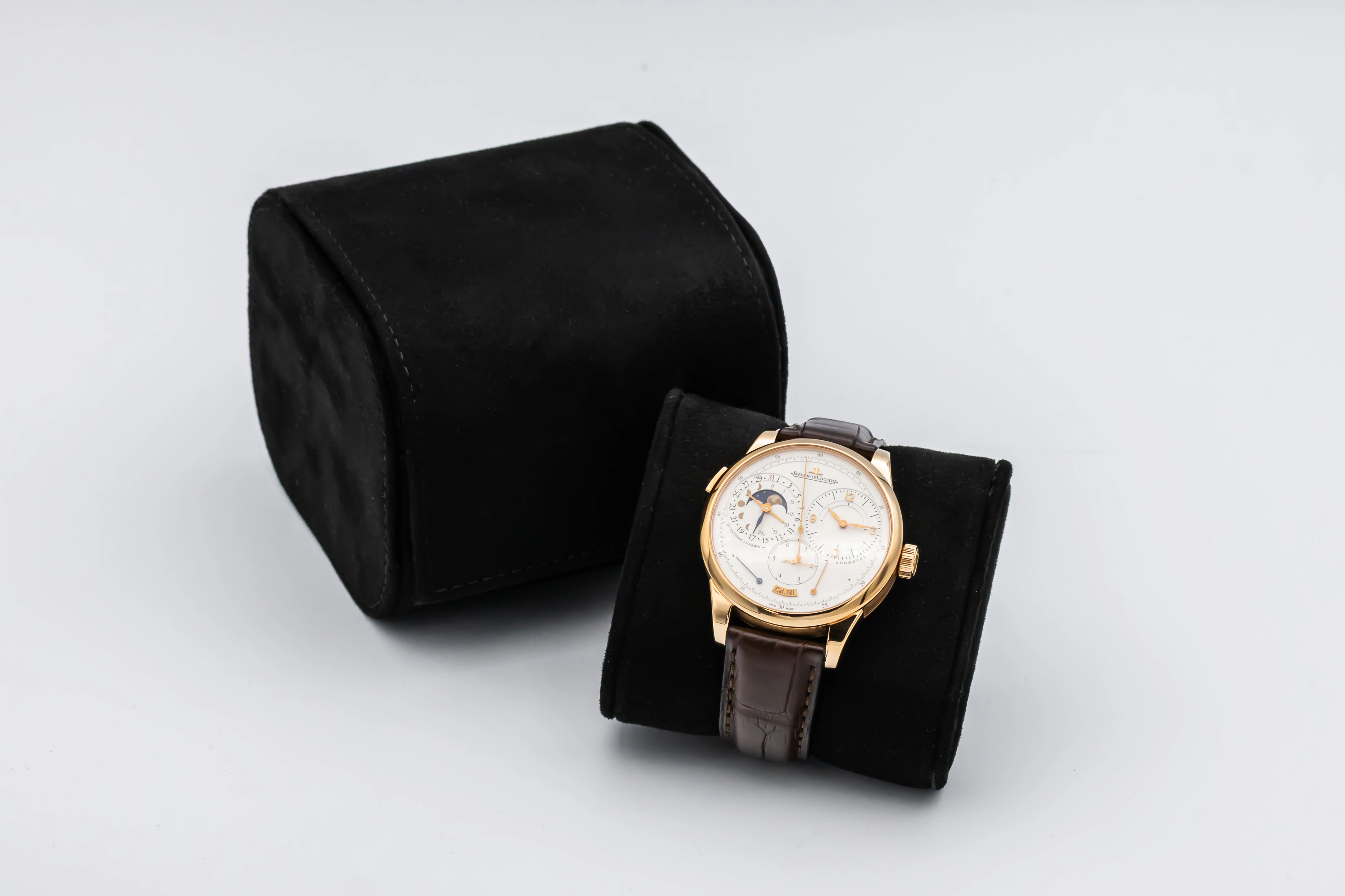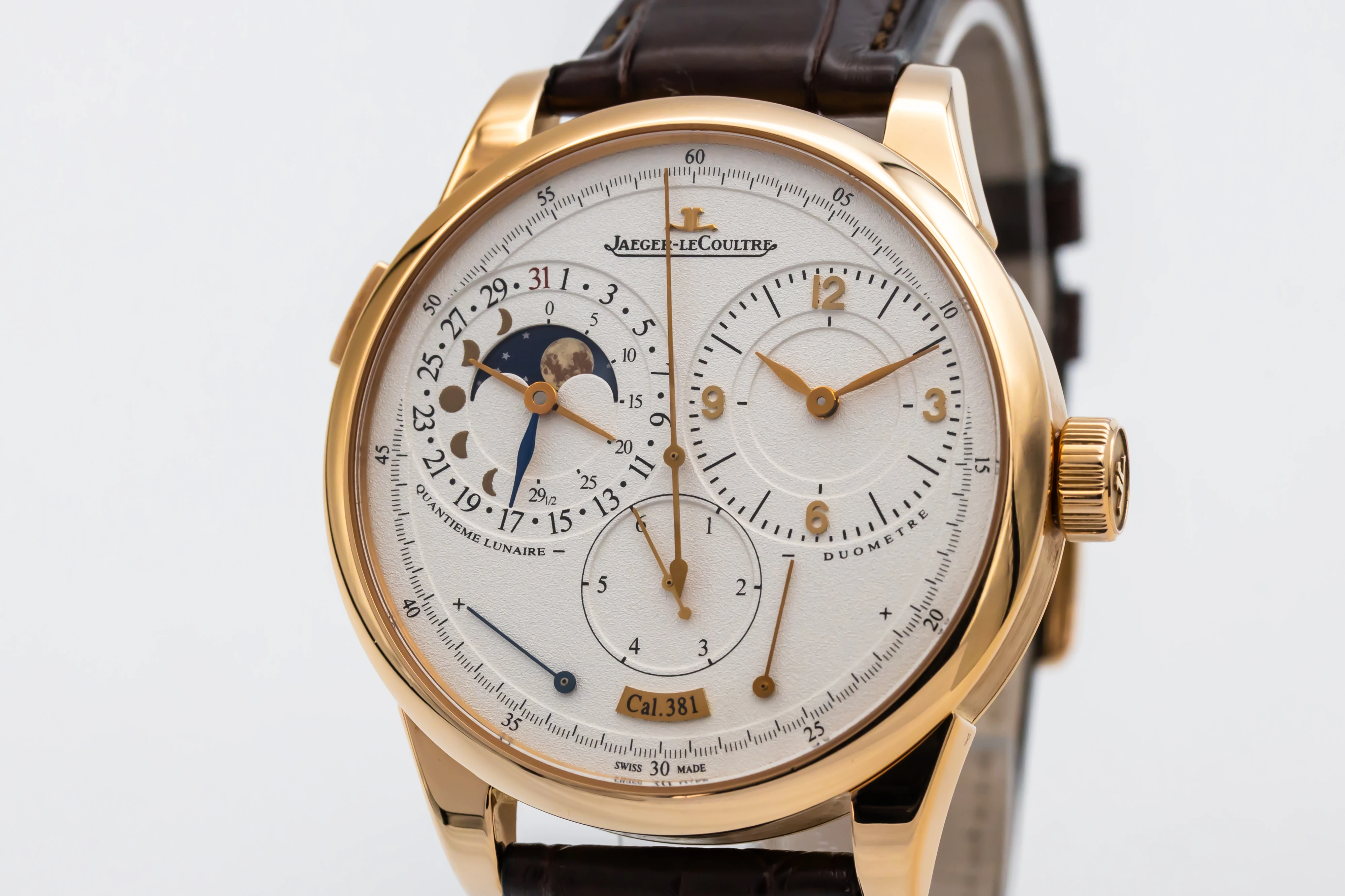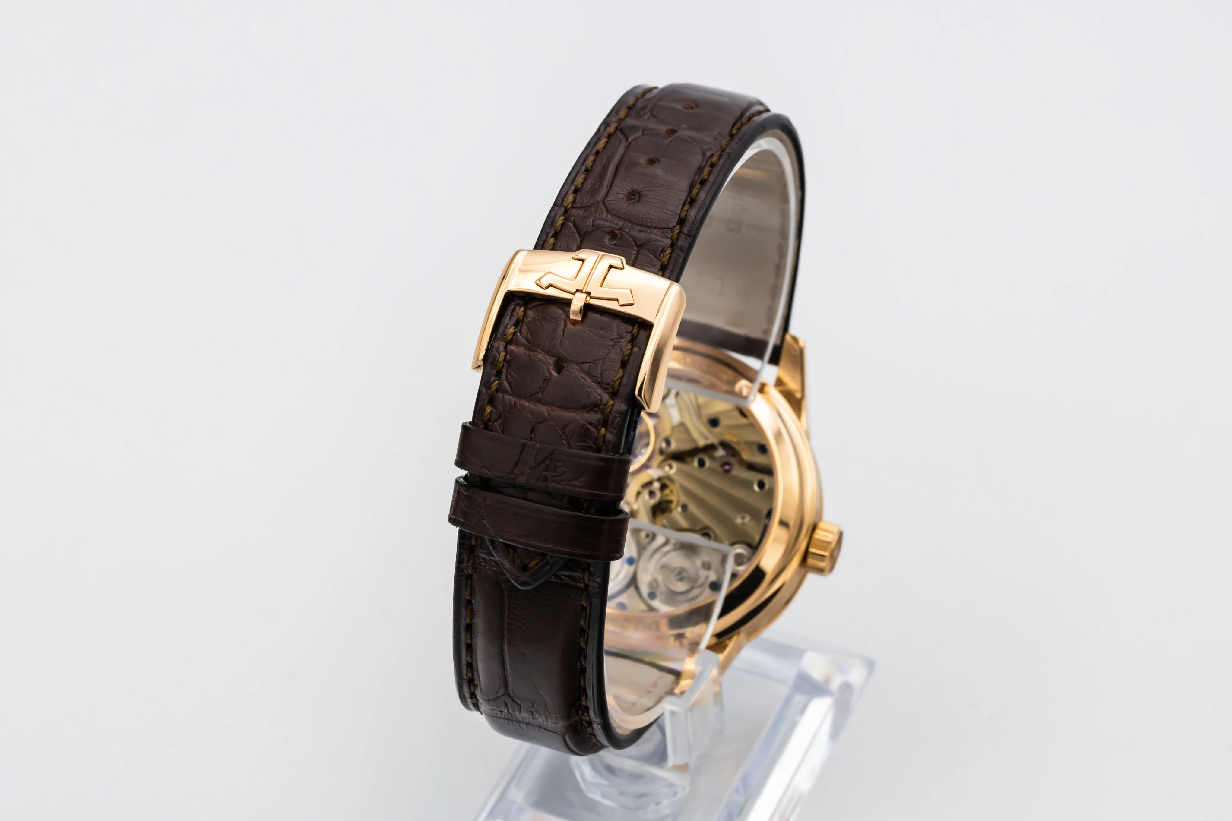 This circa 2015 Jaeger-LeCoultre Duomètre presents a harmonious blend of technical innovation and elegant design within a refined 40.5mm 18ct rose gold case. Its warm, polished finish beautifully frames the striking cream dial. Paired with a rich brown alligator leather strap and rose gold pin buckle.
