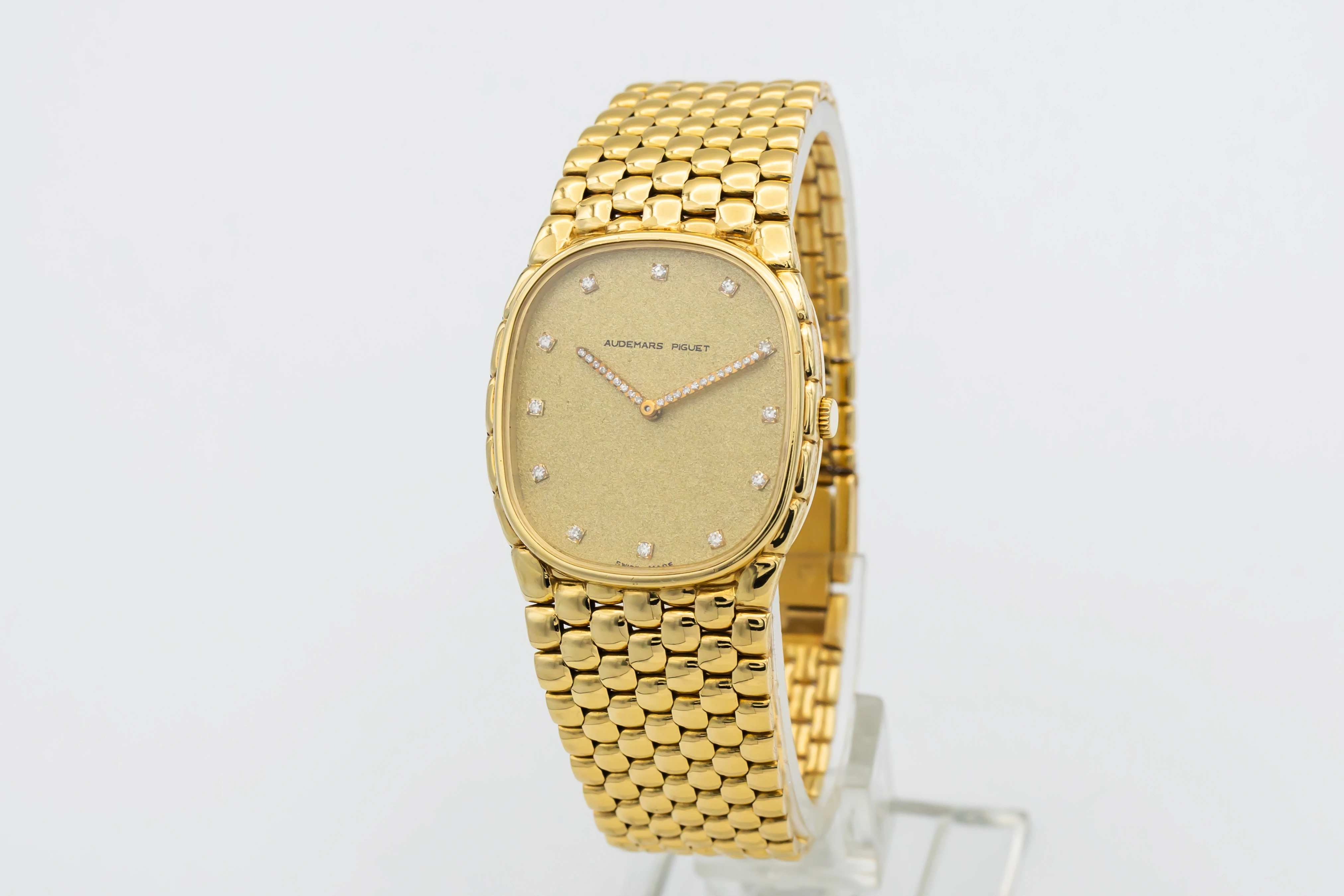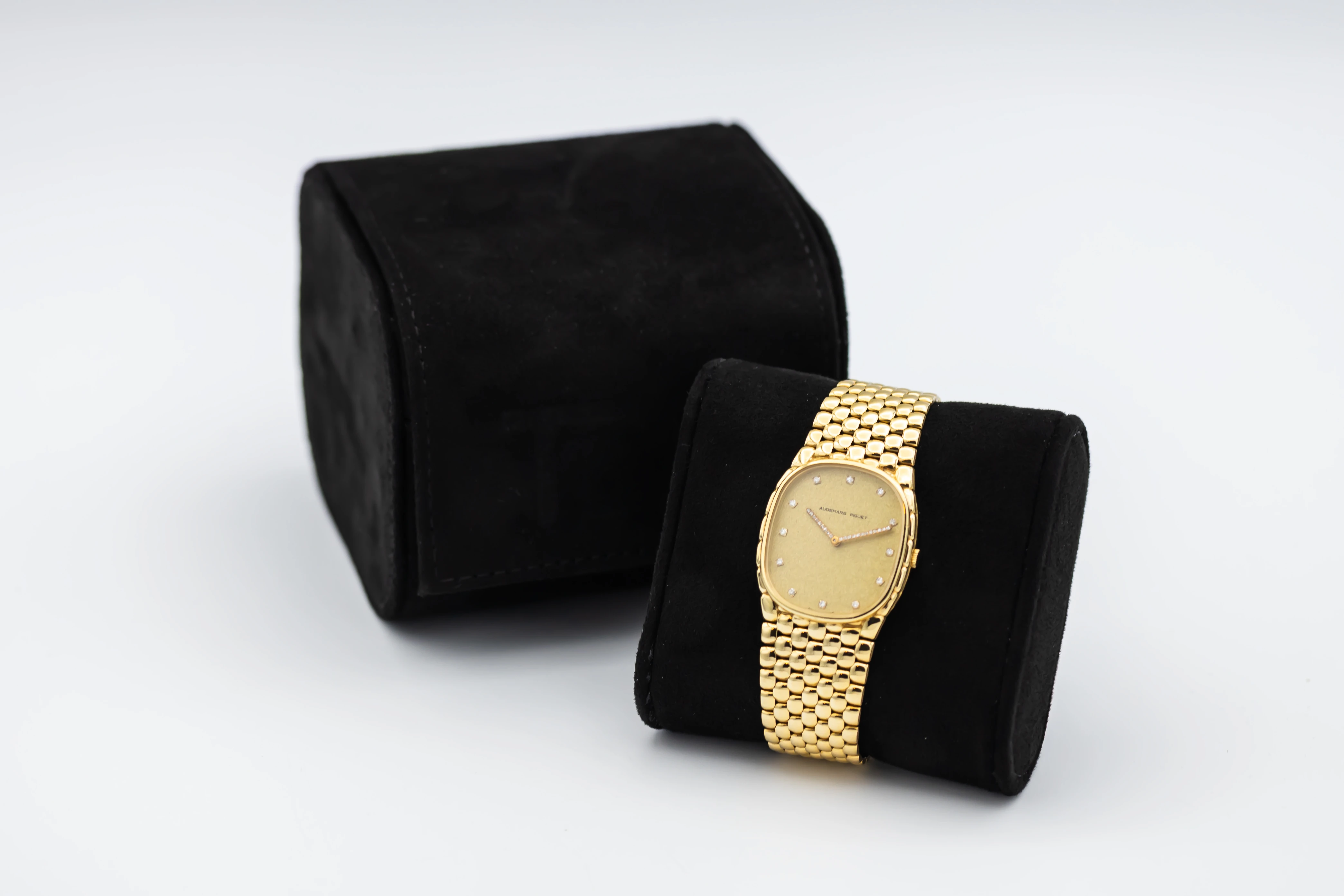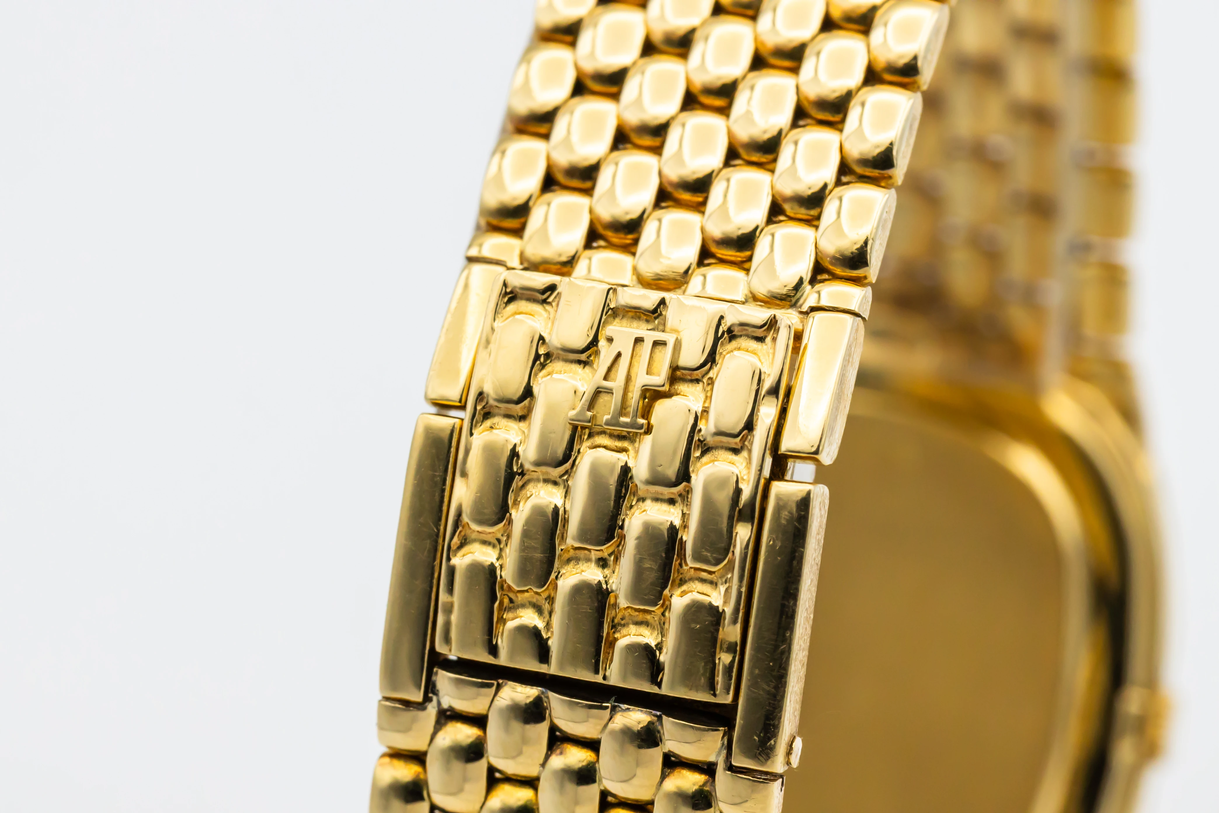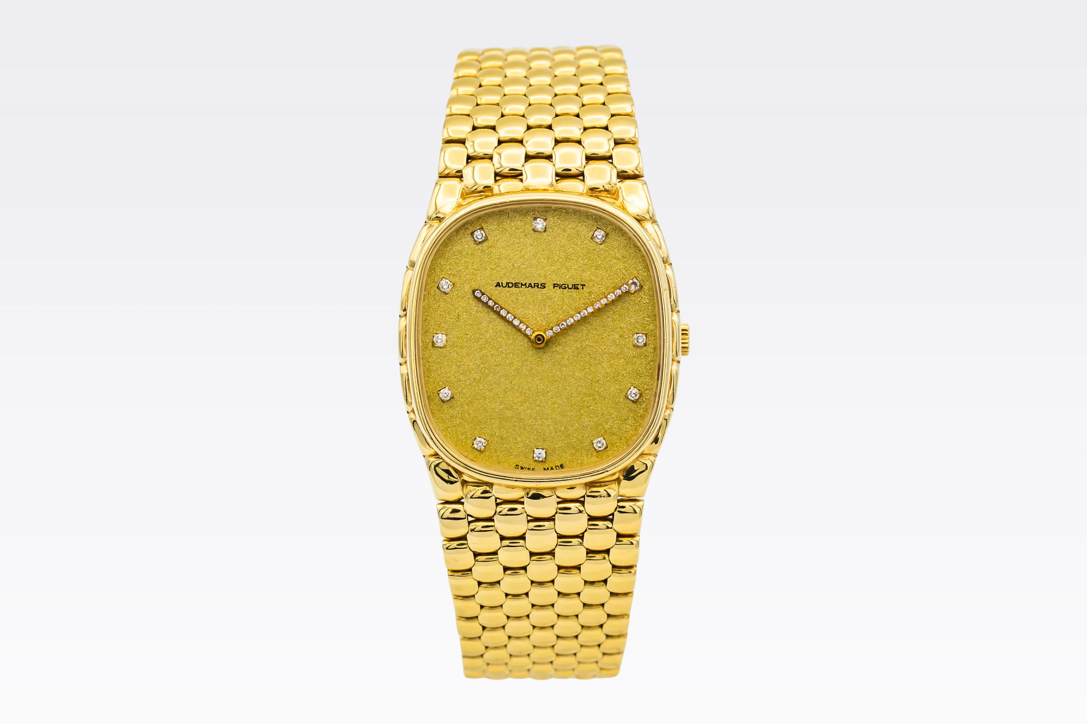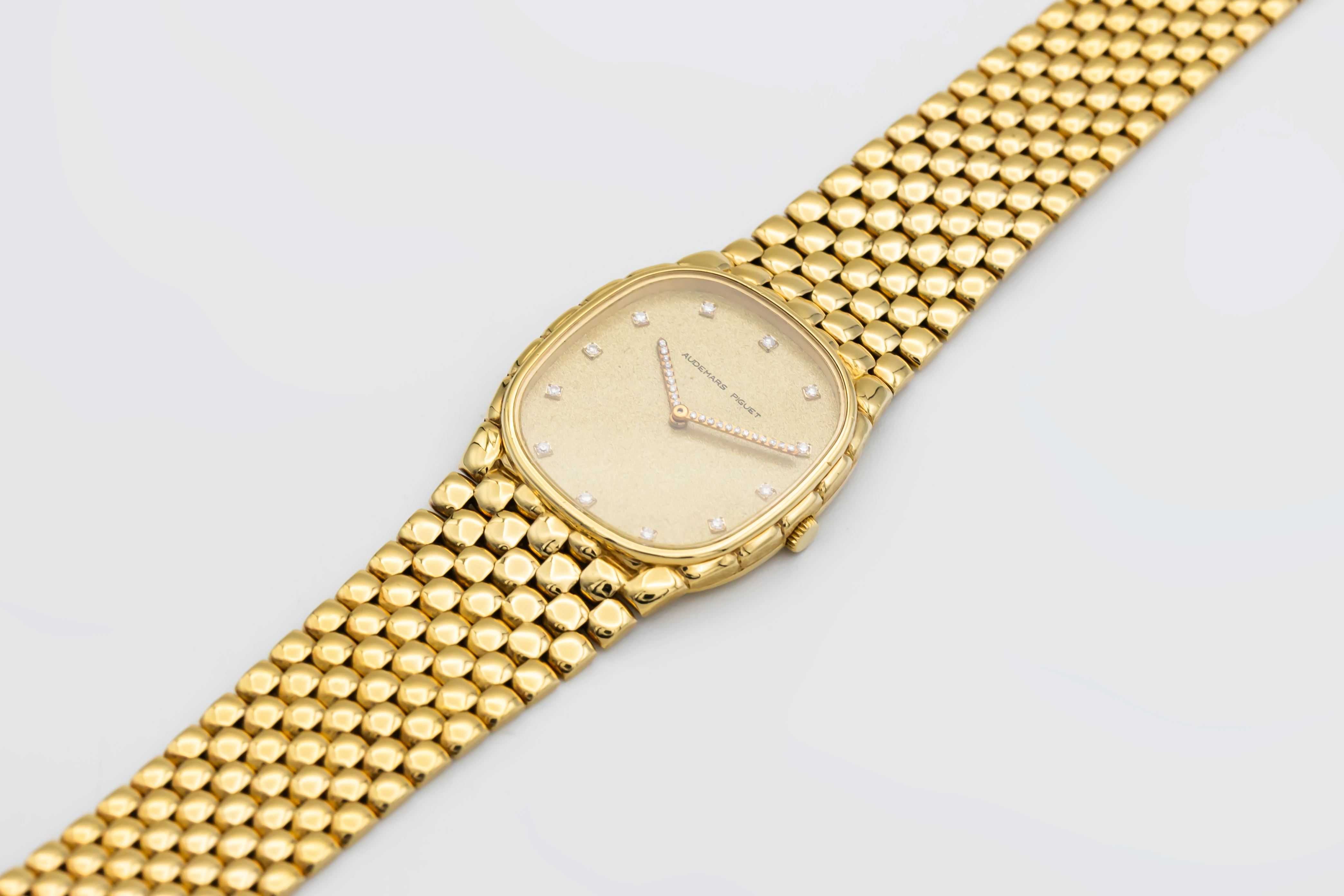 The circa 1980s Audemars Piguet Cobra 29mm is a striking example of avant-garde 1980s design, presented in a delicate 29mm case crafted entirely from 18ct yellow gold. The minimalist champagne dial features slim baton hour markers and elegant gold hands, complemented by a faceted sapphire crystal that enhances the watch’s sculptural silhouette.