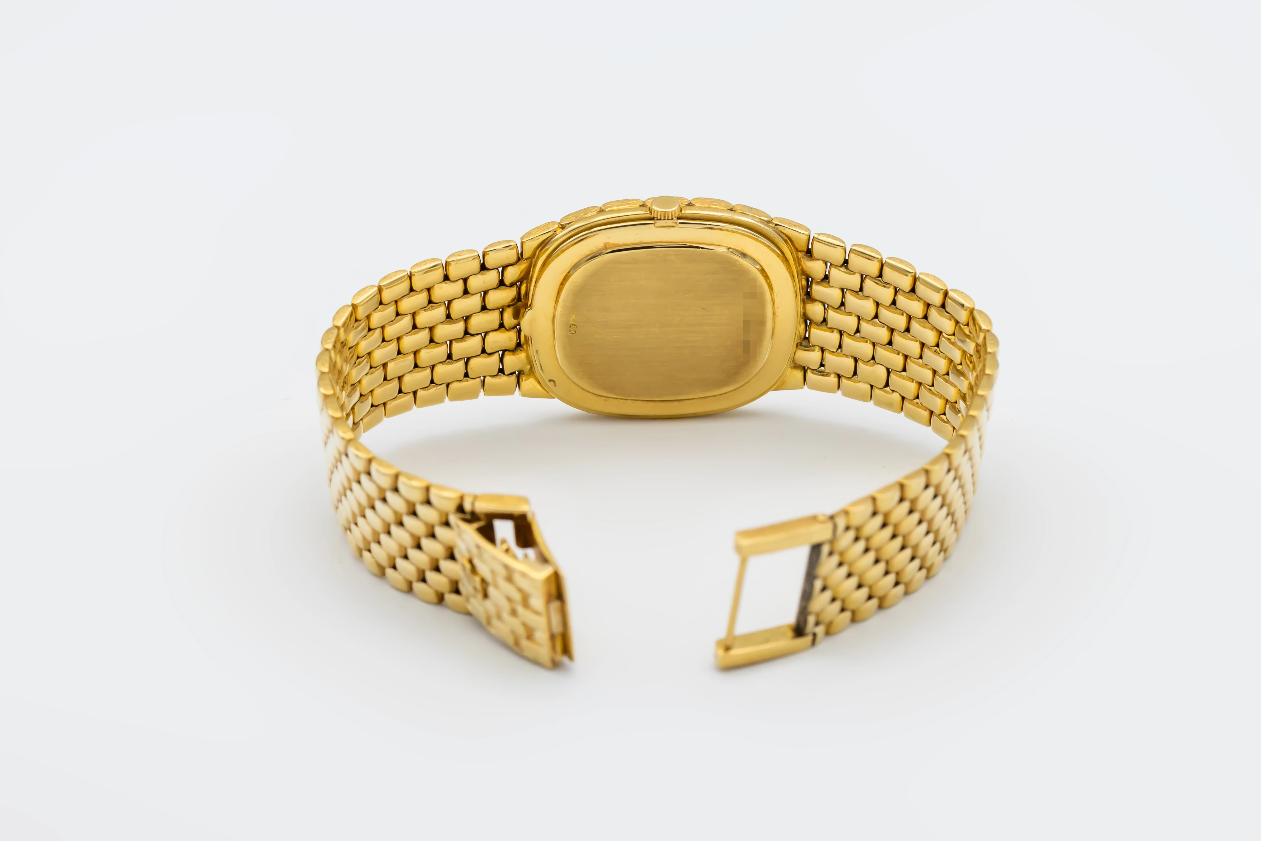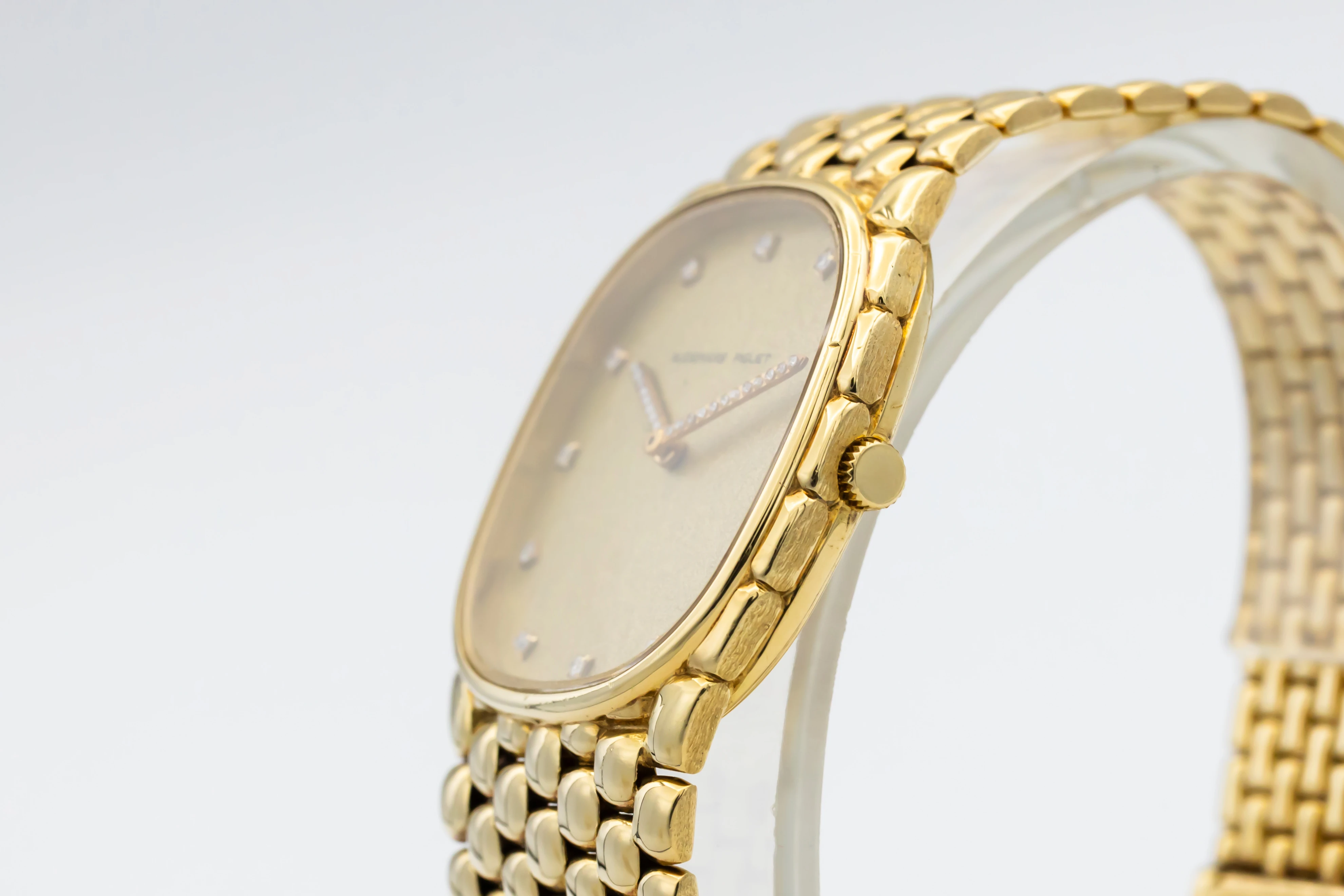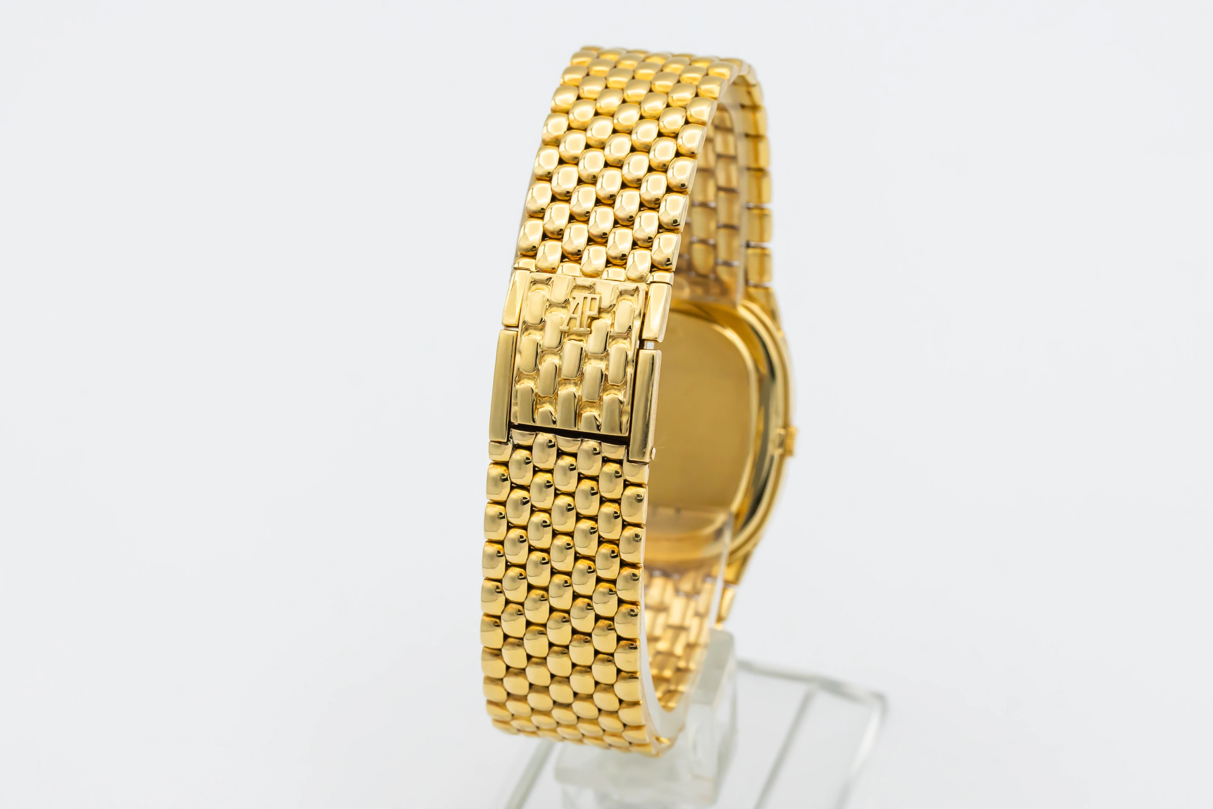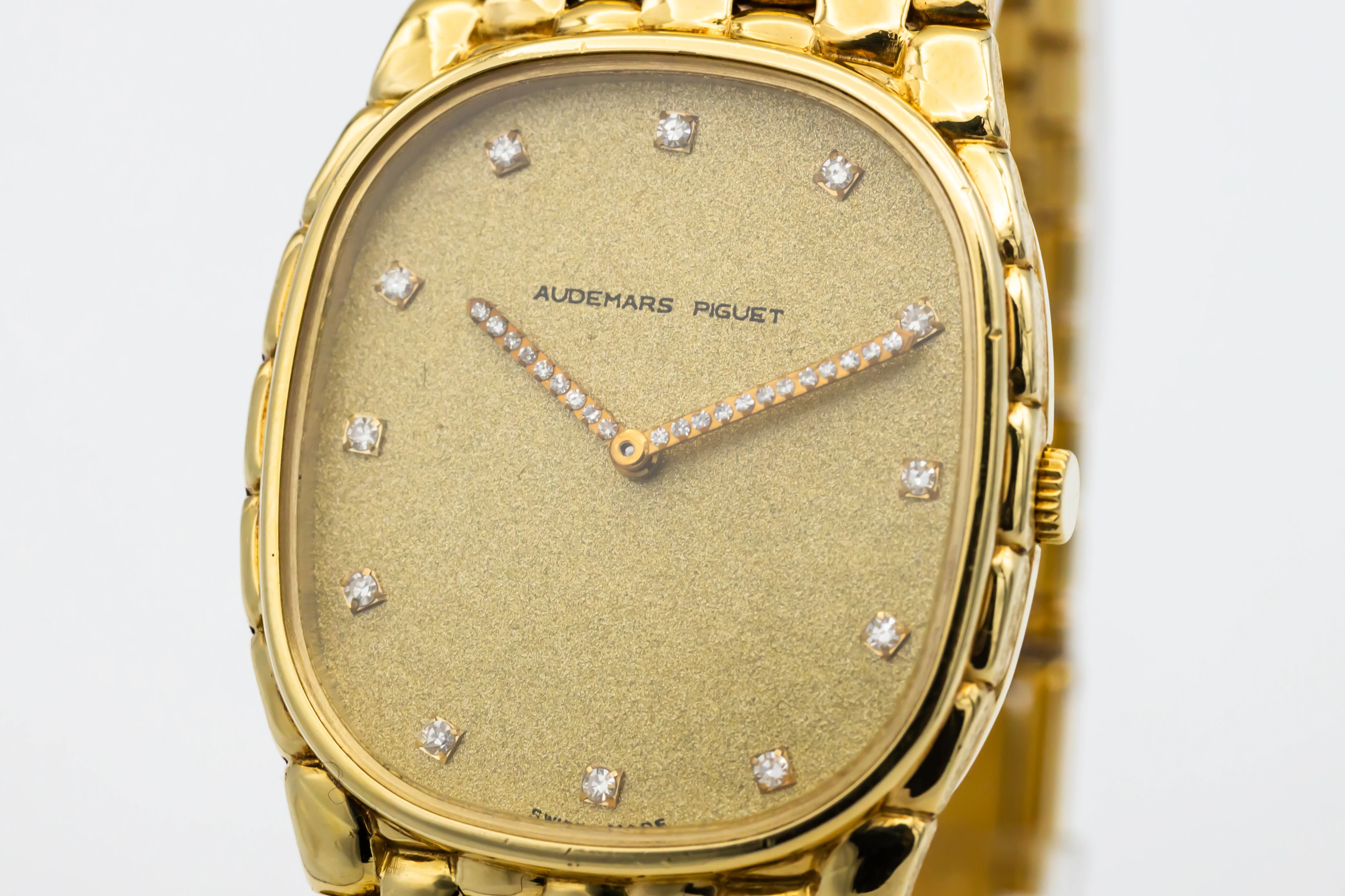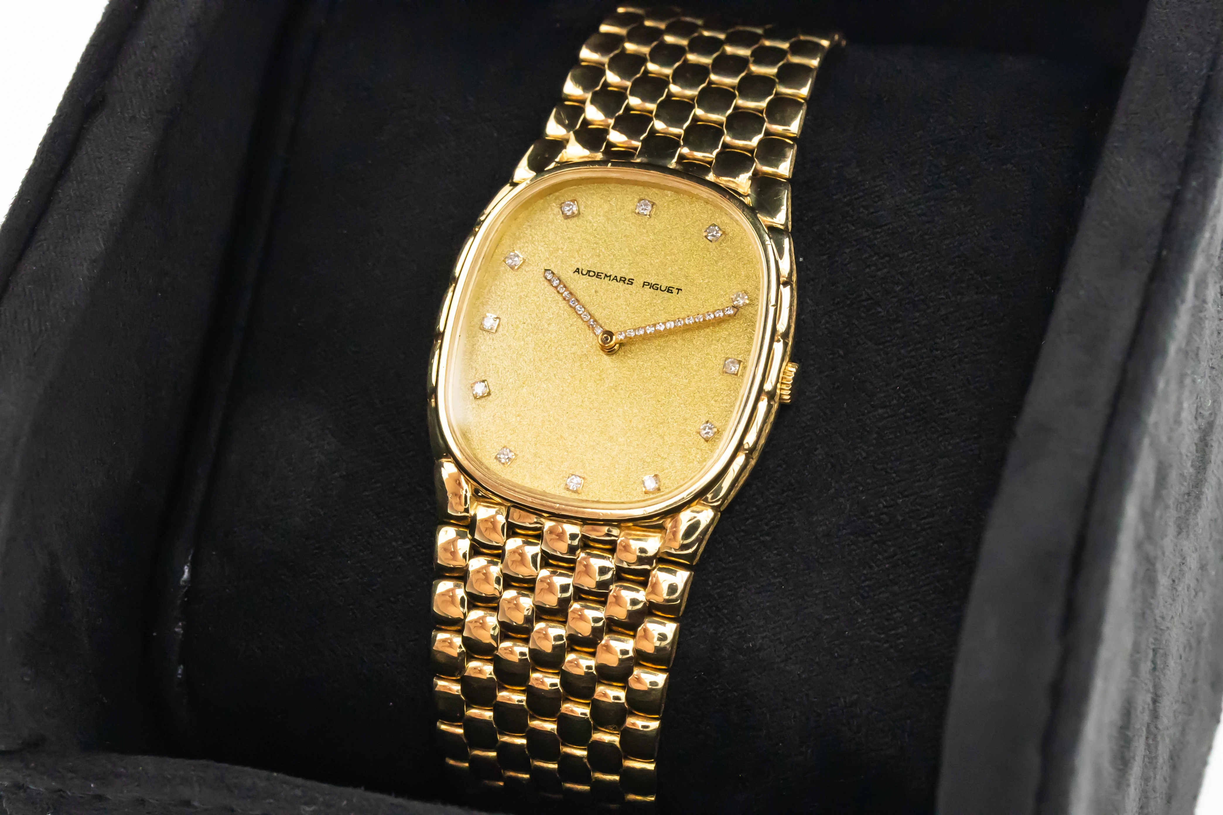 The circa 1980s Audemars Piguet Cobra 29mm is a striking example of avant-garde 1980s design, presented in a delicate 29mm case crafted entirely from 18ct yellow gold. The minimalist champagne dial features slim baton hour markers and elegant gold hands, complemented by a faceted sapphire crystal that enhances the watch’s sculptural silhouette.