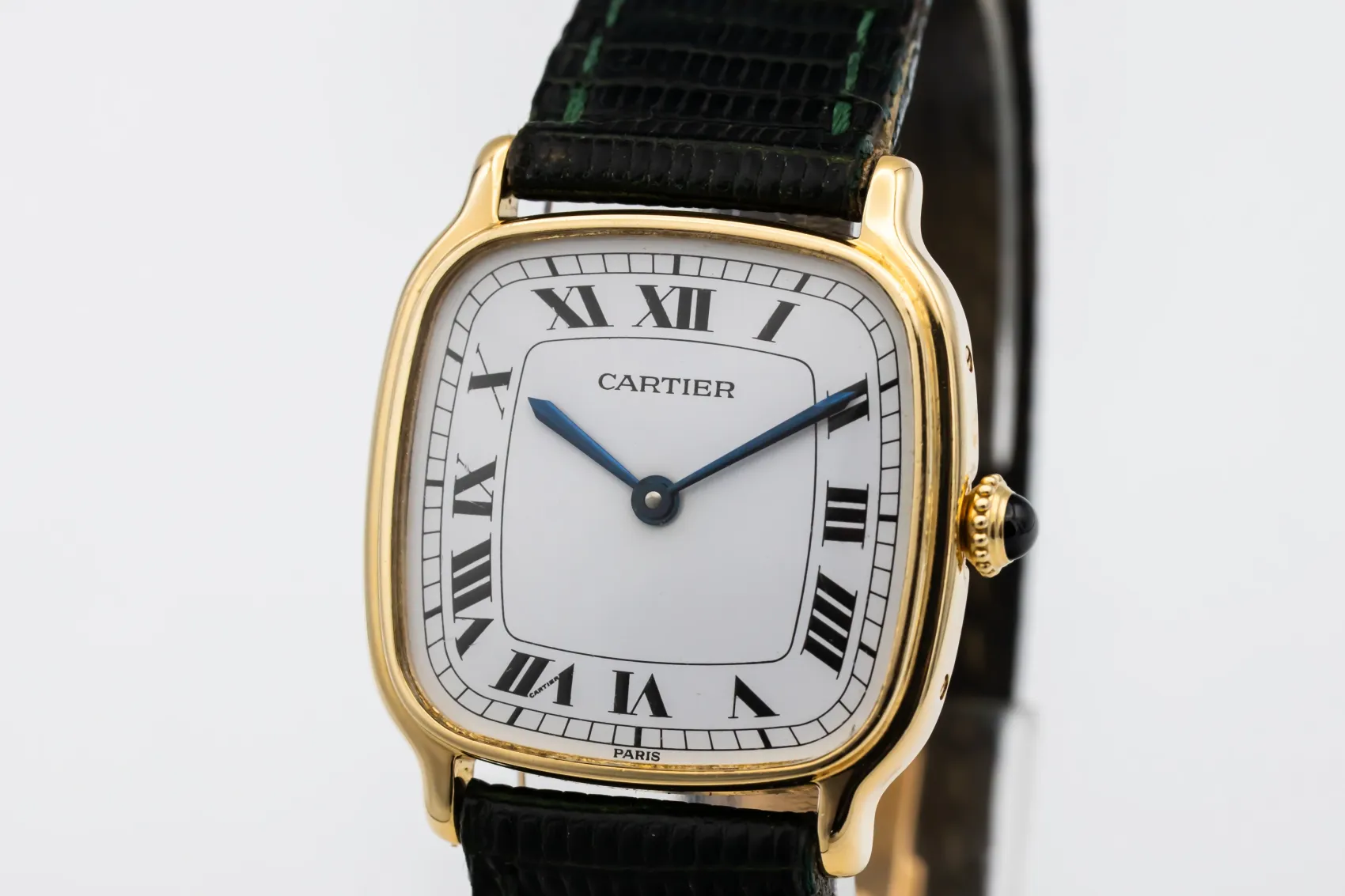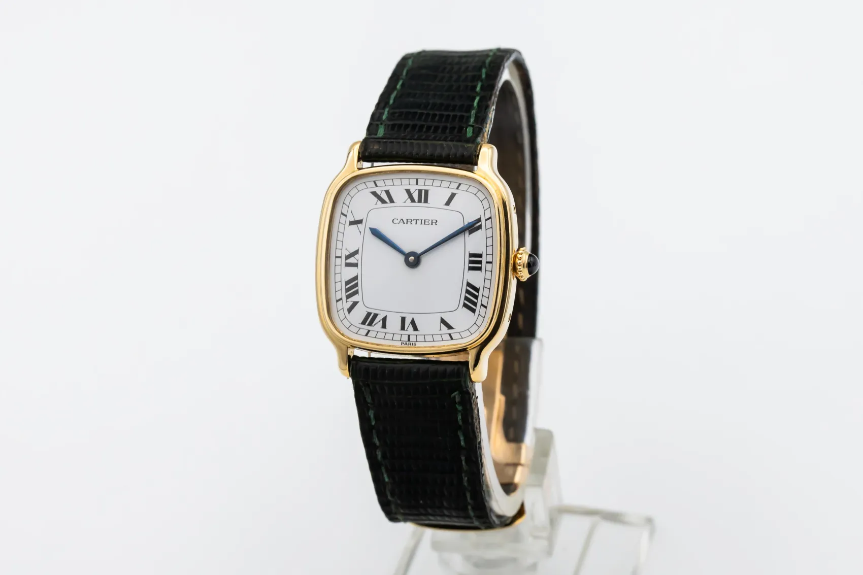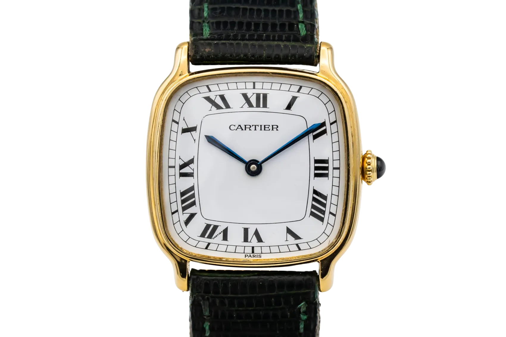 finance this from £120.55 p/m call the shop Read about our Limited Lifetime WarrantyThis circa 1970s Cartier Chambord 27mm features a white paris dial featuring roman numeral hour markers, traditional chemin-de-fer minute track, and blued-steel Cartier sword hands. The beaded crown is tipped with a signature blue cabochon. Paired with a black leather strap, this 1970s Chambord is understated, refined, and deeply emblematic of vintage Cartier styling.