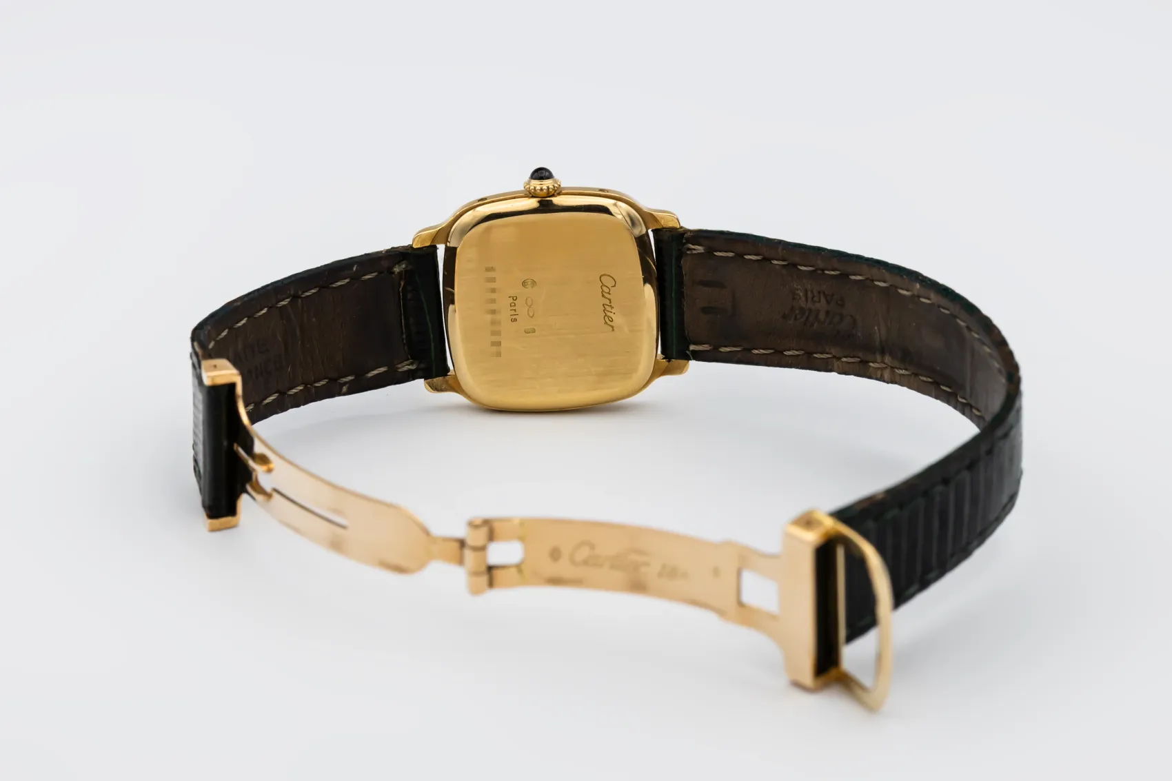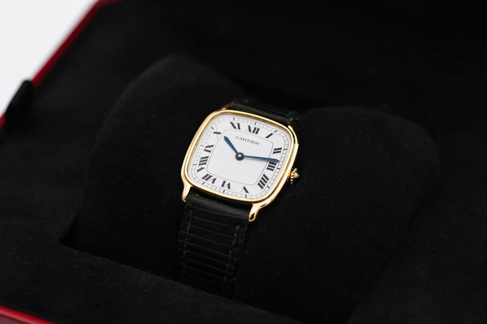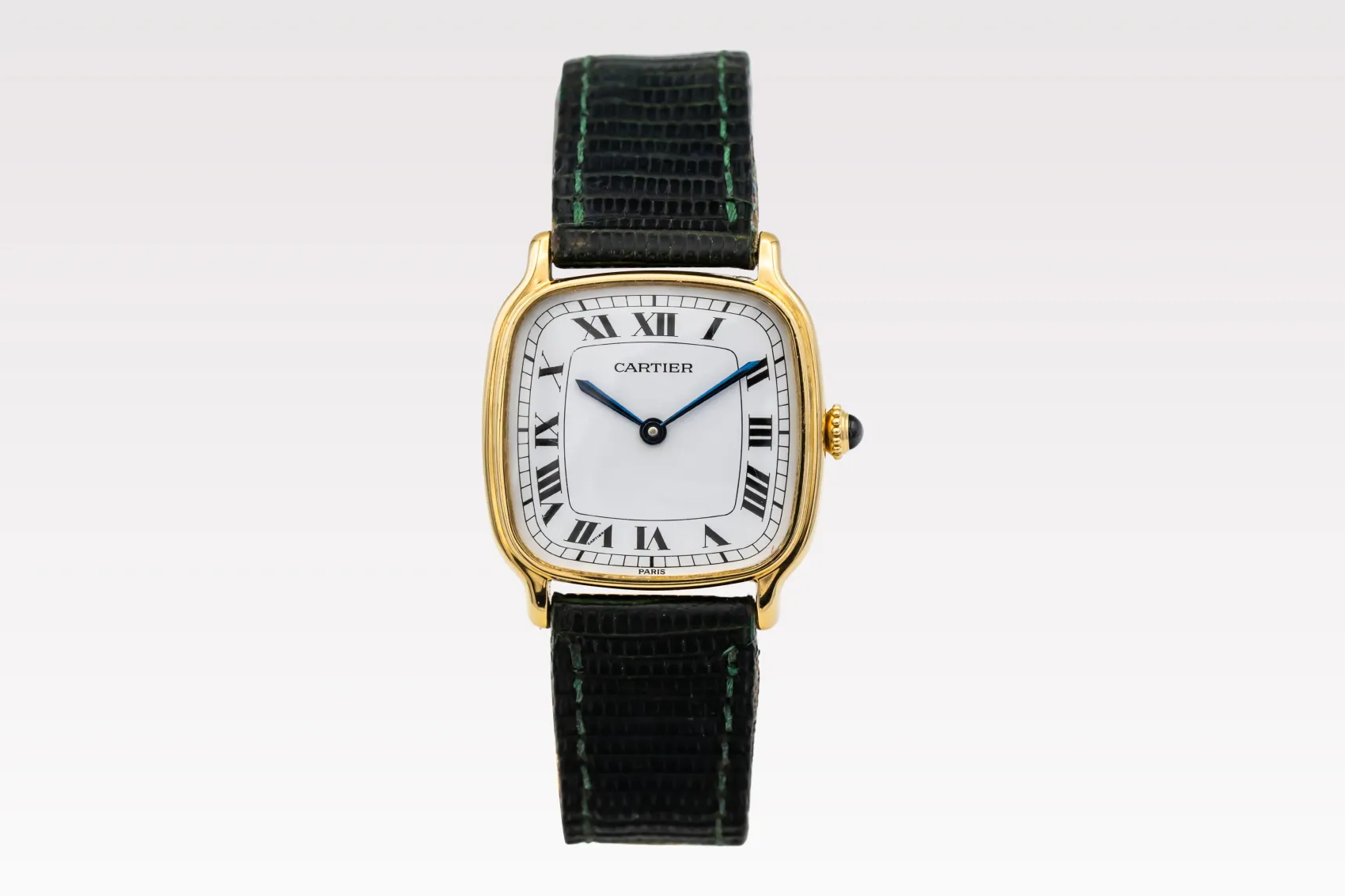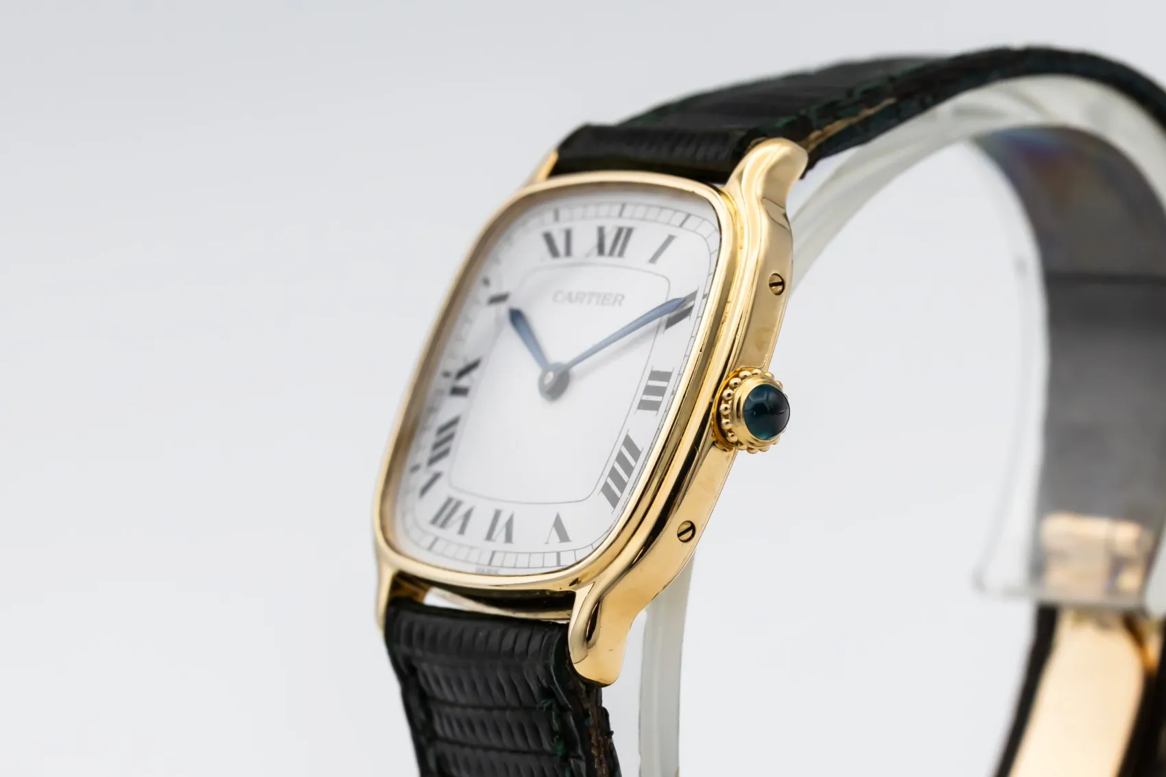 finance this from £120.55 p/m call the shop Read about our Limited Lifetime WarrantyThis circa 1970s Cartier Chambord 27mm features a white paris dial featuring roman numeral hour markers, traditional chemin-de-fer minute track, and blued-steel Cartier sword hands. The beaded crown is tipped with a signature blue cabochon. Paired with a black leather strap, this 1970s Chambord is understated, refined, and deeply emblematic of vintage Cartier styling.