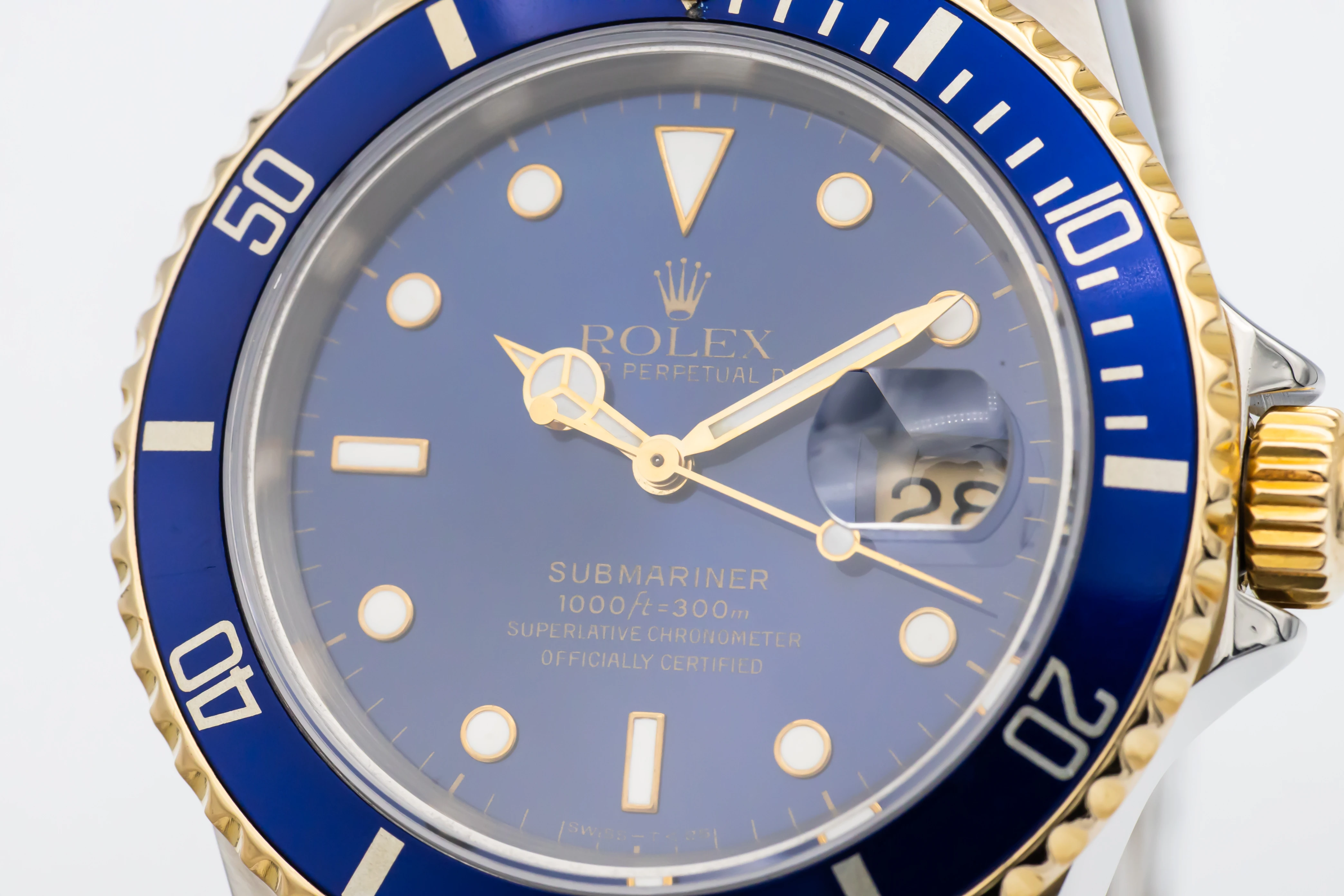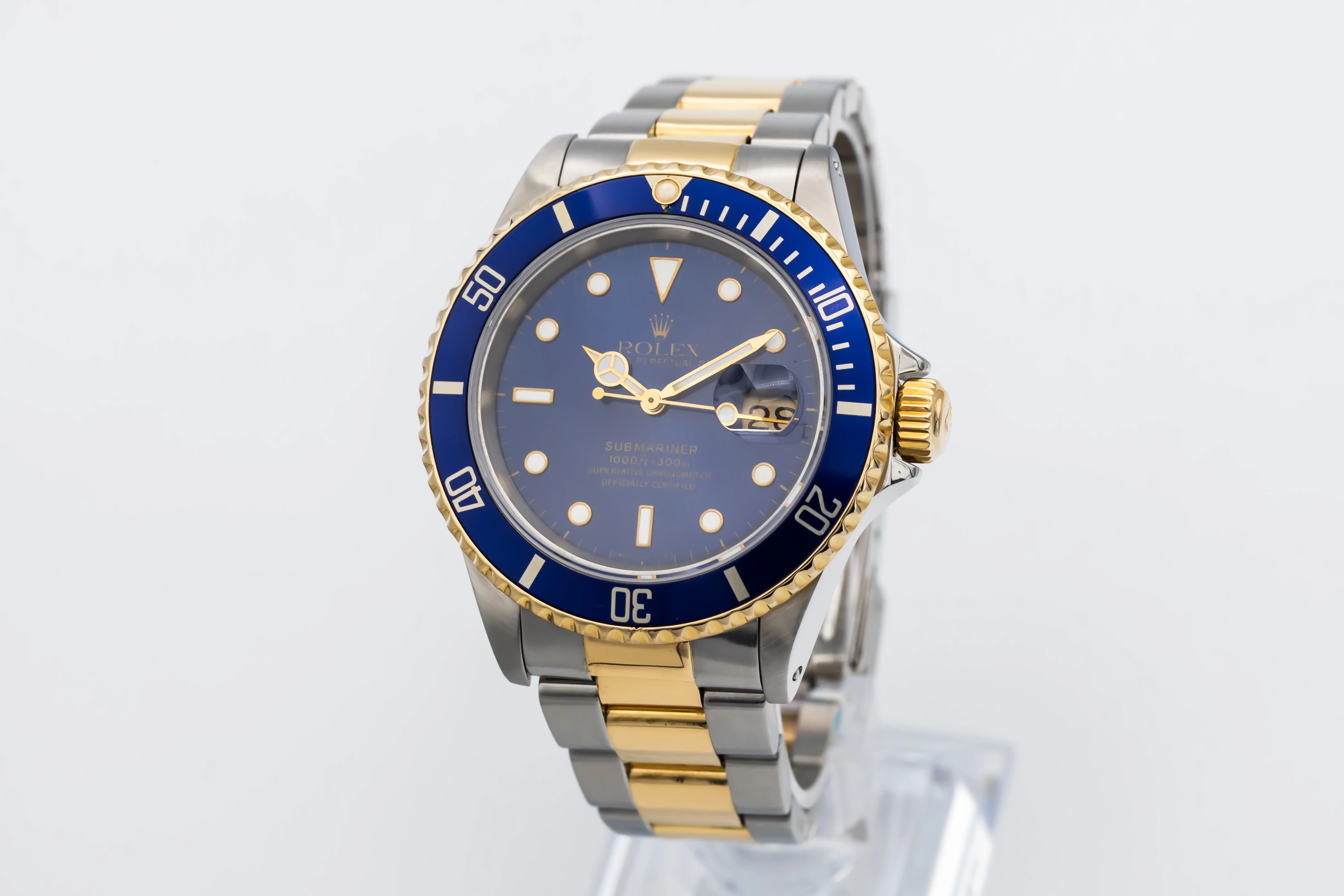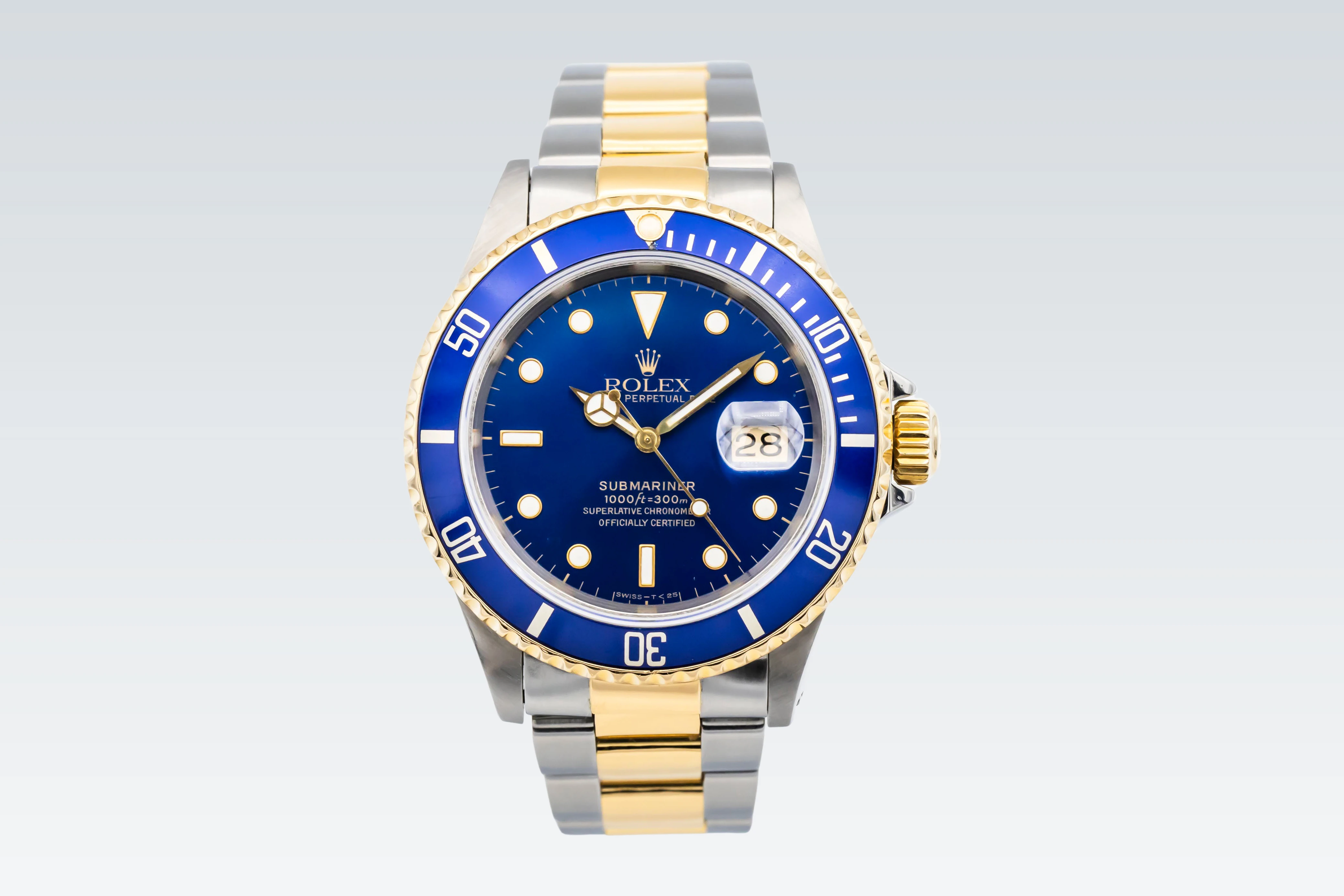 This 1993 Rolex Submariner Date 40mm features a deep blue sunburst dial with luminous round and baton hour markers. Paired with the classic Oyster bracelet in steel and yellow gold with a diver’s extension clasp, this reference exudes sporty elegance and unmistakable Rolex character.