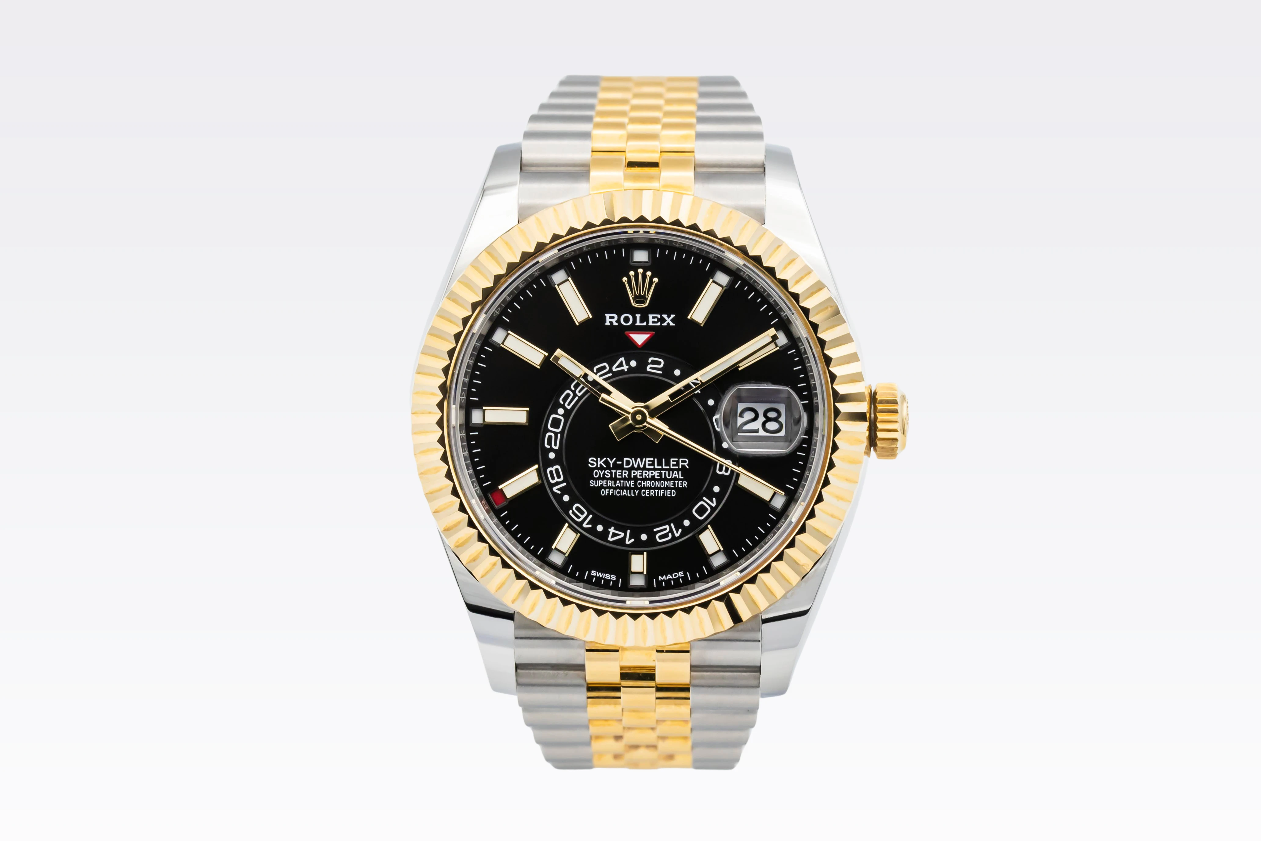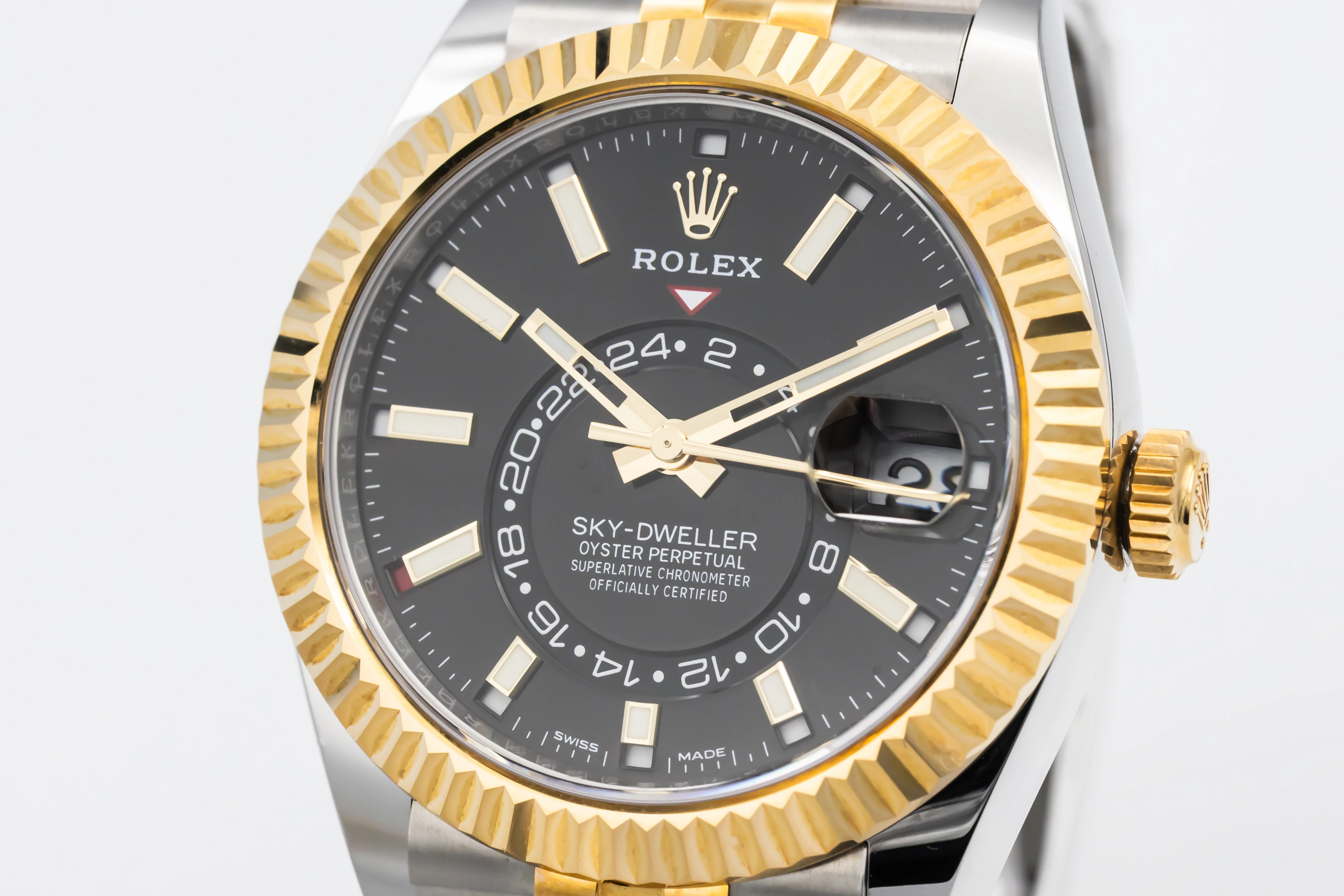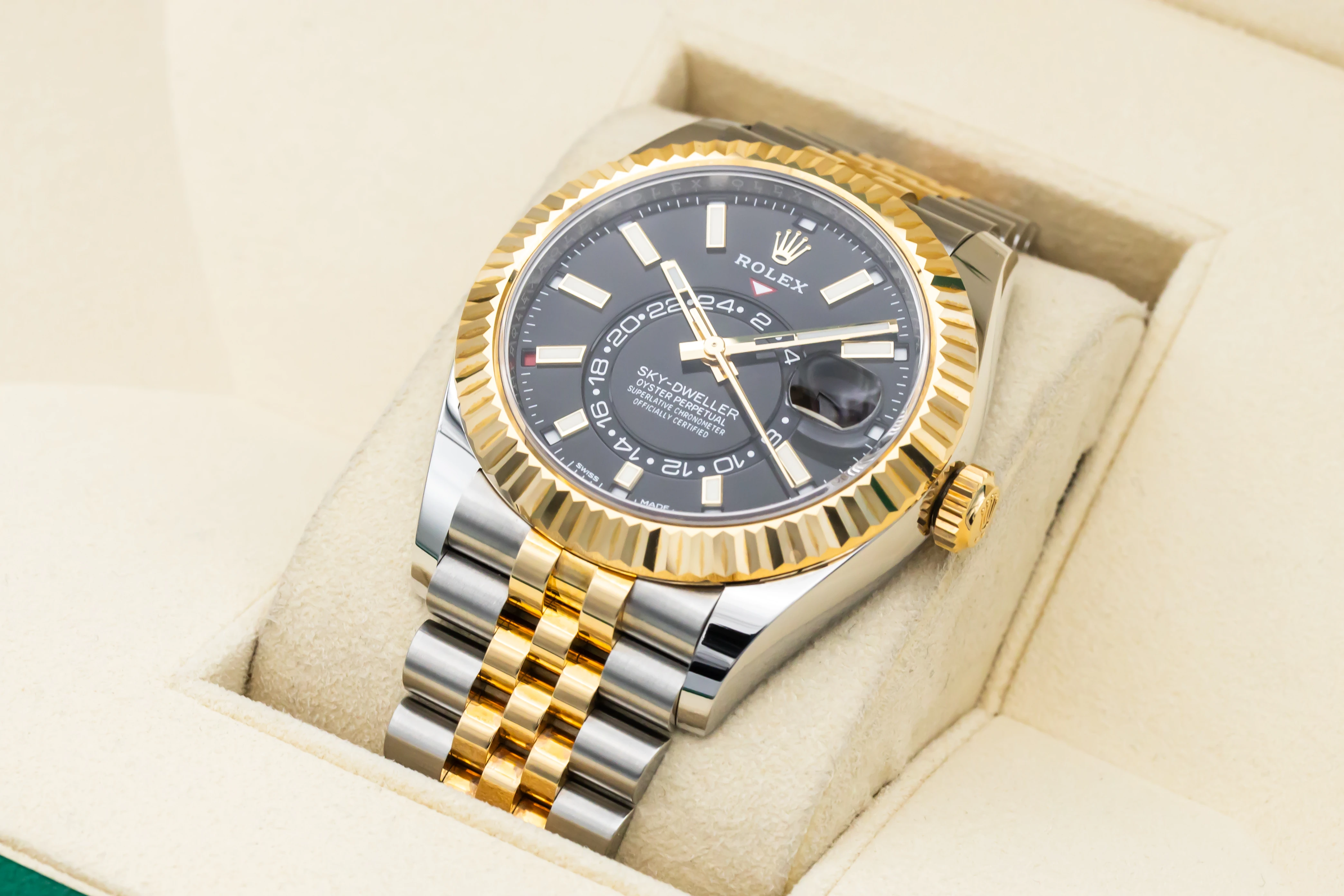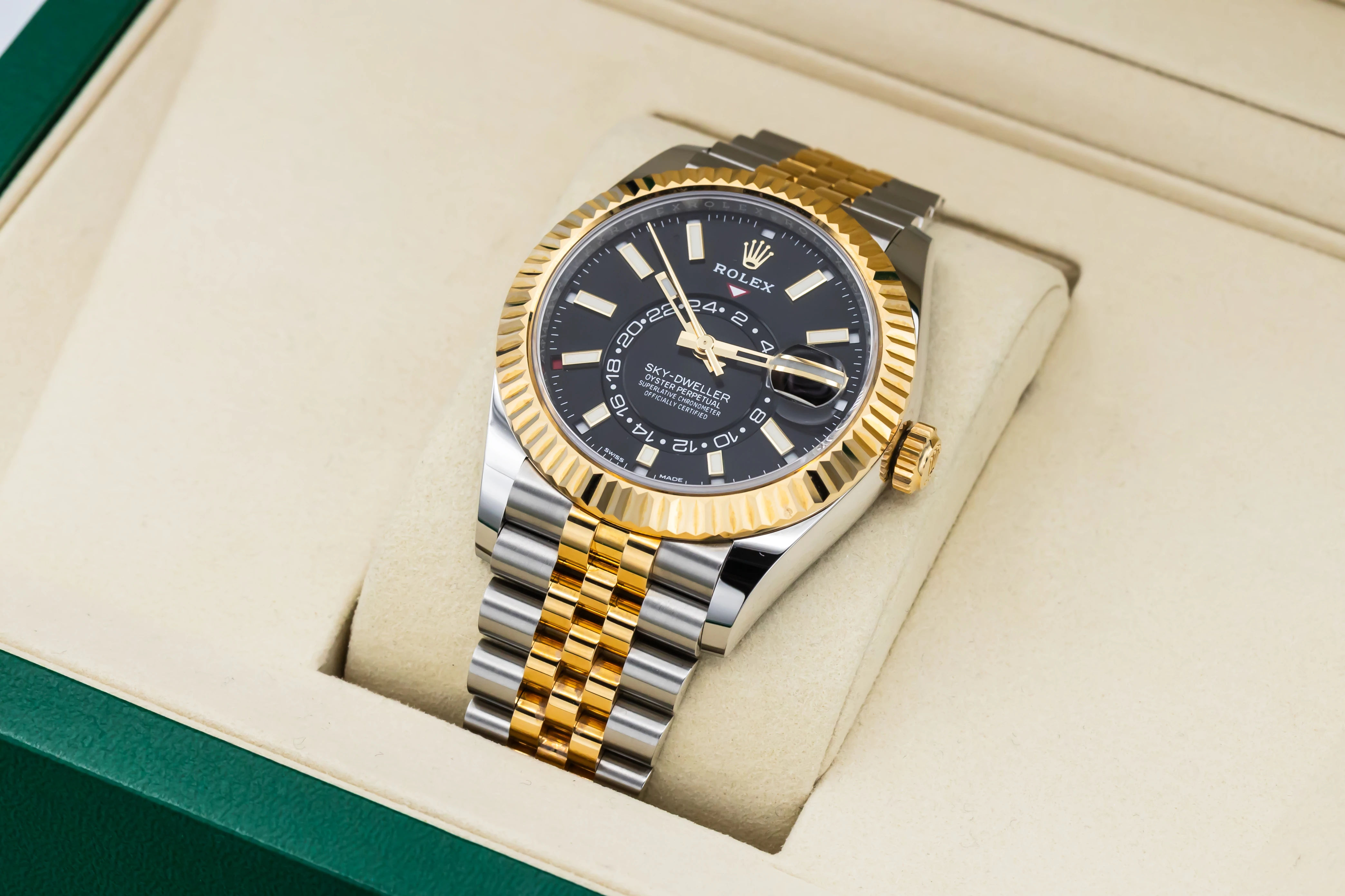 This 2023 Rolex Sky-Dweller 42mm features a black dial with luminous baton hour markers, an off-centre 24-hour disc for dual time zones, and an elegant framed date window beneath the iconic Cyclops lens. Paired with the distinguished Jubilee bracelet—crafted in steel and yellow gold and fitted with a concealed Crownclasp—this Sky-Dweller balances powerful presence with graceful refinement, ideal for world travellers and connoisseurs alike.