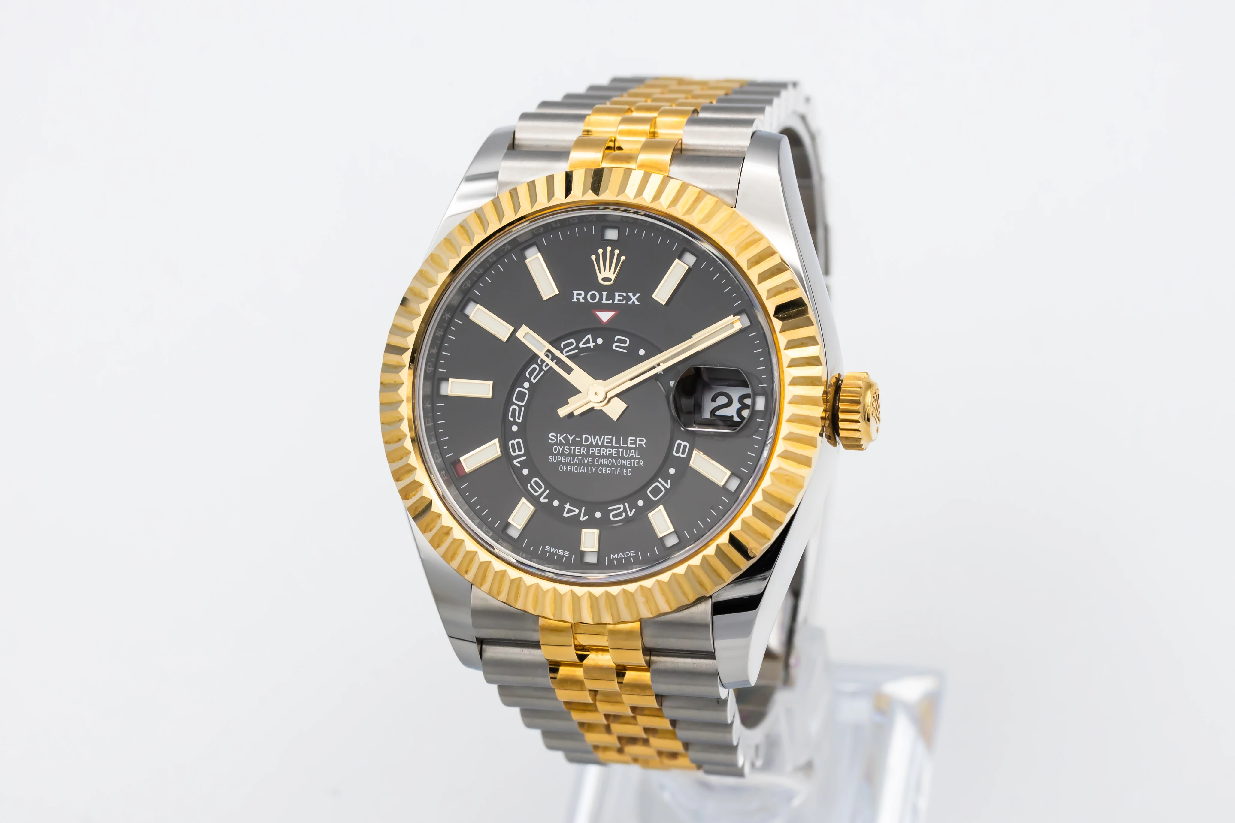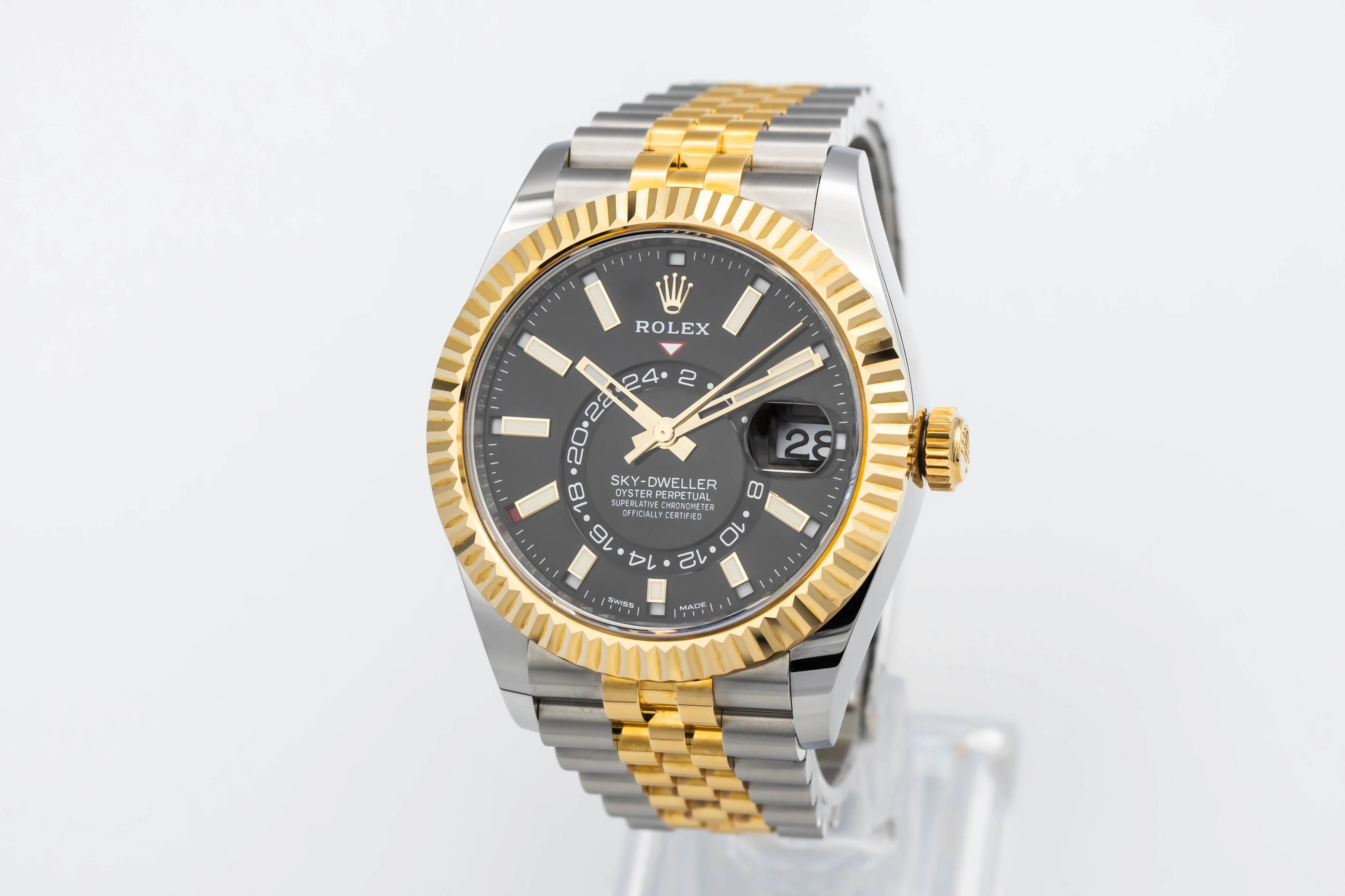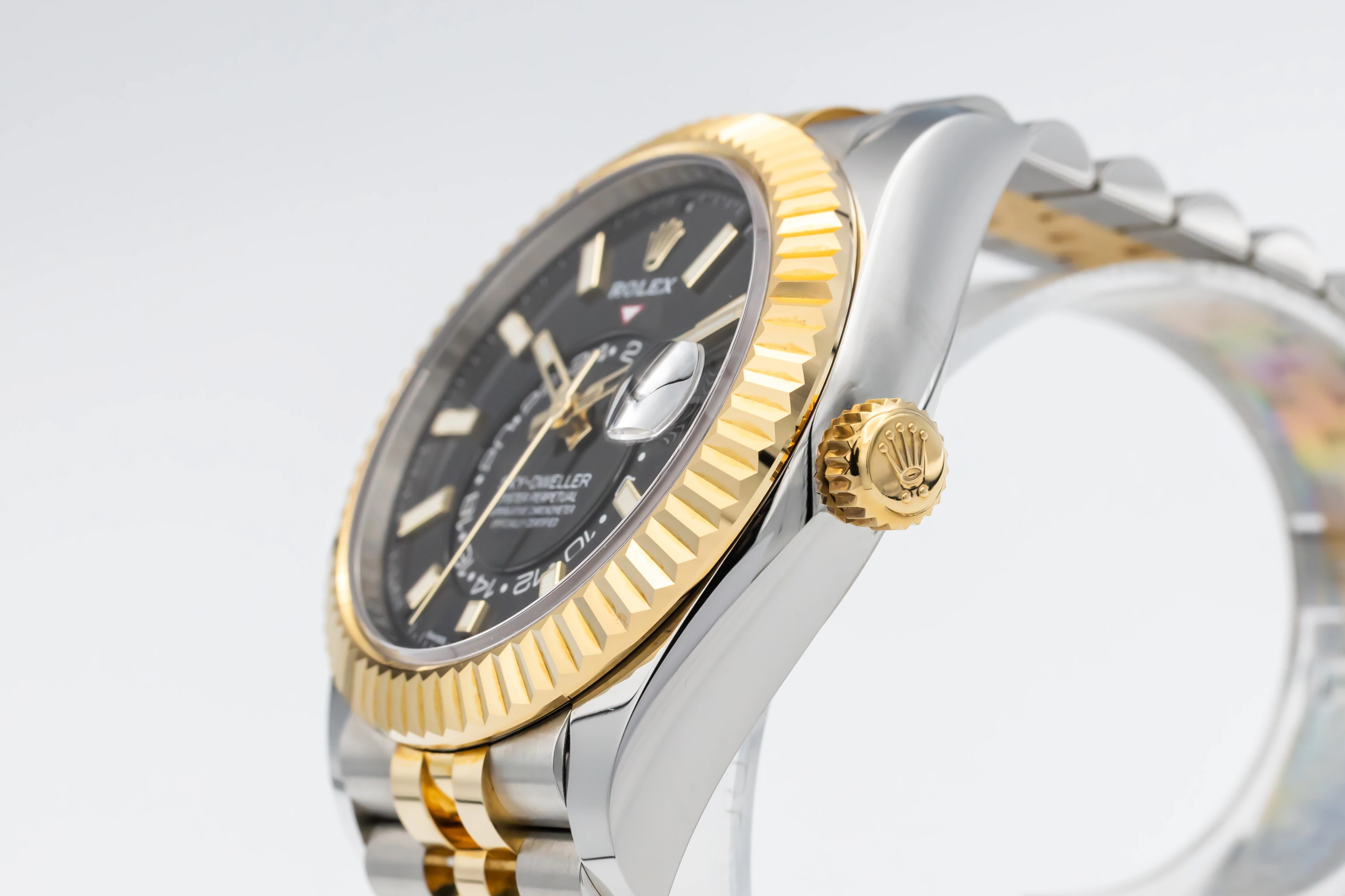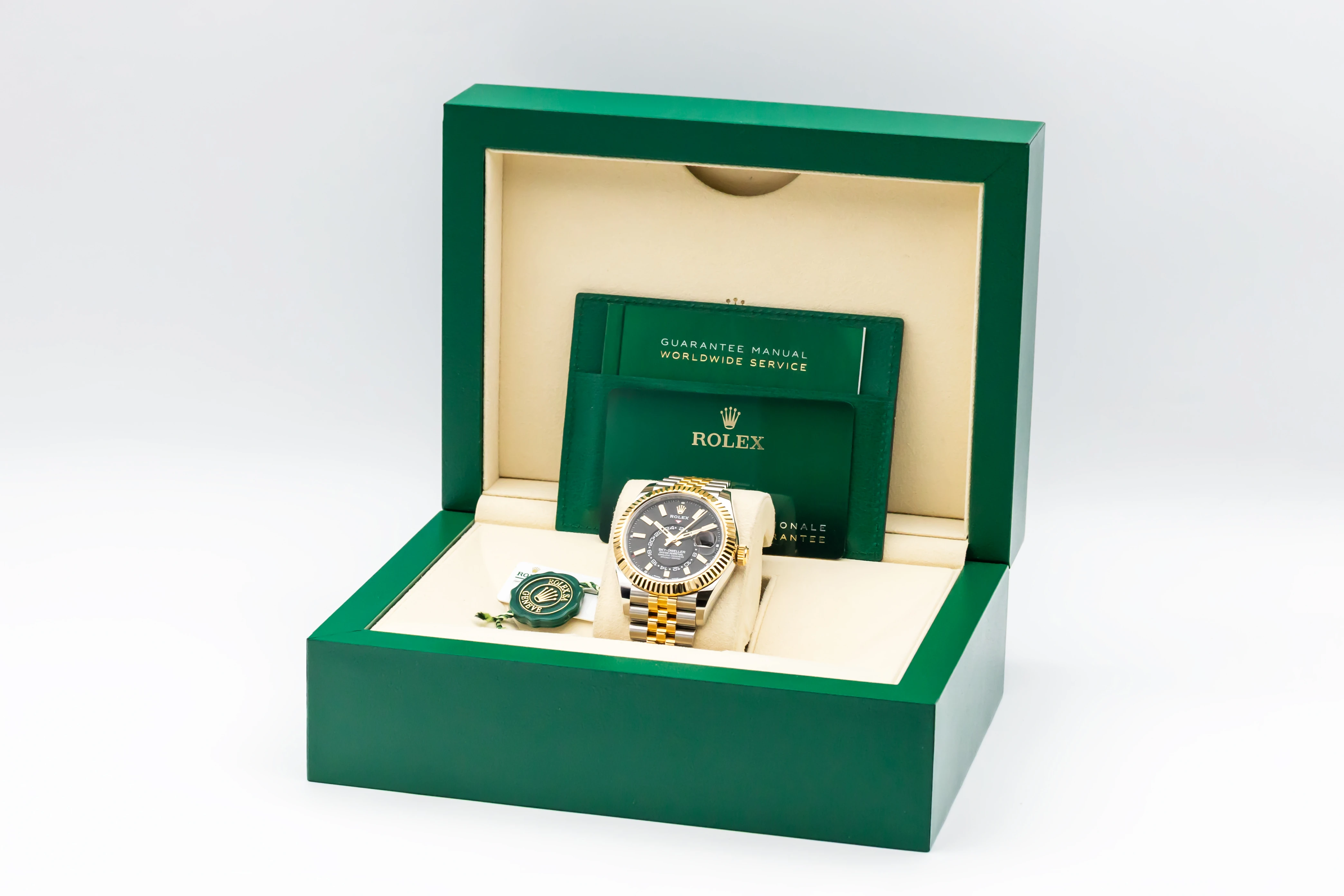 This 2023 Rolex Sky-Dweller 42mm features a black dial with luminous baton hour markers, an off-centre 24-hour disc for dual time zones, and an elegant framed date window beneath the iconic Cyclops lens. Paired with the distinguished Jubilee bracelet—crafted in steel and yellow gold and fitted with a concealed Crownclasp—this Sky-Dweller balances powerful presence with graceful refinement, ideal for world travellers and connoisseurs alike.