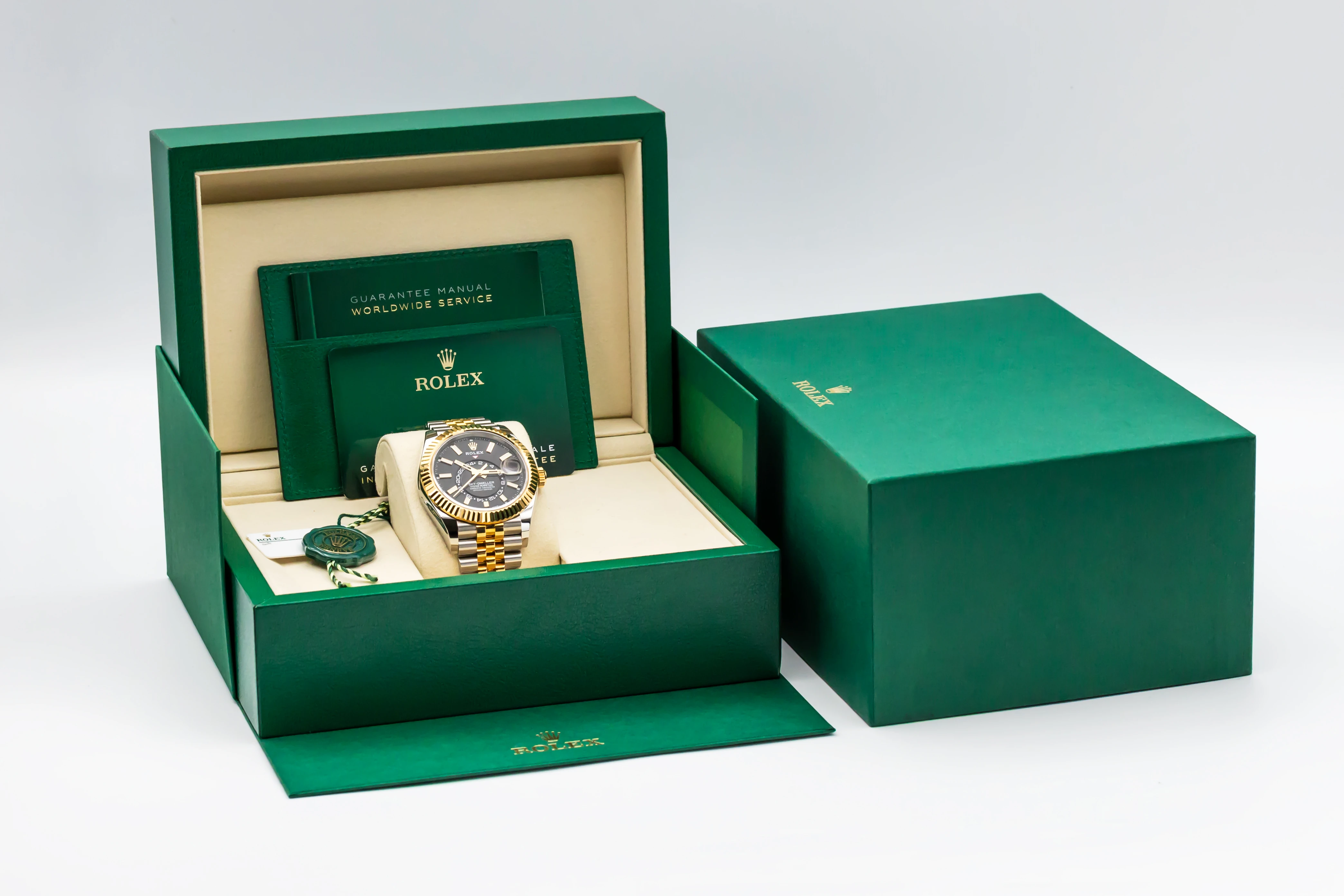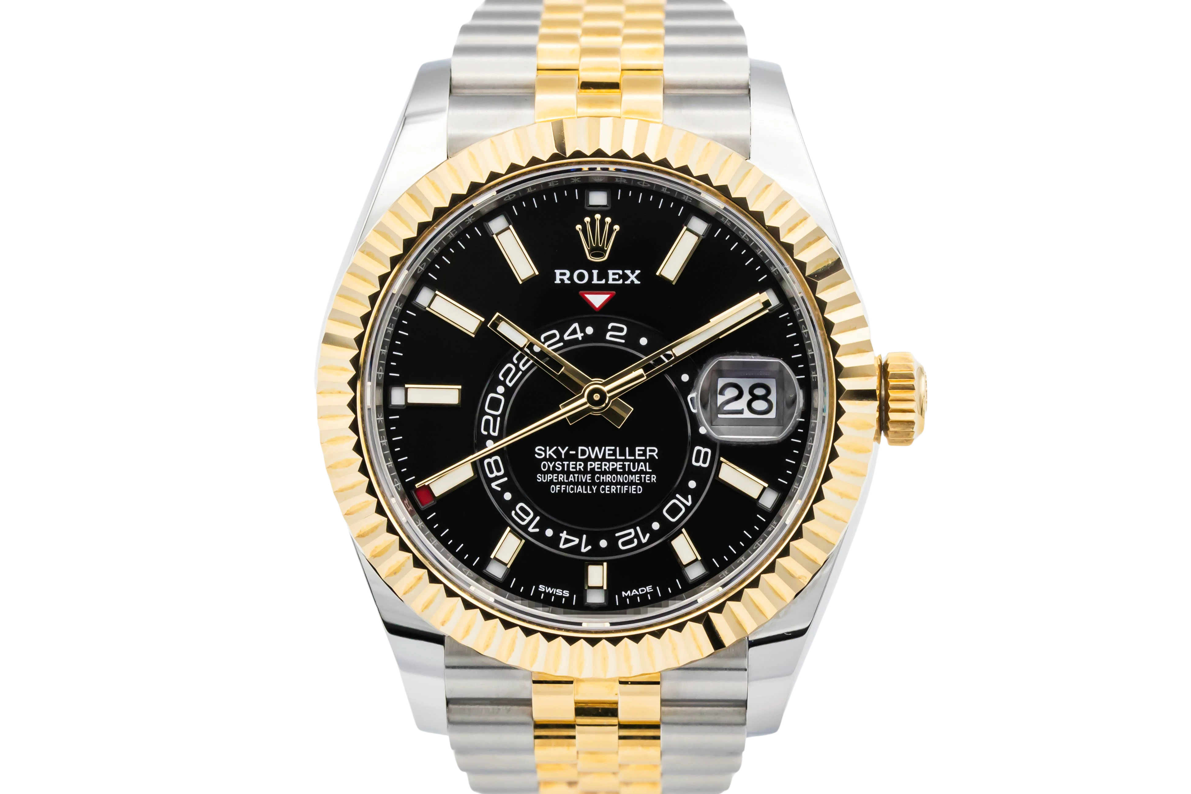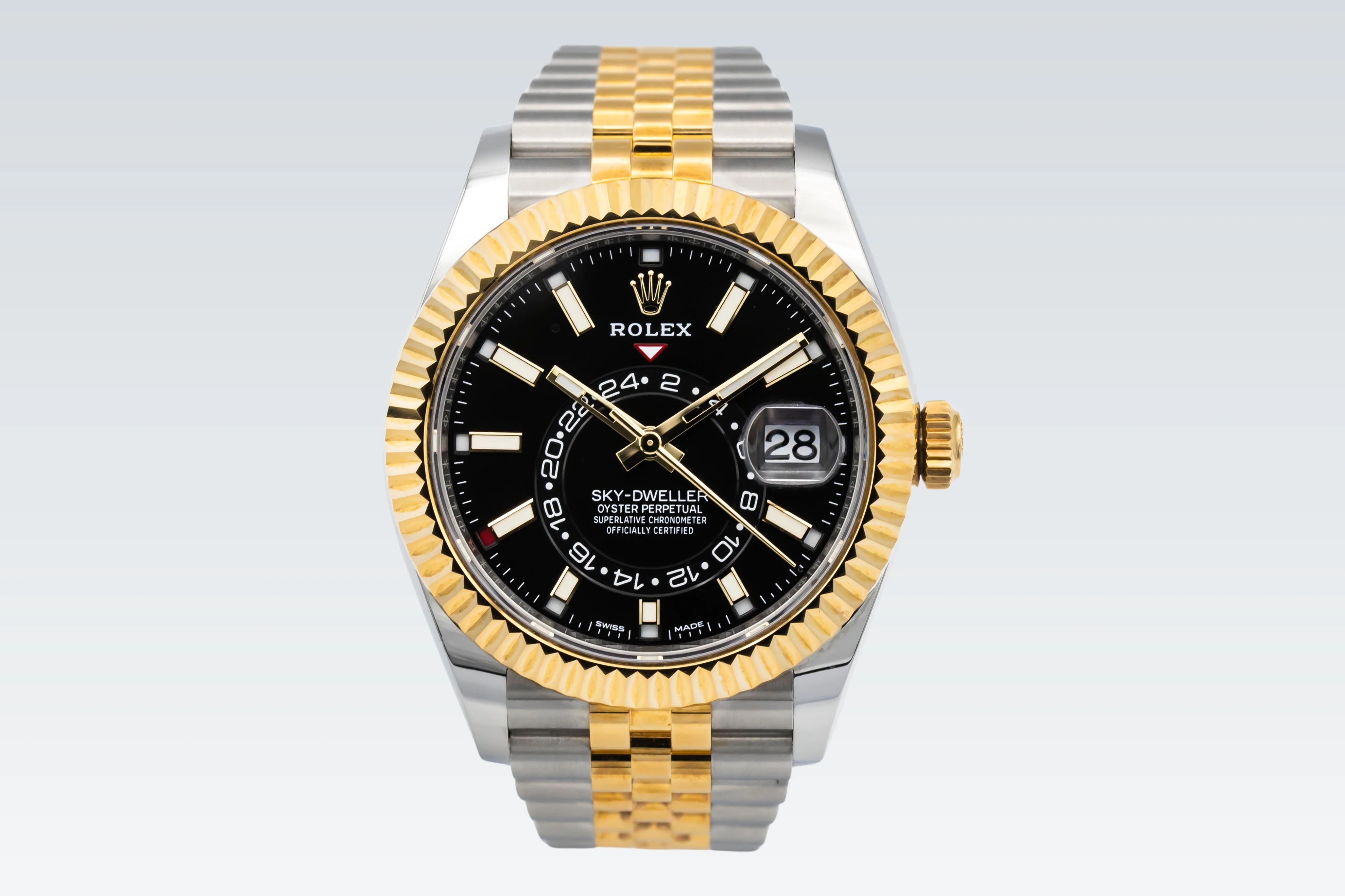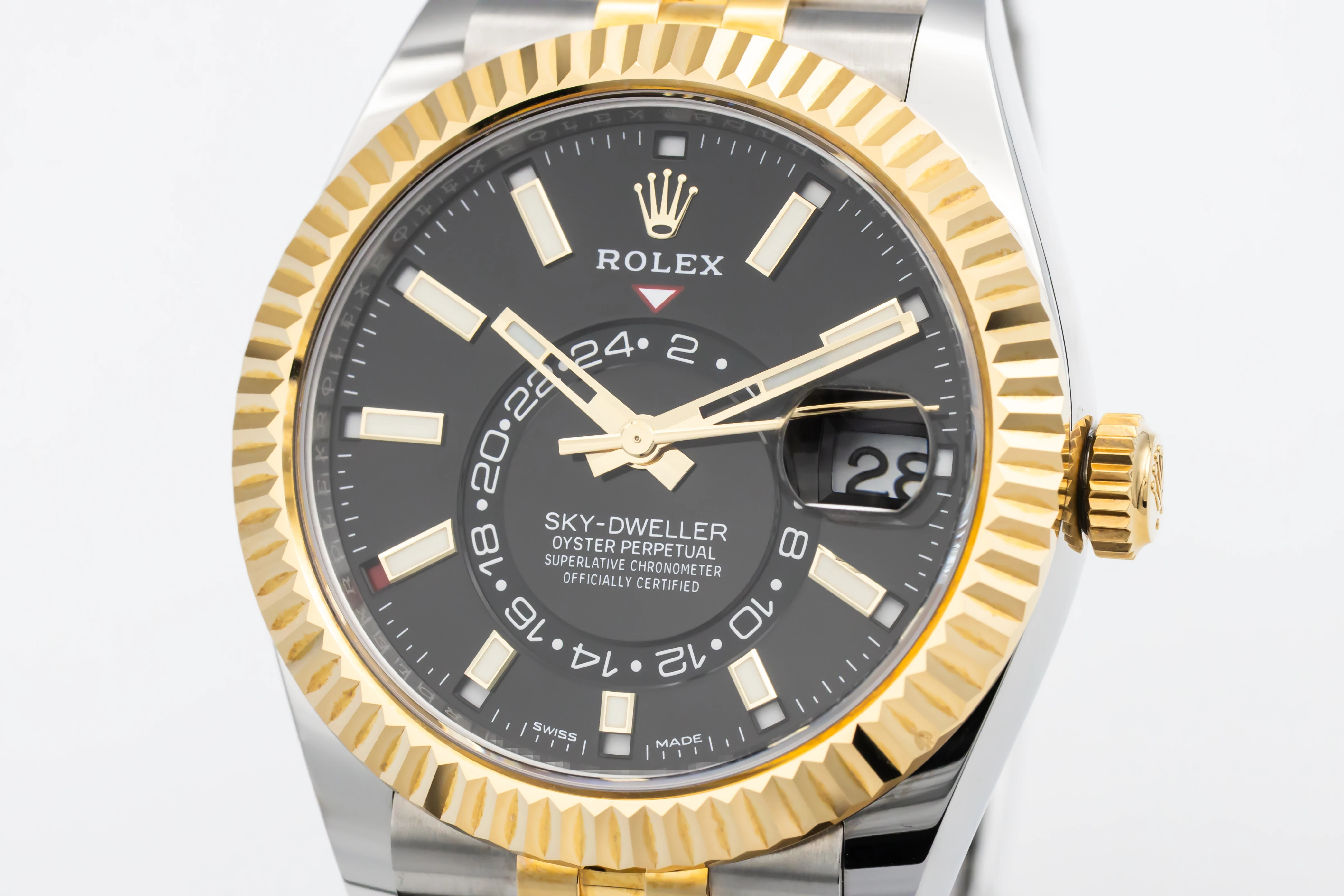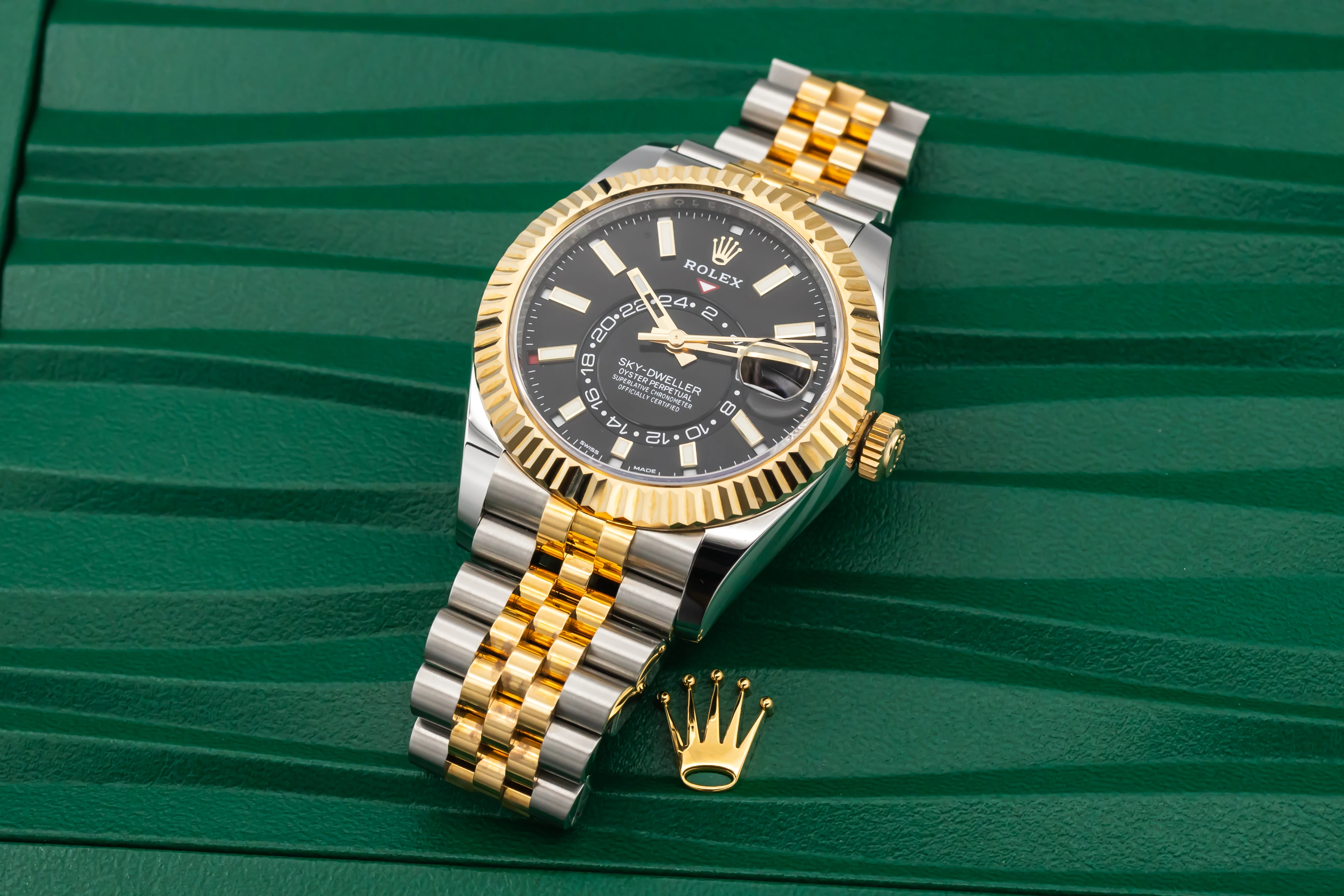 This 2023 Rolex Sky-Dweller 42mm features a black dial with luminous baton hour markers, an off-centre 24-hour disc for dual time zones, and an elegant framed date window beneath the iconic Cyclops lens. Paired with the distinguished Jubilee bracelet—crafted in steel and yellow gold and fitted with a concealed Crownclasp—this Sky-Dweller balances powerful presence with graceful refinement, ideal for world travellers and connoisseurs alike.