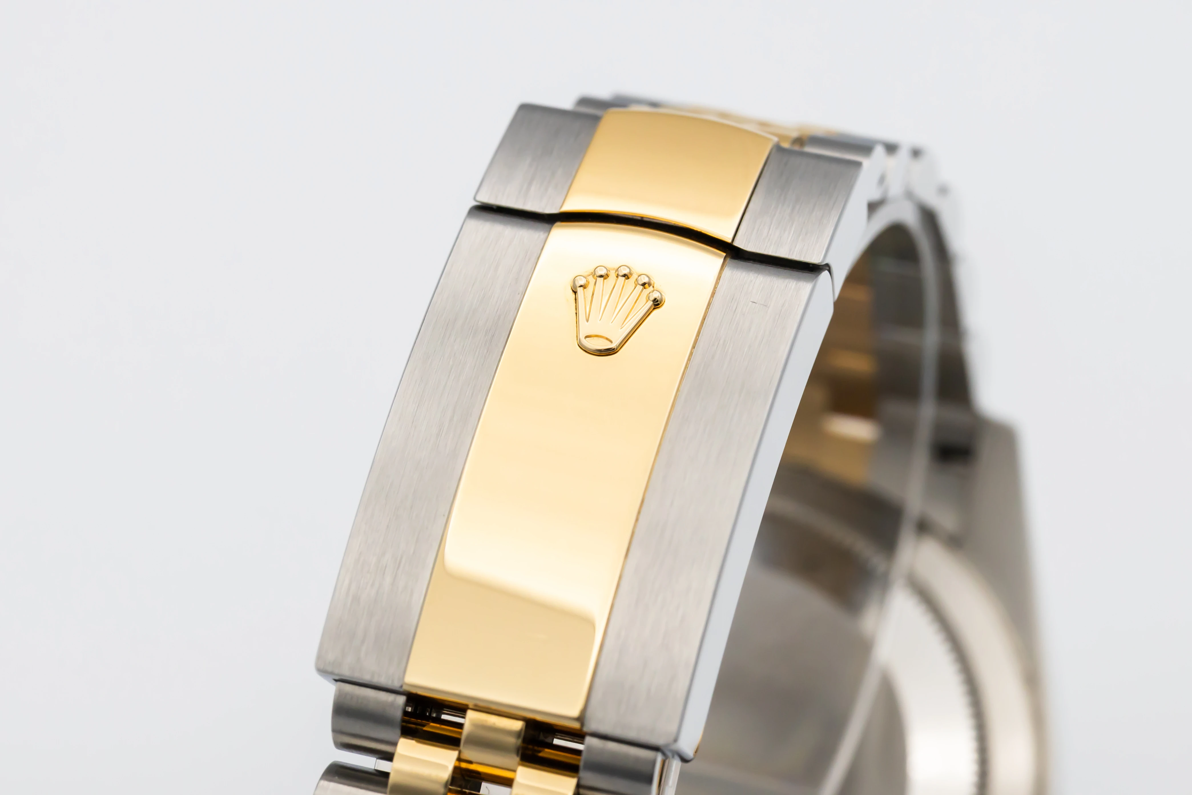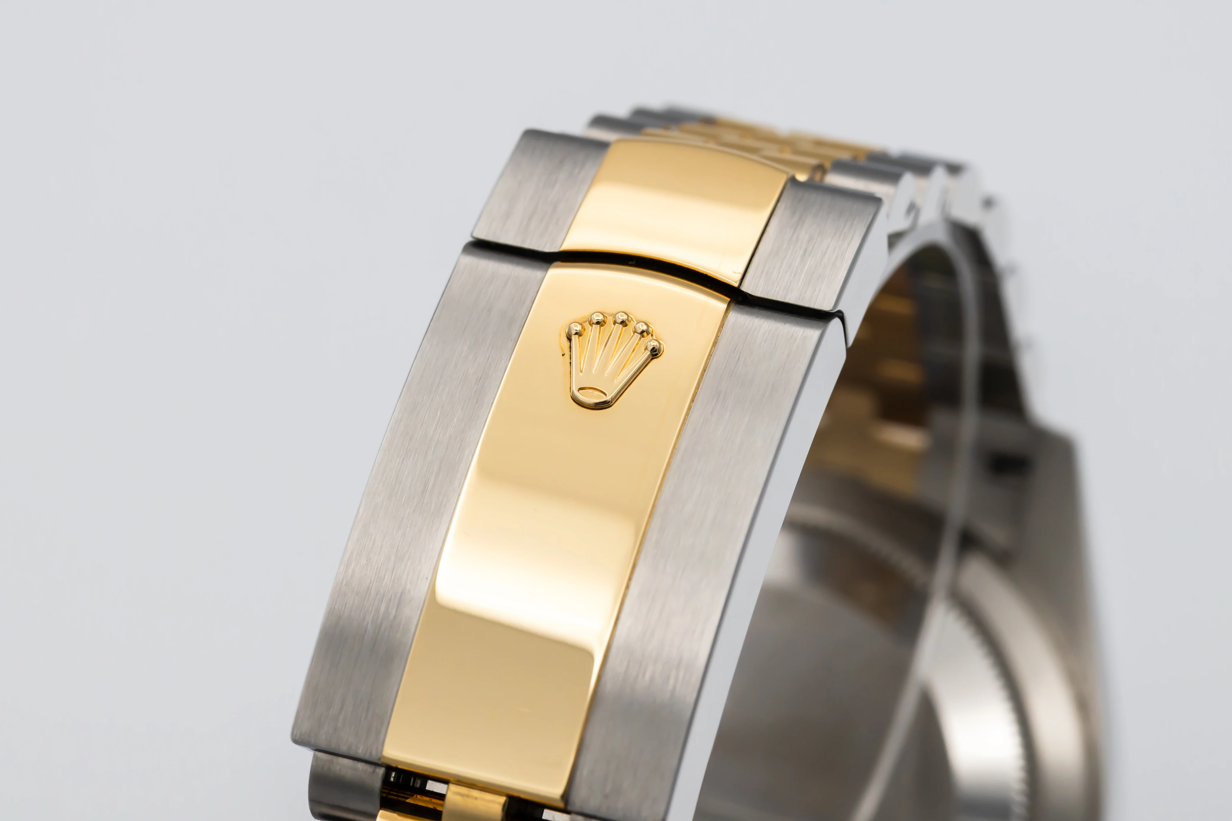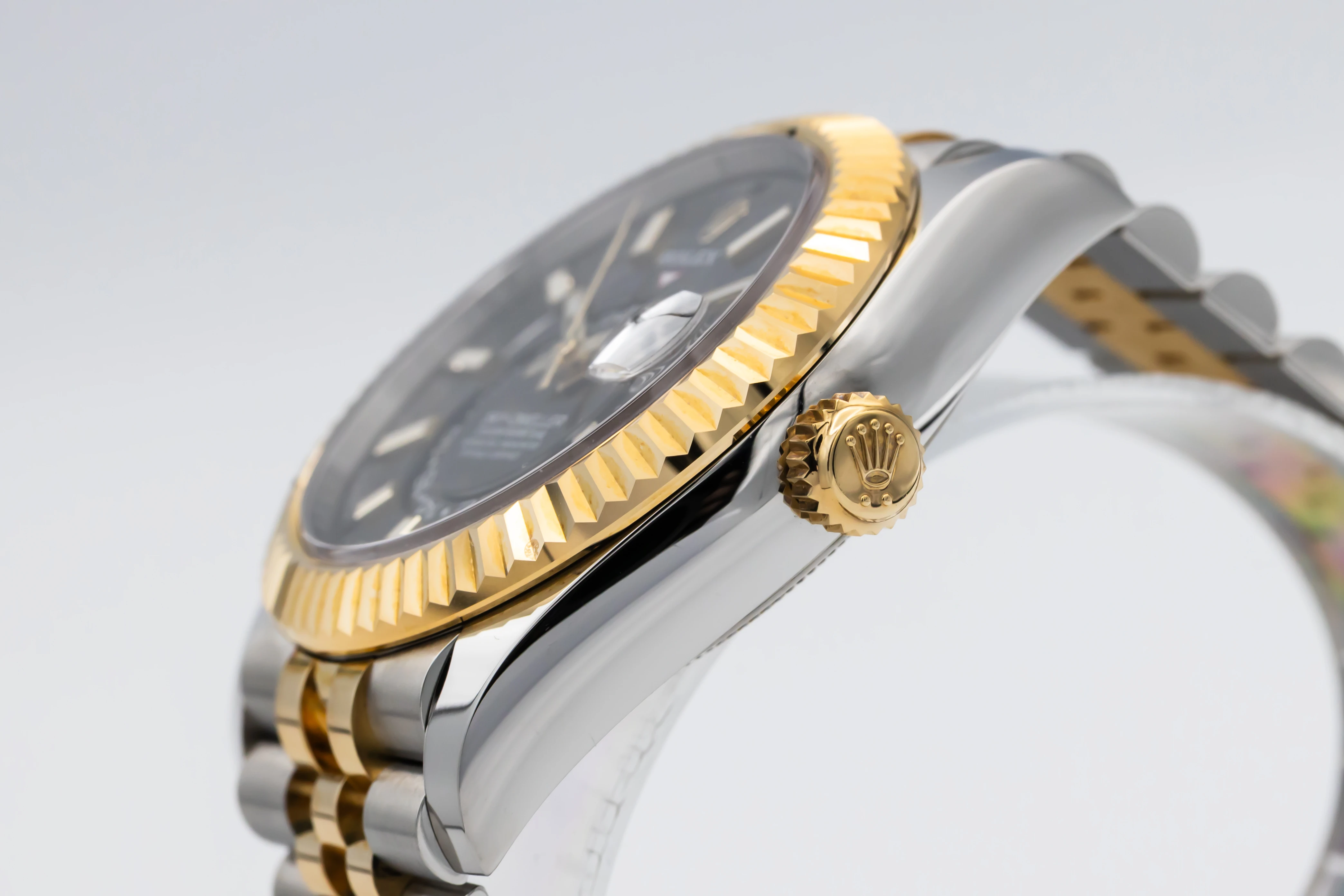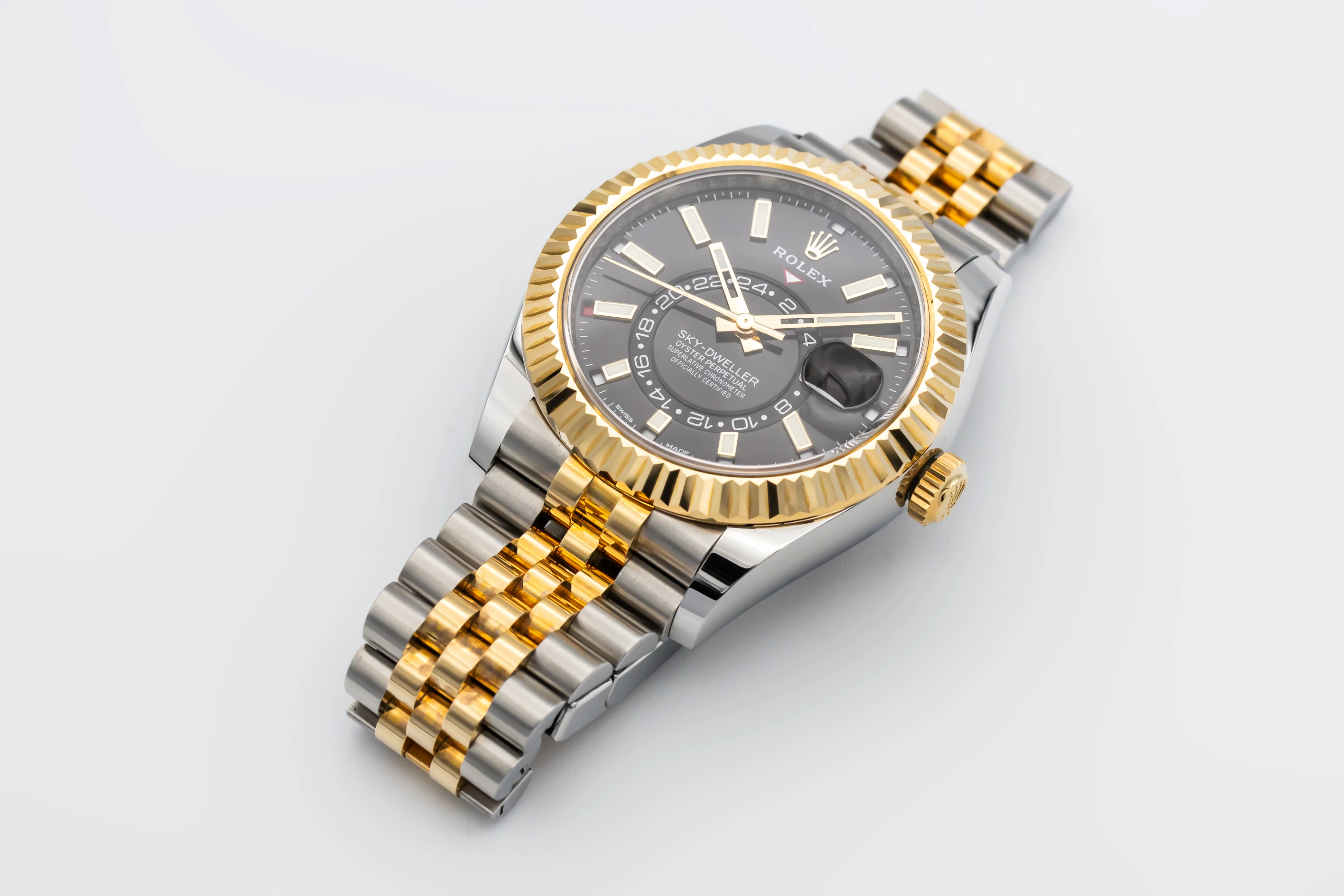 This 2023 Rolex Sky-Dweller 42mm features a black dial with luminous baton hour markers, an off-centre 24-hour disc for dual time zones, and an elegant framed date window beneath the iconic Cyclops lens. Paired with the distinguished Jubilee bracelet—crafted in steel and yellow gold and fitted with a concealed Crownclasp—this Sky-Dweller balances powerful presence with graceful refinement, ideal for world travellers and connoisseurs alike.