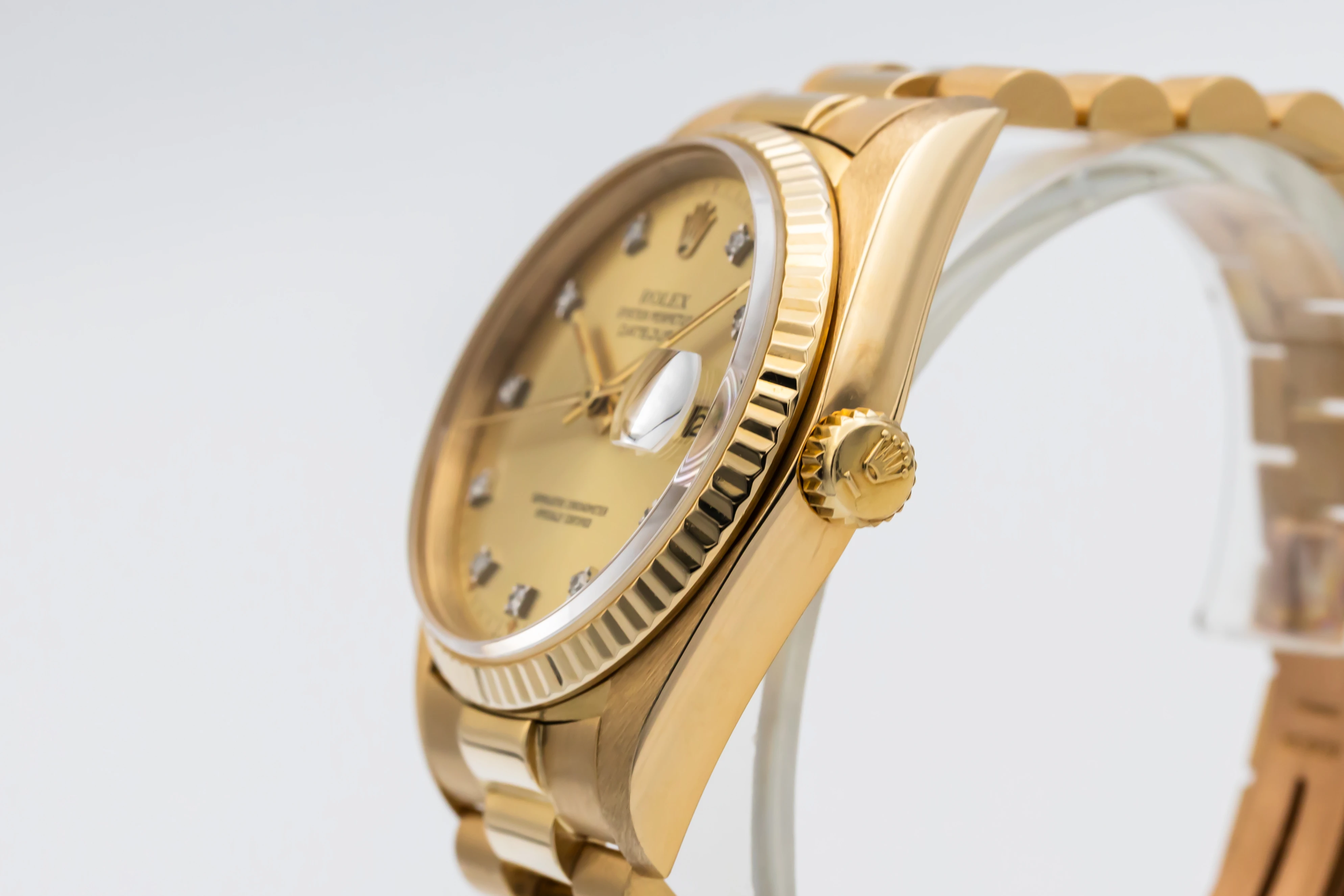This 1979 Rolex DateJust 36mm features a classic champagne dial, enhanced by factory diamond hour markers and elegant gold hands. Its proportions are perfectly balanced, giving the watch an unmistakably refined aesthetic. Paired with the prestigious 18ct yellow gold President bracelet, This vintage DateJust embodies the golden age of Rolex elegance.