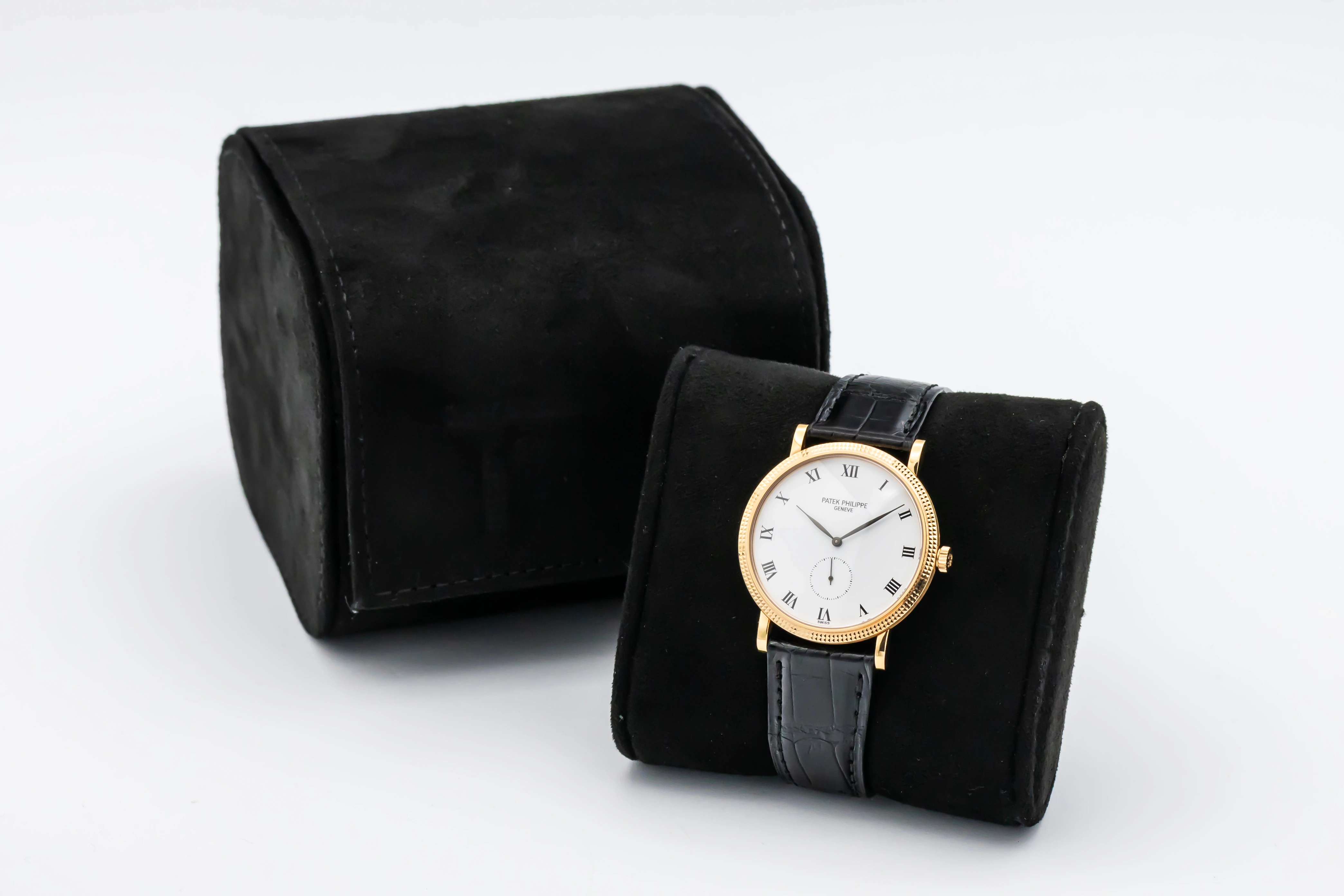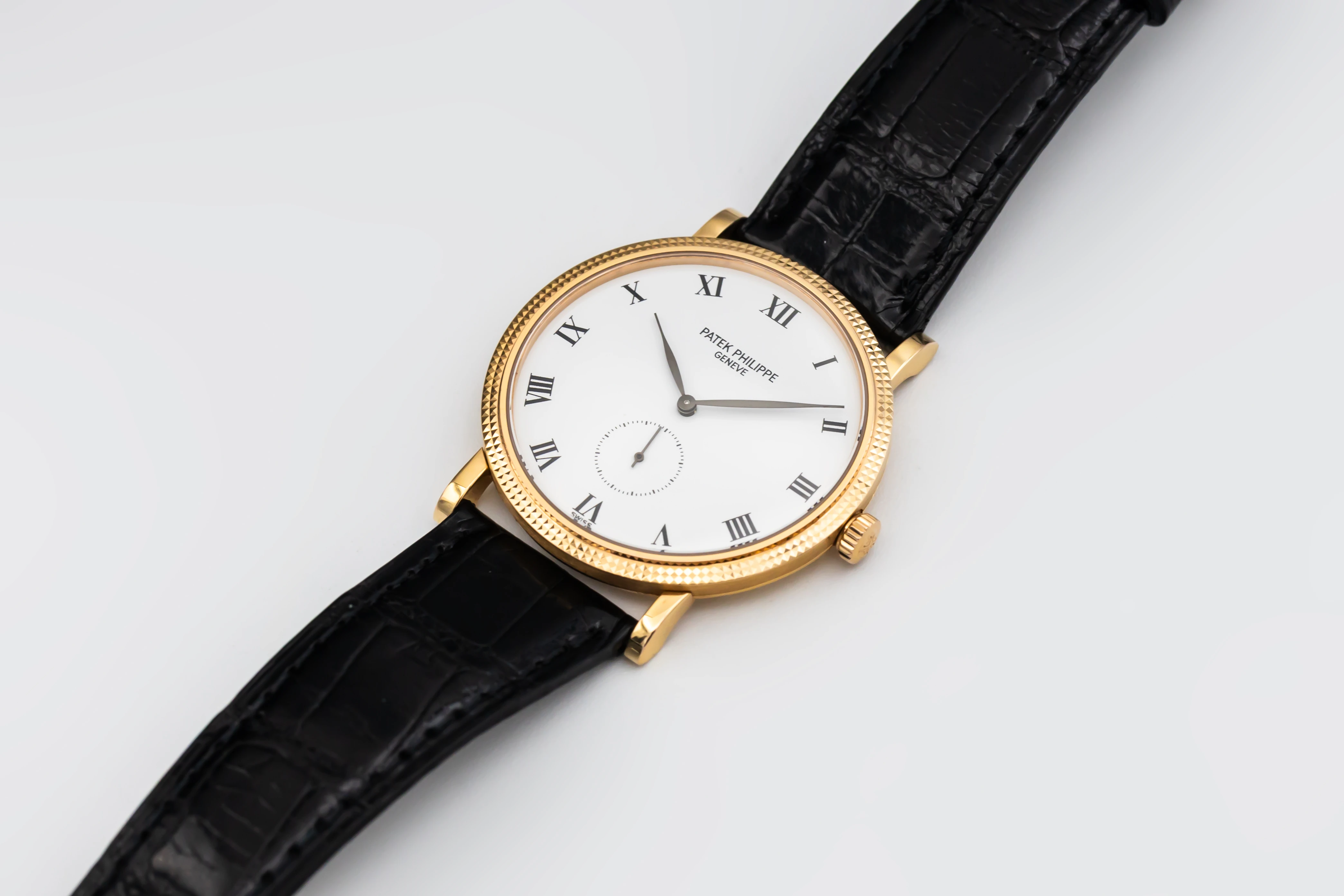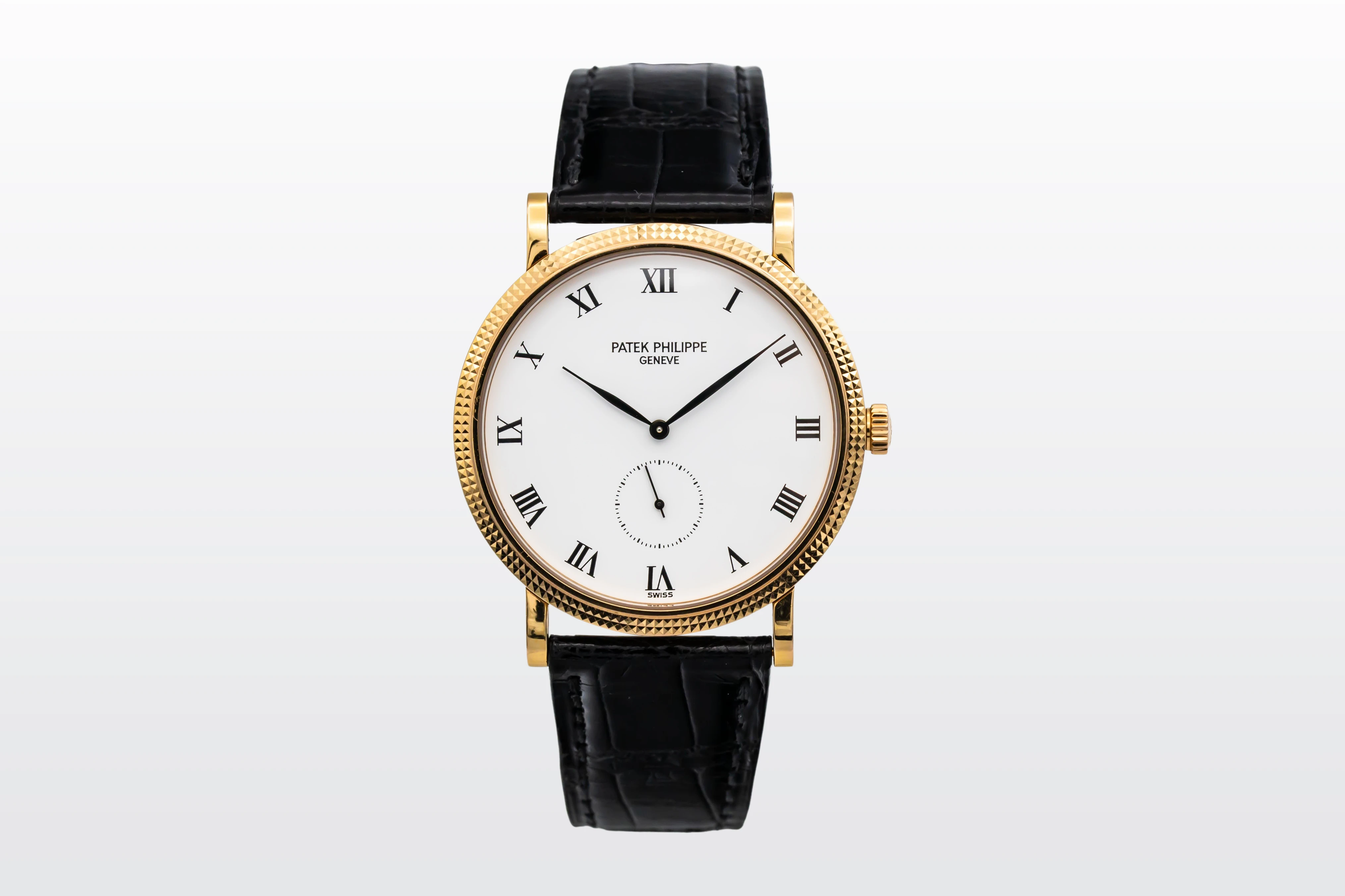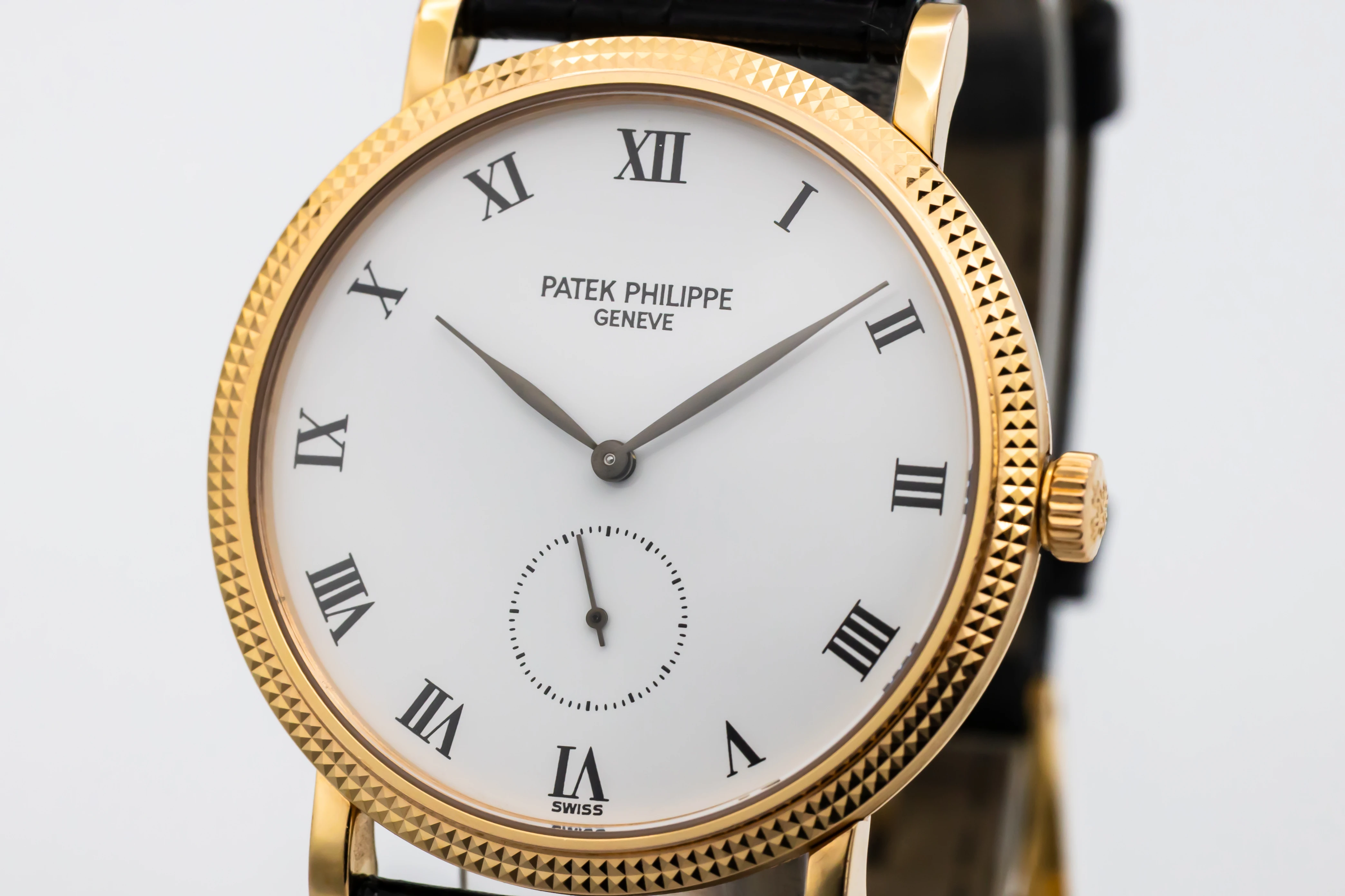 This circa 1990s Patek Philippe Calatrava is a classic dress-watch in 18ct yellow gold, featuring a 33 mm round case with the signature “Clous de Paris” hobnail bezel. Its white dial boasts black Roman numerals and a small-seconds subdial at 6 o’clock, paired with refined leaf-style hands — a timeless aesthetic that embodies understated sophistication. The watch is designed to be slim on the wrist and comes fitted with a black leather strap.