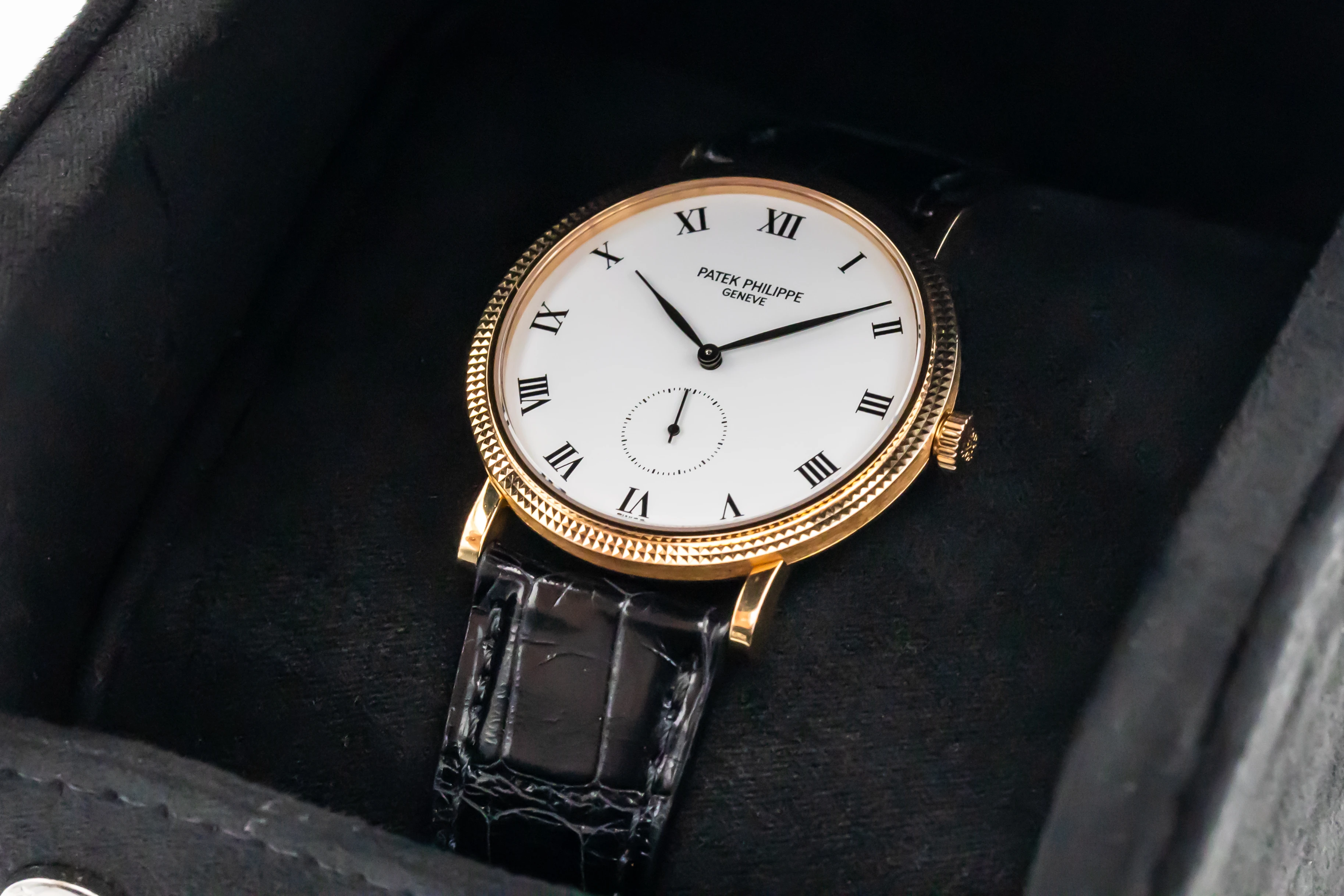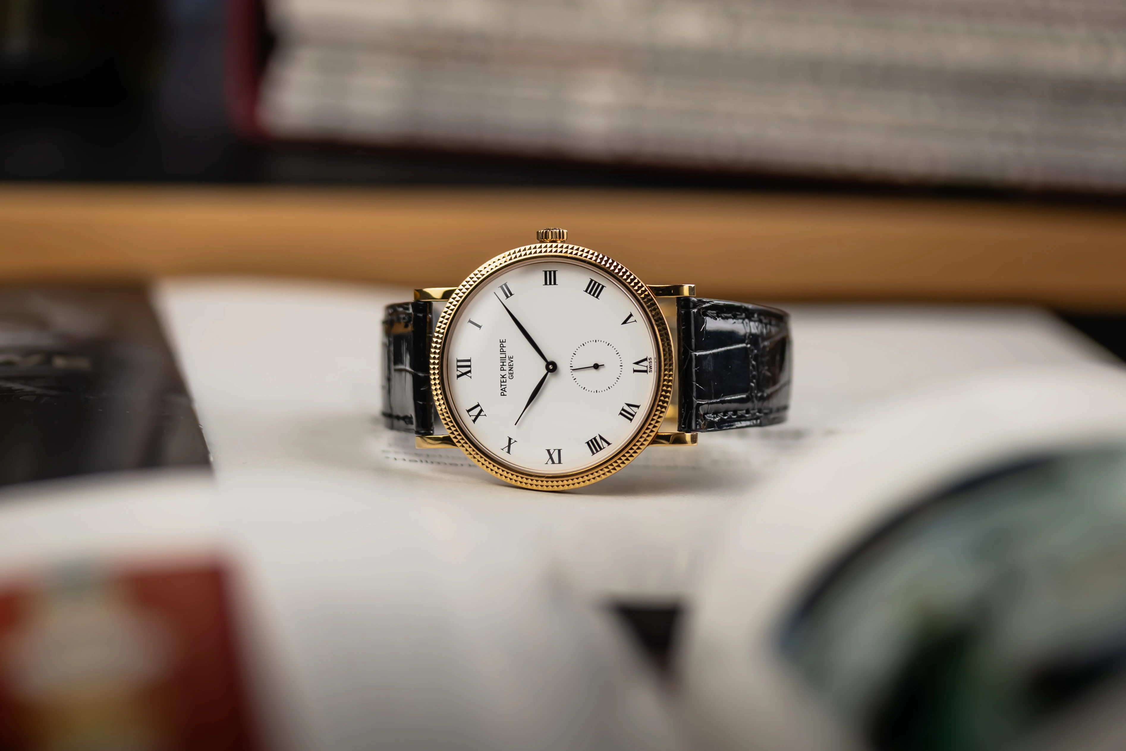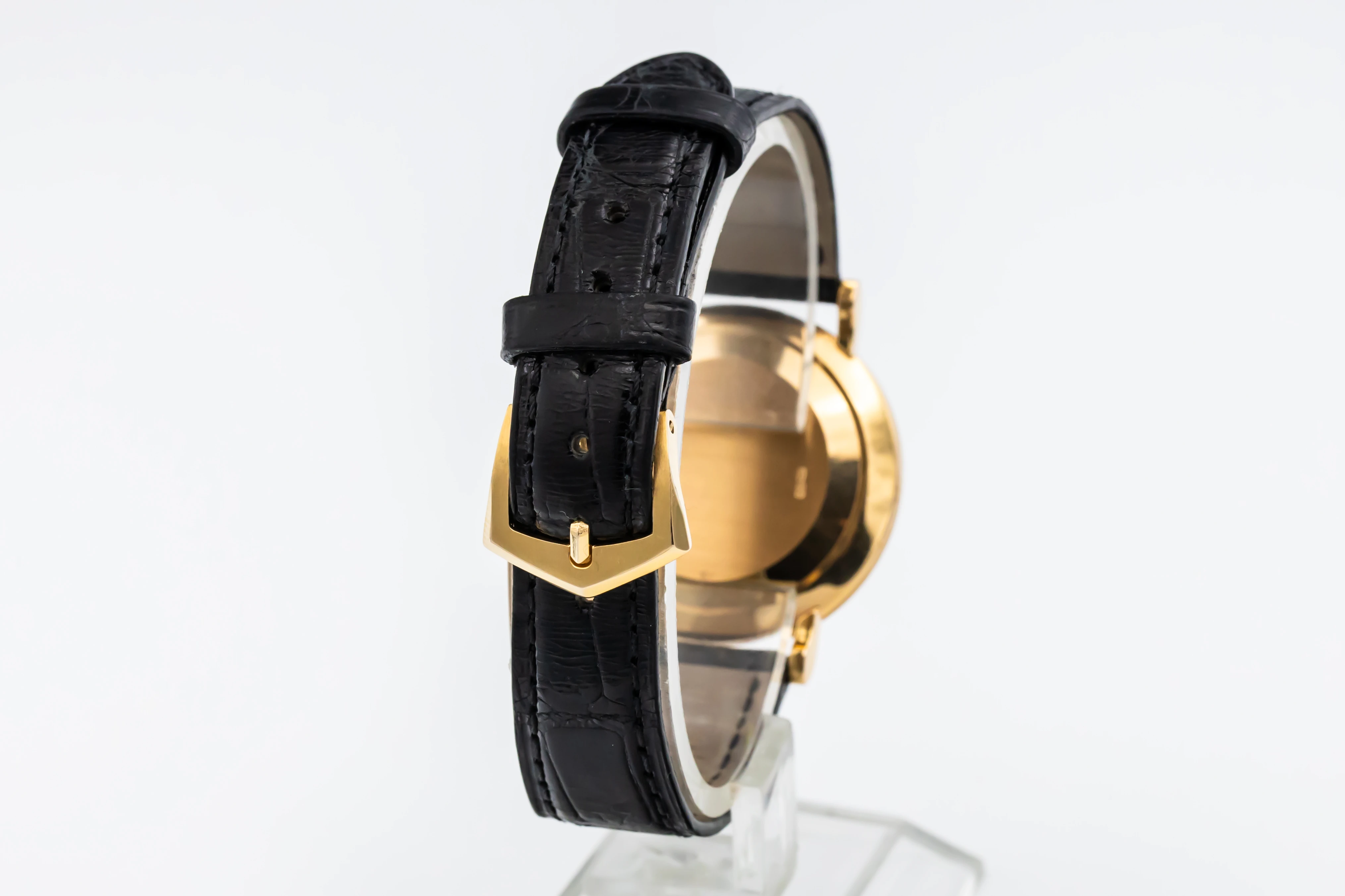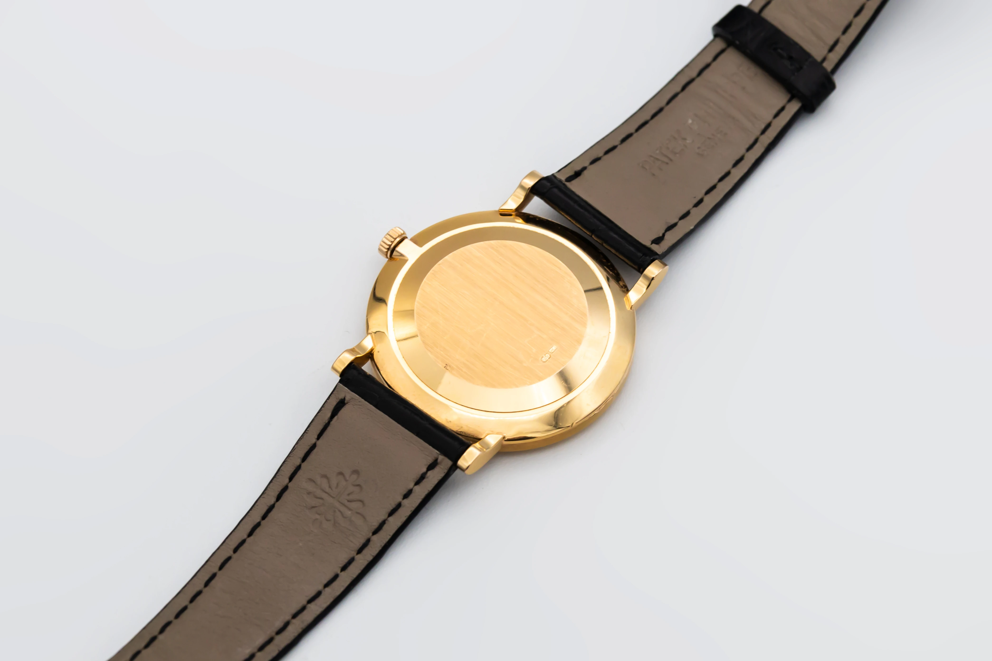 This circa 1990s Patek Philippe Calatrava is a classic dress-watch in 18ct yellow gold, featuring a 33 mm round case with the signature “Clous de Paris” hobnail bezel. Its white dial boasts black Roman numerals and a small-seconds subdial at 6 o’clock, paired with refined leaf-style hands — a timeless aesthetic that embodies understated sophistication. The watch is designed to be slim on the wrist and comes fitted with a black leather strap.