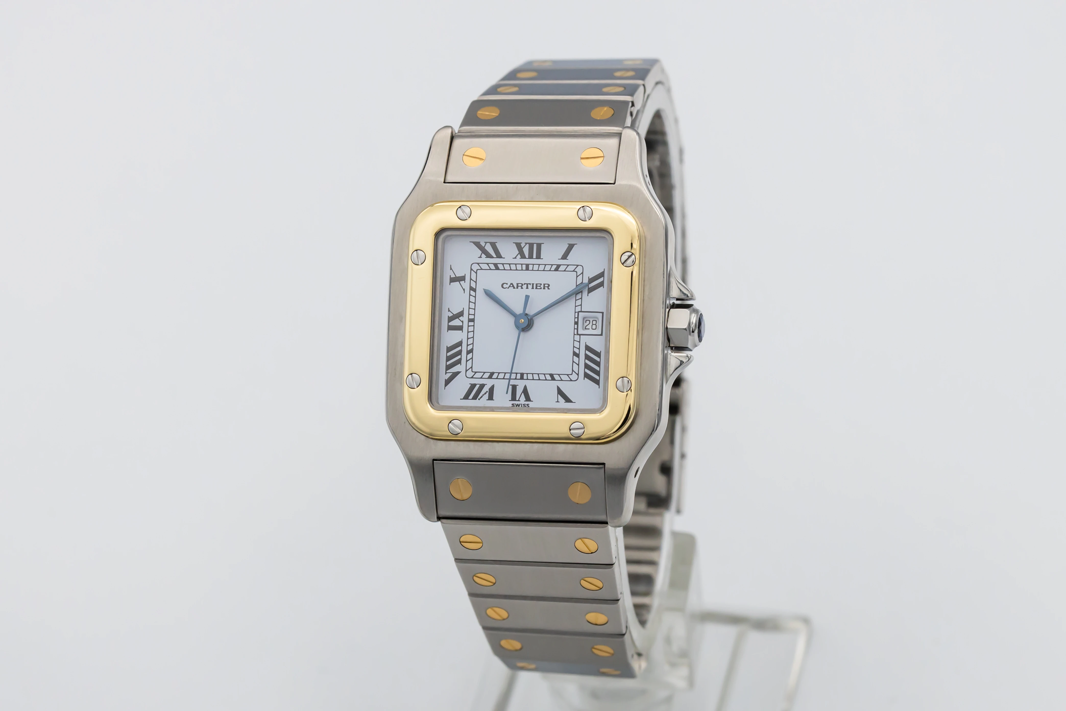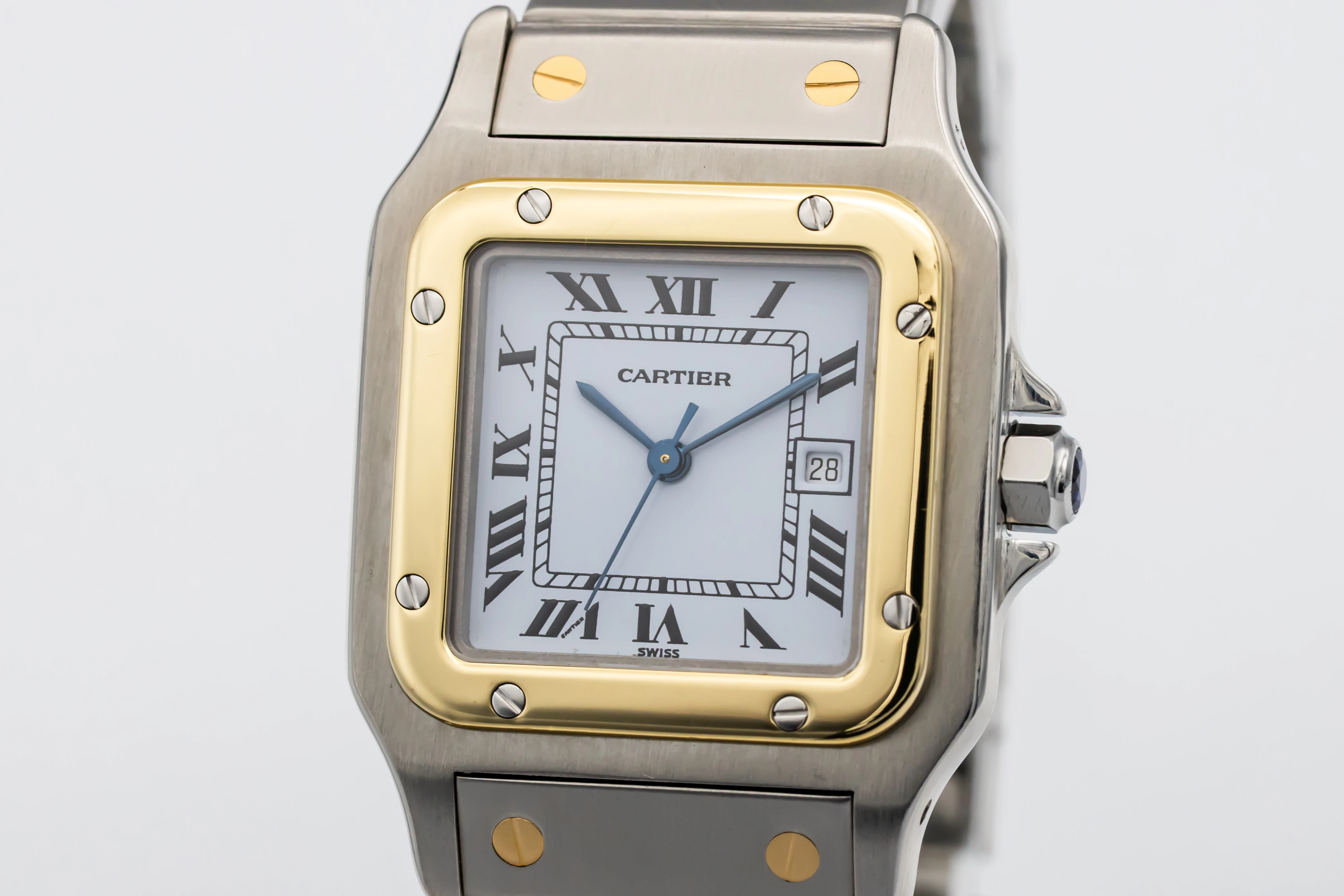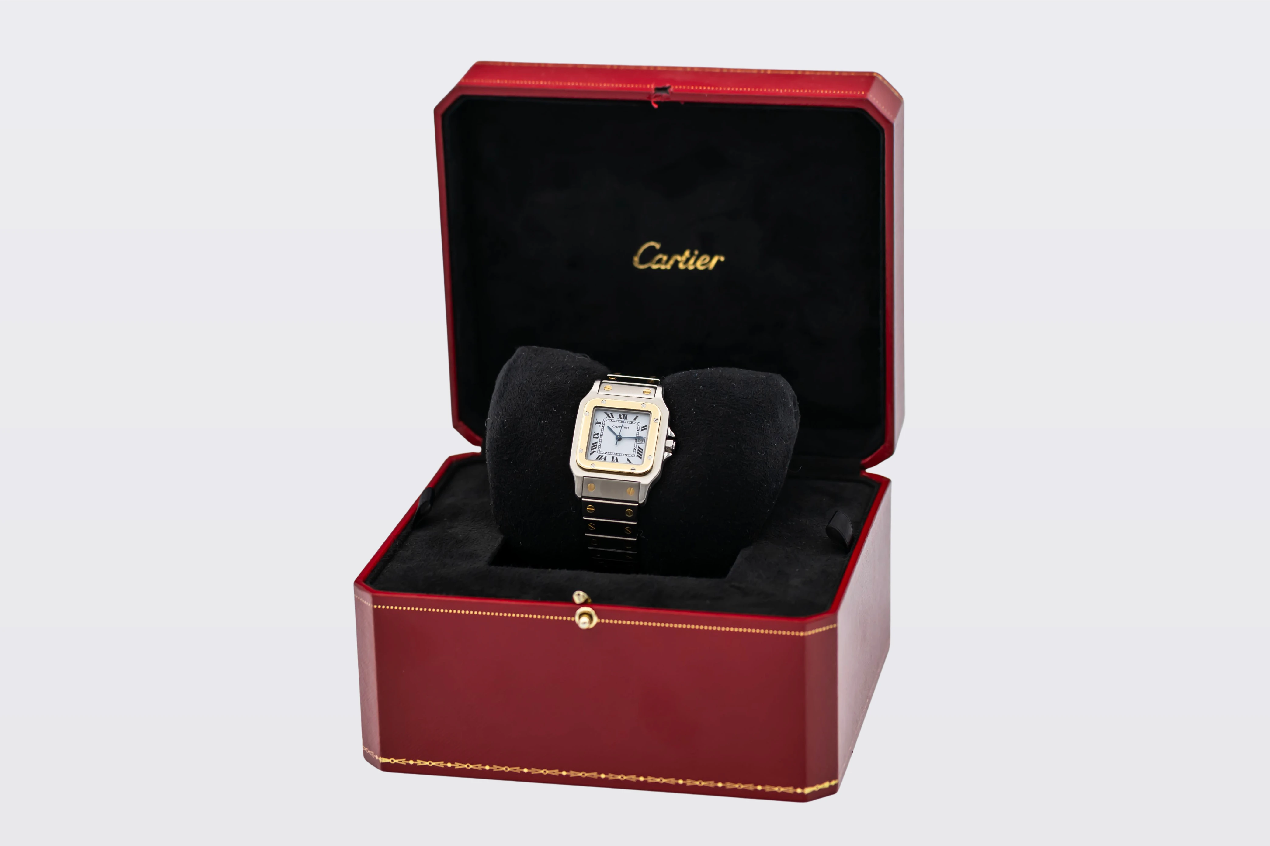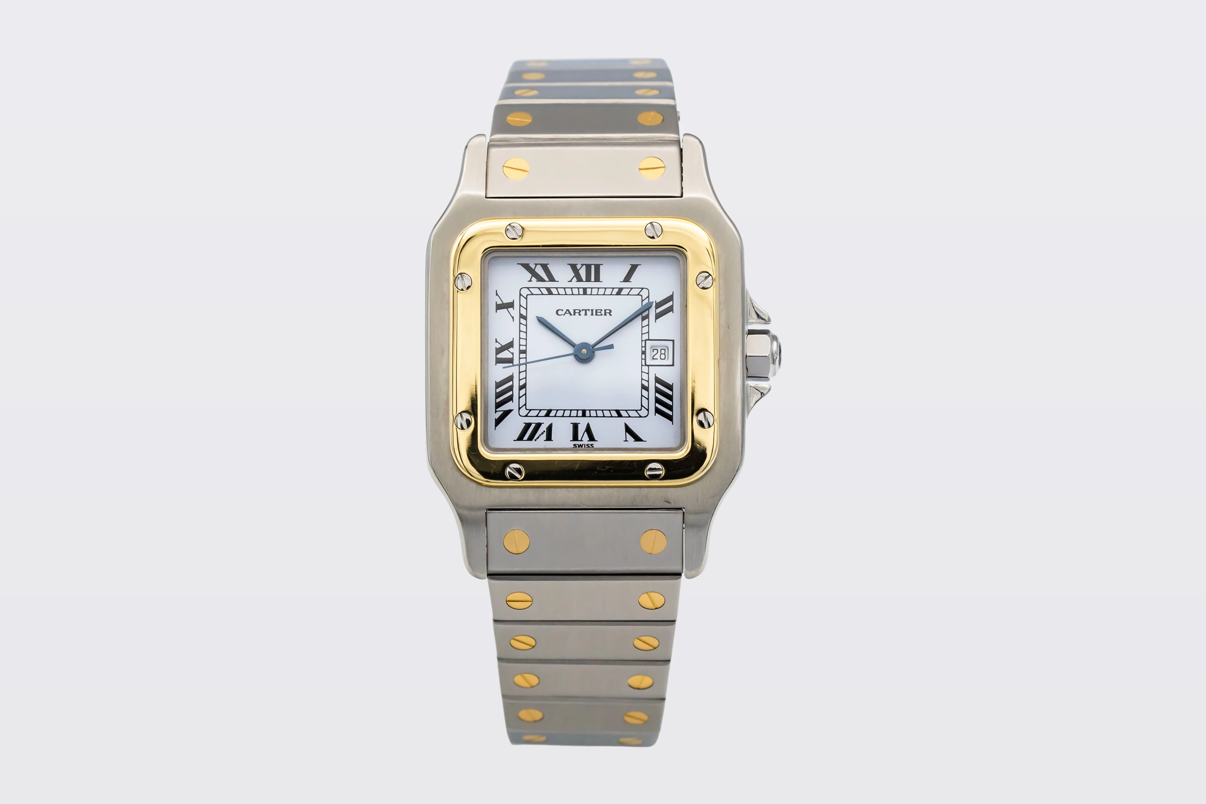 This circa 1990s Cartier Santos Carrée features a classic white dial features bold black Roman numerals, blued steel sword-shaped hands, and a discreet date aperture at 3 o’clock. Completing the design is the steel and 18ct yellow gold bracelet with exposed screws, offering a perfect blend of sporty refinement and Cartier’s timeless Parisian style.