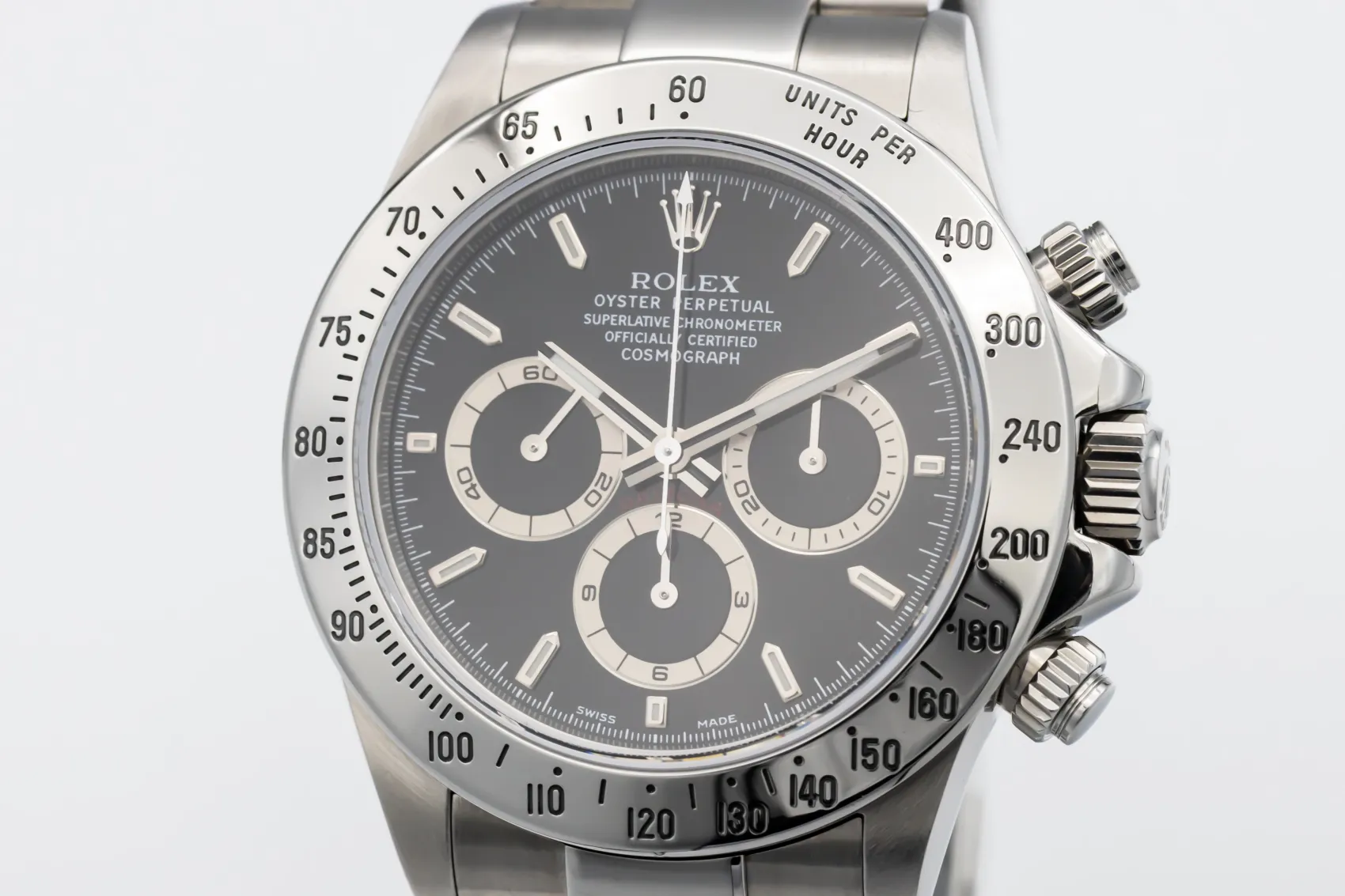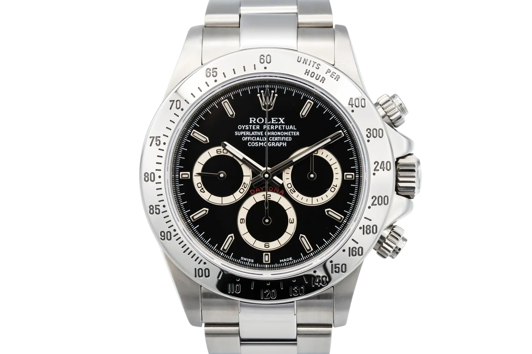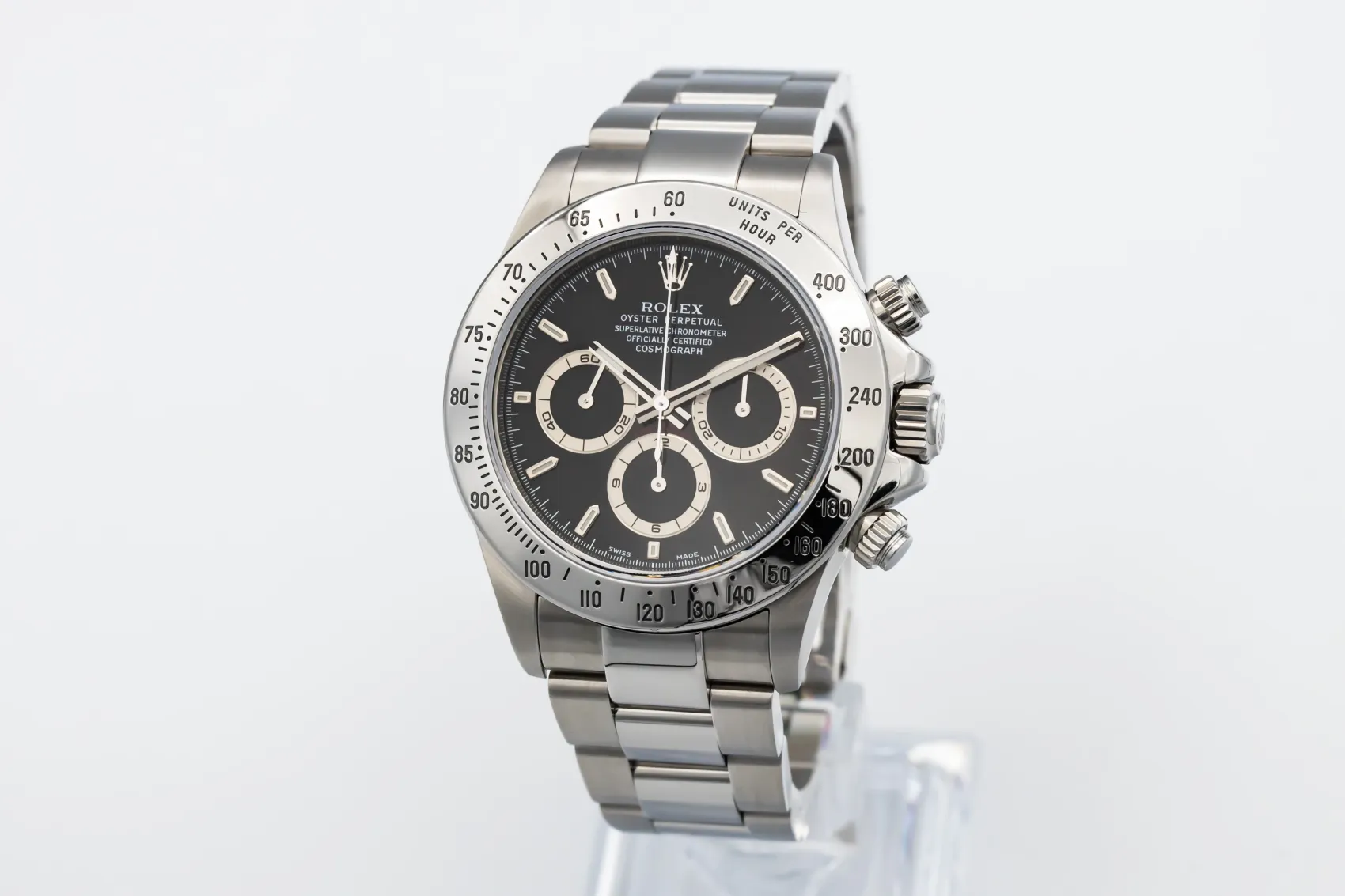 finance this from £381.95 p/m call the shop Read about our Limited Lifetime WarrantyThis 1999 Rolex Cosmograph Daytona 40mm features a crisp black dial that contrasts sharply with the luminous hour markers and polished steel hands. The three sub-dials offer 12-hour, 30-minute, and small-seconds chronograph functionality, combining utility and style. The watch is fitted with a sturdy stainless steel Oyster bracelet with a secure folding clasp, giving it a sporty yet refined presence on the wrist.