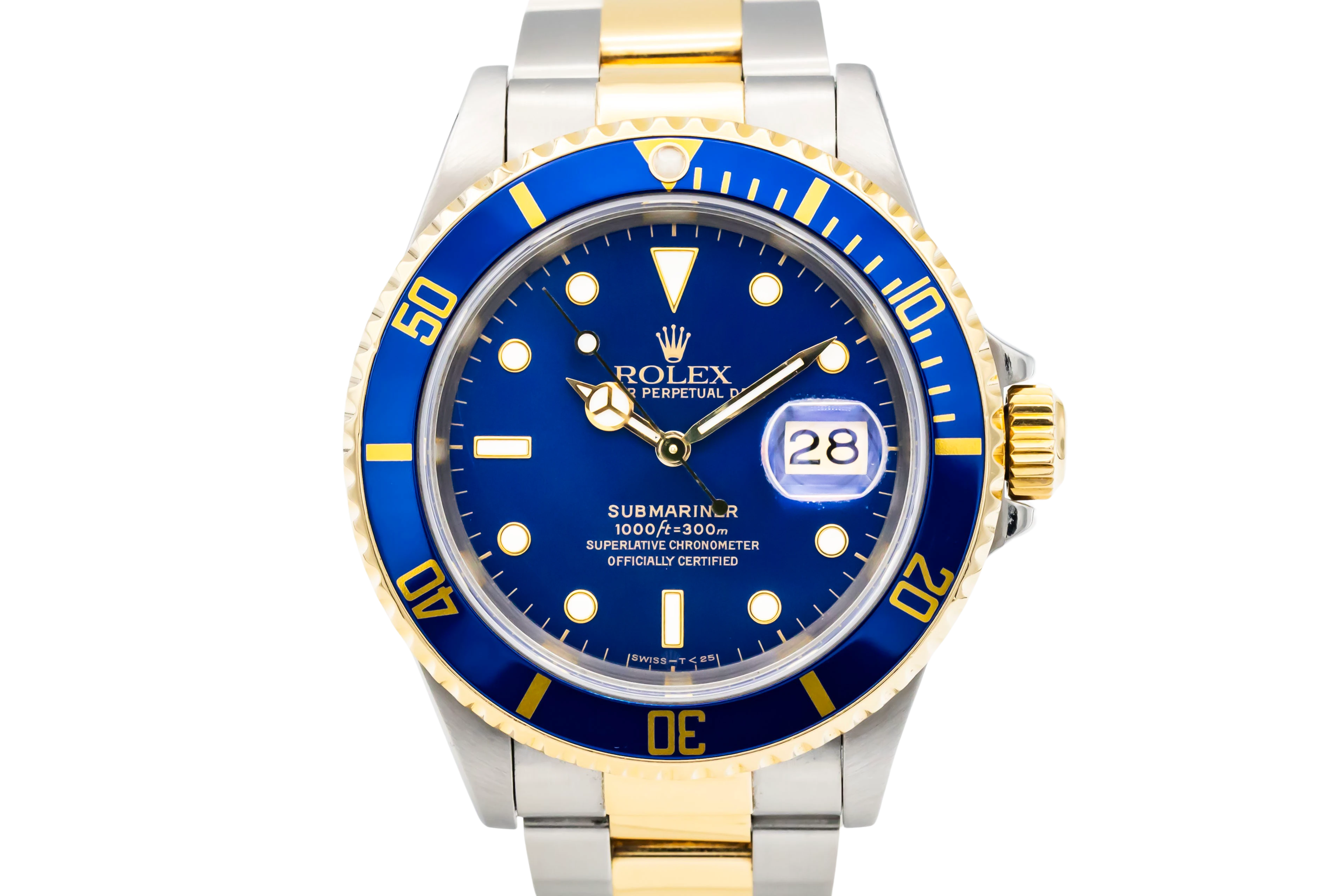 This 1995 Rolex Submariner Date 40mm features a deep blue sunburst dial with luminous round and baton hour markers. Paired with the classic Oyster bracelet in steel and yellow gold with a diver’s extension clasp, this reference exudes sporty elegance and unmistakable Rolex character.
