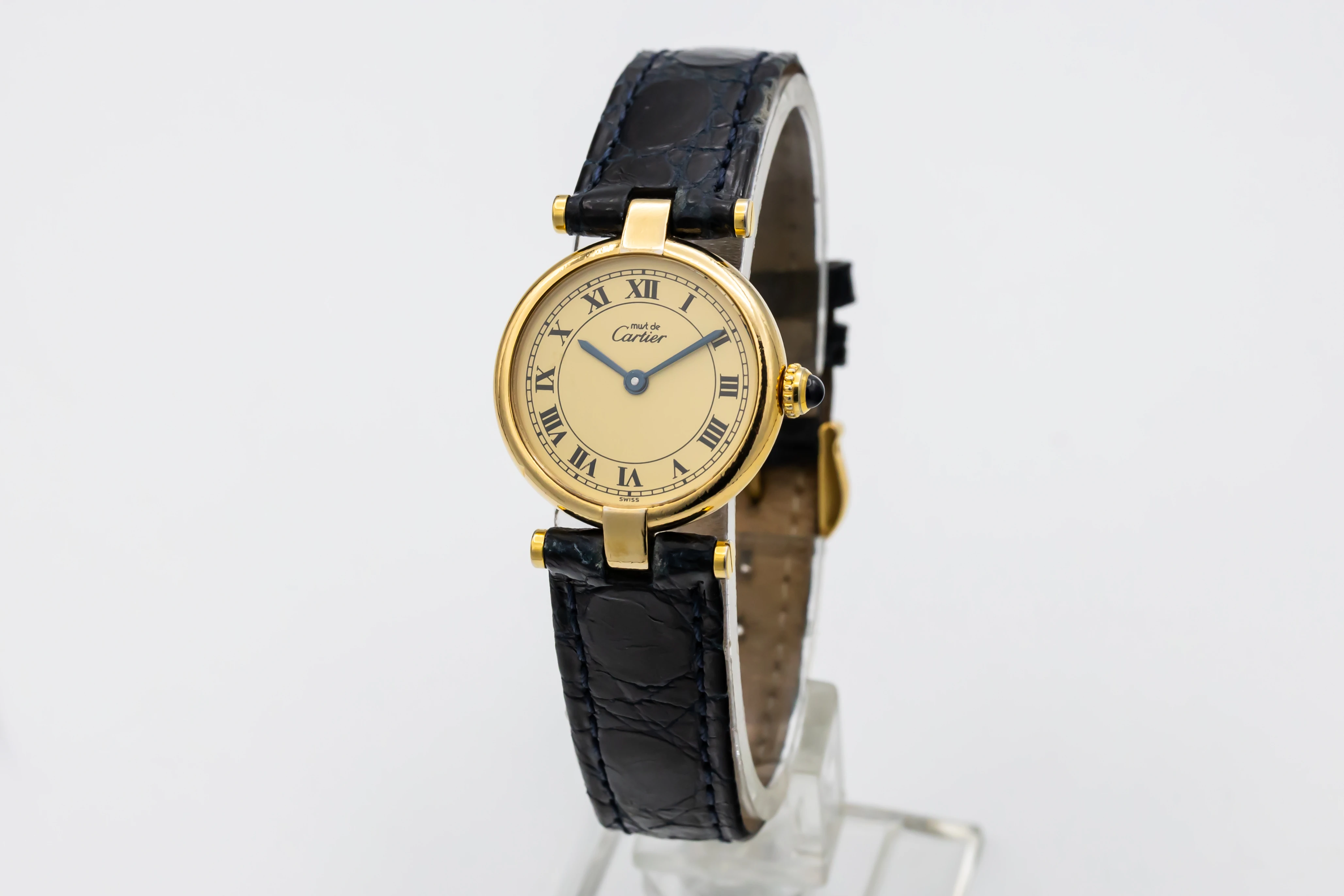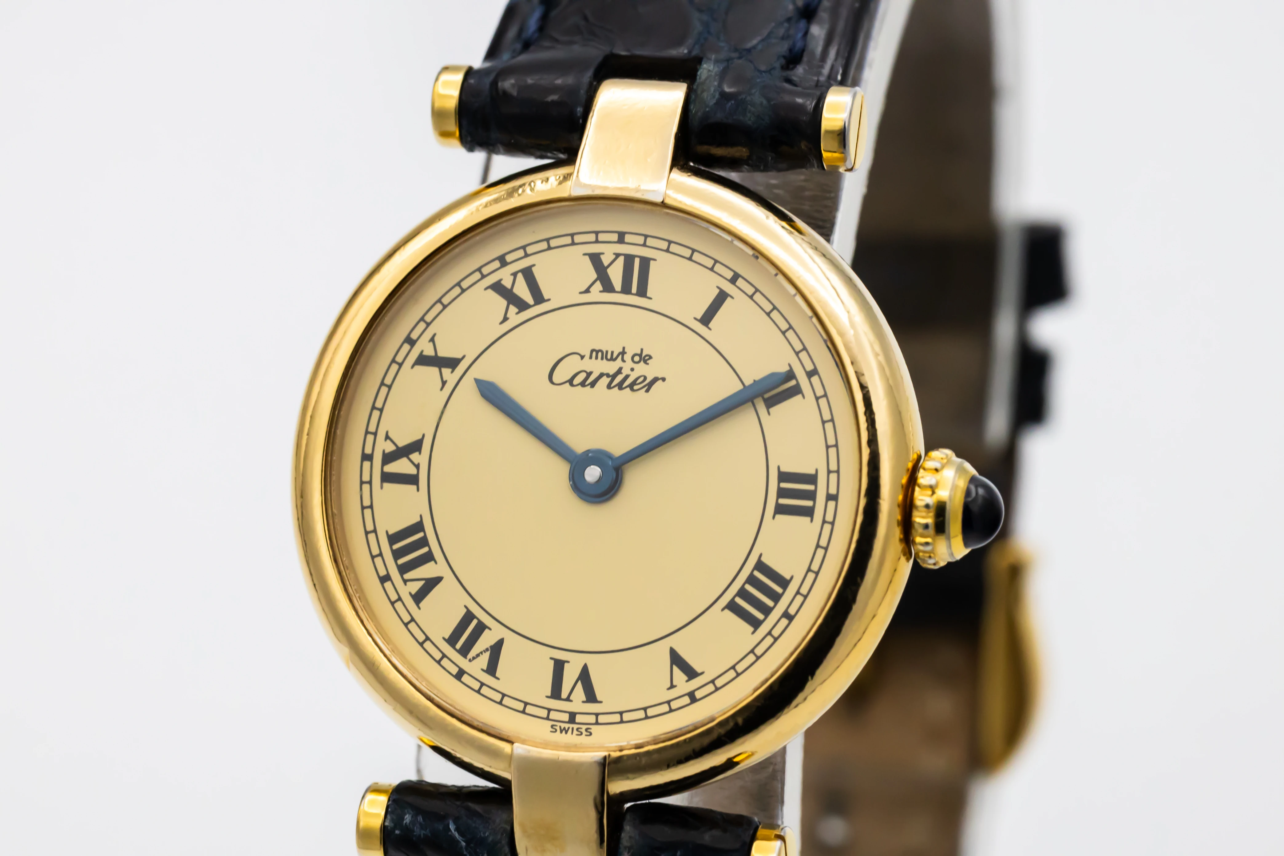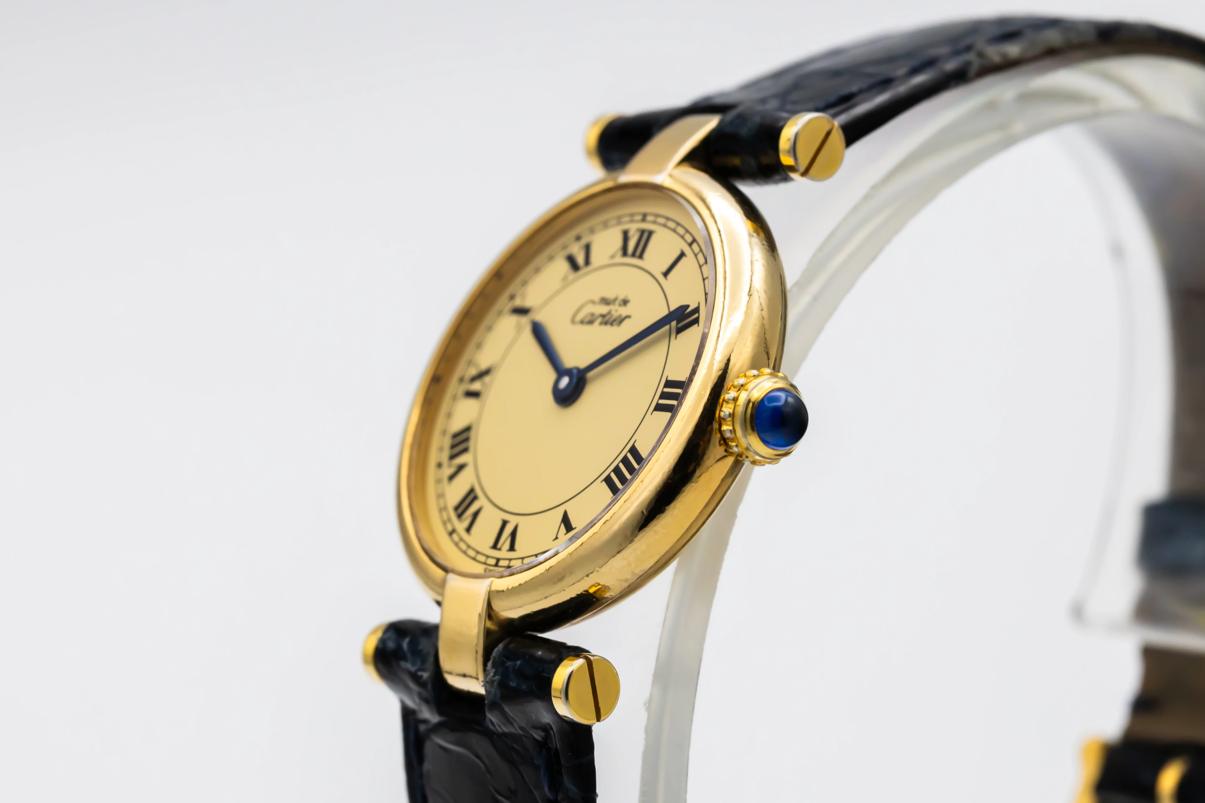 This circa 1990s Cartier Must Vendôme features a minimalist champagne dial is adorned with classic black Roman numerals, blued sword-style hands, and a subtle inner minute track. A cabochon-set crown adds a refined Cartier touch, while the watch is paired with a sleek black leather strap that complements its slim, understated profile—perfect for refined daily wear or formal styling.