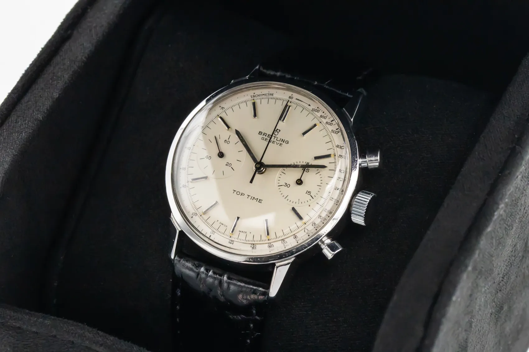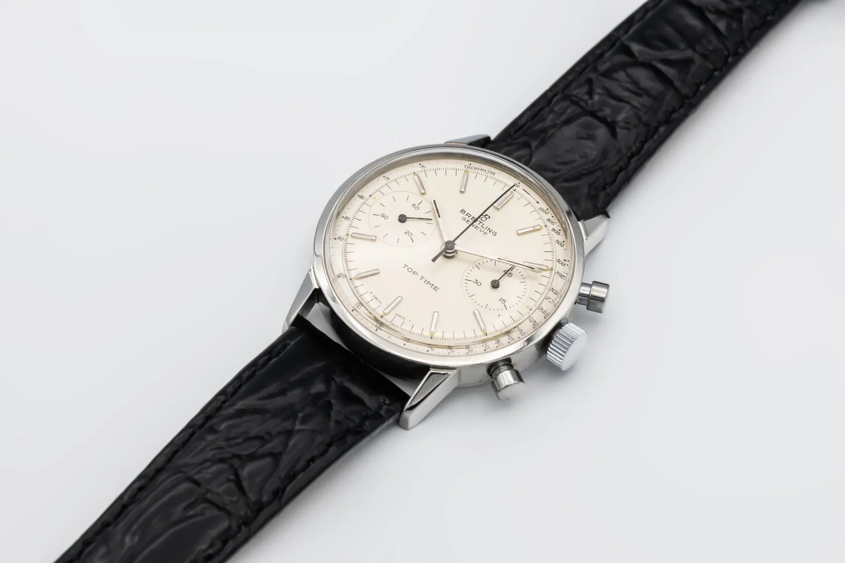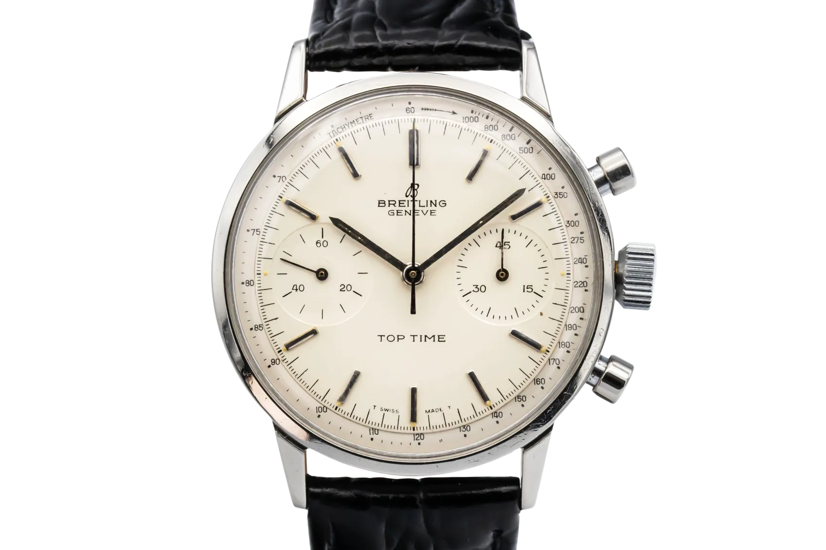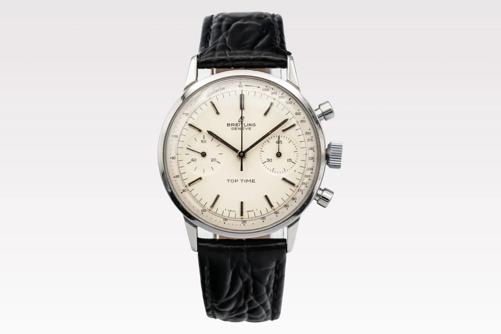 Introduced in the early 1960s, the Breitling Top Time collection was created as a youthful, sporty chronograph line that appealed to a new generation of watch enthusiasts. Known for its bold designs, innovative dial layouts, and reliable chronograph performance, the Top Time quickly became an icon of mid-century watchmaking.