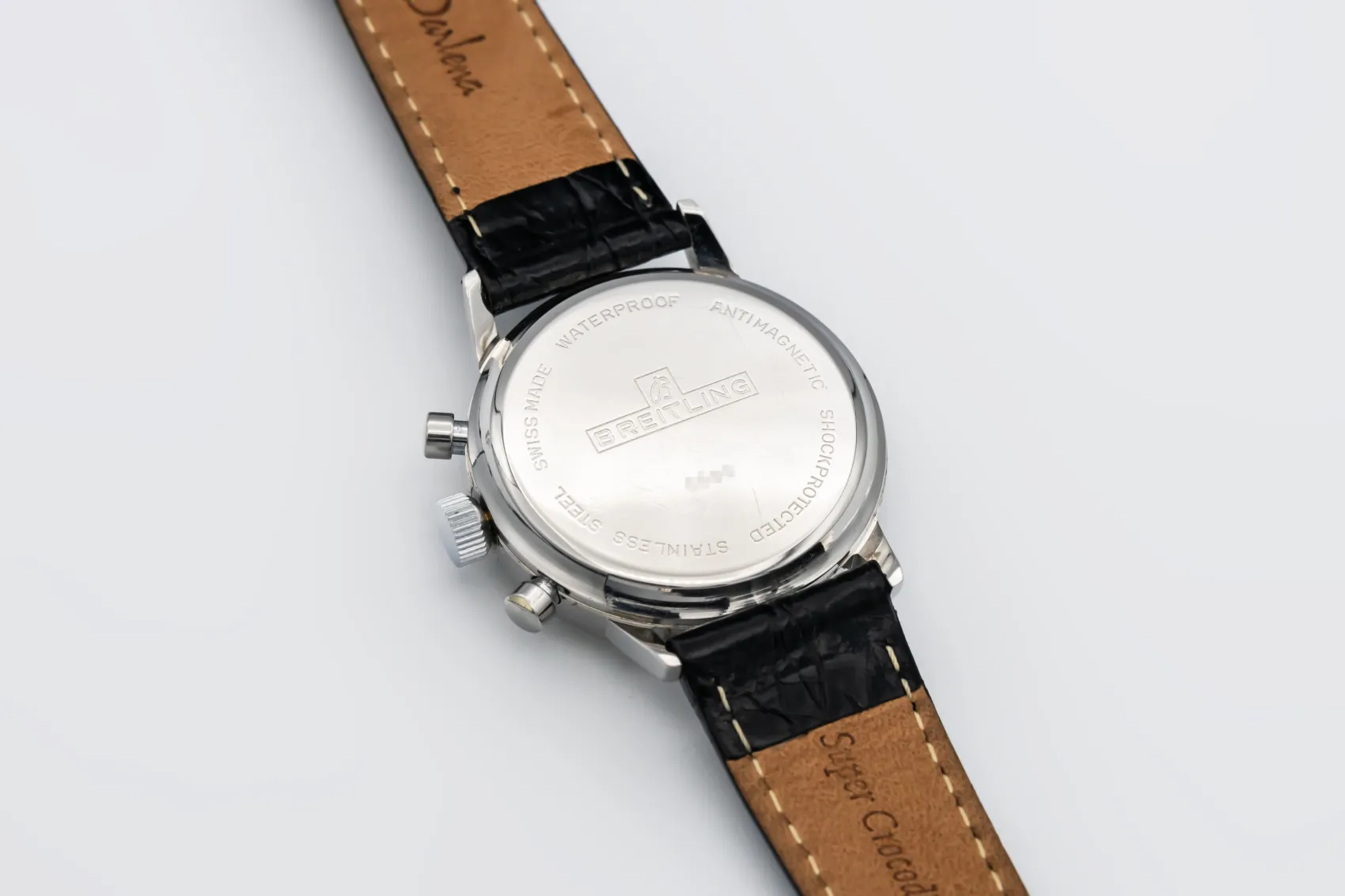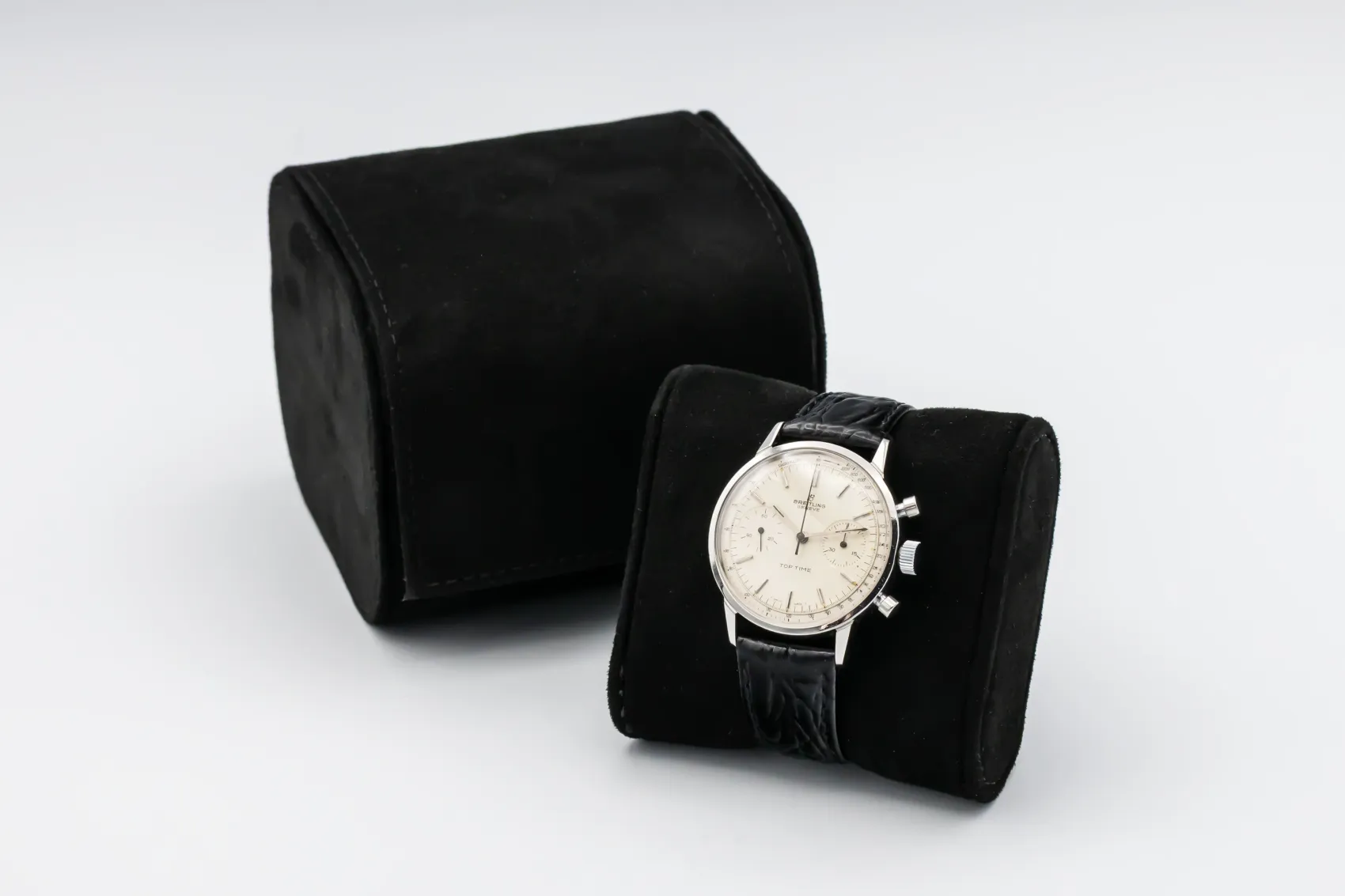 finance this from £66.26 p/m call the shop Read about our Limited Lifetime WarrantyThis circa 1960s Breitling Top Time 36mm features a classic stainless steel case with clean vintage proportions and a smooth polished bezel, paired with a black leather strap for an elegant period-correct look. The dial presents the distinctive 1960s Top Time aesthetic, typically characterised by balanced sub-dials, slim baton markers, and a crisp, understated layout.