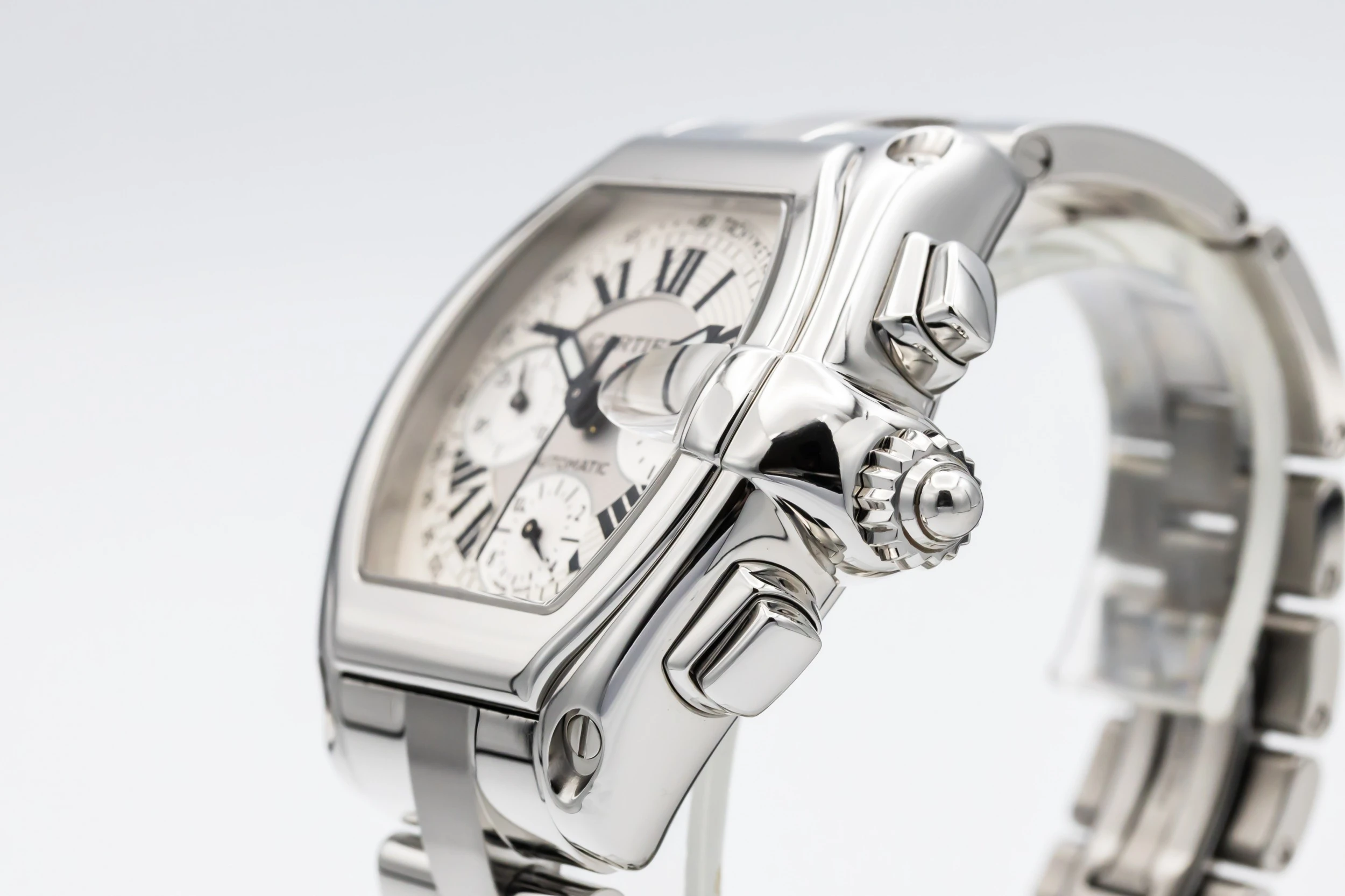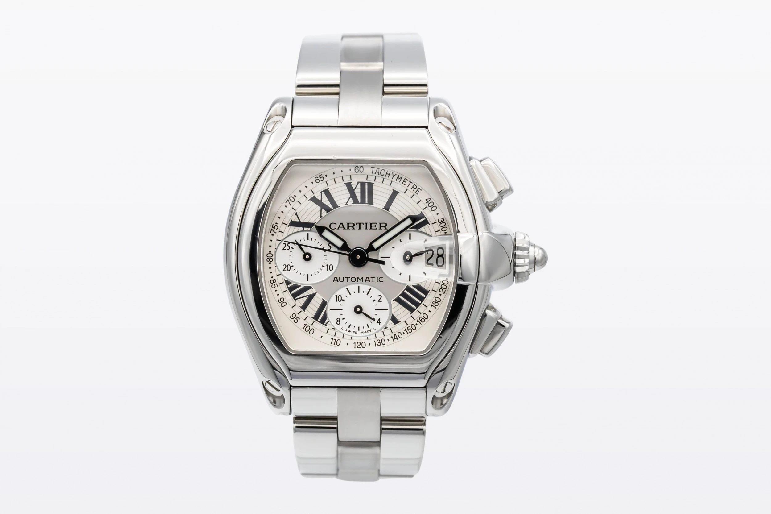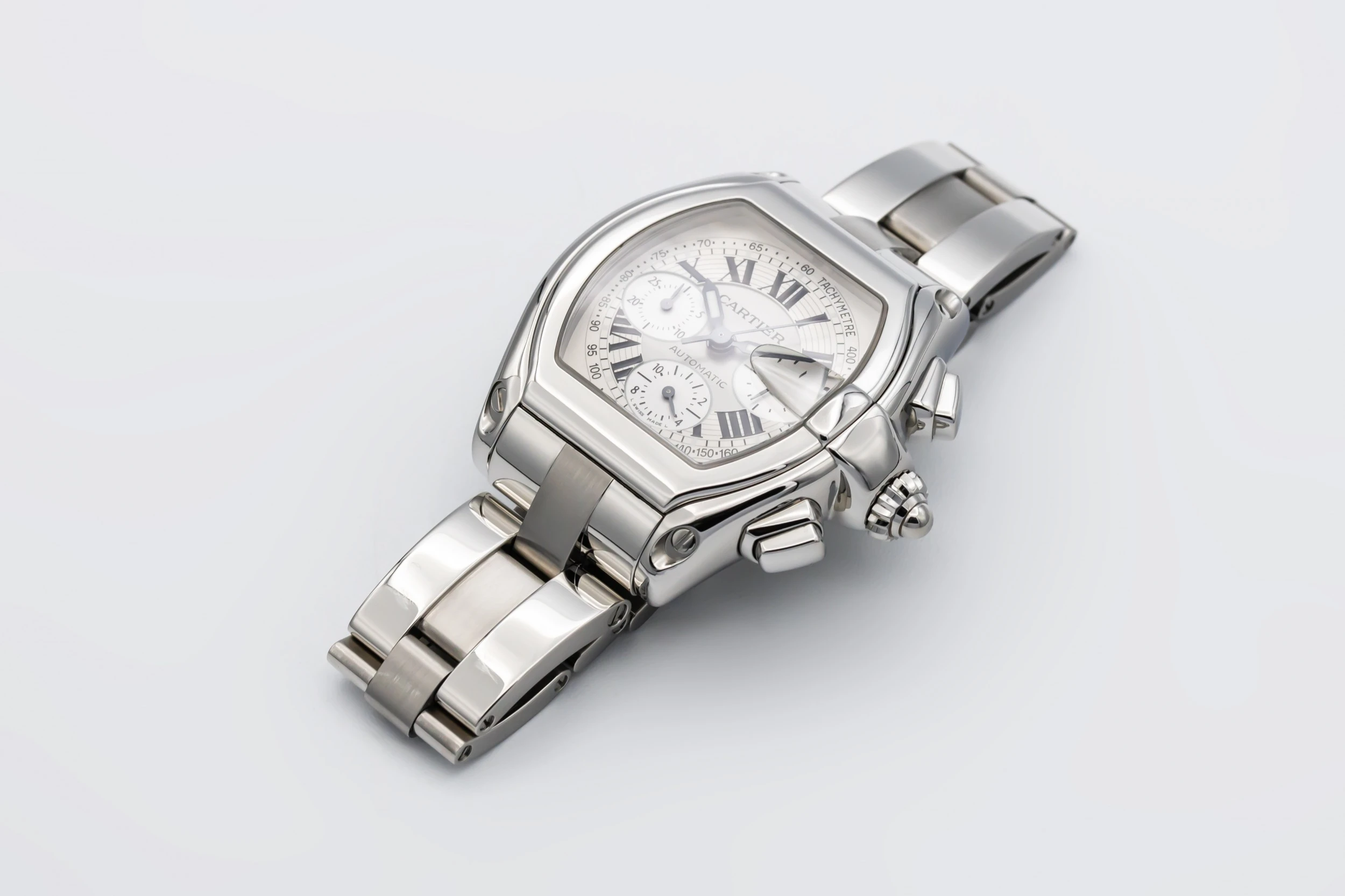 This 2003 Cartier Roadster Chronograph XL 40mm features a tonneau-shaped stainless steel case with a smooth polished bezel and silver sunburst dial adorned with contrasting black Roman numerals. Three chronograph sub-dials, a tachymeter scale, and a date window at 3 o’clock. The watch is presented on a matching stainless steel bracelet with a concealed folding clasp.