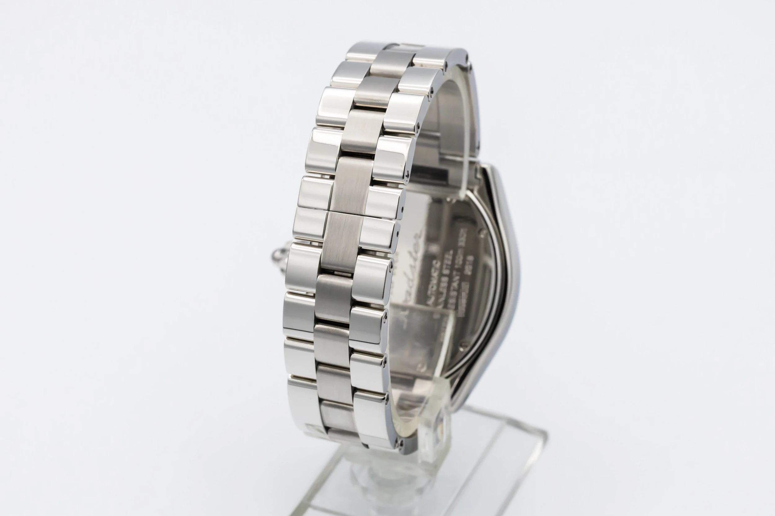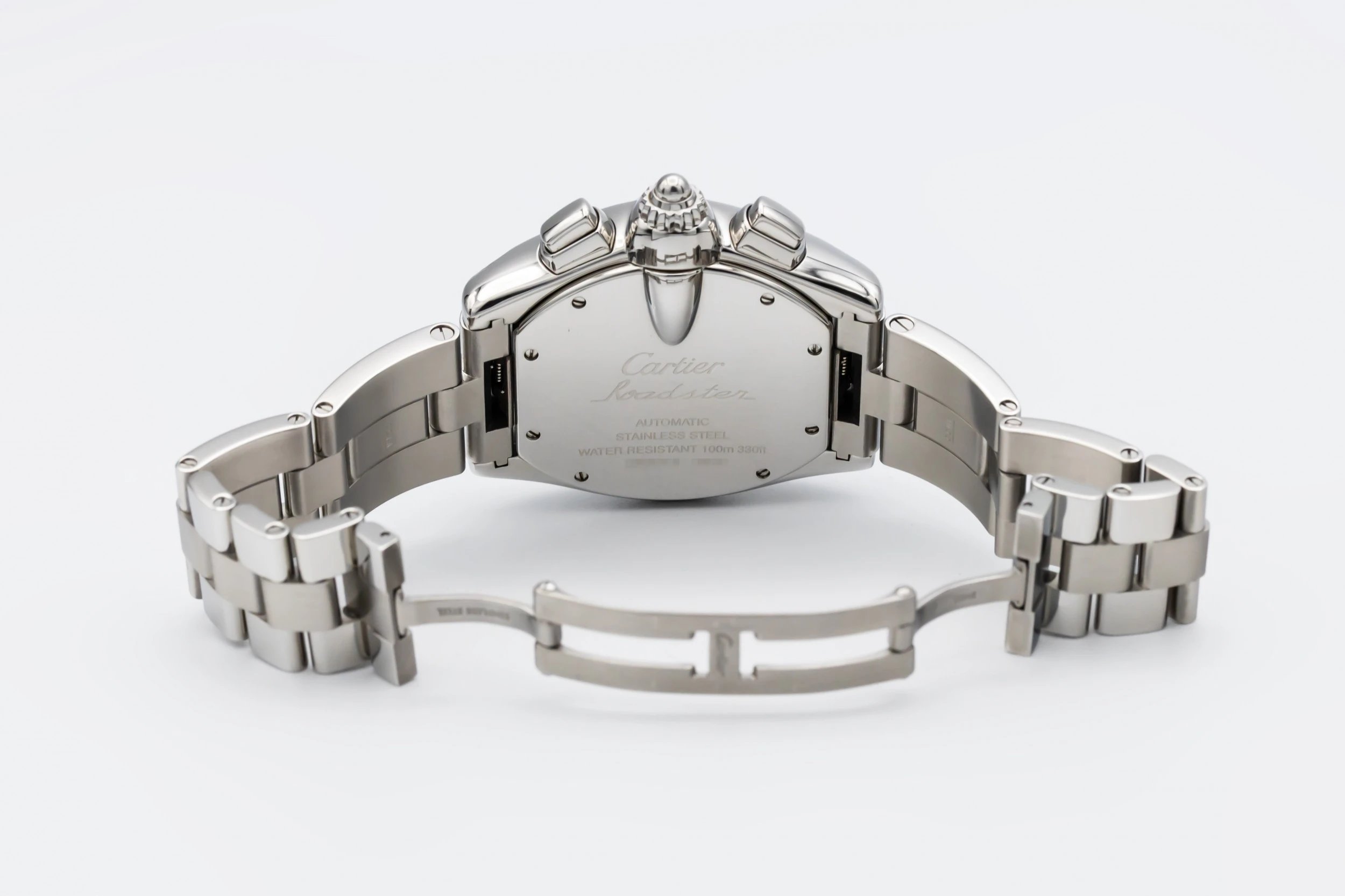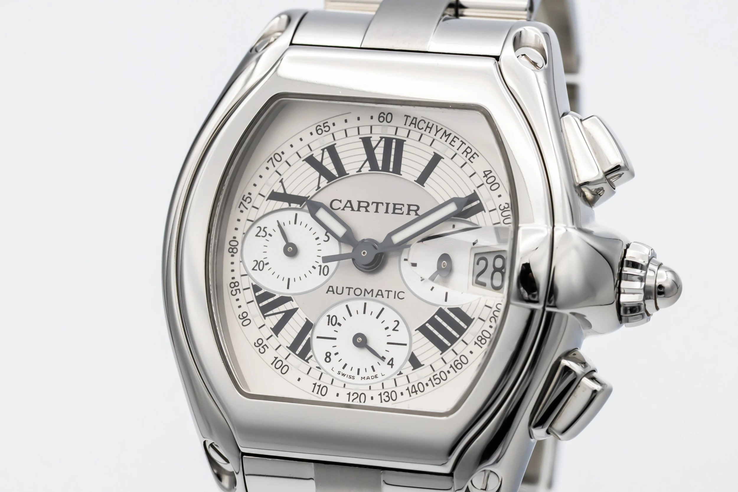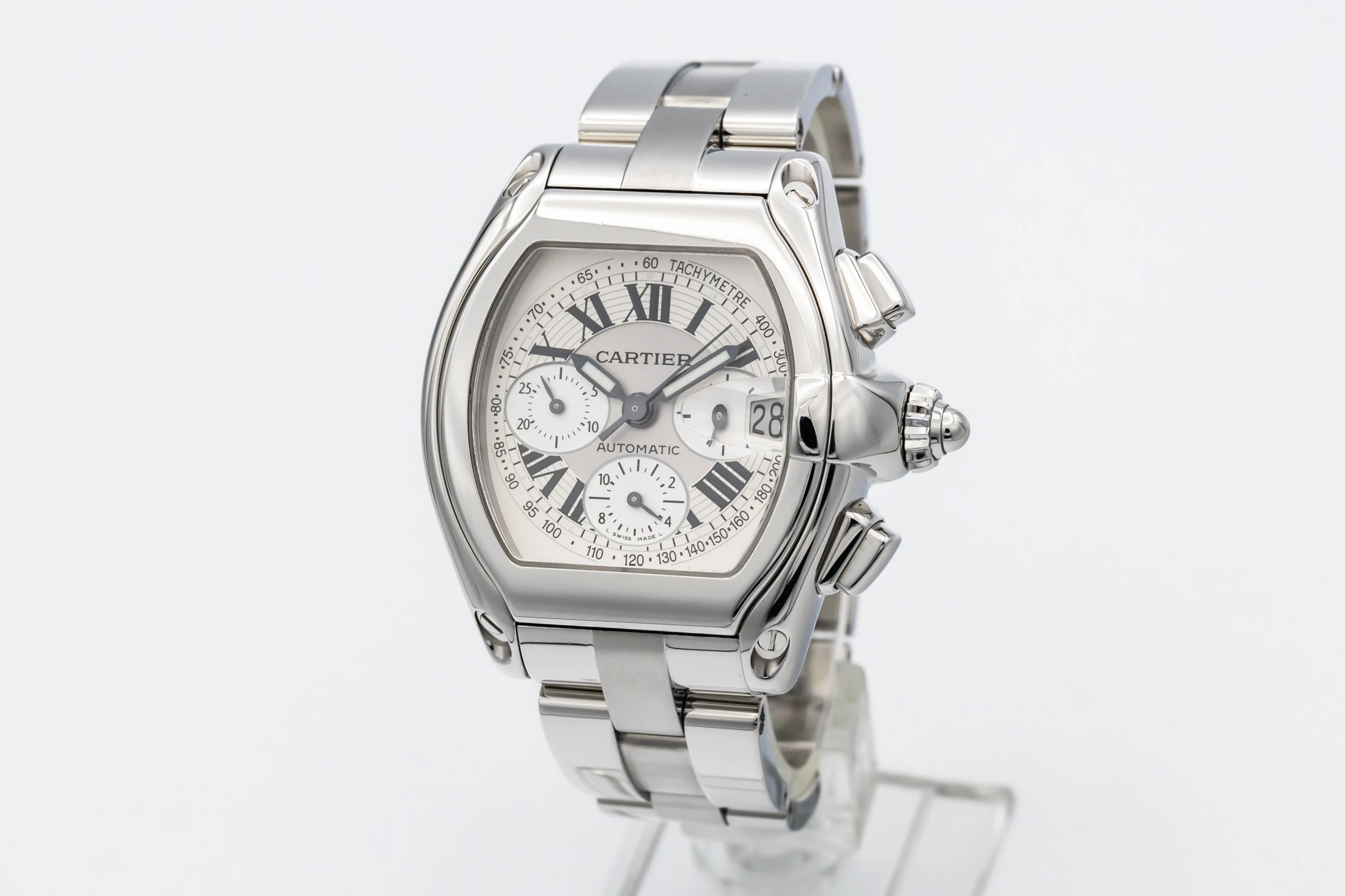 This 2003 Cartier Roadster Chronograph XL 40mm features a tonneau-shaped stainless steel case with a smooth polished bezel and silver sunburst dial adorned with contrasting black Roman numerals. Three chronograph sub-dials, a tachymeter scale, and a date window at 3 o’clock. The watch is presented on a matching stainless steel bracelet with a concealed folding clasp.