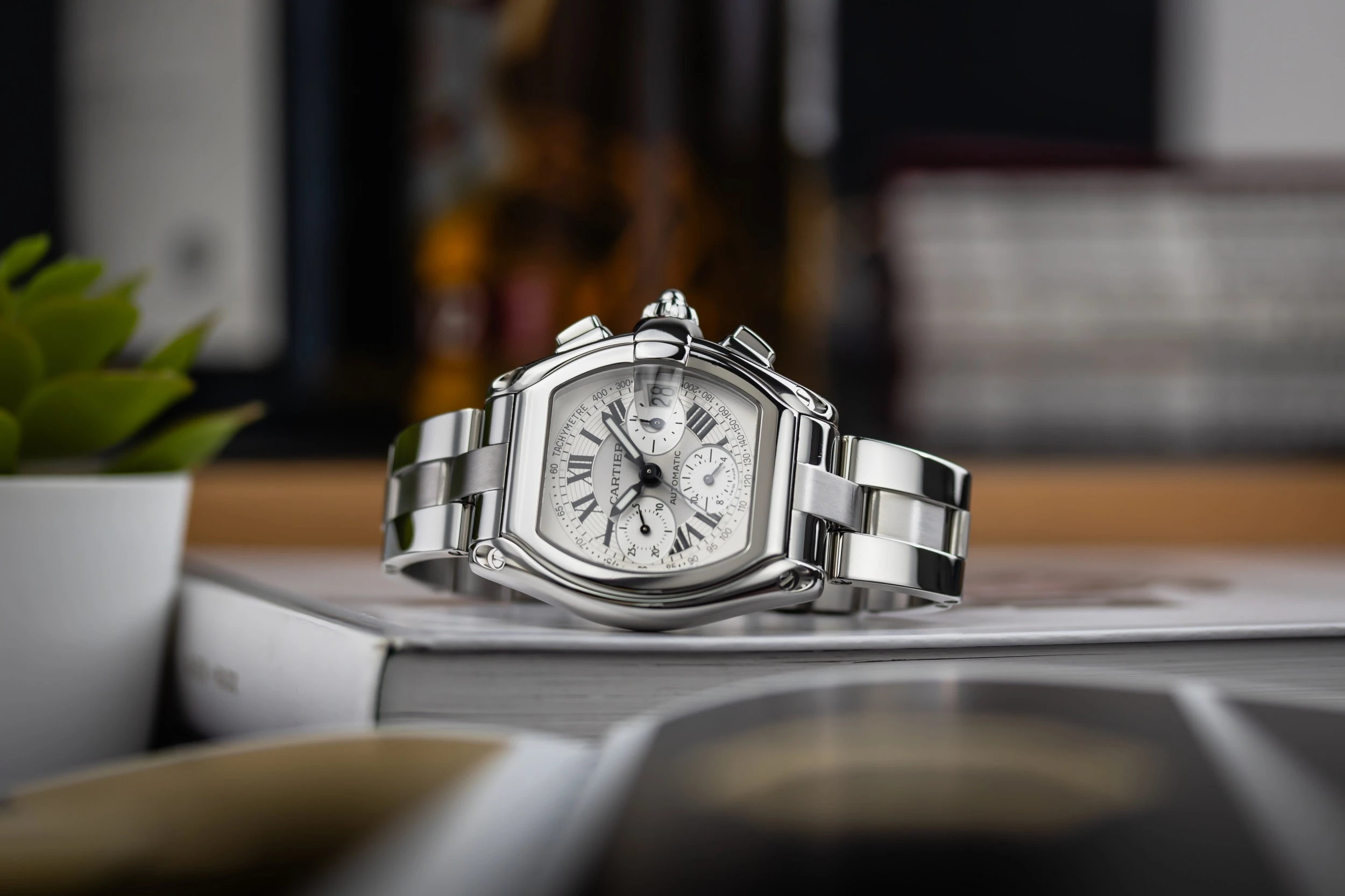 First introduced in the early 2000s as part of Cartier’s Roadster line—which drew automotive-inspired styling from classic roadsters of the 1950s and 60s—the Chronograph XL offers a bold alternative to dressier Cartier models.