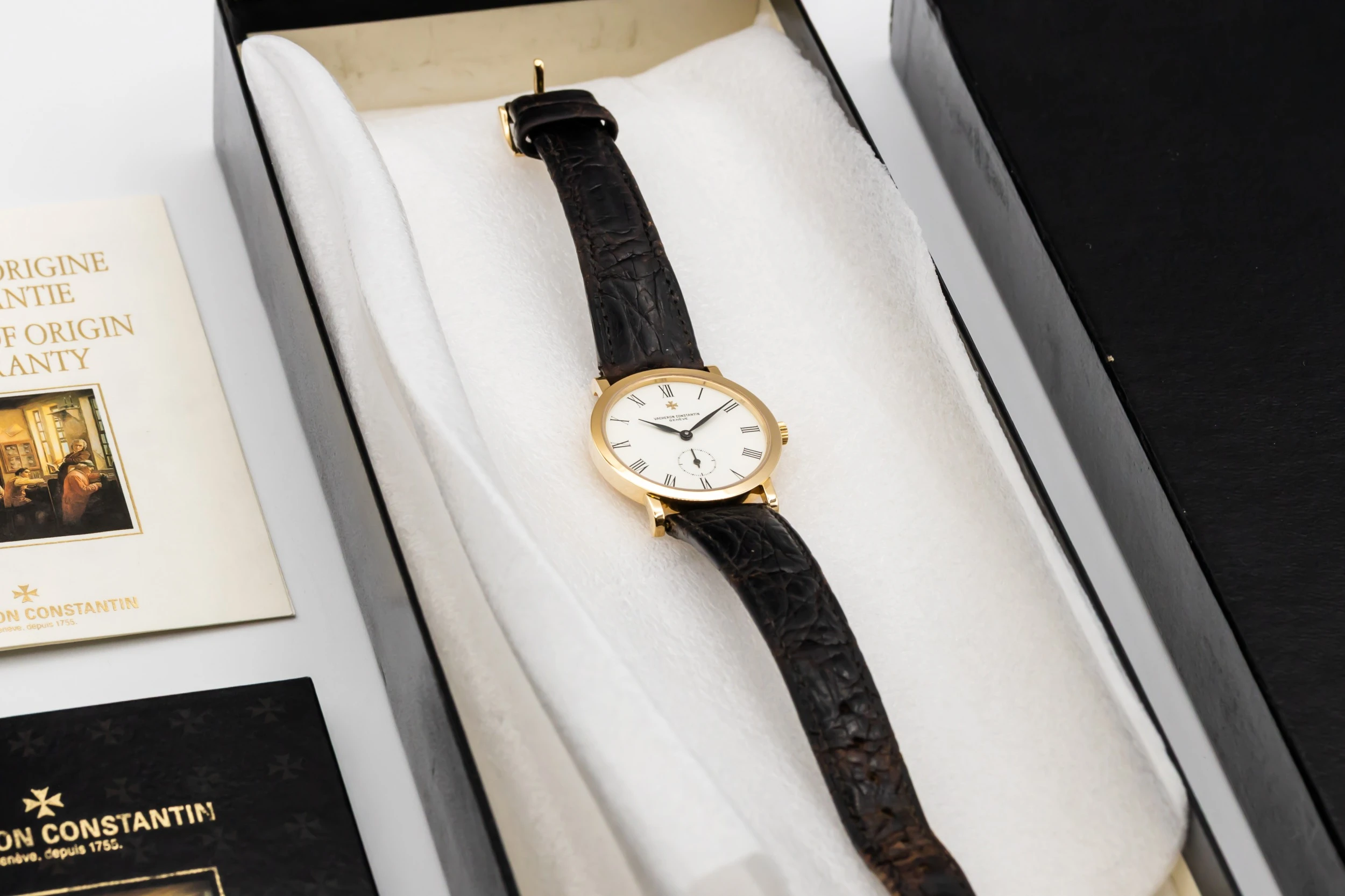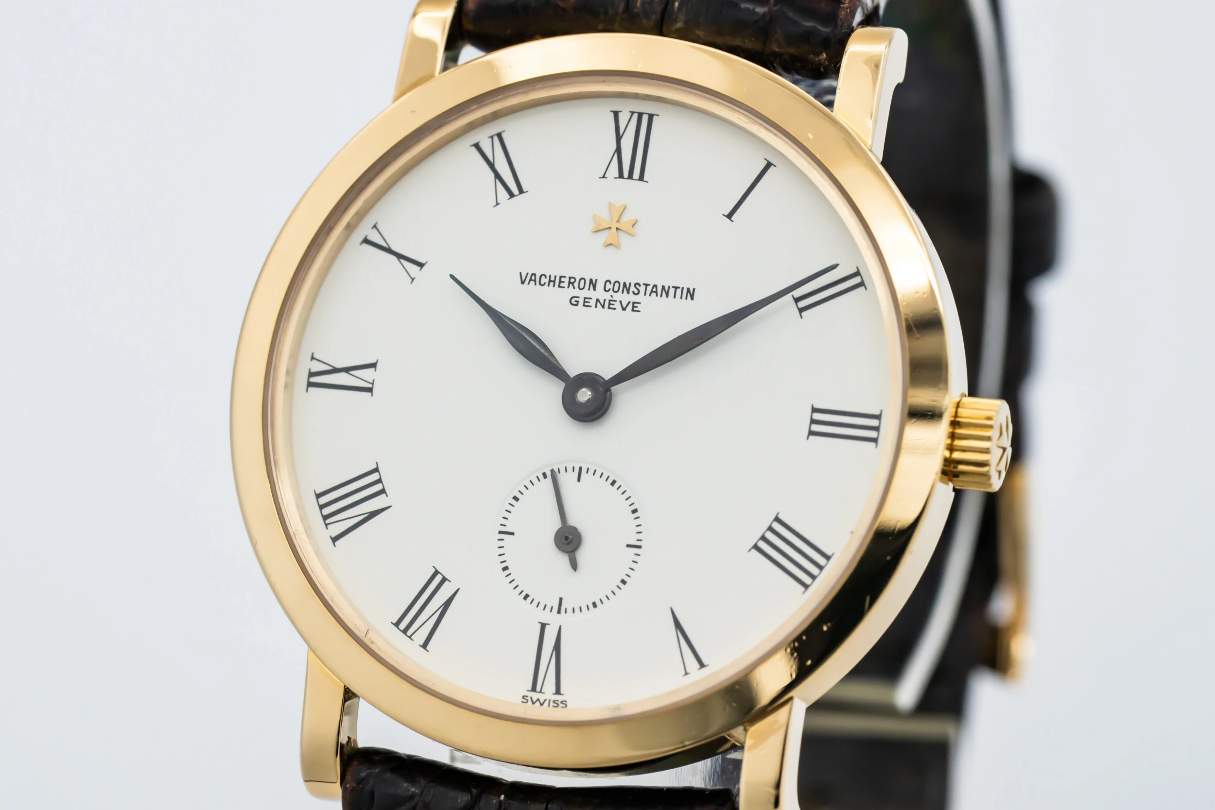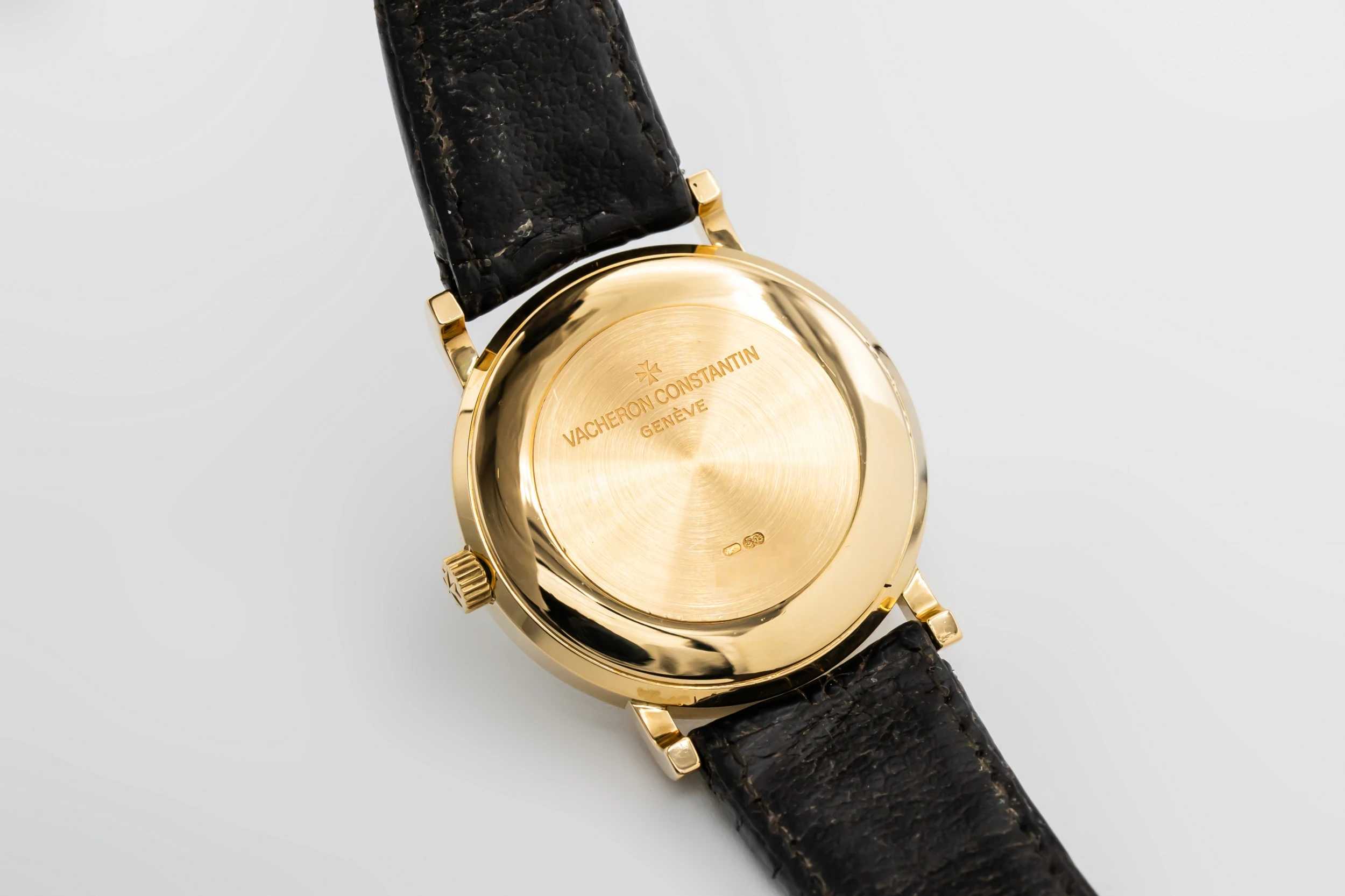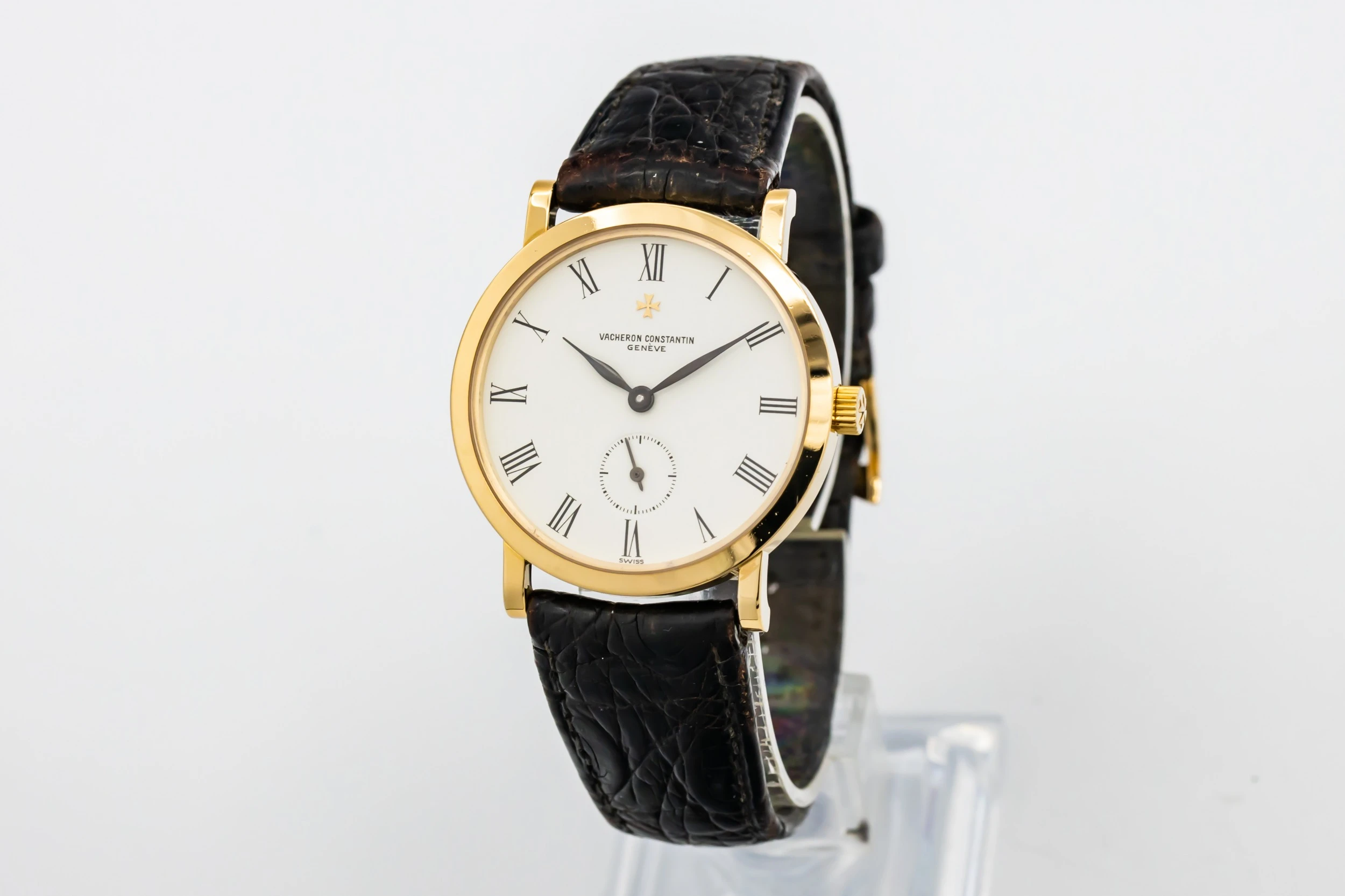 This 1993 Vacheron Constantin Patrimony Essential 32.5mm features a white dial with roman numerals and a black leather bracelet. It also features a 18ct yellow gold bezel.