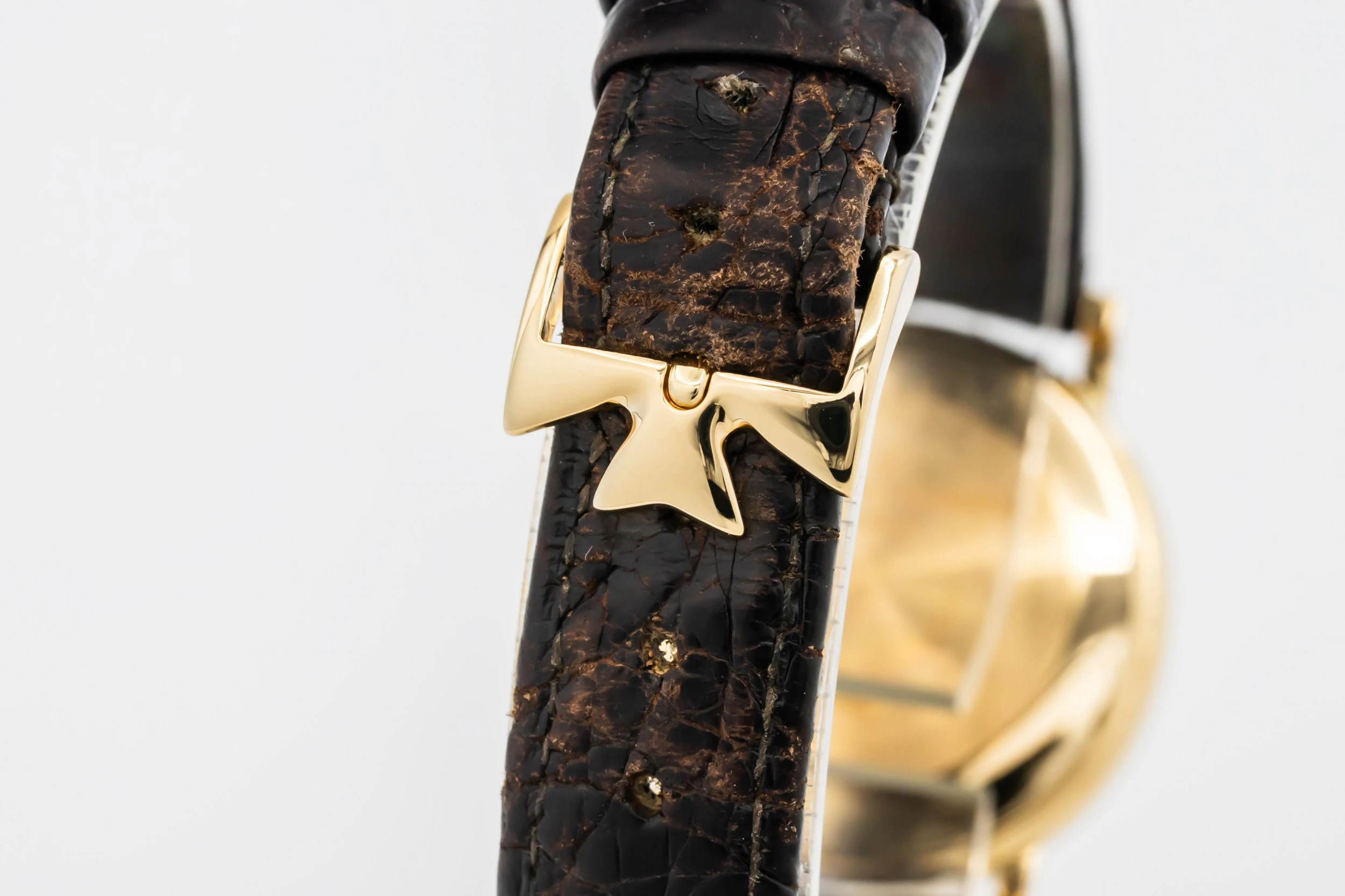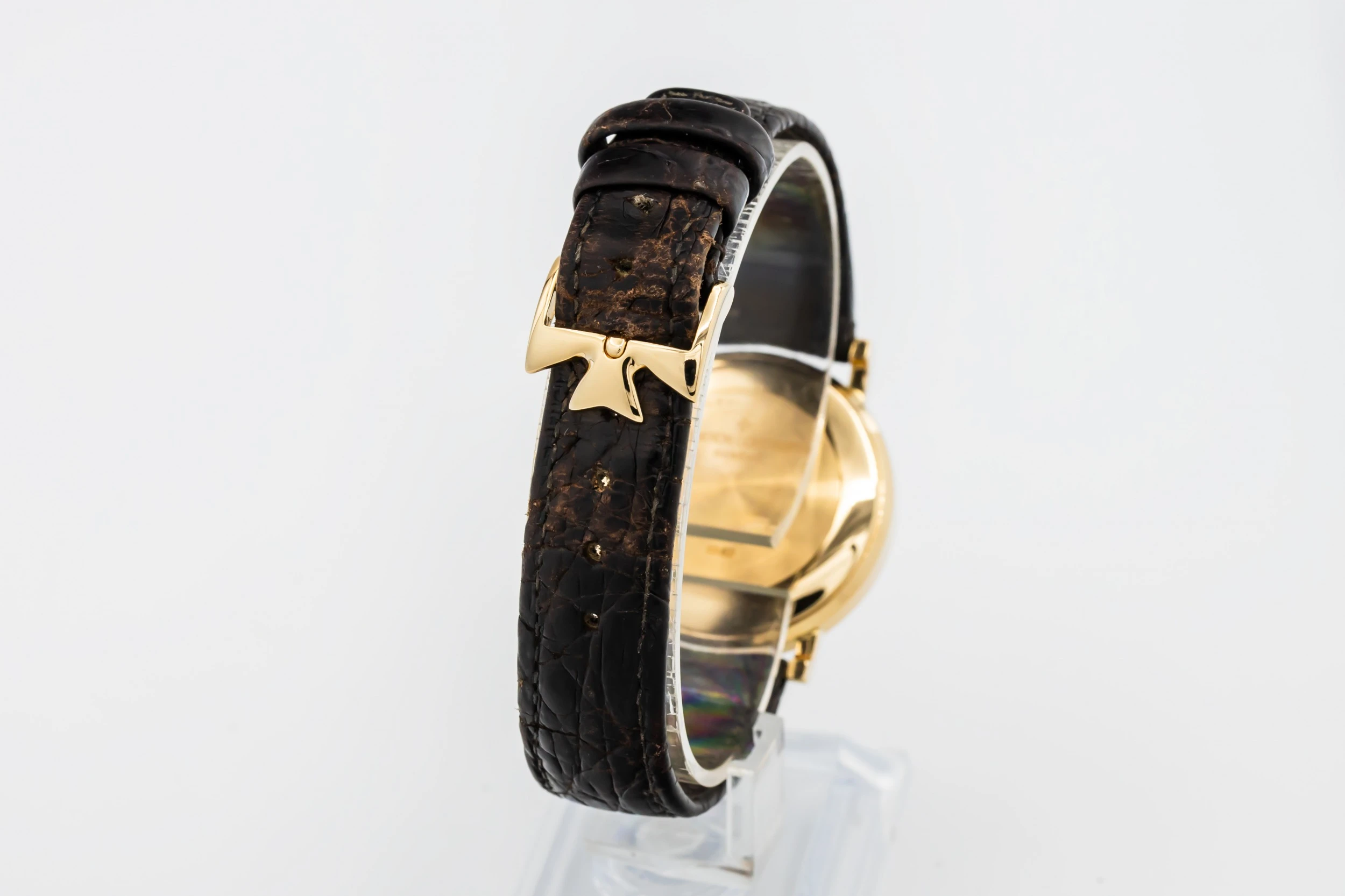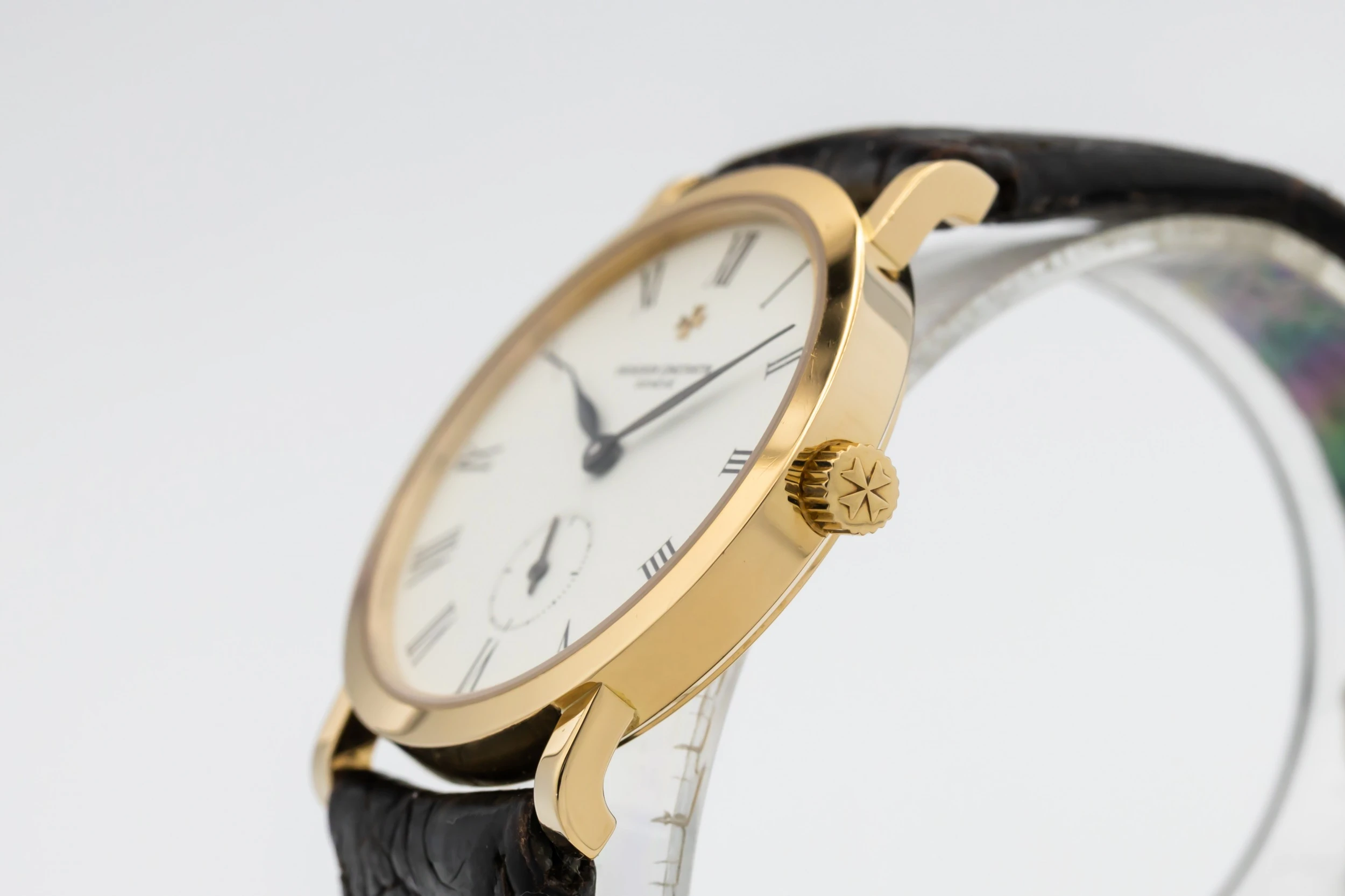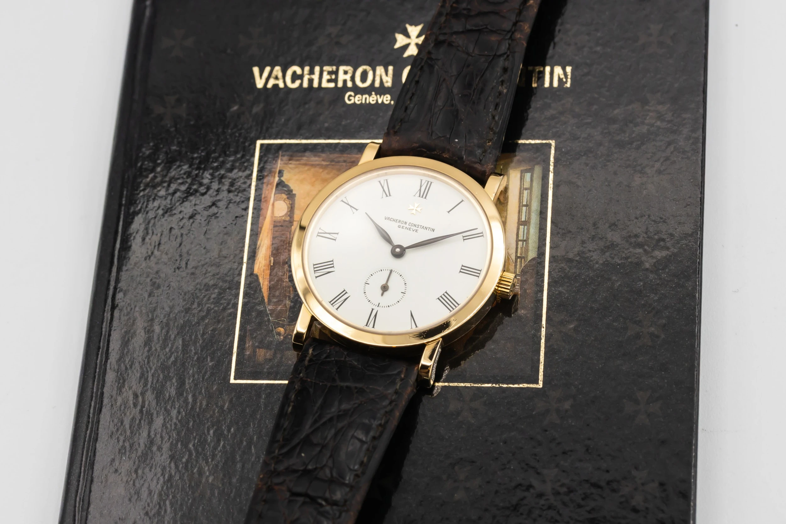 This 1993 Vacheron Constantin Patrimony Essential 32.5mm features a white dial with roman numerals and a black leather bracelet. It also features a 18ct yellow gold bezel.