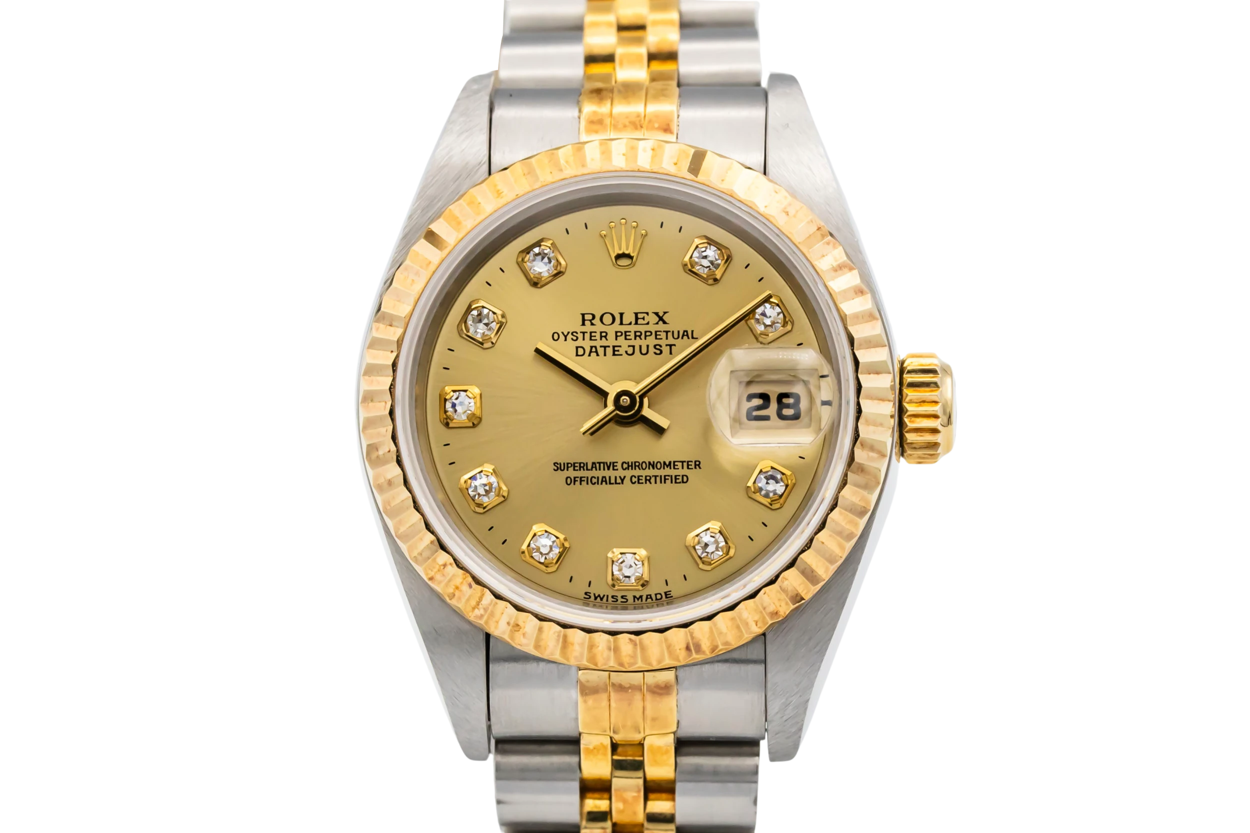 This 1994 Rolex Lady DateJust 26mm features a stainless steel case paired with an 18ct yellow-gold fluted bezel, delivering a timeless and elegant two-tone design. The champagne dial with factory diamond markers offers refined readability, while the iconic Jubilee bracelet enhances comfort and style.