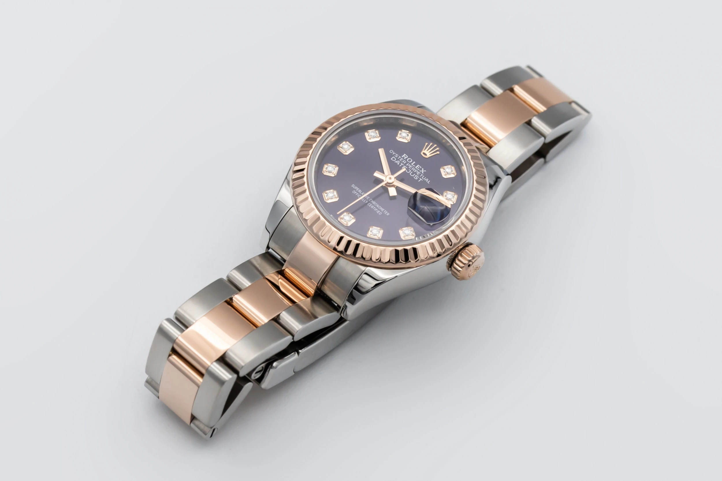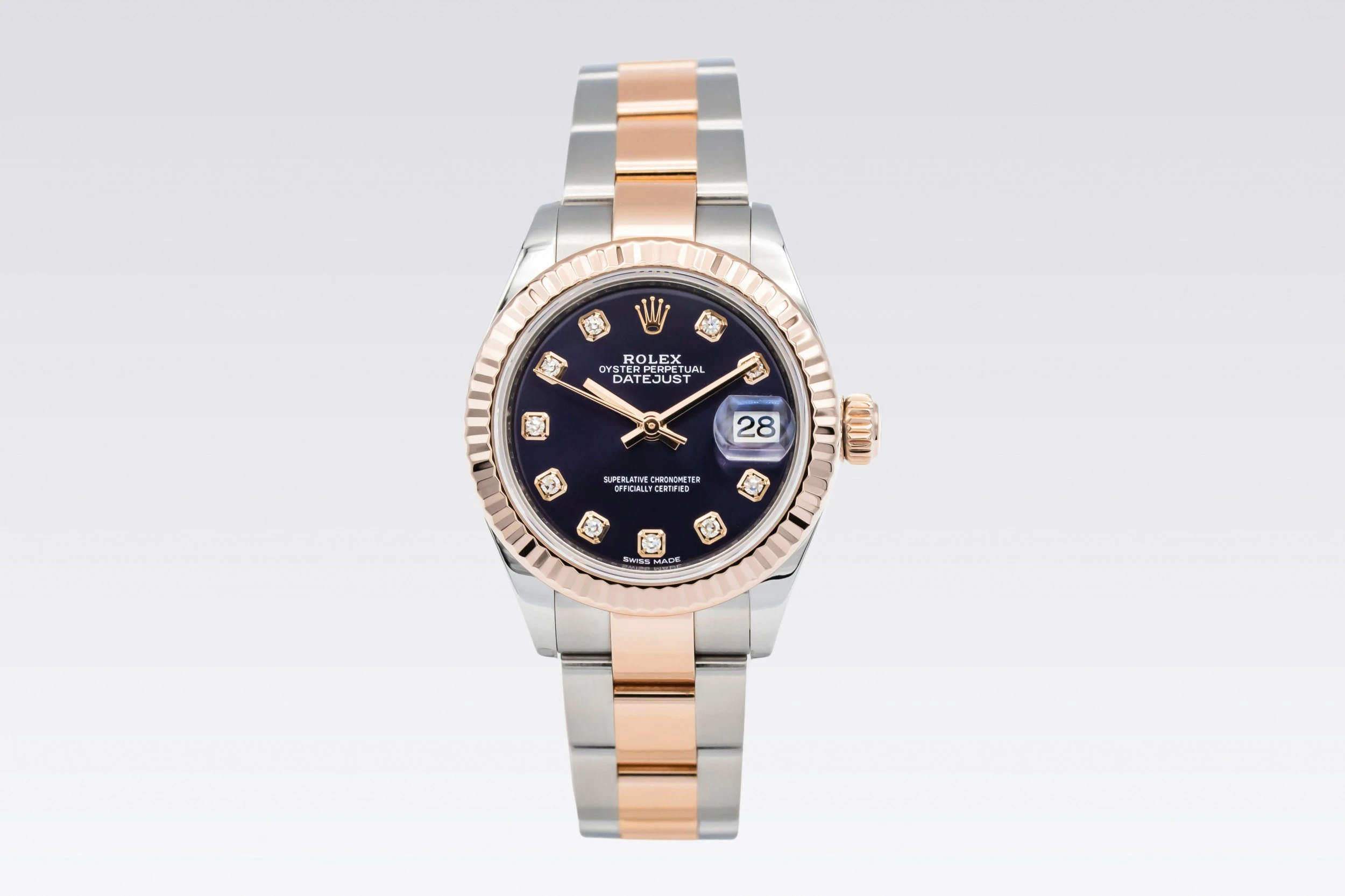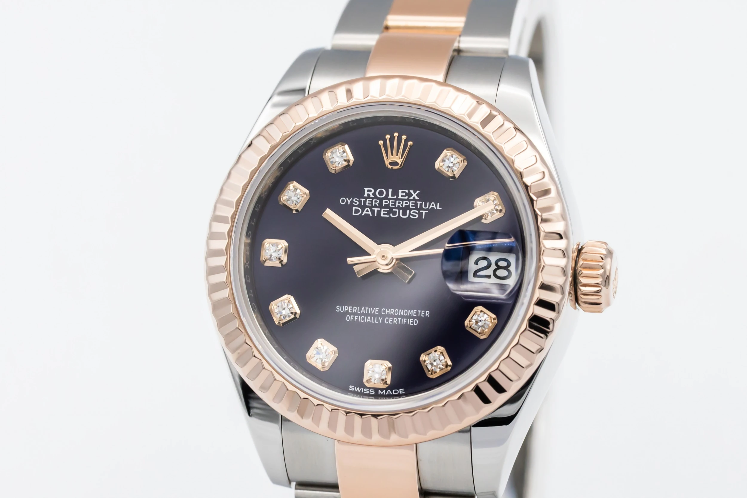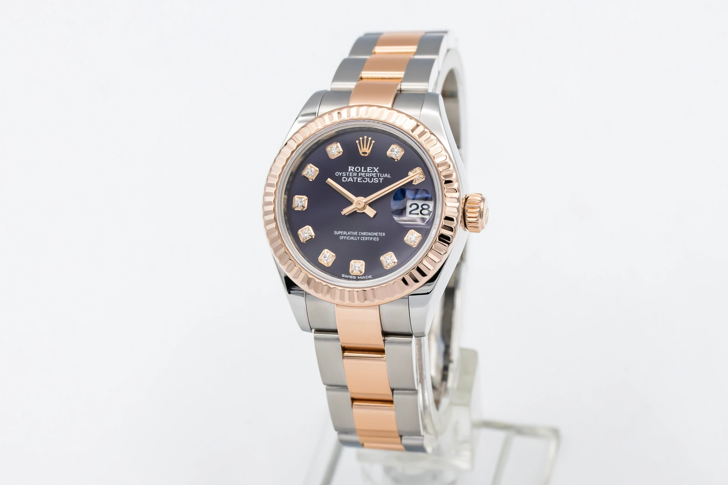 This 2019 Rolex Lady DateJust 28mm features a rich purple dial creating a bold yet refined contrast, adorned with brilliant diamond hour markers that catch the light beautifully. A signature fluted Everose gold bezel and oyster bracelet delivers a perfect balance of durability and sophistication.