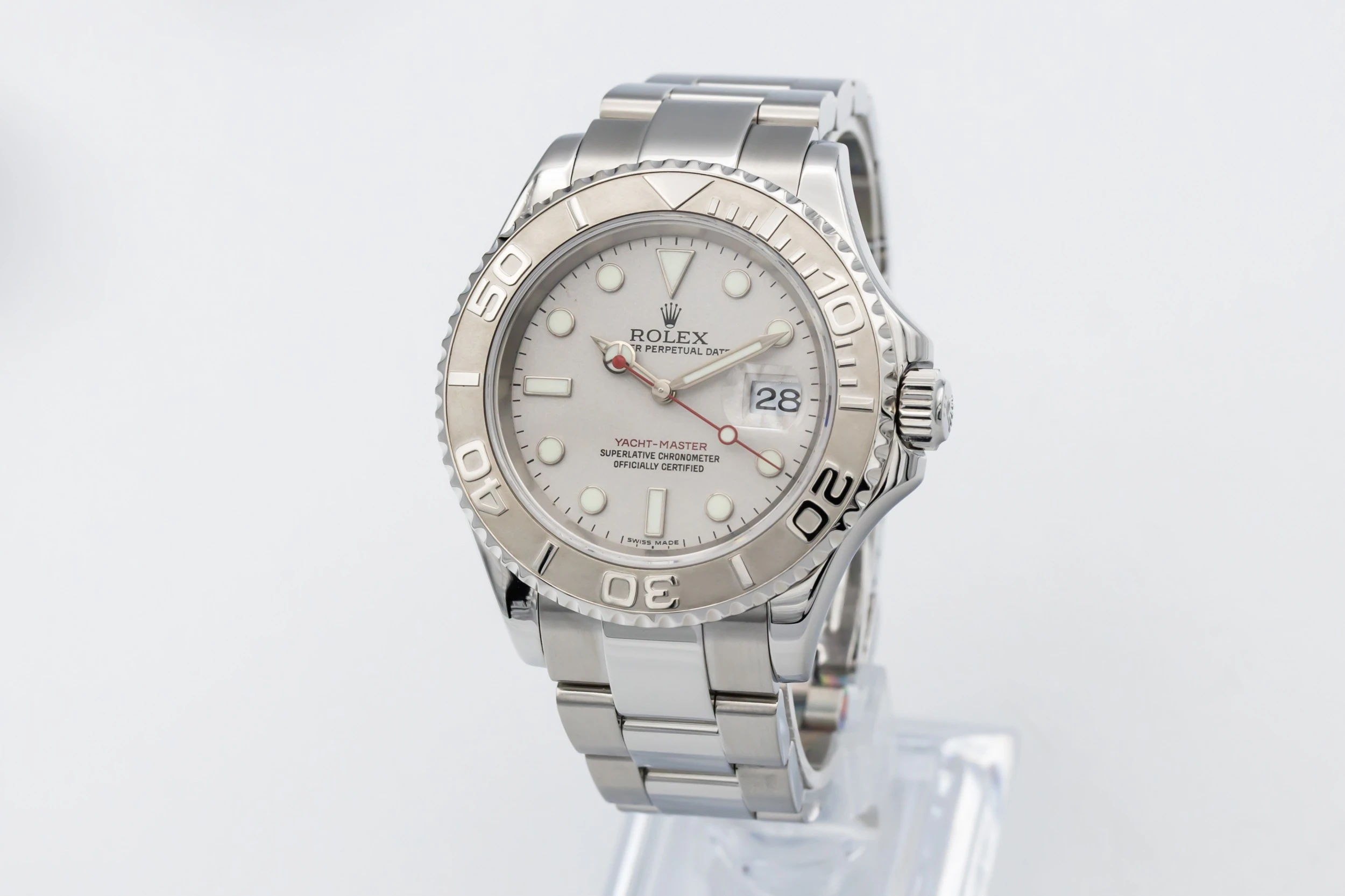 The 2006 Rolex Yacht-Master 40mm features a silver dial with luminous hour markers and Mercedes hands for excellent legibility, a date window at 3 o’clock with the iconic Cyclops magnifier, and Chromalight luminescence for visibility in low light. Fitted to the robust stainless steel Oyster bracelet with secure Oysterlock clasp and Easylink comfort extension, this Yacht-Master blends functionality with everyday sophistication.